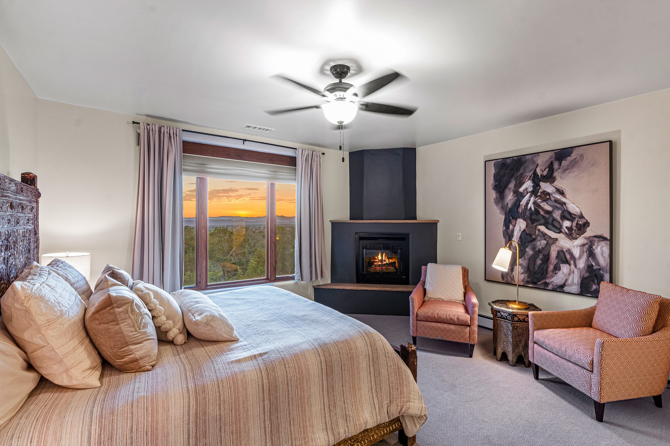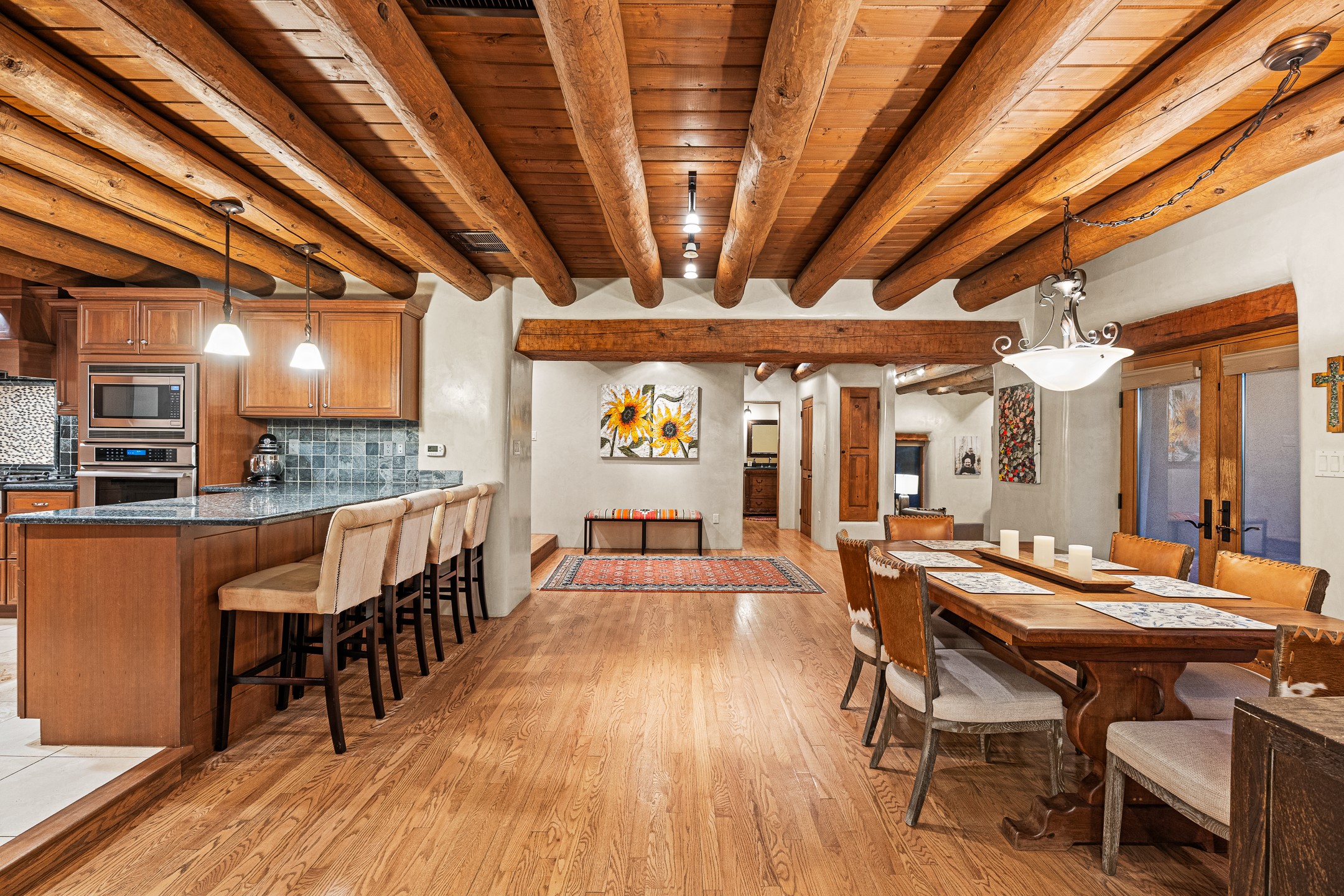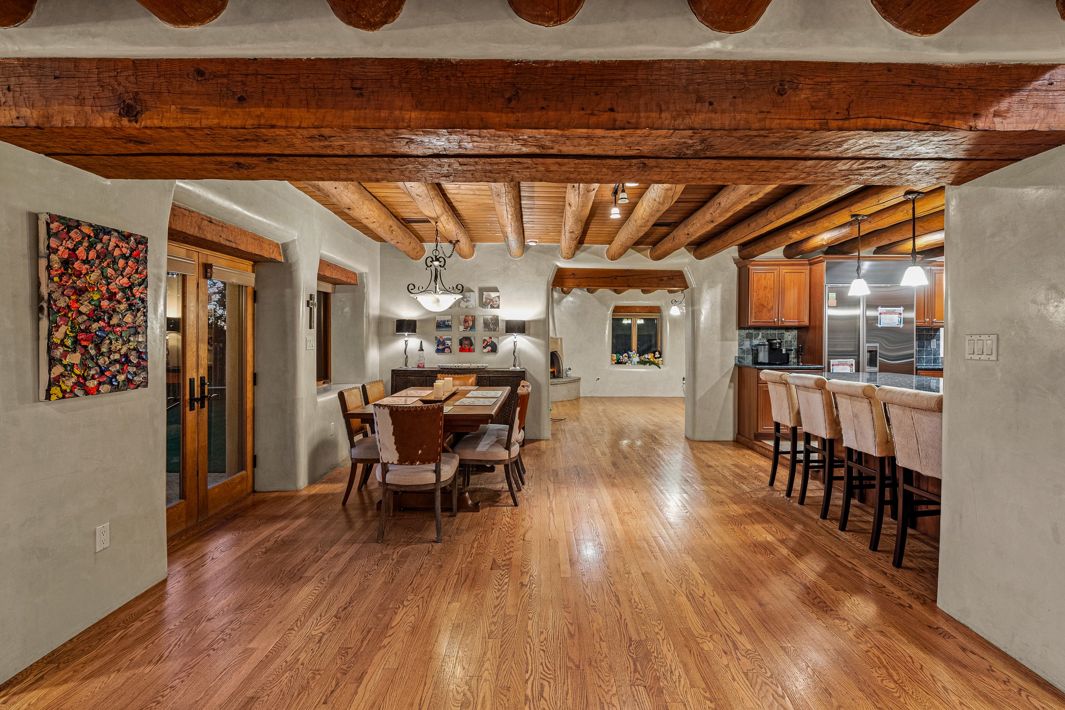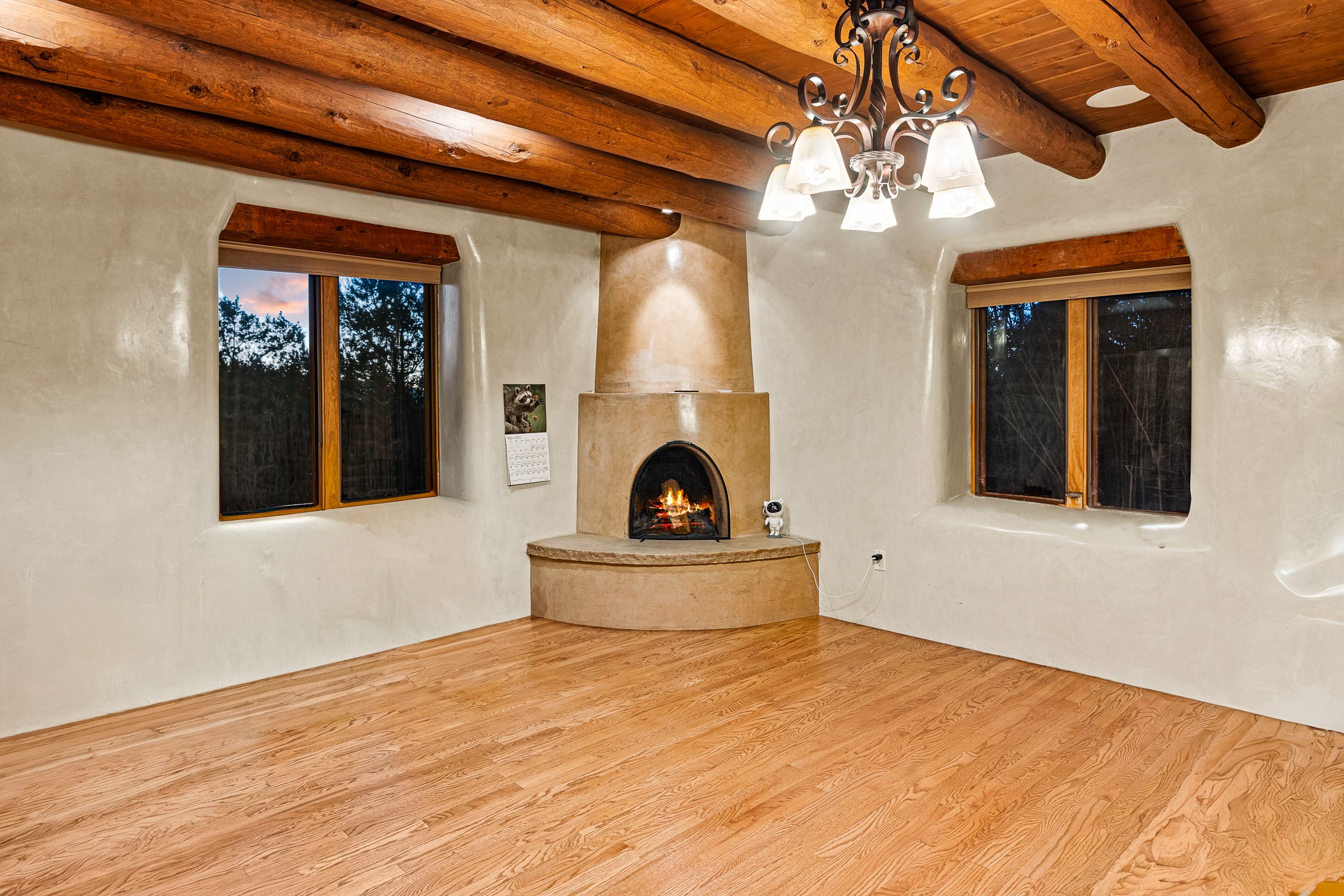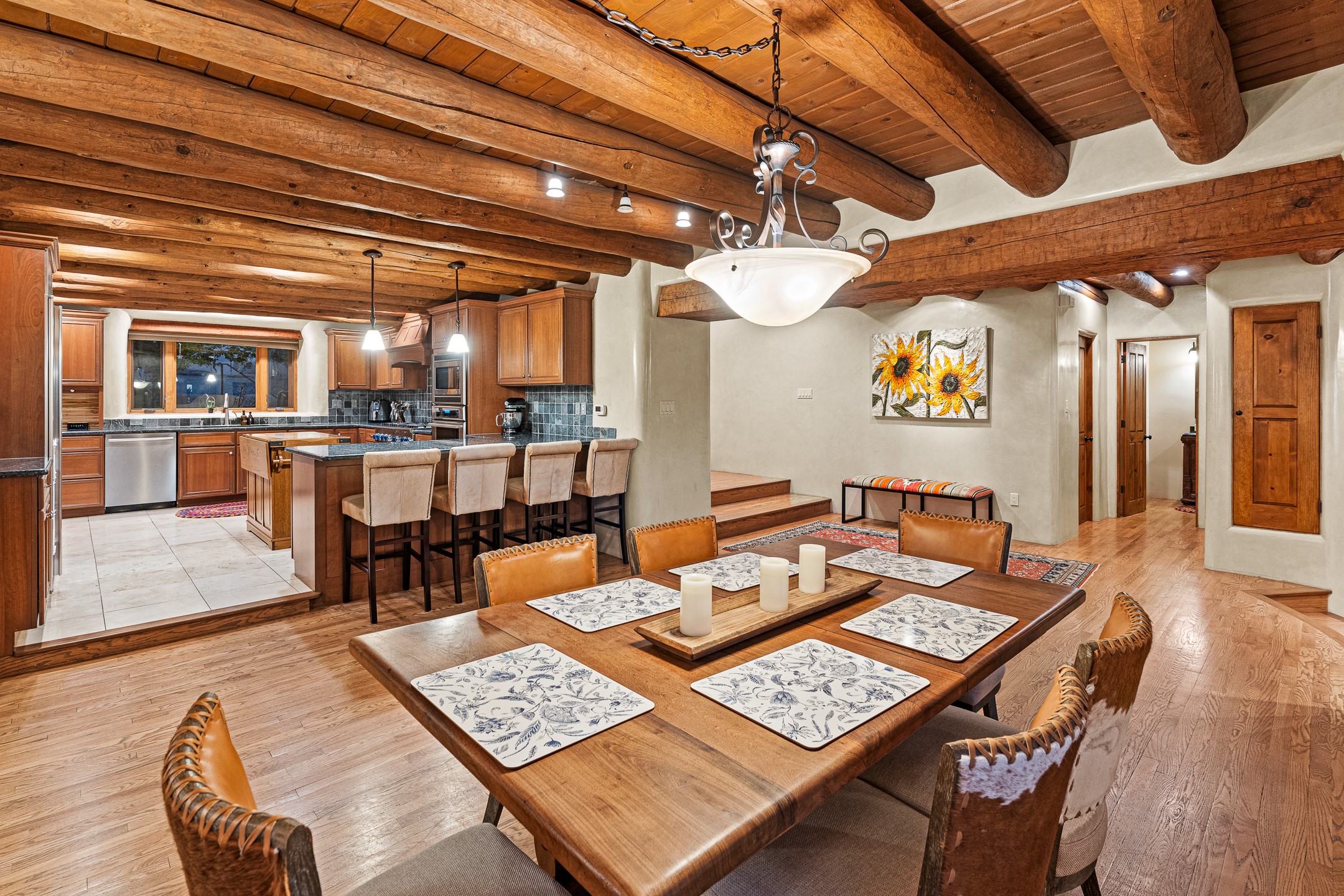 A private and gated sanctuary sitting on 2.77 acres just off of the historic Old Santa Fe Trail. The luxurious four bedroom, three and a half bath main home provides space and functionality for modern living. Elegant living downstairs includes refined diamond plaster finishes, viga beams, two fireplaces, and travertine tile. A chef inspired kitchen includes abundant granite countertops with Subzero and Thermador appliances. The kitchen flows into a lovely dining area with views to the West of the tranquil backyard space and portal ideal for outdoor living and entertaining. A cozy family room off the kitchen and dining area currently serves as a playroom, offering flexible use of space. A first-floor guest bedroom with full bath adds convenience and versatility. Upstairs, a gracious primary suite serves as a true retreat, complete with a fireplace, spa-style bath with large walk-in shower, and a clawfoot tub perfectly placed before a view window. Step out onto the private balcony to take in panoramic Western sunset and mountain views. Two additional upstairs bedrooms provide comfortable accommodations for family or guests. Additional features include a spacious laundry room, oversized three car garage, and additional ample storage space. A charming one bedroom, three quarter bath casita sits separately on the North side of the property boasting a full kitchen, dining area, and living room with fireplace providing a cozy hideaway for your family or guests. This property is the perfect blend of privacy, sophistication, and authentic New Mexico living just minutes from downtown Santa Fe.