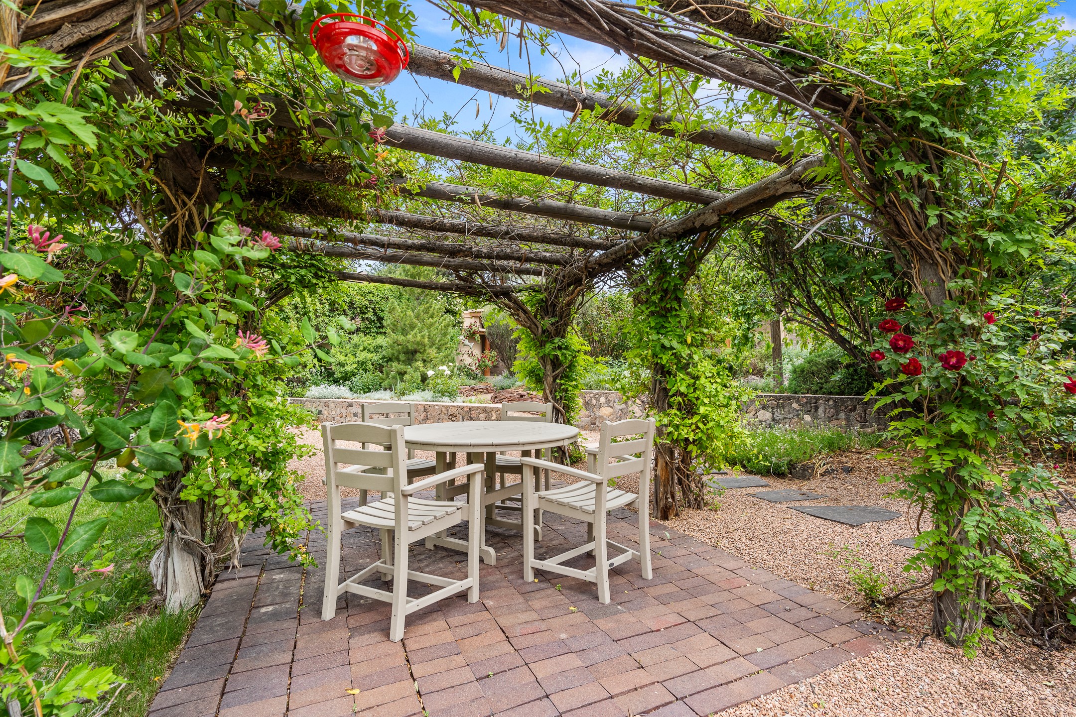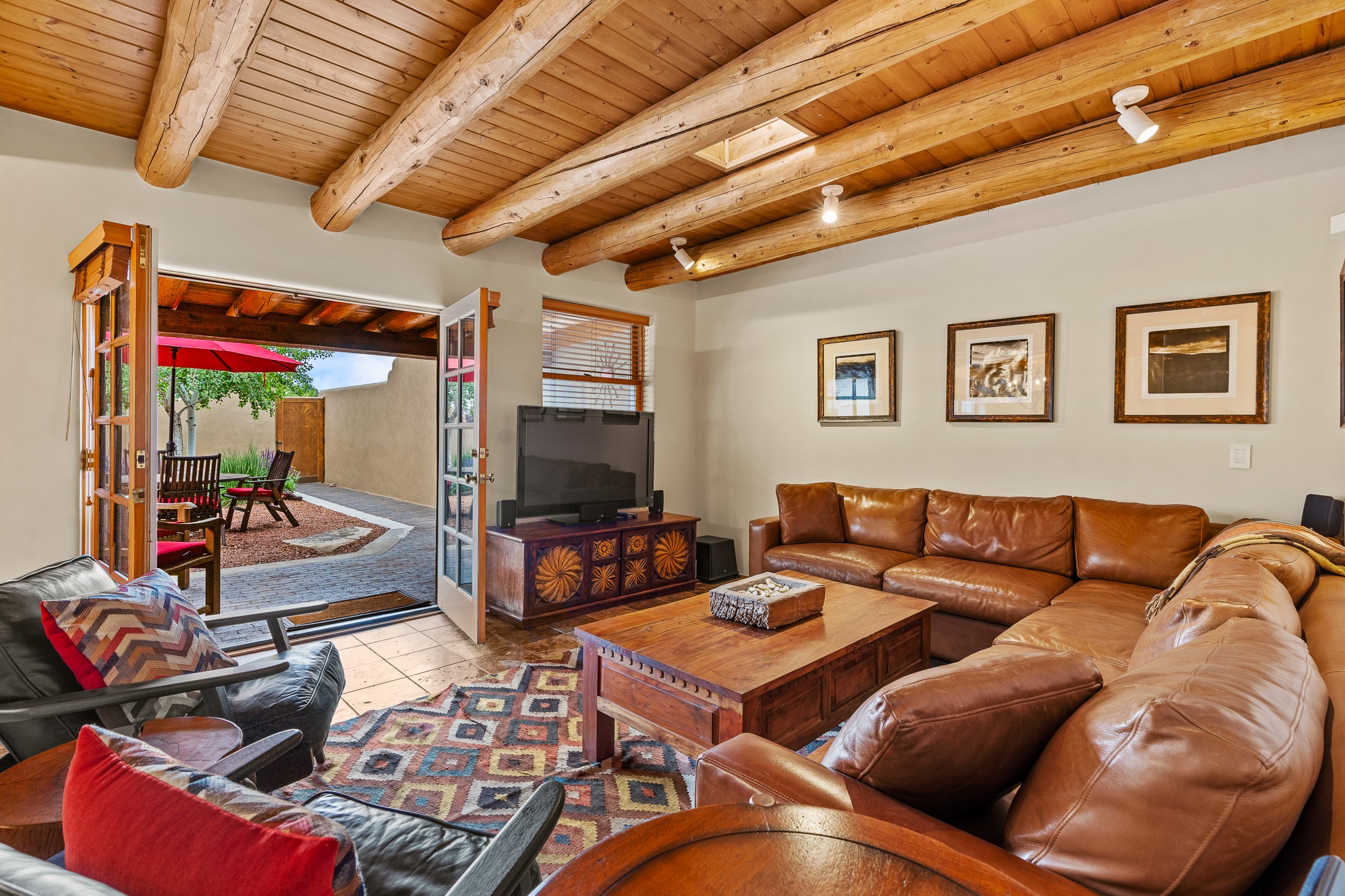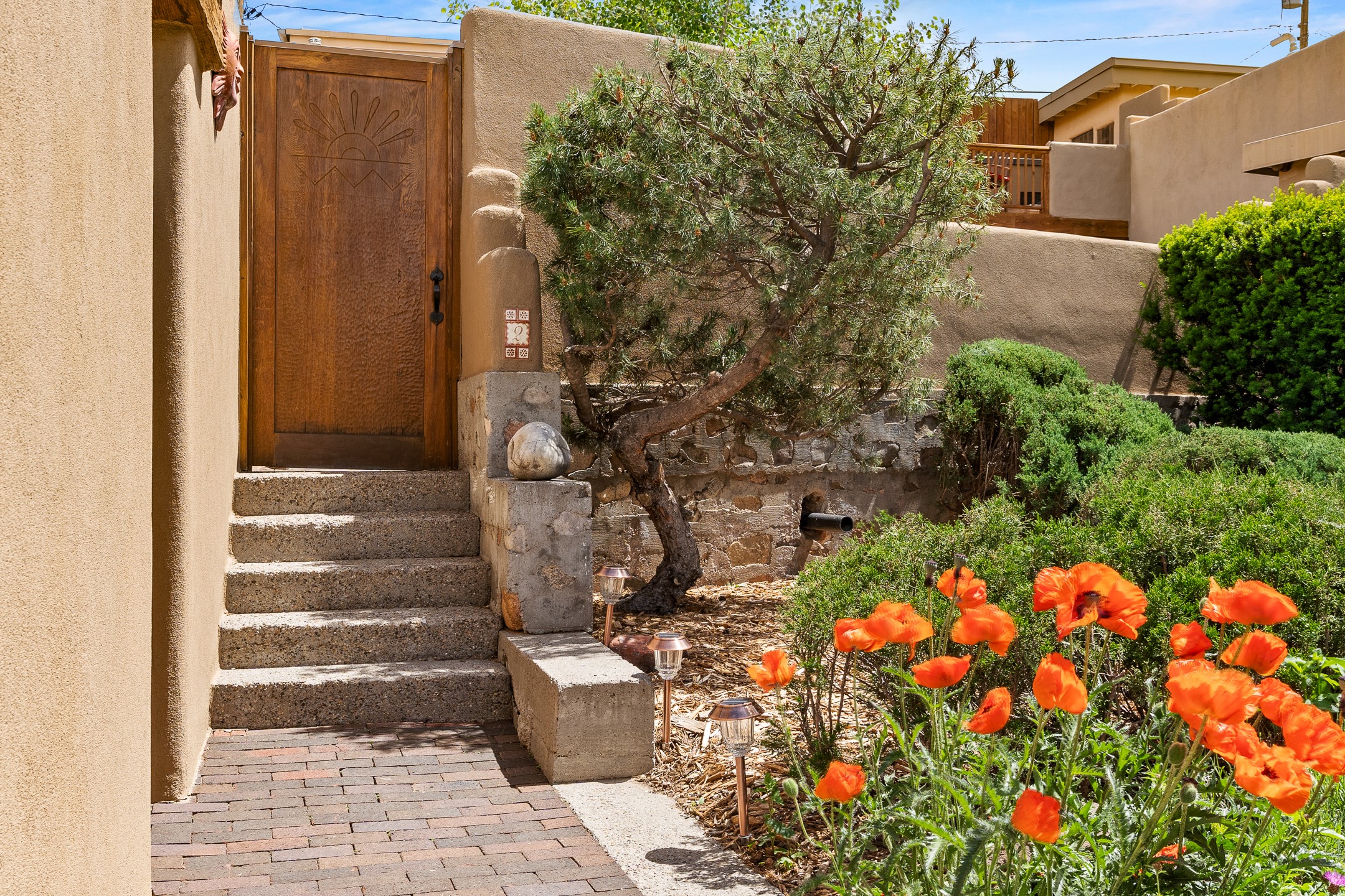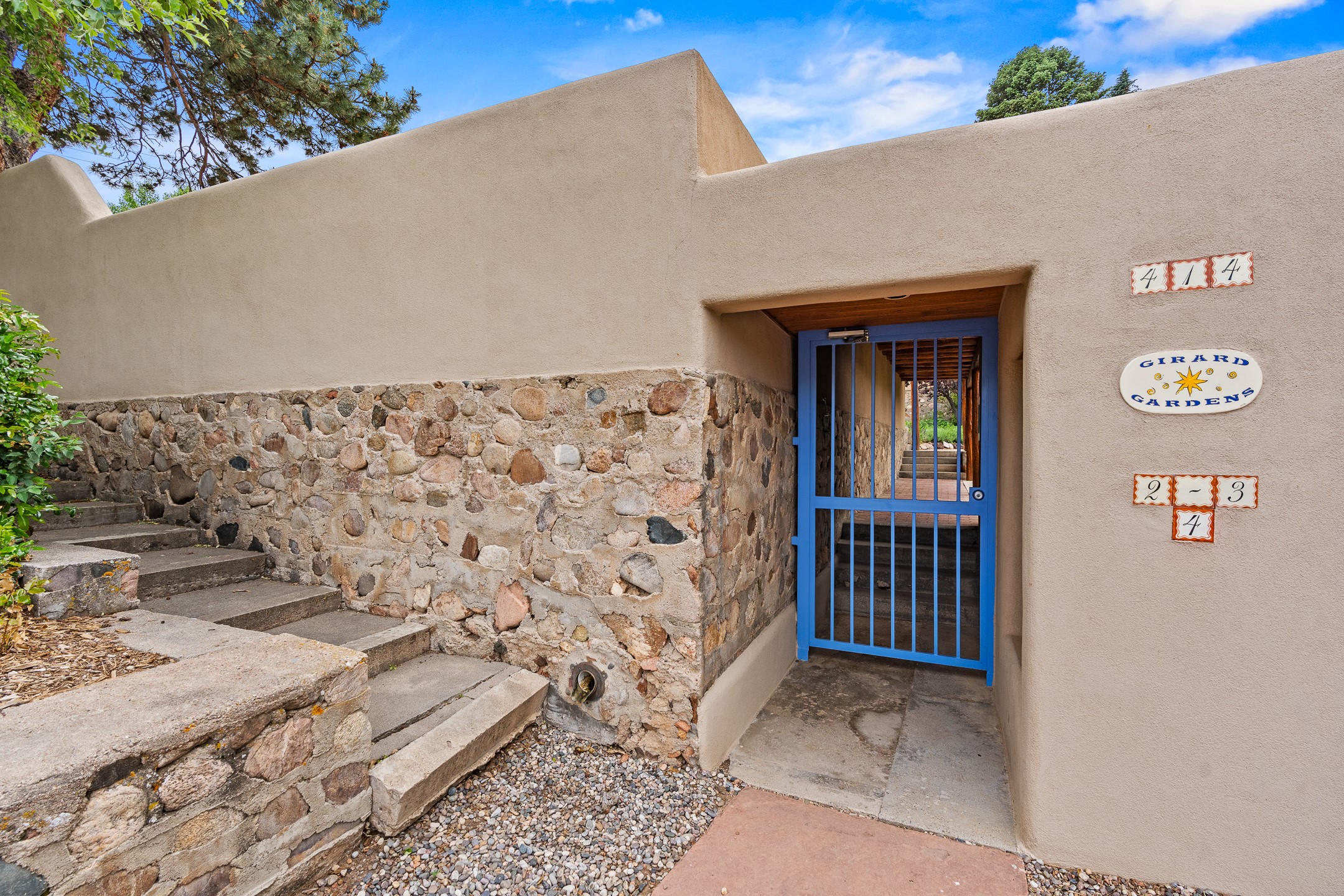 This Historic Eastside home is in the gated Girard Gardens Compound located a block from the Canyon Road arts district. It consists of a beautifully appointed main home and a guest casita. The casita has the possibility of being used as a wonderful studio, home office space or as an income generating rental. The location of this property has close proximity to all Santa Fe has to offer. Hiking, skiing, mountain biking, along with the fabulous restaurants and cultural activities for which it is famous. Mountain views from the expansive upstairs deck, a large private outdoor garden space. 3 large bedrooms, 3.5 bathrooms with ample closet space. The fully equipped kitchen has stainless appliances and is a bright welcoming space for the cook in the family. A detached garage is included with the main home. The guest casita has its own parking space. This is a turn-key sale which includes all designer selected furnishings.