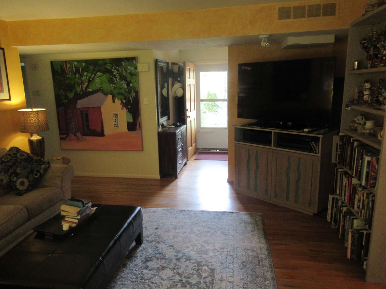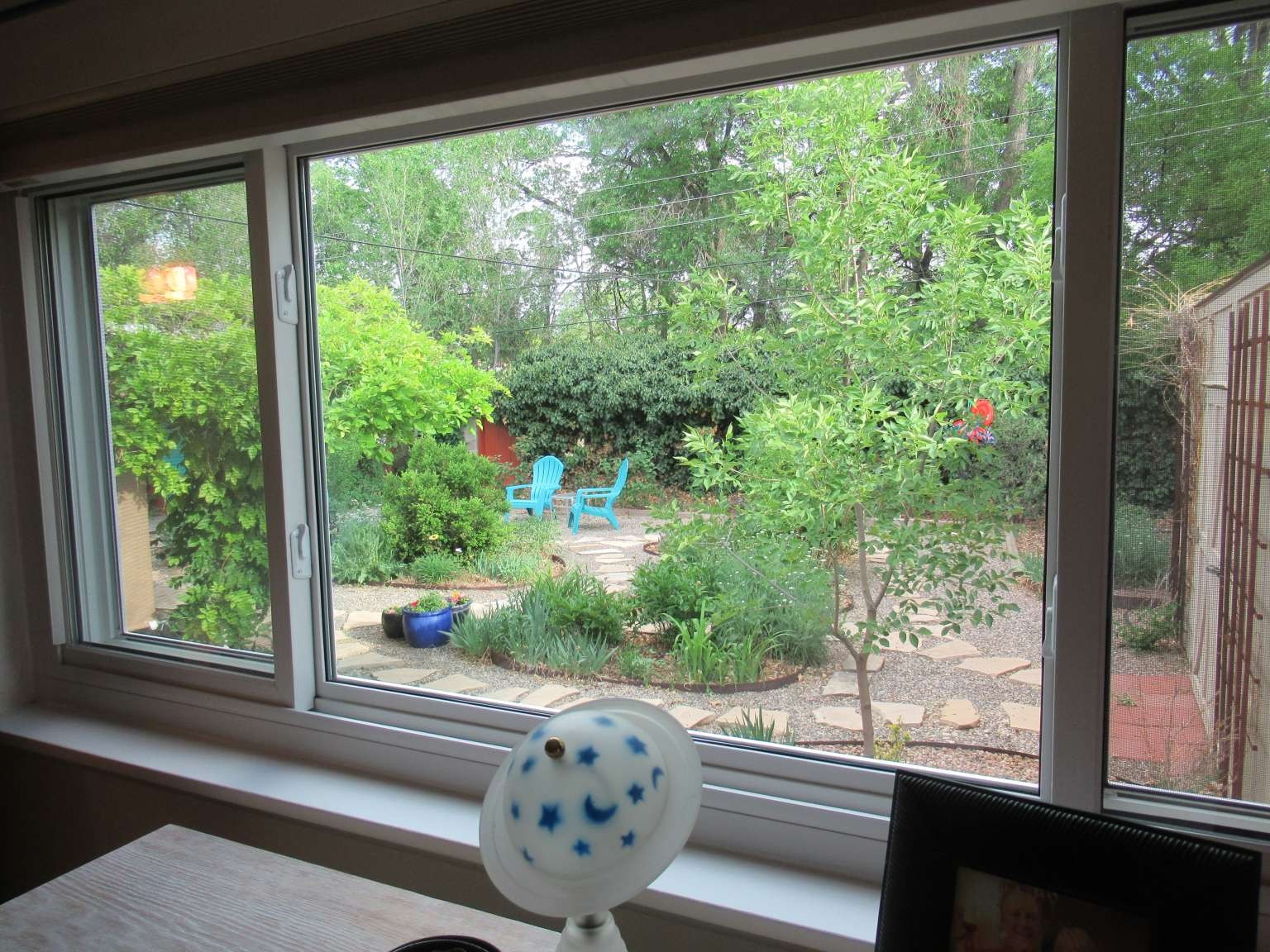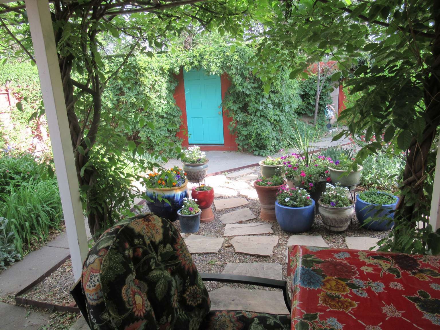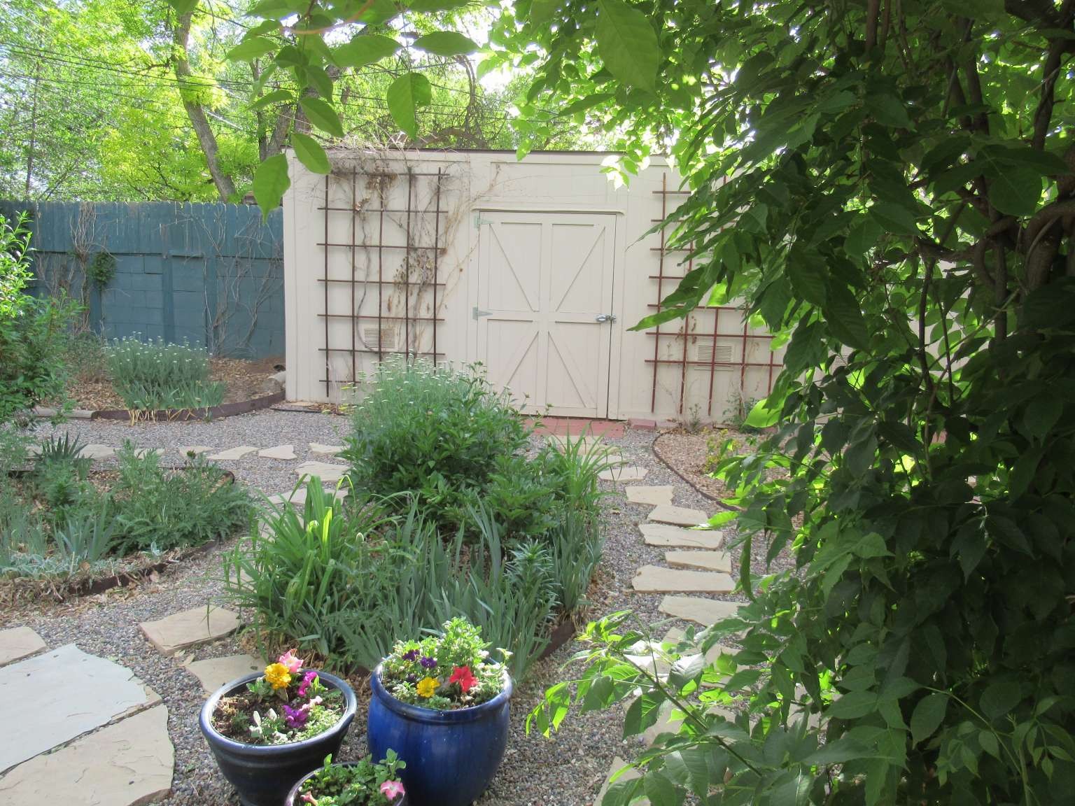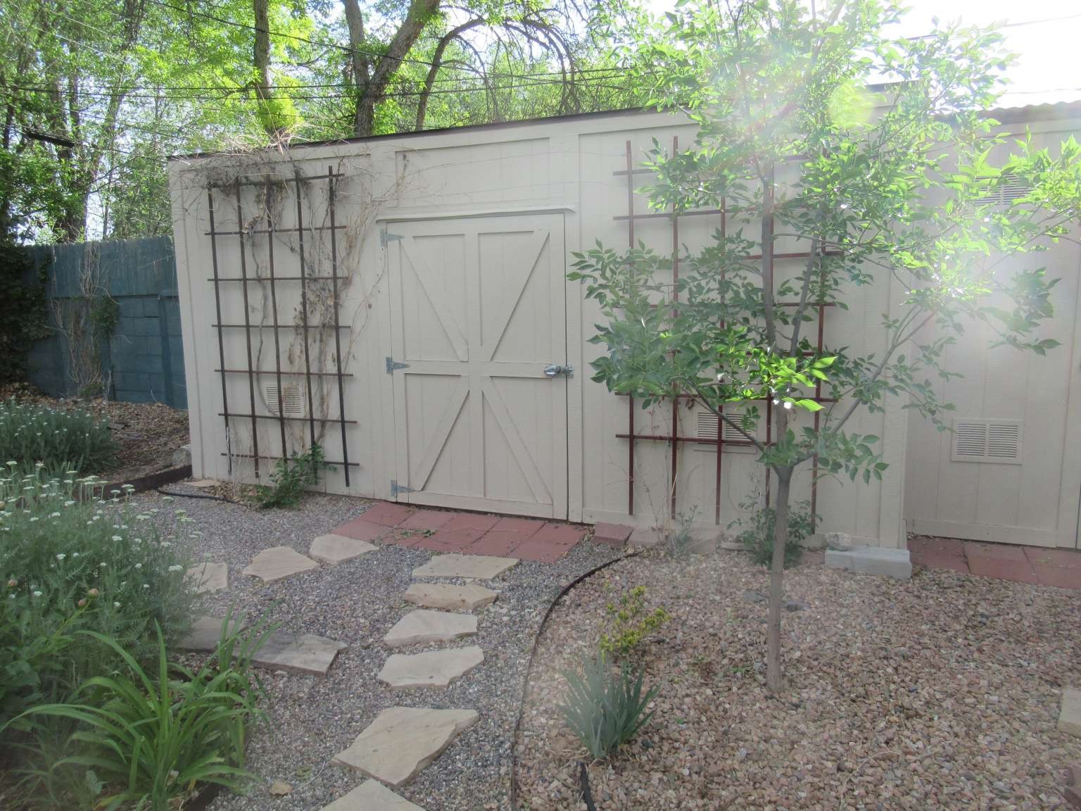 Lovely house centrally located in Santa Fe. Approx. 1532 sf +/- 4 BR, 2 BA, with den/studio and laundry room. 1963 Stamm house, Territorial style. Great location in the Mid-Town area near many schools and parks (close to Mid-Town project in central Santa Fe). Main rooms (LR, 3 BRs, Hall) have wood floors; kitchen, bathrooms and laundry room have tile floors; den and 4th BR are carpeted. Large modern upgraded kitchen with stainless steel appliances, lots of cabinetry storage and countertops. All appliances included, including washer and dryer. Great spaces for offices and studios. Forced air heat (natural gas); new evaporative cooler. Large covered back patio on raised slab off kitchen. Nicely landscaped large yards with mature landscaping, drip irrigation systems. Backyard is very private and green, facing a green-belt with large trees. Three secure out-buildings in the backyard: a workshop with electricity, a Tuff Shed for dry storage, and another shed for additional garden/materials storage. House is built on a crawl space for easy upgrades. Has a chimney ready for a wood stove or fireplace if desired.