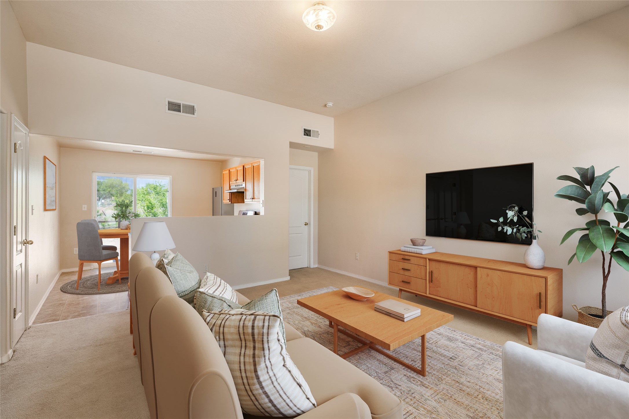This is very well maintained single level home, is located in a quiet neighborhood close to the Santa Fe Country Club/Golf, schools and shopping! It offers quick access to HWY 599 for commuters, Santa Fe airport, and is approximately only 4 miles to the hospital! Beautiful mature trees and shrubs in the front yard, complete with drip irrigation and, drip irrigation offered in the back! It's perfect for someone who needs a single level home. And, great home for a first time home buyer!