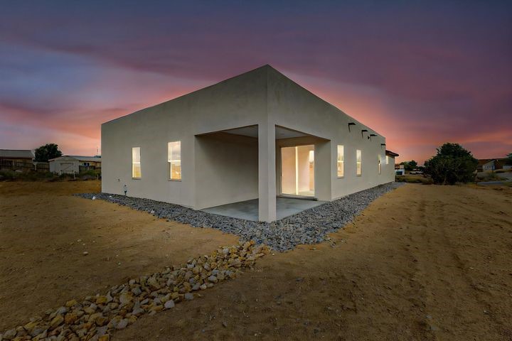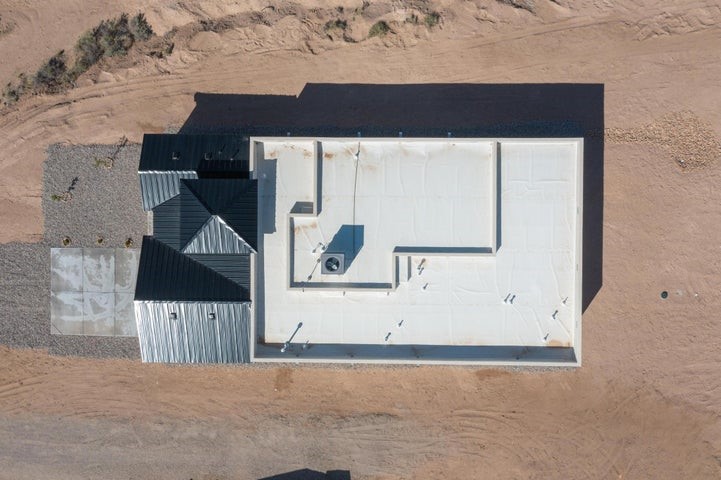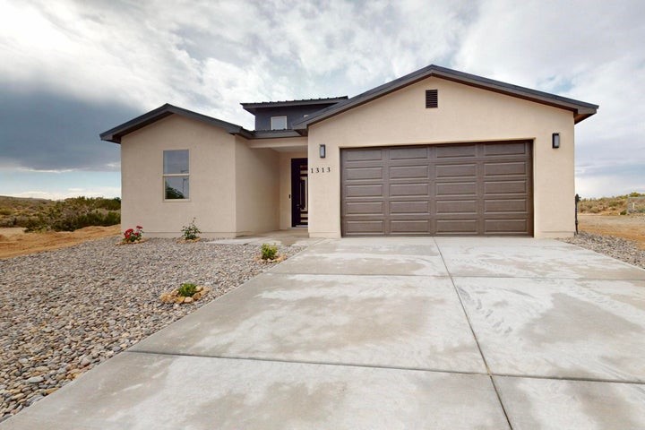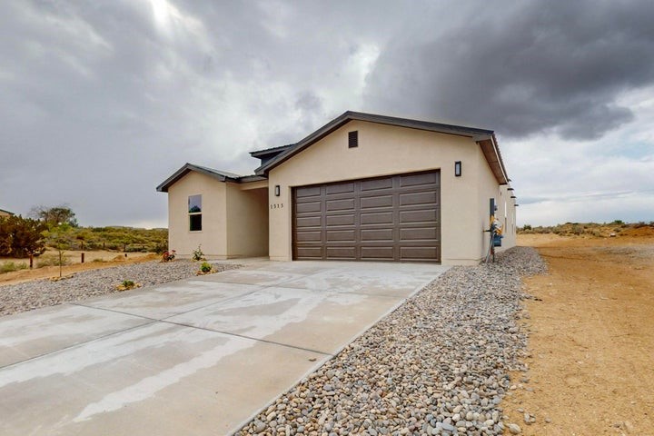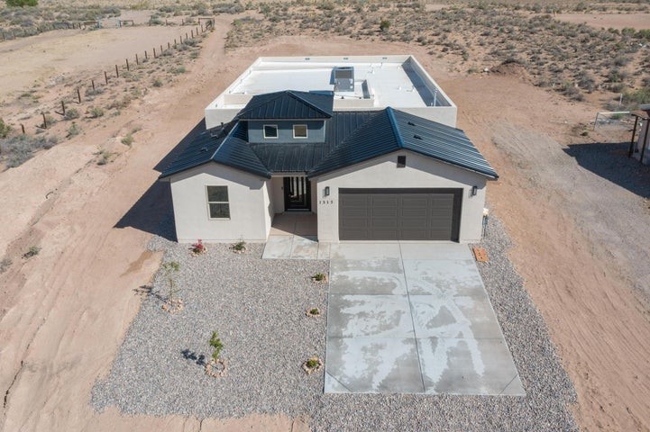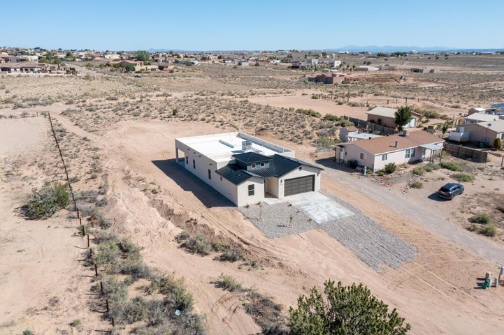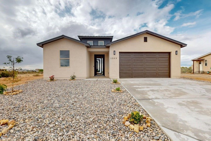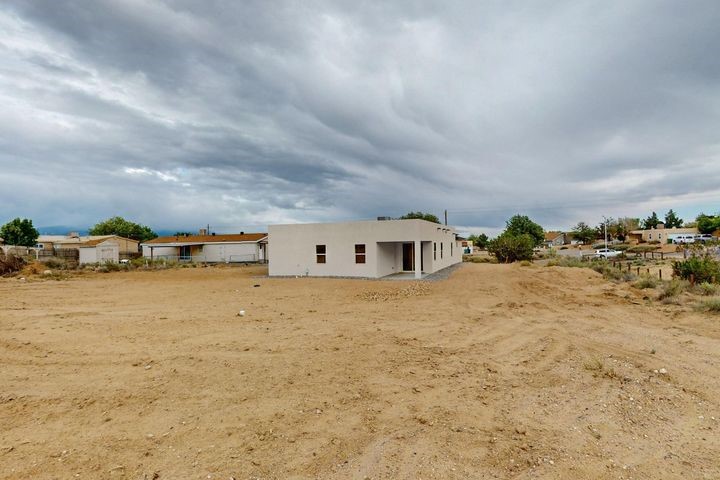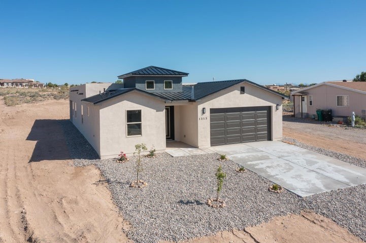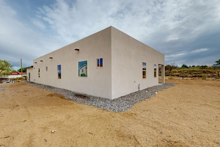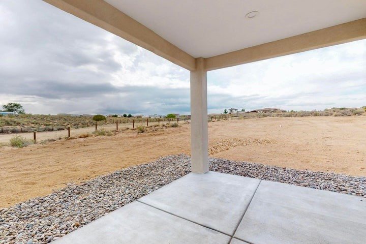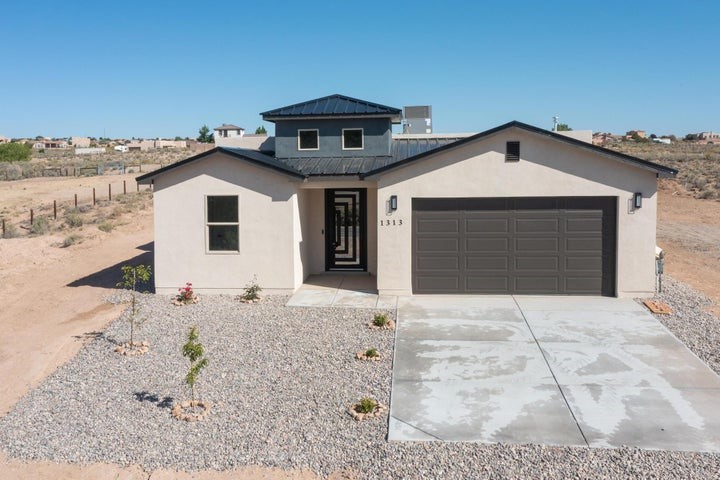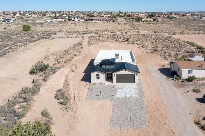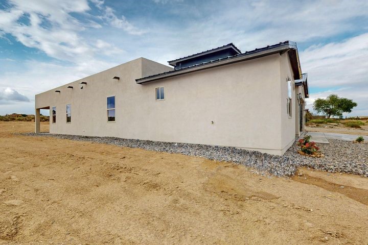 NEW CONSTRUCTION in the Southeast of Rio Rancho. Very sought after location sitting on a sizable lot about a .4 of an acre with backyard access. No HOA. Luxury finishes with custom cabinetry with crown molding, quartz countertops, gold finishes, and new stainless steel appliances that come with the house. This home features a Black Metal Roof and TPO. It has a combo unit with Refrigerated air, a covered patio, and landscaping around the house. Come see this house soon!