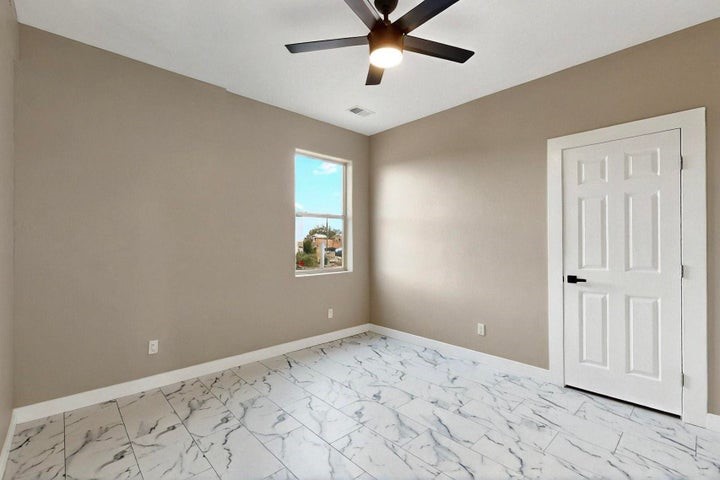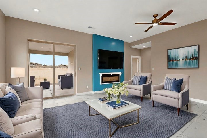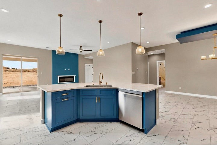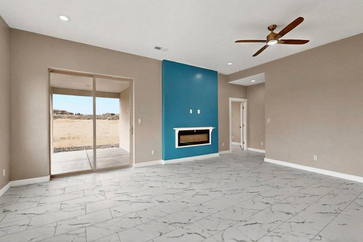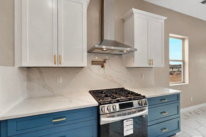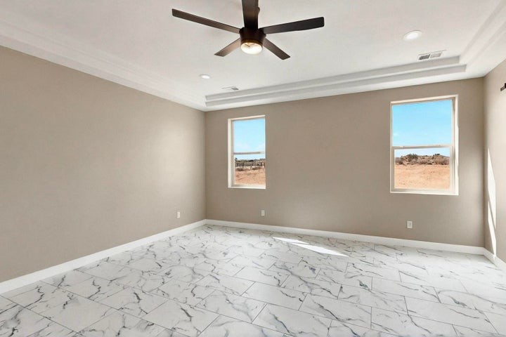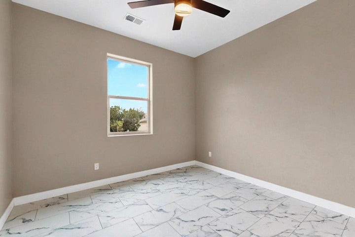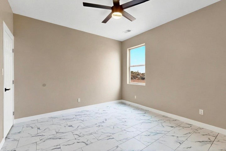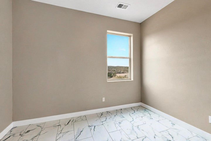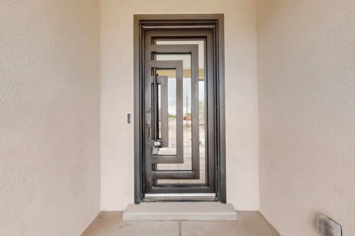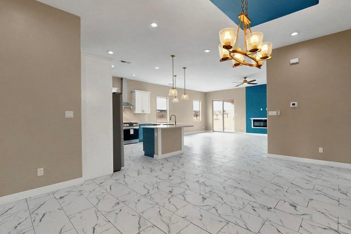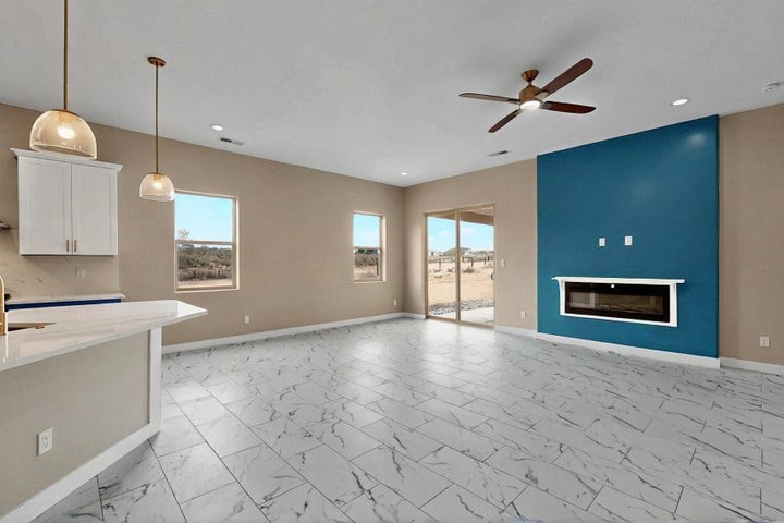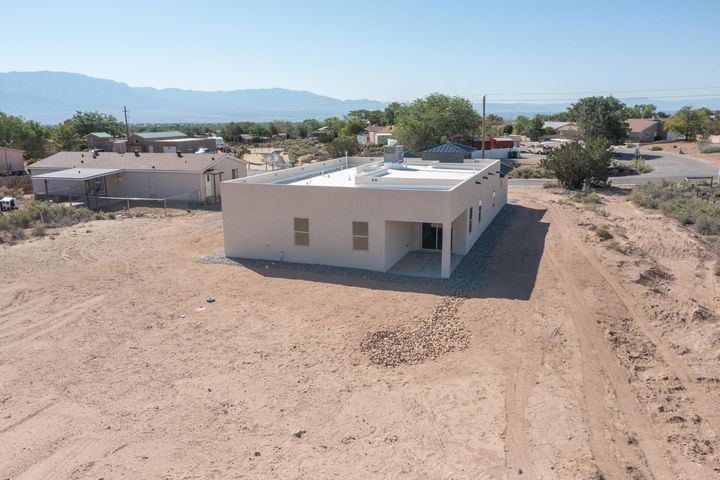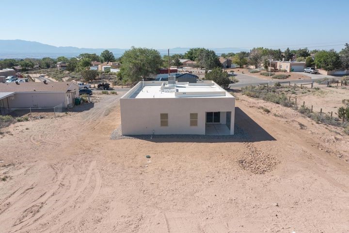 NEW CONSTRUCTION in the Southeast of Rio Rancho. Very sought after location sitting on a sizable lot about a .4 of an acre with backyard access. No HOA. Luxury finishes with custom cabinetry with crown molding, quartz countertops, gold finishes, and new stainless steel appliances that come with the house. This home features a Black Metal Roof and TPO. It has a combo unit with Refrigerated air, a covered patio, and landscaping around the house. Come see this house soon!