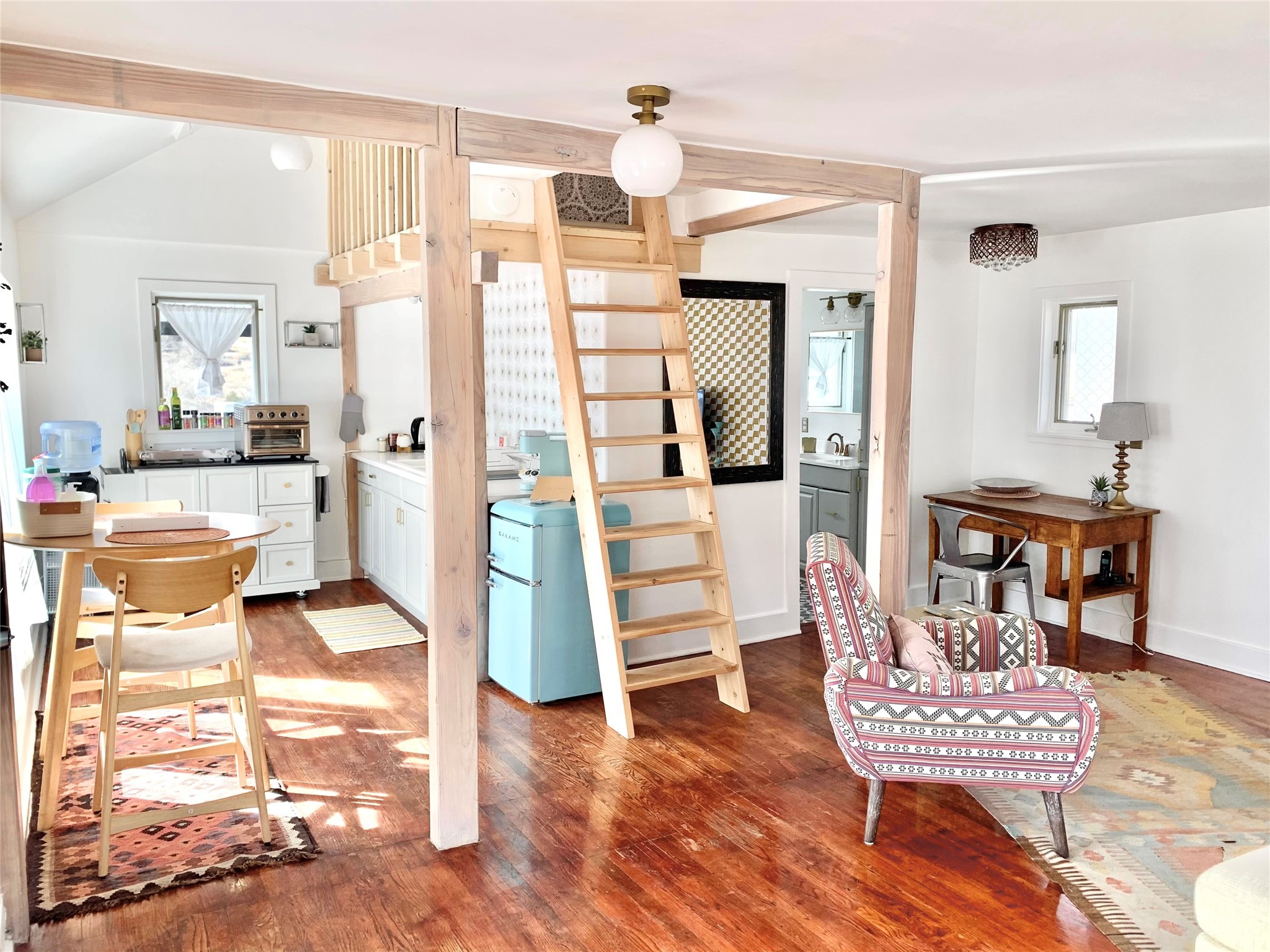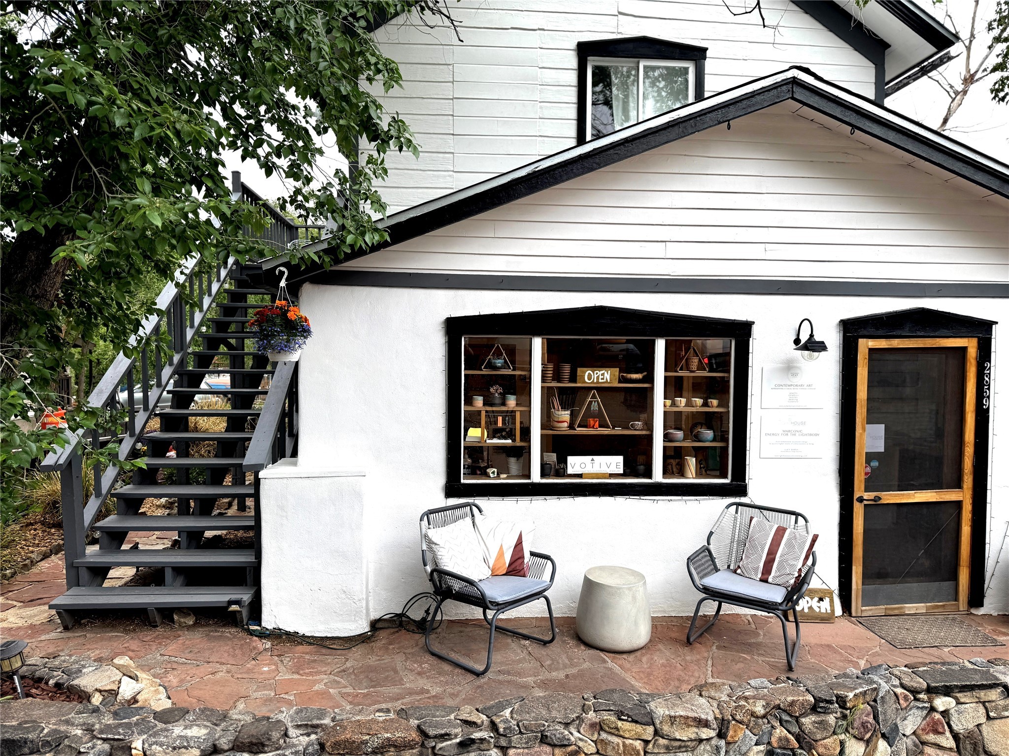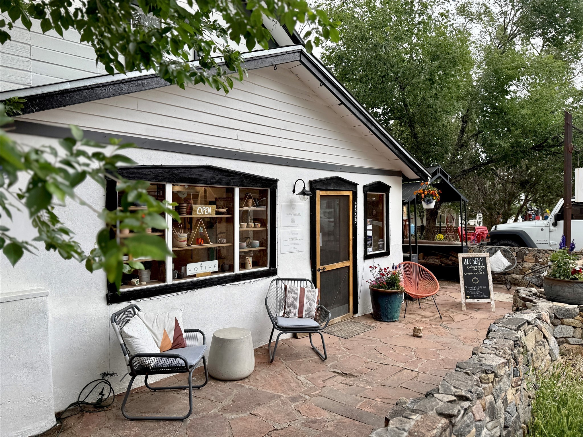 Multi-faceted commercial-residential property, turnkey and ready to go with rental income. Currently operating as a contemporary art gallery, an artist studio, an Airbnb, and a long-term home rental, this property is a gem in the artist community of Madrid. Located right in the heart of town, but with private courtyard areas, this unique plot offers beauty and reprieve while not sacrificing prime location. Property features: Main gallery/commercial floor with adjoining artist studio, kitchen, and bath, second level, private-entry loft apartment currently operating as a licensed Airbnb, and a private, free-standing 3bd/1ba home. Parking for 3 cars. All spaces recently renovated, with excellent natural lighting, this property shines as a bright and fresh investment, business opportunity, residential home, or all of the above. Ideal for an artist or entrepreneur. Option to purchase the existing business, and to keep the long-term rental tenant. Additional option to purchase all furniture/items in Airbnb to enable continuous business operation upon sale. Details to be discussed with the current owner and business operator. Recent improvements include new septic, new electrical panel, mini-split AC/heat units, exterior and interior paint job, lighting upgrades, exterior power-washing, gutter cleaning, professional window cleaning, and landscape upgrades. The property features two large water tanks, one for rainwater catchment, and other for freshwater delivery. Membership to Madrid Community Water will also transfer with the sale.