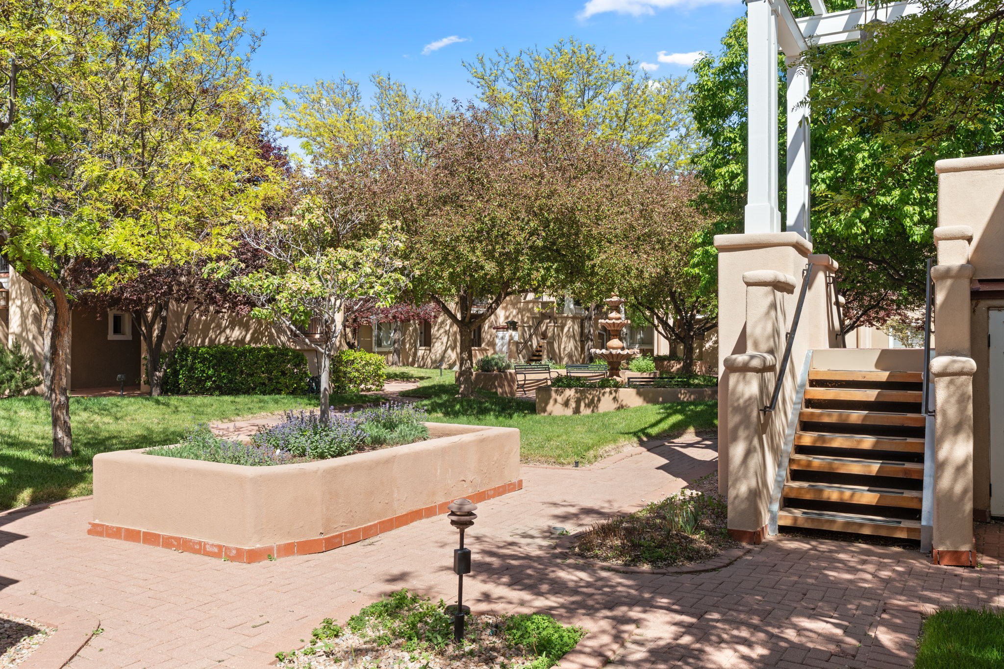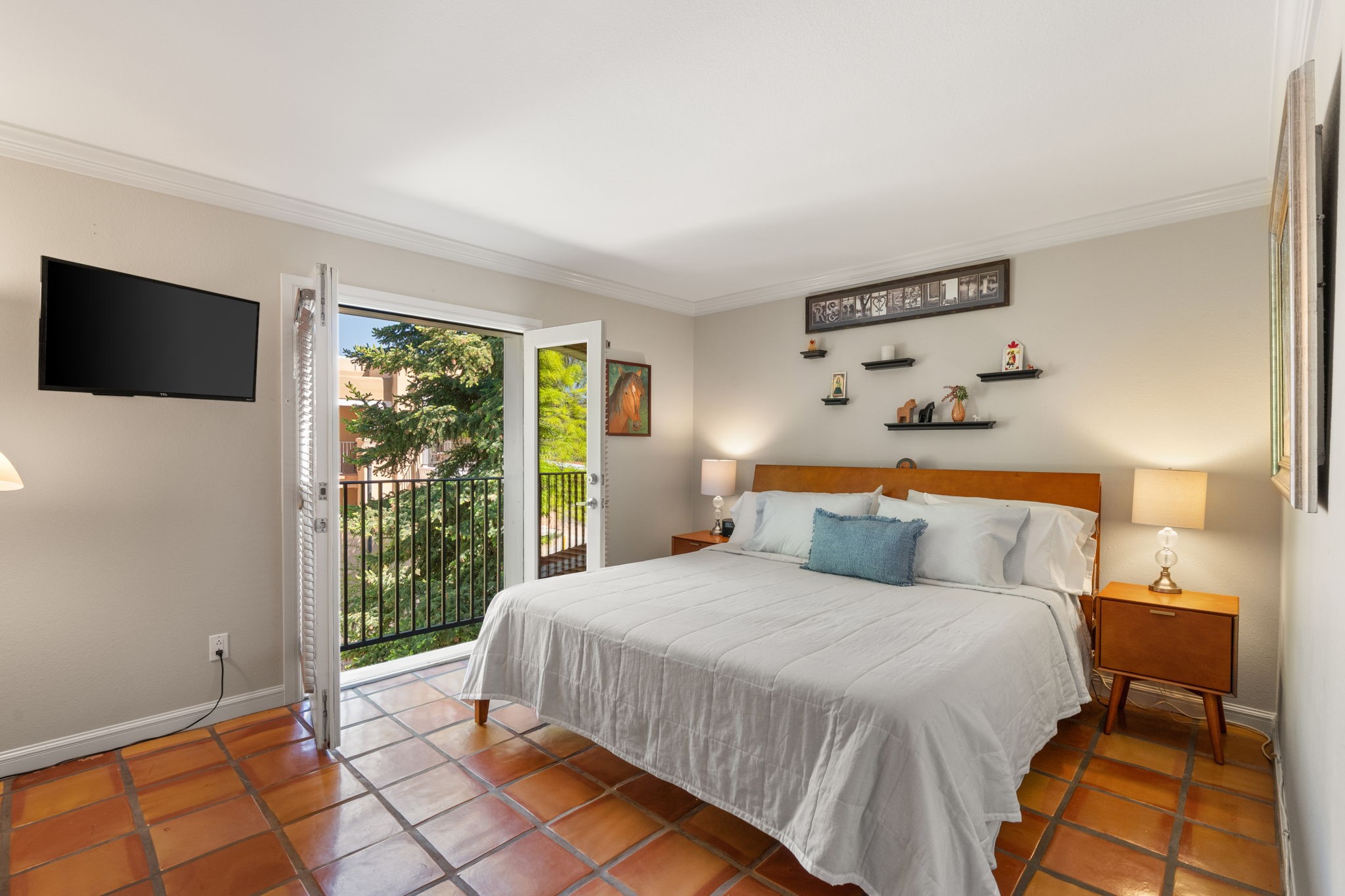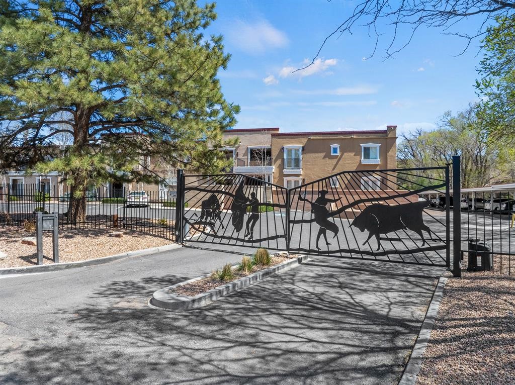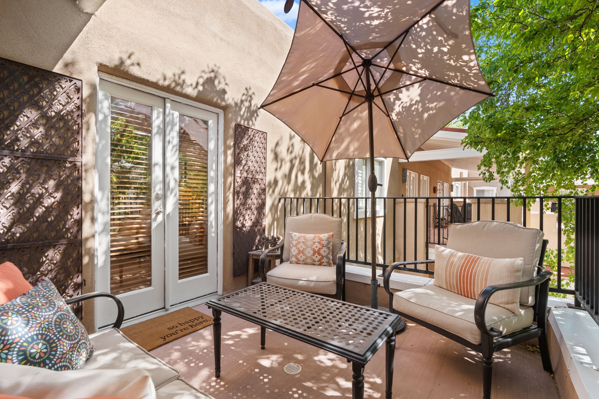 Step into the charm of Santa Fe living just 15 minutes on foot from the Historic Plaza. This beautifully refreshed upstairs condo offers a quiet retreat in a secure gated community, tucked away in a serene northeast corner overlooking the courtyard. Inside, high ceilings, skylights with custom sun blinds, and territorial-style windows bathe the open floor plan in natural light. The 2-bedroom, 1-bath home blends comfort and style with crown molding throughout, earthy two-tone colors, and a touch of New Orleans flair from the primary suite's French doors. Both bedrooms include generous walk-in closets, while the updated kitchen features stainless steel appliances and a newer sink -- ready for your culinary touch. Stay comfortable year-round with refrigerated air, and enjoy the convenience of an in-home stacked washer/dryer. The home is freshly painted, professionally cleaned, and move-in ready -- a blank canvas for your Santa Fe vision. Relax on your private outdoor space, or take advantage of the community's well-appointed amenities. Parking includes one covered, assigned space plus an additional unassigned spot. Whether you're looking for a full-time residence or a lock-and-leave pied--terre, this condo is the perfect balance of privacy, security, and downtown access. Call me Today to schedule your private showing -- discover how this home can fit your lifestyle in the heart of Santa Fe.