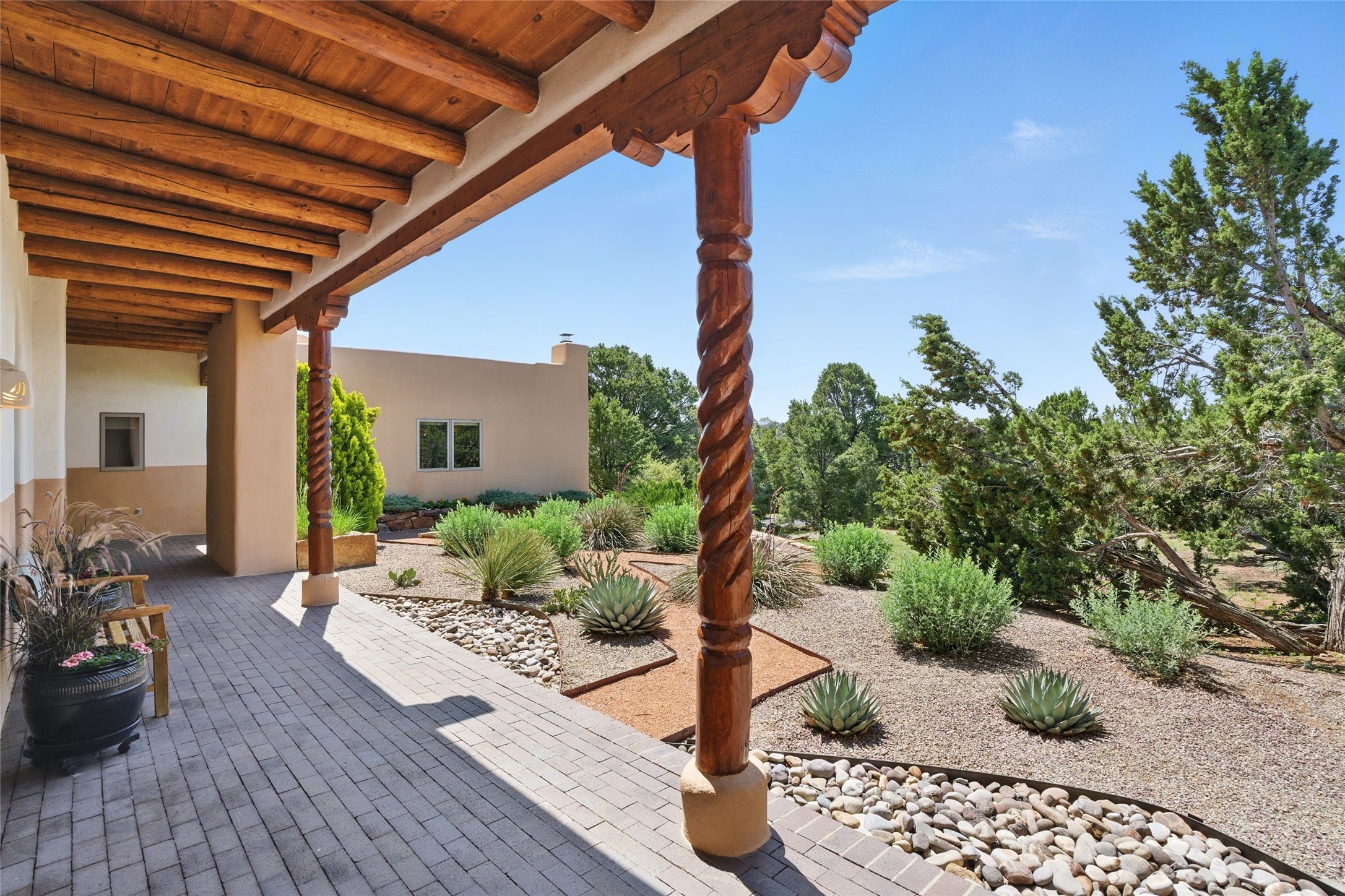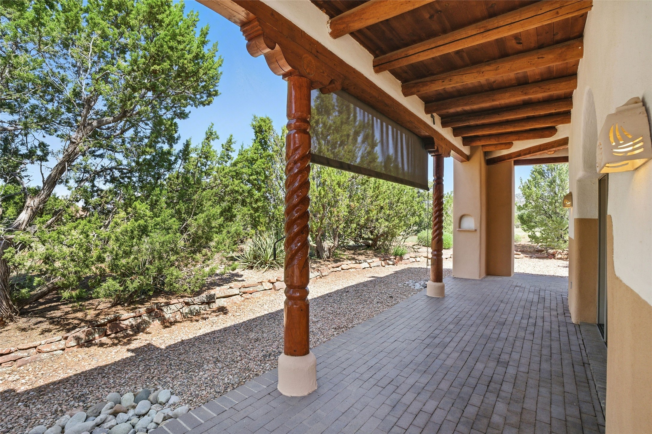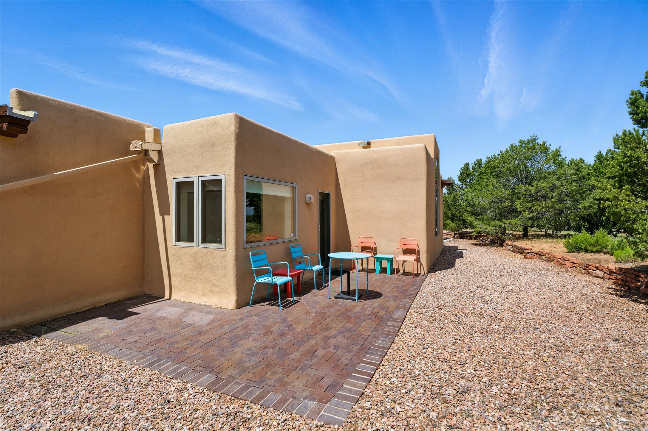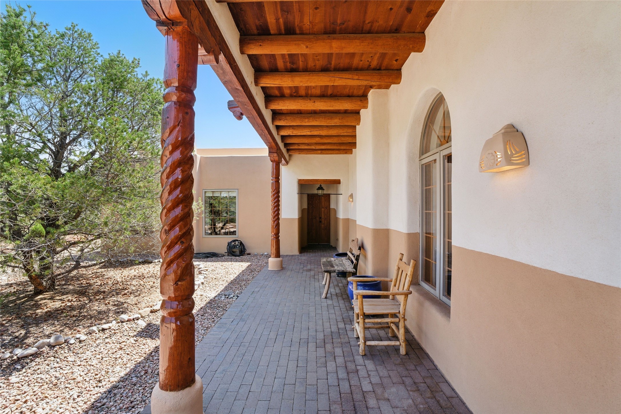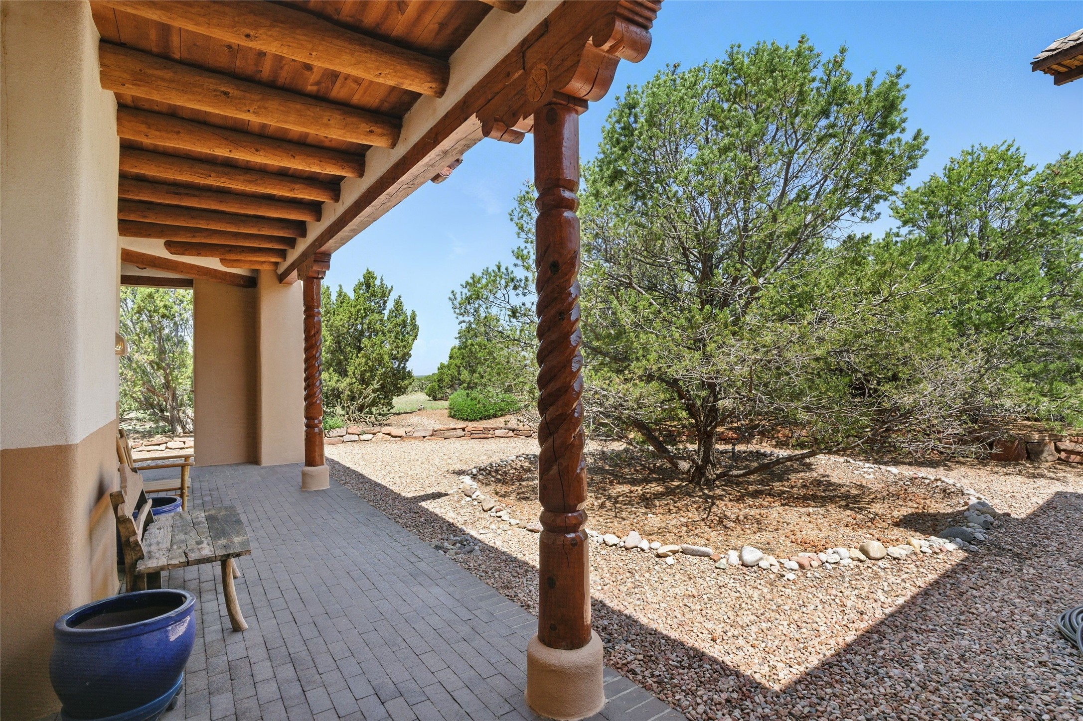 BEAUTIFUL BELICIA ESTATES PROPERTY! NEW HEATING SYSTEM - SPLITS AND FORCED AIR IN PROCESS. Privacy and views! Designed by William Lumpkins and built by Adobeworks, this elegant home has a dramatic great room with 10' ceilings and a spectacular center hallway with an 11' barrel ceiling. This property has been PRE-INSPECTED and most repairs completed. The generous primary suite has a kiva fireplace with banco, viga and latilla ceiling, spacious bath with double sinks and separate shower and walk-in closet. Two guest rooms with Jack and Jill bath. The office has custom iron gates and built-in book shelves. Charming powder room. A gorgeous wrap around portal with viga ceilings and brick floor, goes around three sides of the home. In-floor natural gas radiant heating. Kitchen has stainless steel appliances, breakfast area and a patio. Sunset side has a pull down shade. Located on 2 acres on a paved road with a paved driveway, this property backs up to 2,650 undeveloped acres. The professionally designed landscaping (17K) completes the front approach. Proper laundry room with sink and good storage. Silicone roof in May 2025. Driveway resealed 2025. Water heater 2024. Refrigerator and washer/dryer 2025. Saltillo tile throughout. NO CARPET. NO STEPS. BRAND NEW AIR CONDITIONING. Tiled room off the primary bath was used for a jetted tub - was converted to an exercise room by previous owners - plumbing still in place. Refrigerated air conditioning in bedroom wing only. Security system is ADT and can be transferred to new owners. Three rainbarrels - 60 gallons each. Chimneys have been inspected and minor repairs completed. Pre-inspection report available upon request.
