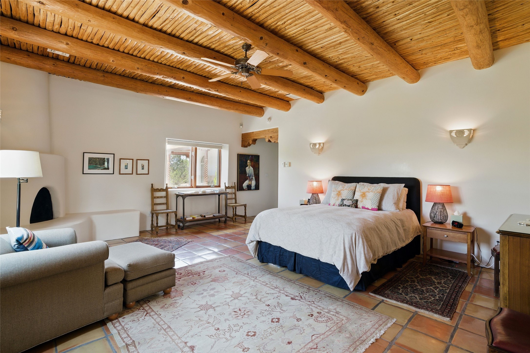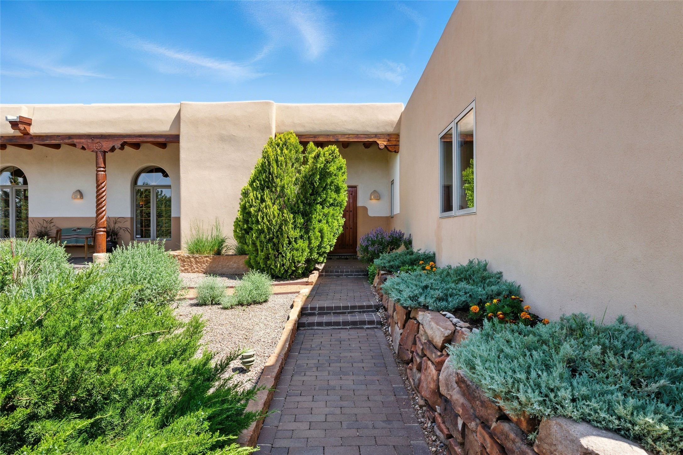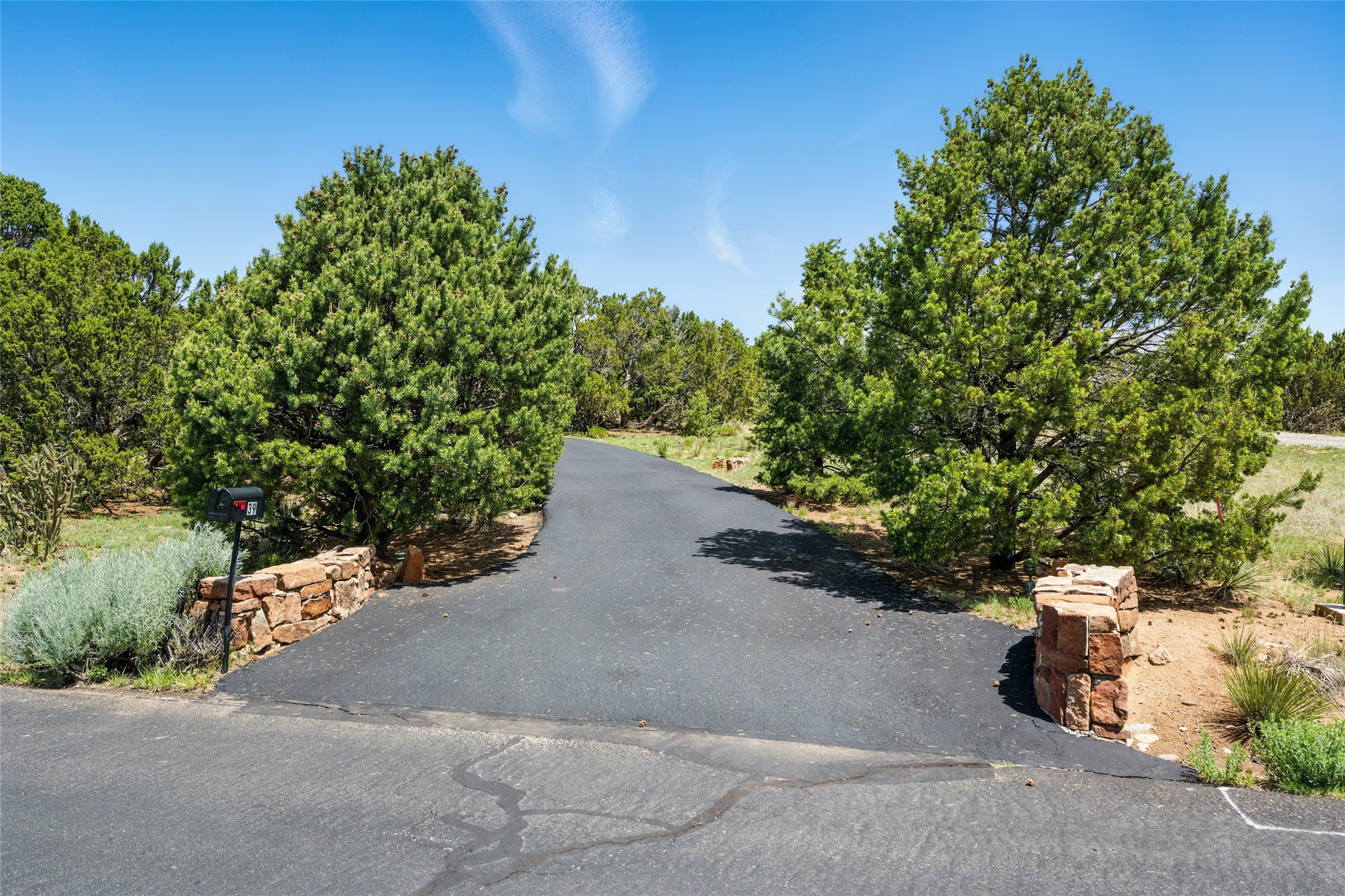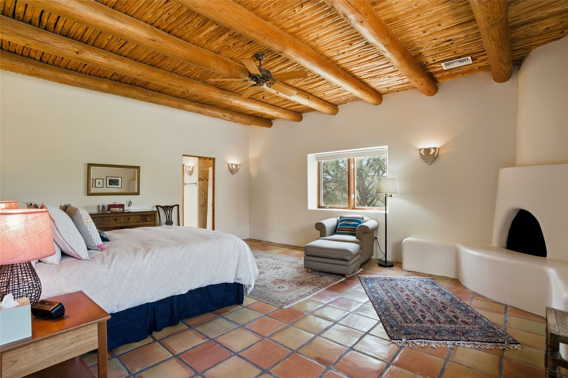 BEAUTIFUL BELICIA ESTATES PROPERTY! NEW HEATING SYSTEM - SPLITS AND FORCED AIR IN PROCESS. Privacy and views! Designed by William Lumpkins and built by Adobeworks, this elegant home has a dramatic great room with 10' ceilings and a spectacular center hallway with an 11' barrel ceiling. This property has been PRE-INSPECTED and most repairs completed. The generous primary suite has a kiva fireplace with banco, viga and latilla ceiling, spacious bath with double sinks and separate shower and walk-in closet. Two guest rooms with Jack and Jill bath. The office has custom iron gates and built-in book shelves. Charming powder room. A gorgeous wrap around portal with viga ceilings and brick floor, goes around three sides of the home. In-floor natural gas radiant heating. Kitchen has stainless steel appliances, breakfast area and a patio. Sunset side has a pull down shade. Located on 2 acres on a paved road with a paved driveway, this property backs up to 2,650 undeveloped acres. The professionally designed landscaping (17K) completes the front approach. Proper laundry room with sink and good storage. Silicone roof in May 2025. Driveway resealed 2025. Water heater 2024. Refrigerator and washer/dryer 2025. Saltillo tile throughout. NO CARPET. NO STEPS. BRAND NEW AIR CONDITIONING. Tiled room off the primary bath was used for a jetted tub - was converted to an exercise room by previous owners - plumbing still in place. Refrigerated air conditioning in bedroom wing only. Security system is ADT and can be transferred to new owners. Three rainbarrels - 60 gallons each. Chimneys have been inspected and minor repairs completed. Pre-inspection report available upon request.