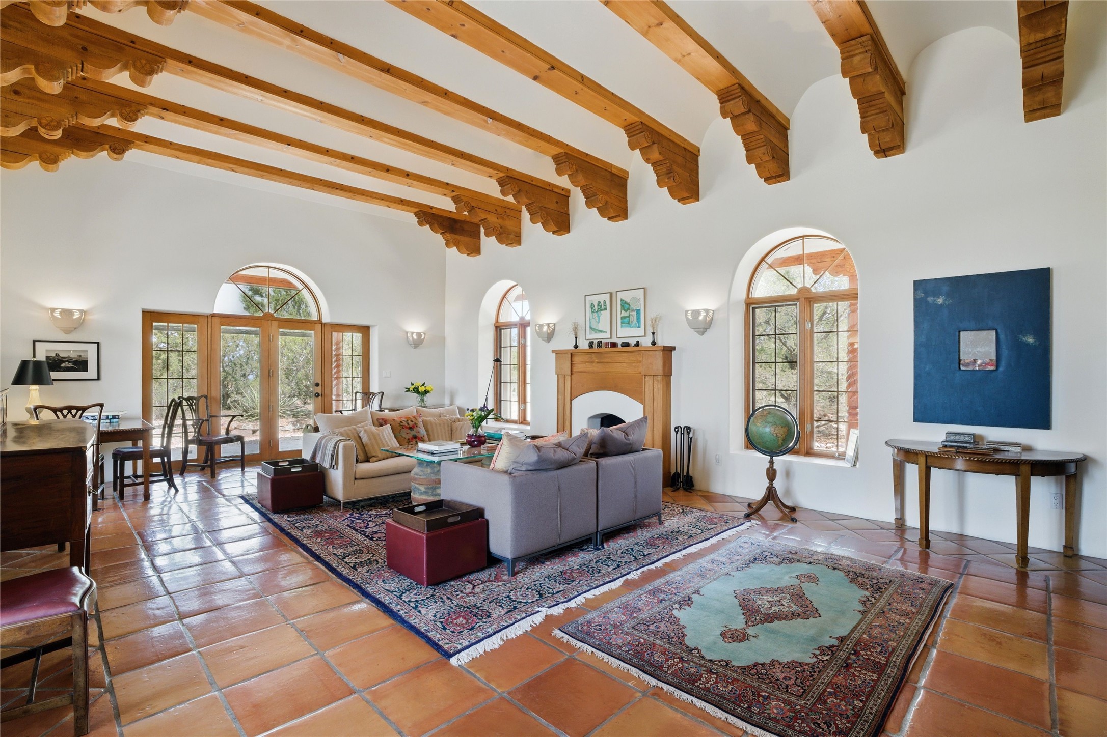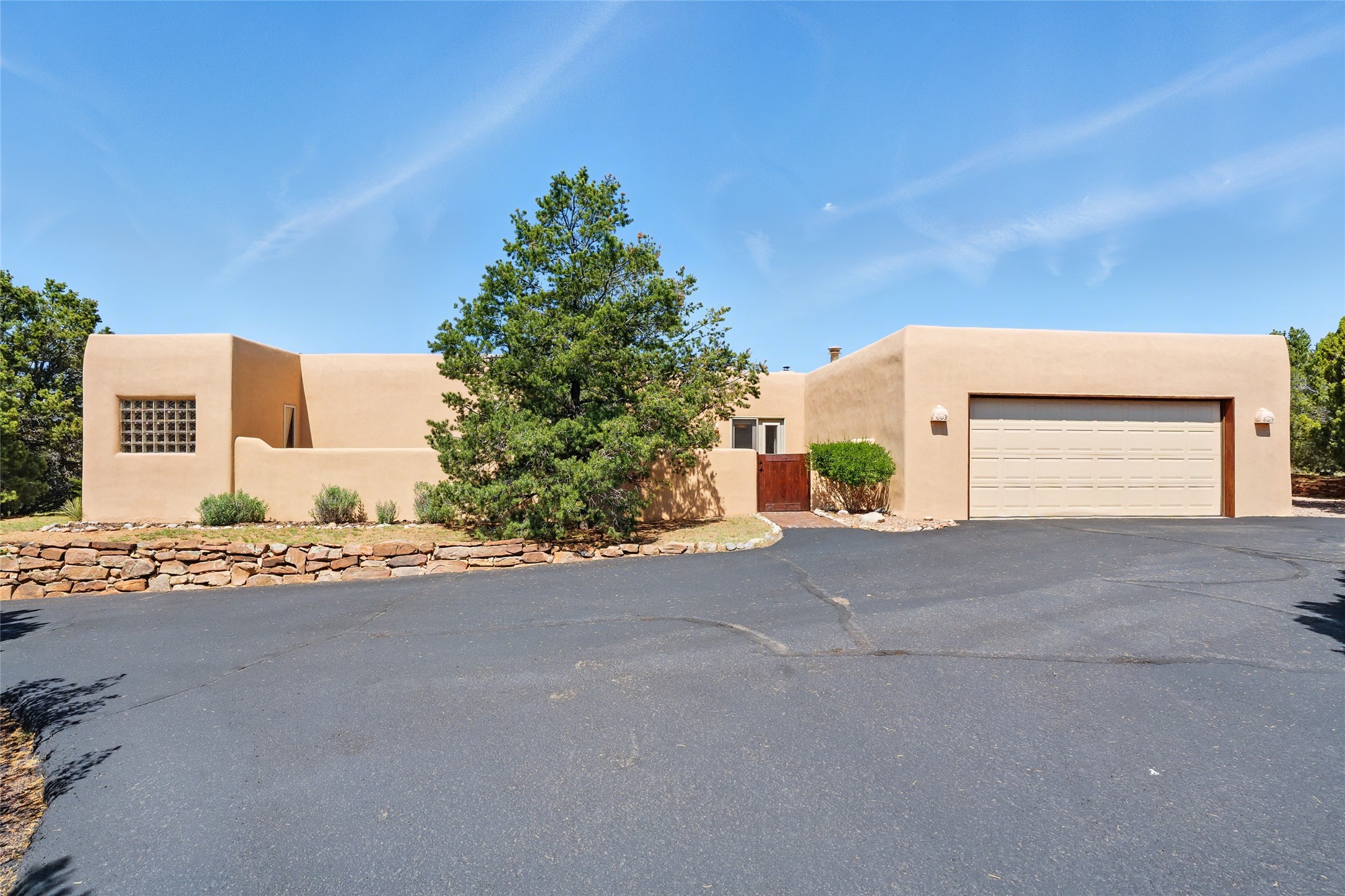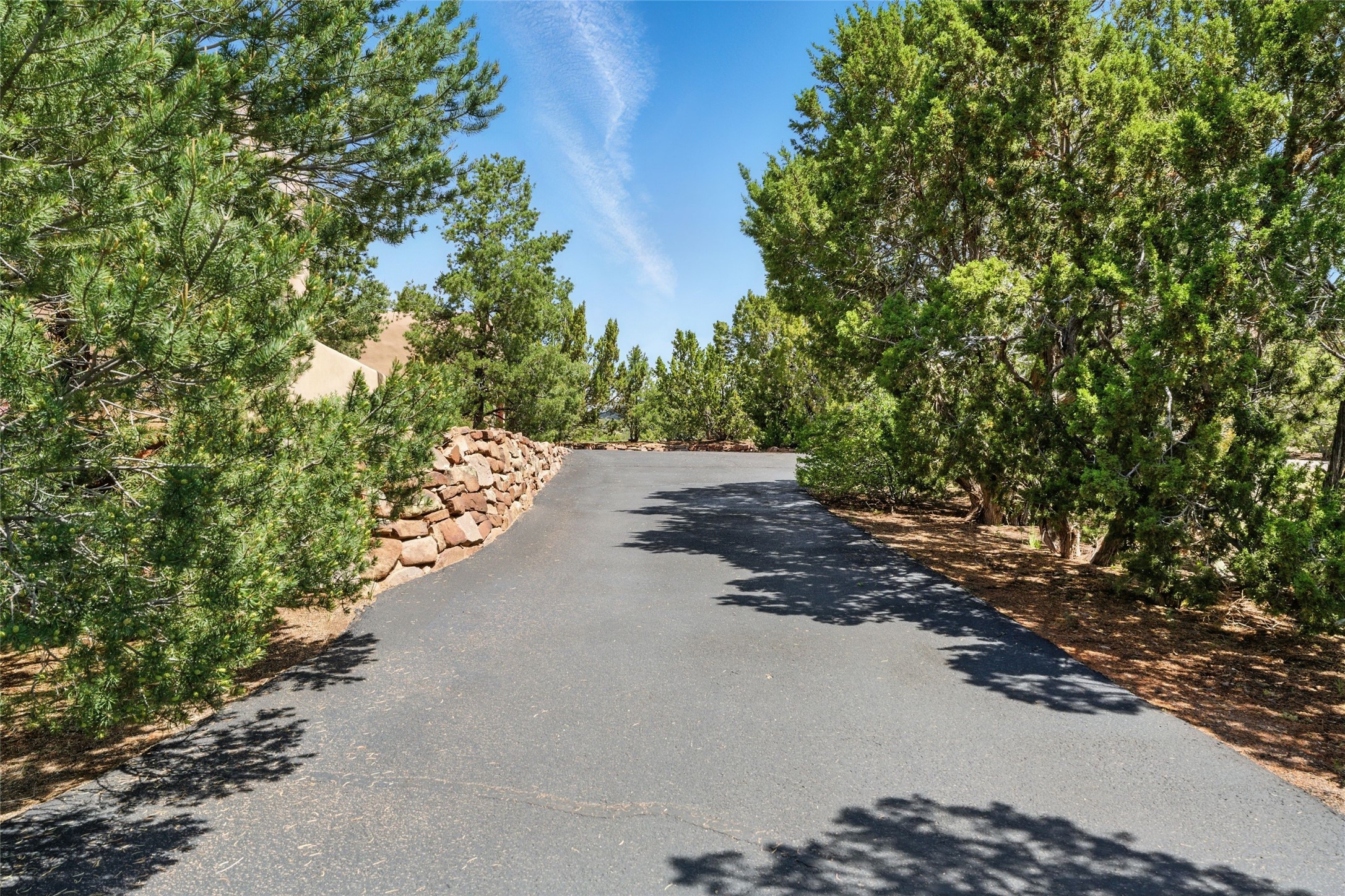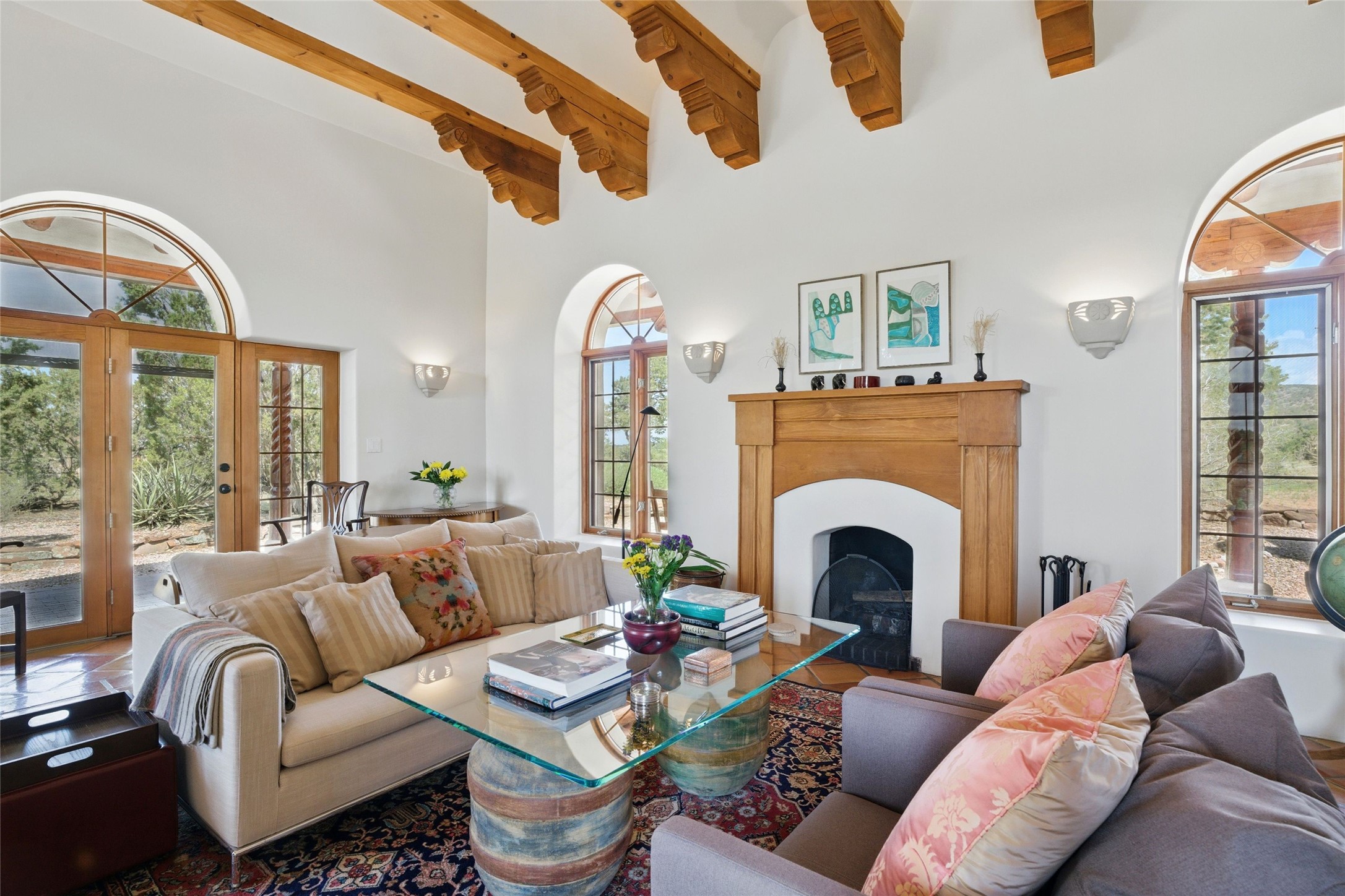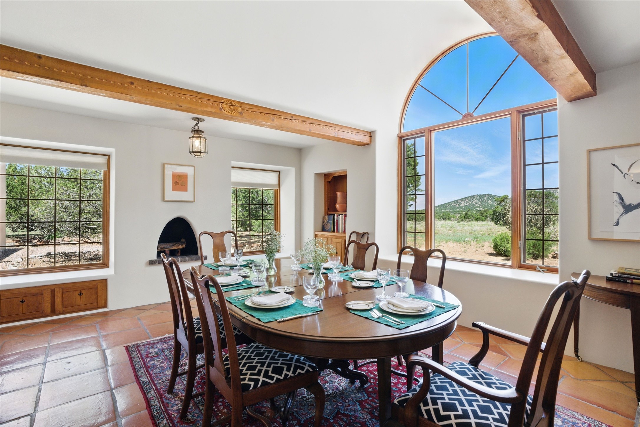 BEAUTIFUL BELICIA ESTATES PROPERTY! NEW HEATING SYSTEM - SPLITS AND FORCED AIR IN PROCESS. Privacy and views! Designed by William Lumpkins and built by Adobeworks, this elegant home has a dramatic great room with 10' ceilings and a spectacular center hallway with an 11' barrel ceiling. This property has been PRE-INSPECTED and most repairs completed. The generous primary suite has a kiva fireplace with banco, viga and latilla ceiling, spacious bath with double sinks and separate shower and walk-in closet. Two guest rooms with Jack and Jill bath. The office has custom iron gates and built-in book shelves. Charming powder room. A gorgeous wrap around portal with viga ceilings and brick floor, goes around three sides of the home. In-floor natural gas radiant heating. Kitchen has stainless steel appliances, breakfast area and a patio. Sunset side has a pull down shade. Located on 2 acres on a paved road with a paved driveway, this property backs up to 2,650 undeveloped acres. The professionally designed landscaping (17K) completes the front approach. Proper laundry room with sink and good storage. Silicone roof in May 2025. Driveway resealed 2025. Water heater 2024. Refrigerator and washer/dryer 2025. Saltillo tile throughout. NO CARPET. NO STEPS. BRAND NEW AIR CONDITIONING. Tiled room off the primary bath was used for a jetted tub - was converted to an exercise room by previous owners - plumbing still in place. Refrigerated air conditioning in bedroom wing only. Security system is ADT and can be transferred to new owners. Three rainbarrels - 60 gallons each. Chimneys have been inspected and minor repairs completed. Pre-inspection report available upon request.