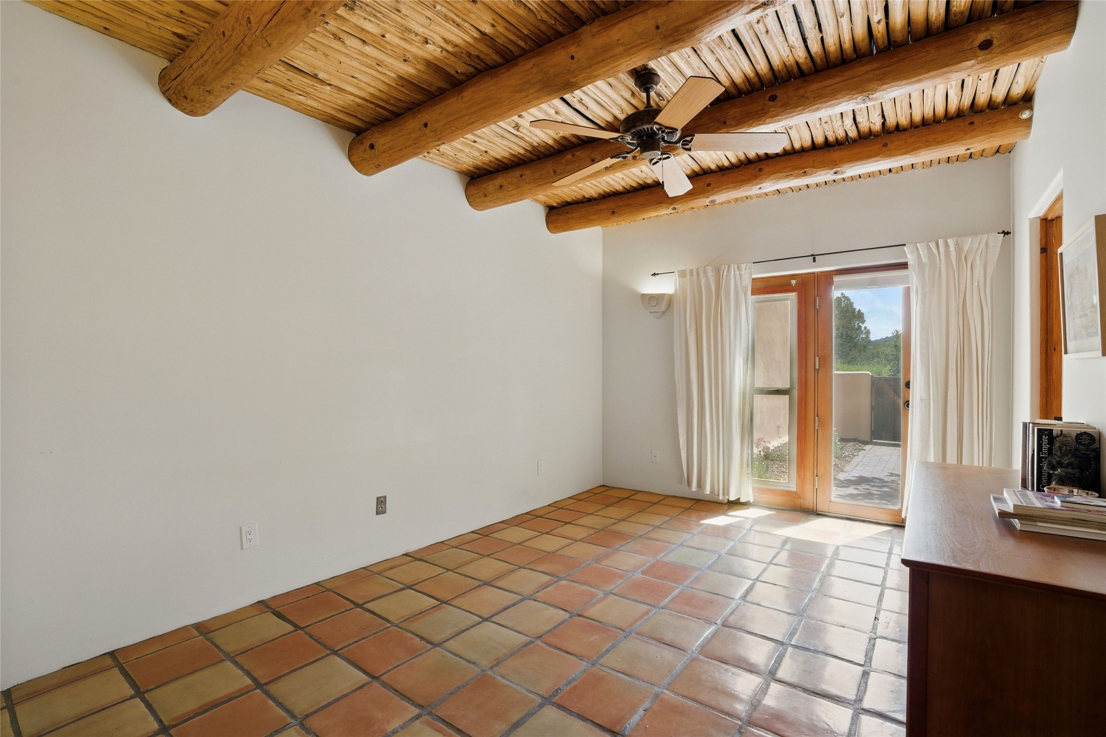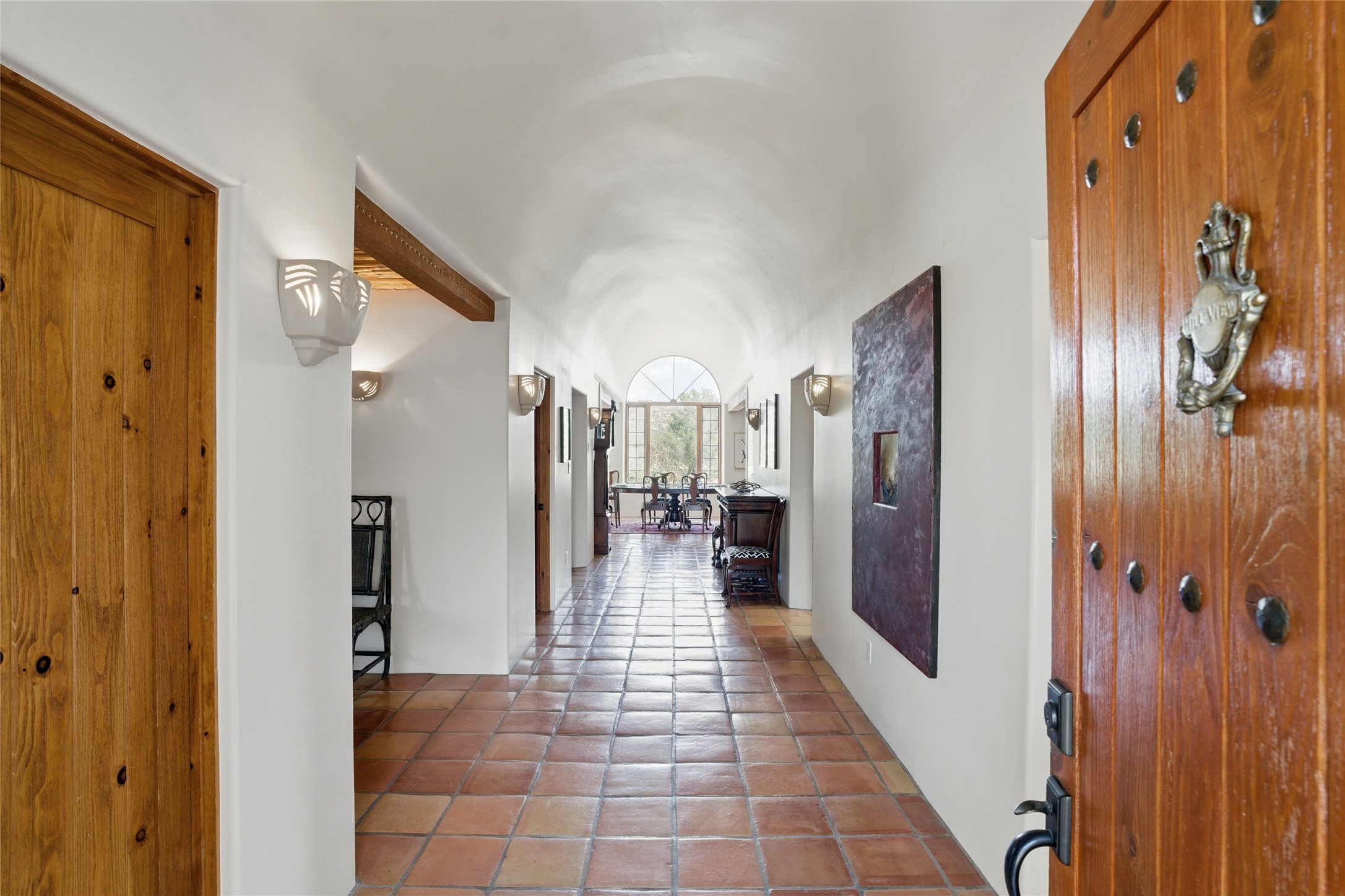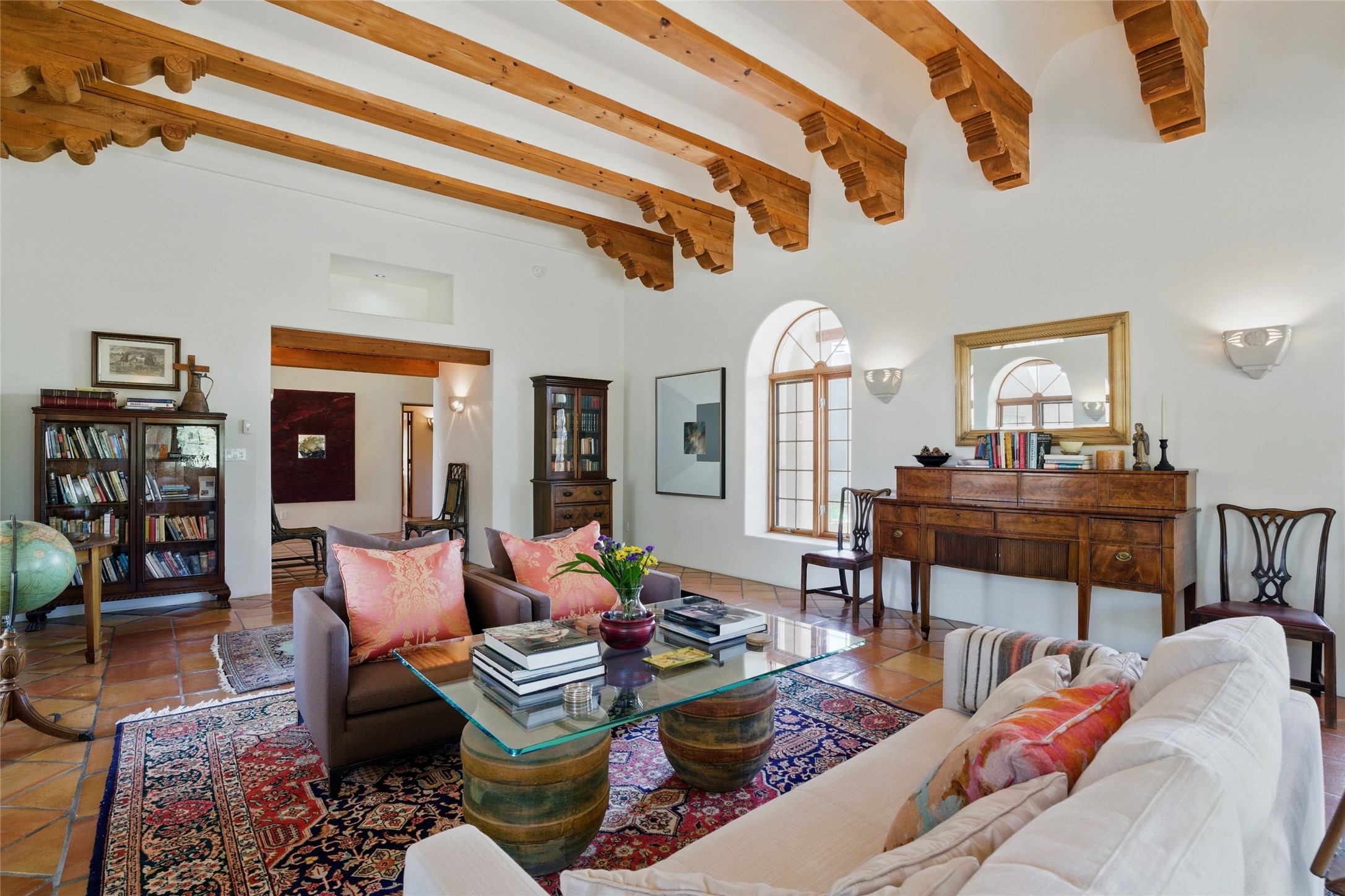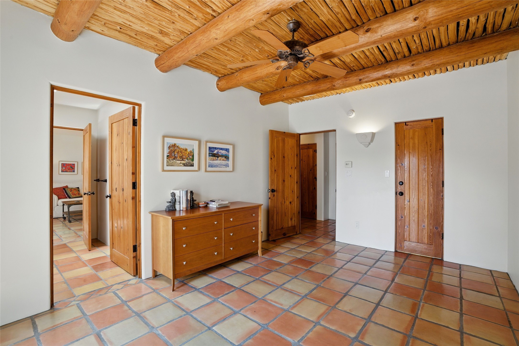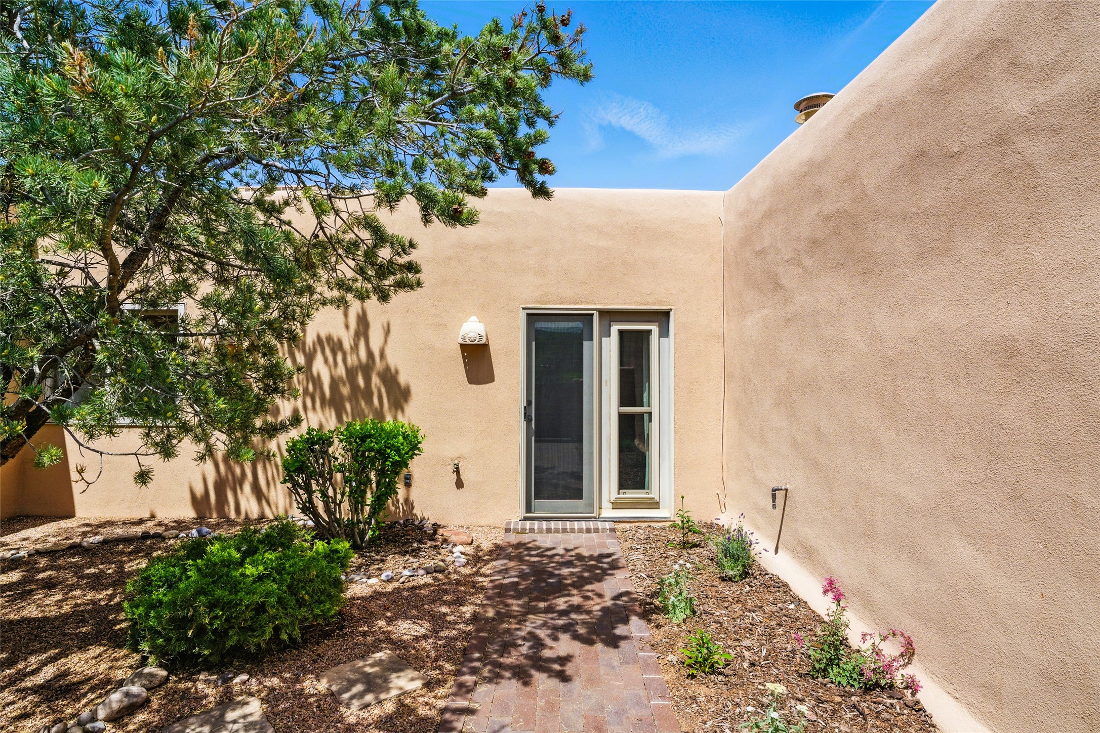 BEAUTIFUL BELICIA ESTATES PROPERTY! NEW HEATING SYSTEM - SPLITS AND FORCED AIR IN PROCESS. Privacy and views! Designed by William Lumpkins and built by Adobeworks, this elegant home has a dramatic great room with 10' ceilings and a spectacular center hallway with an 11' barrel ceiling. This property has been PRE-INSPECTED and most repairs completed. The generous primary suite has a kiva fireplace with banco, viga and latilla ceiling, spacious bath with double sinks and separate shower and walk-in closet. Two guest rooms with Jack and Jill bath. The office has custom iron gates and built-in book shelves. Charming powder room. A gorgeous wrap around portal with viga ceilings and brick floor, goes around three sides of the home. In-floor natural gas radiant heating. Kitchen has stainless steel appliances, breakfast area and a patio. Sunset side has a pull down shade. Located on 2 acres on a paved road with a paved driveway, this property backs up to 2,650 undeveloped acres. The professionally designed landscaping (17K) completes the front approach. Proper laundry room with sink and good storage. Silicone roof in May 2025. Driveway resealed 2025. Water heater 2024. Refrigerator and washer/dryer 2025. Saltillo tile throughout. NO CARPET. NO STEPS. BRAND NEW AIR CONDITIONING. Tiled room off the primary bath was used for a jetted tub - was converted to an exercise room by previous owners - plumbing still in place. Refrigerated air conditioning in bedroom wing only. Security system is ADT and can be transferred to new owners. Three rainbarrels - 60 gallons each. Chimneys have been inspected and minor repairs completed. Pre-inspection report available upon request.