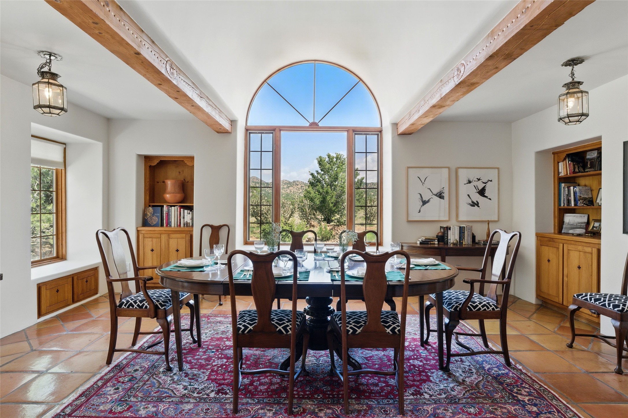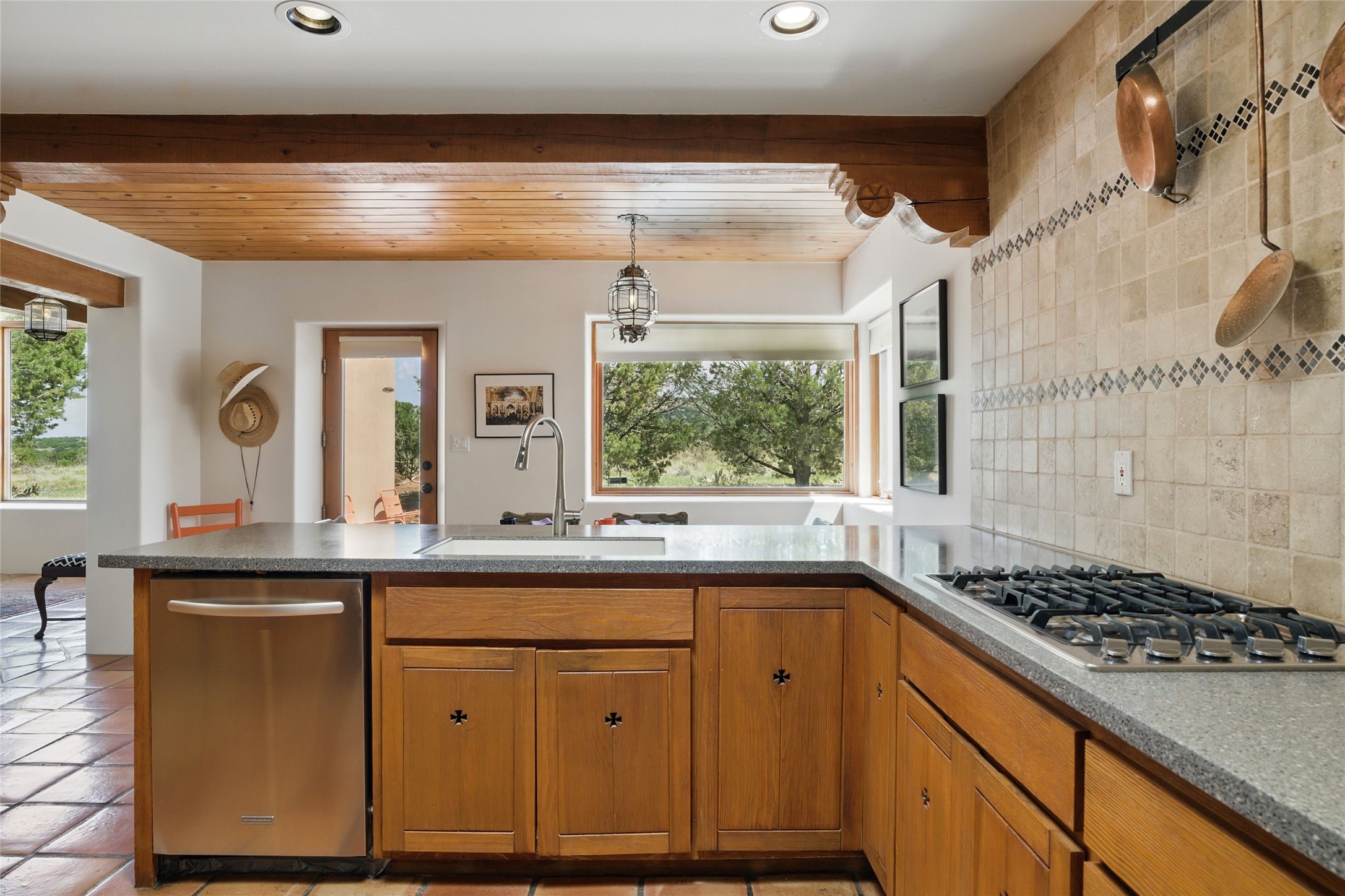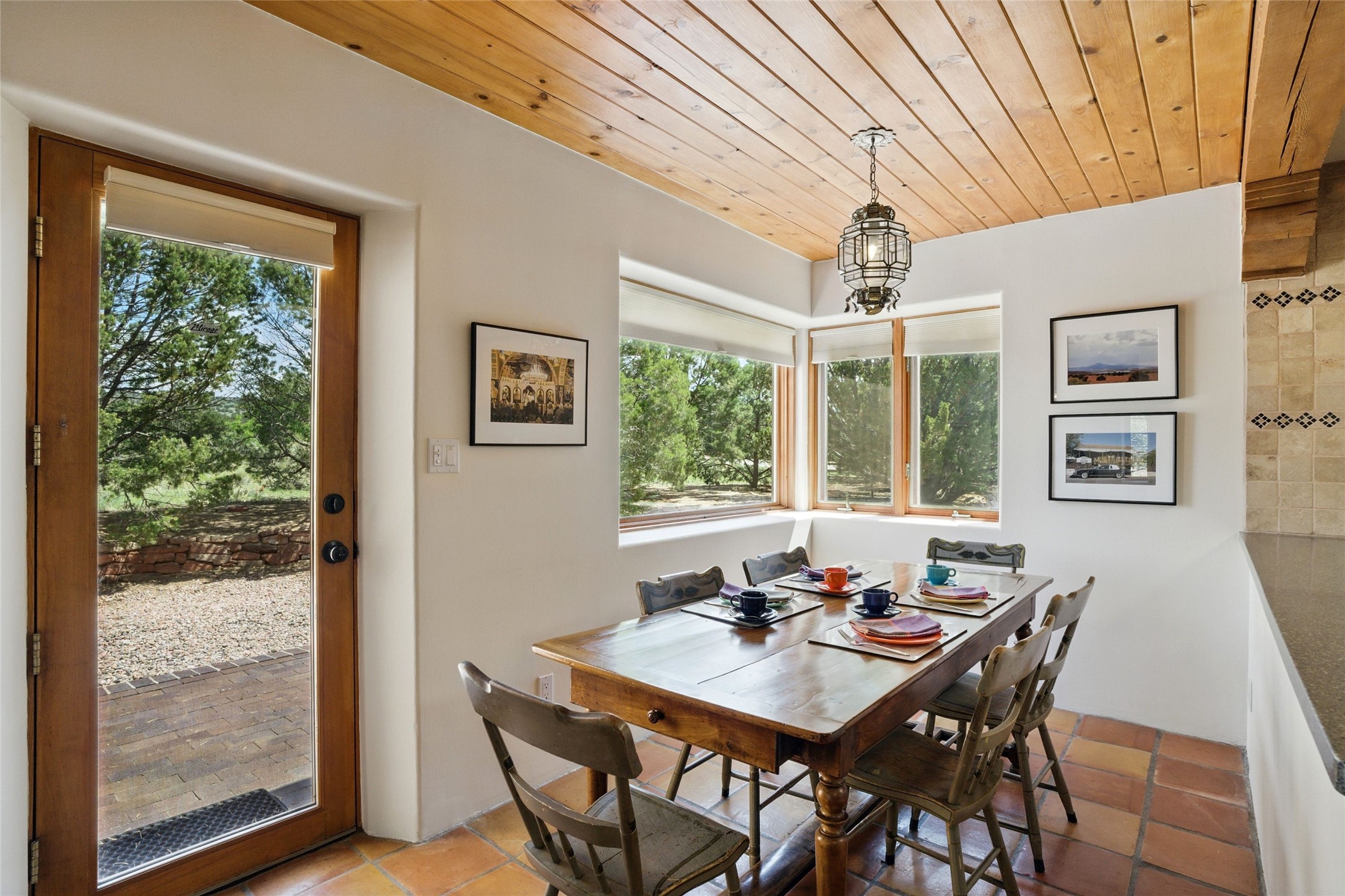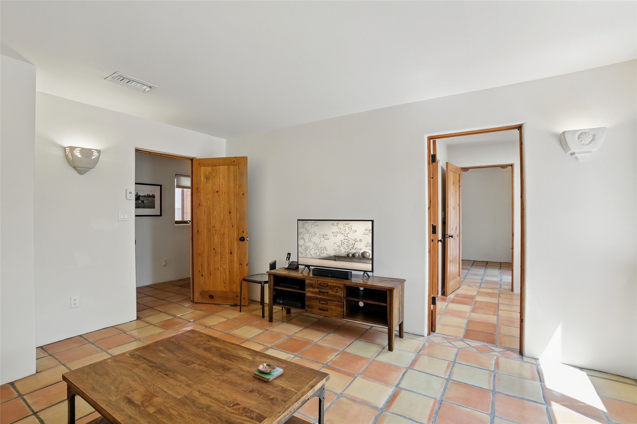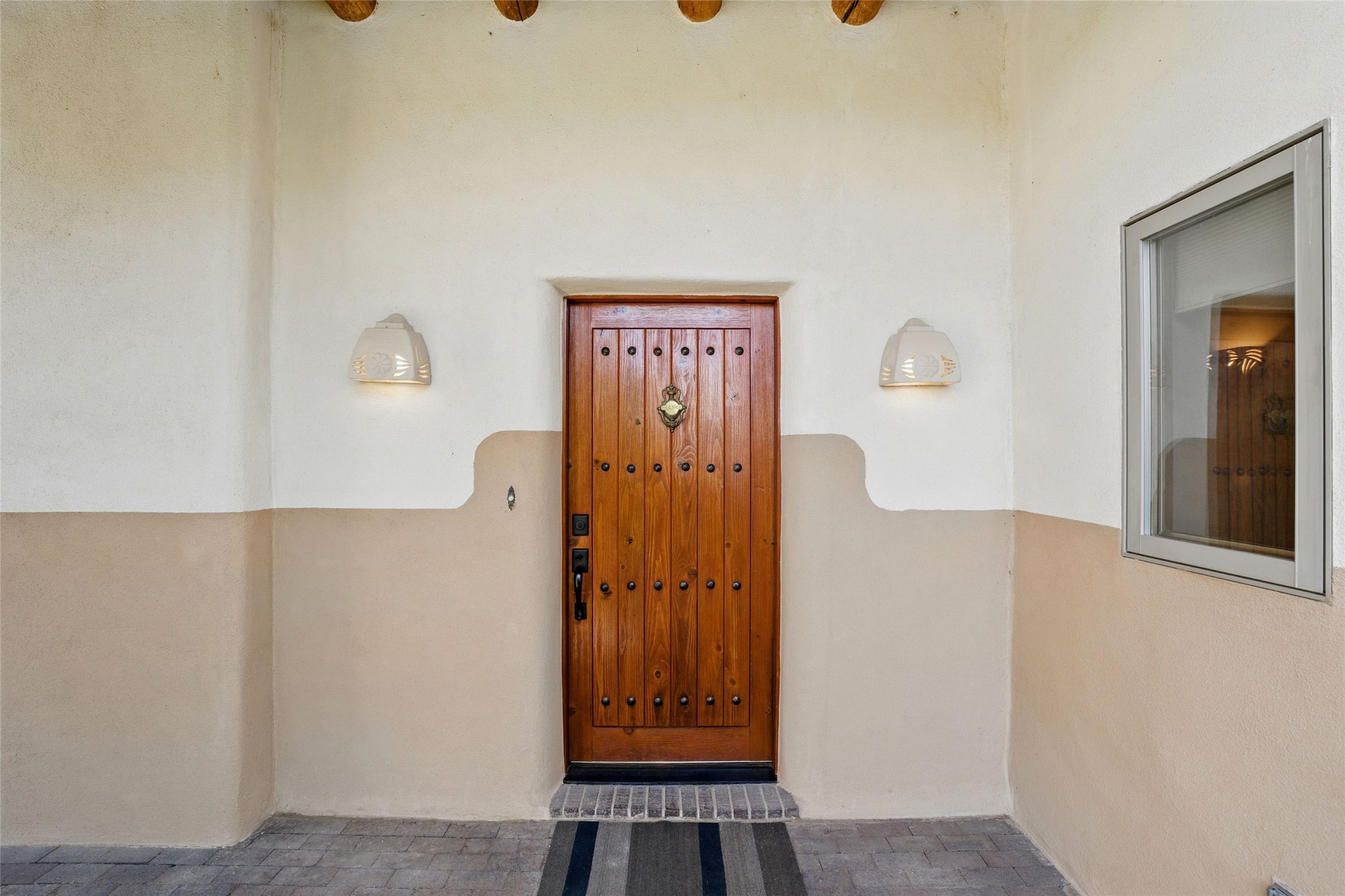 BEAUTIFUL BELICIA ESTATES PROPERTY! NEW HEATING SYSTEM - SPLITS AND FORCED AIR IN PROCESS. Privacy and views! Designed by William Lumpkins and built by Adobeworks, this elegant home has a dramatic great room with 10' ceilings and a spectacular center hallway with an 11' barrel ceiling. This property has been PRE-INSPECTED and most repairs completed. The generous primary suite has a kiva fireplace with banco, viga and latilla ceiling, spacious bath with double sinks and separate shower and walk-in closet. Two guest rooms with Jack and Jill bath. The office has custom iron gates and built-in book shelves. Charming powder room. A gorgeous wrap around portal with viga ceilings and brick floor, goes around three sides of the home. In-floor natural gas radiant heating. Kitchen has stainless steel appliances, breakfast area and a patio. Sunset side has a pull down shade. Located on 2 acres on a paved road with a paved driveway, this property backs up to 2,650 undeveloped acres. The professionally designed landscaping (17K) completes the front approach. Proper laundry room with sink and good storage. Silicone roof in May 2025. Driveway resealed 2025. Water heater 2024. Refrigerator and washer/dryer 2025. Saltillo tile throughout. NO CARPET. NO STEPS. BRAND NEW AIR CONDITIONING. Tiled room off the primary bath was used for a jetted tub - was converted to an exercise room by previous owners - plumbing still in place. Refrigerated air conditioning in bedroom wing only. Security system is ADT and can be transferred to new owners. Three rainbarrels - 60 gallons each. Chimneys have been inspected and minor repairs completed. Pre-inspection report available upon request.