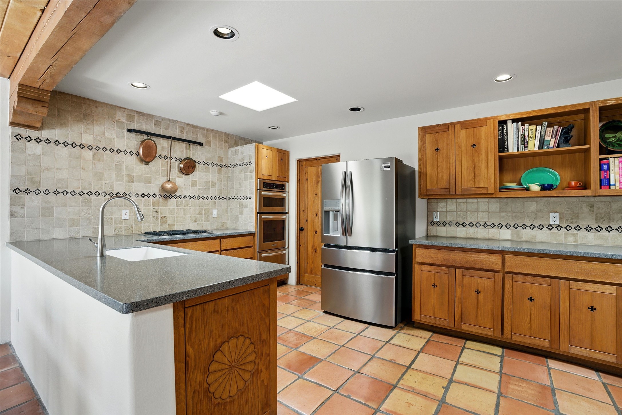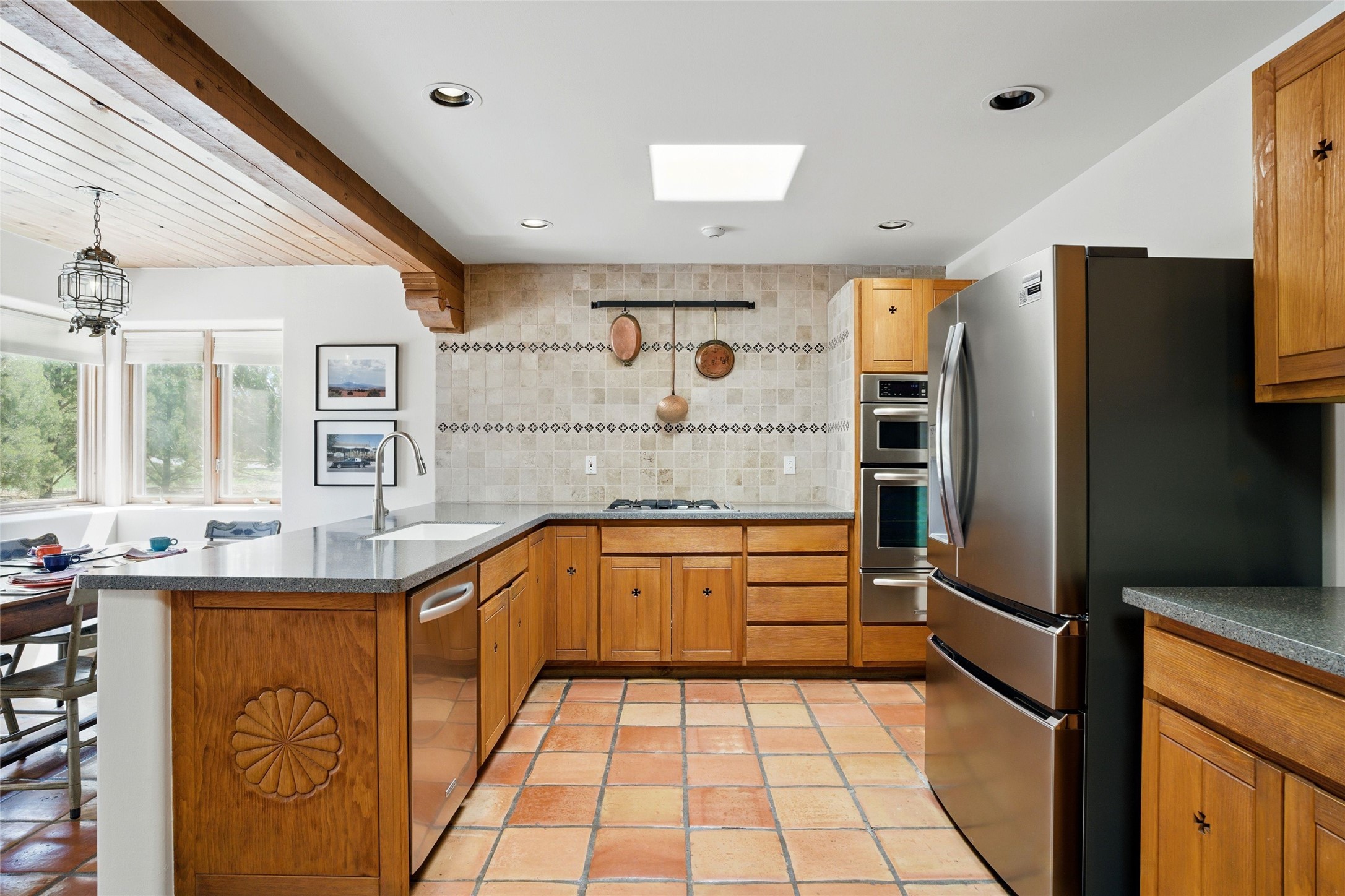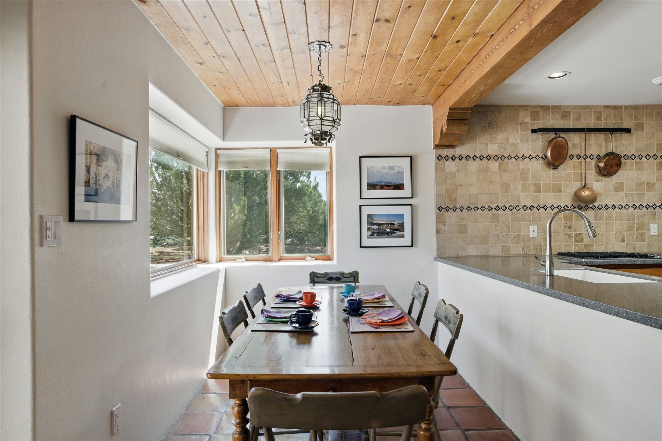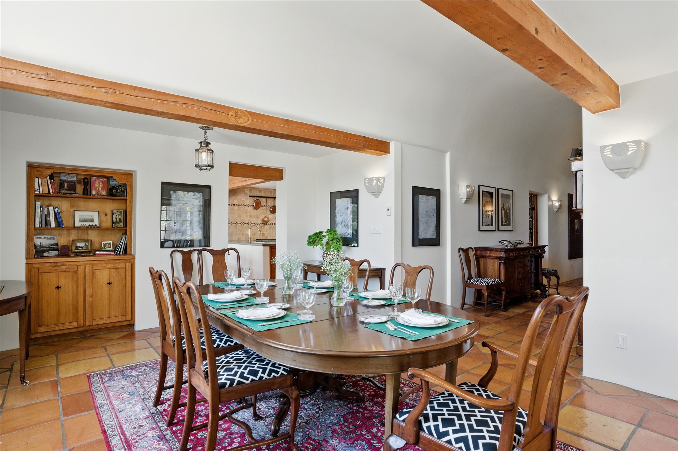 BEAUTIFUL BELICIA ESTATES PROPERTY! NEW HEATING SYSTEM - SPLITS AND FORCED AIR IN PROCESS. Privacy and views! Designed by William Lumpkins and built by Adobeworks, this elegant home has a dramatic great room with 10' ceilings and a spectacular center hallway with an 11' barrel ceiling. This property has been PRE-INSPECTED and most repairs completed. The generous primary suite has a kiva fireplace with banco, viga and latilla ceiling, spacious bath with double sinks and separate shower and walk-in closet. Two guest rooms with Jack and Jill bath. The office has custom iron gates and built-in book shelves. Charming powder room. A gorgeous wrap around portal with viga ceilings and brick floor, goes around three sides of the home. In-floor natural gas radiant heating. Kitchen has stainless steel appliances, breakfast area and a patio. Sunset side has a pull down shade. Located on 2 acres on a paved road with a paved driveway, this property backs up to 2,650 undeveloped acres. The professionally designed landscaping (17K) completes the front approach. Proper laundry room with sink and good storage. Silicone roof in May 2025. Driveway resealed 2025. Water heater 2024. Refrigerator and washer/dryer 2025. Saltillo tile throughout. NO CARPET. NO STEPS. BRAND NEW AIR CONDITIONING. Tiled room off the primary bath was used for a jetted tub - was converted to an exercise room by previous owners - plumbing still in place. Refrigerated air conditioning in bedroom wing only. Security system is ADT and can be transferred to new owners. Three rainbarrels - 60 gallons each. Chimneys have been inspected and minor repairs completed. Pre-inspection report available upon request.