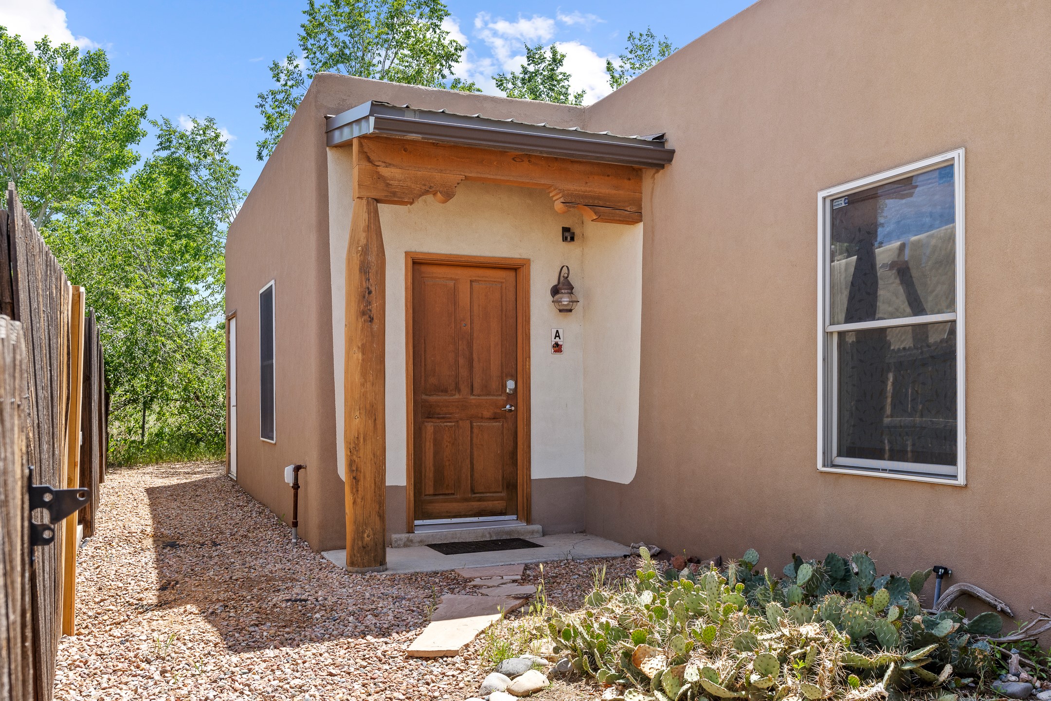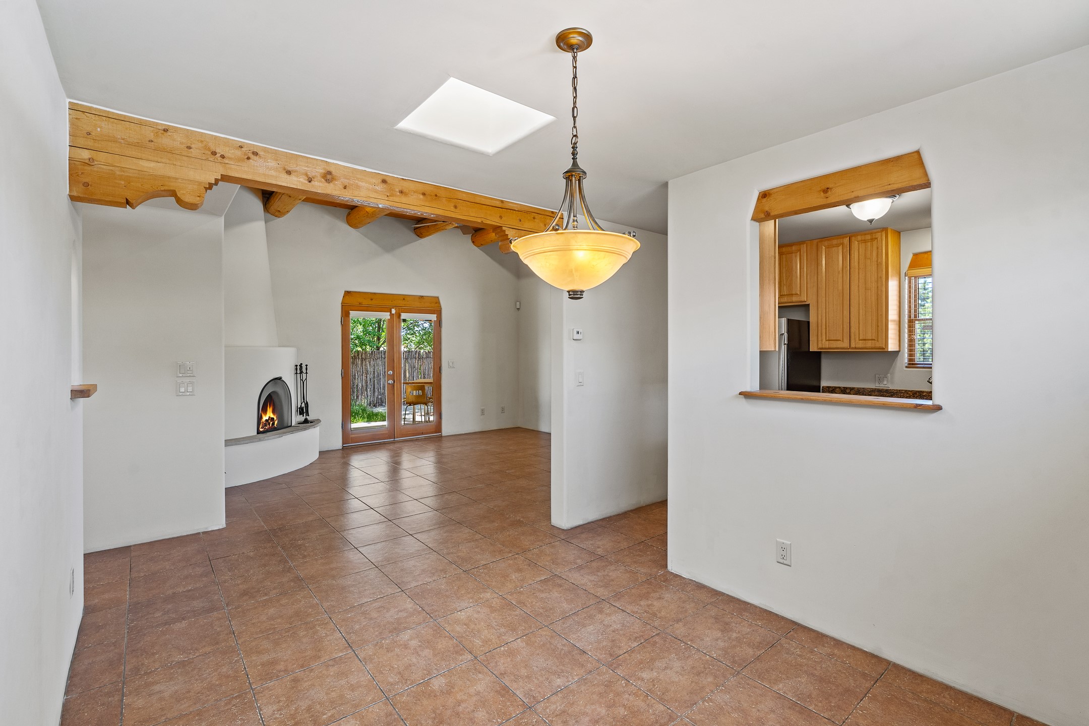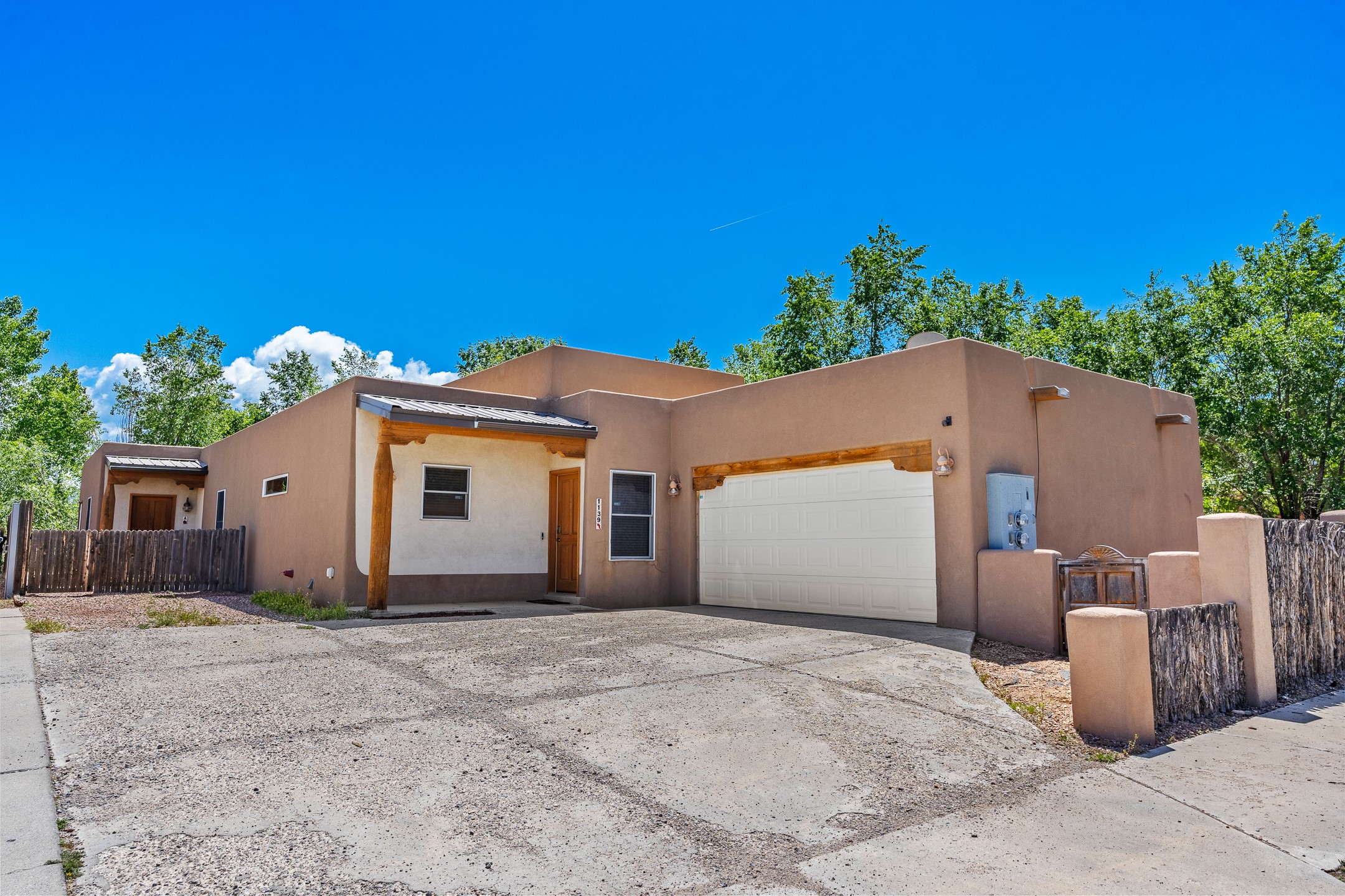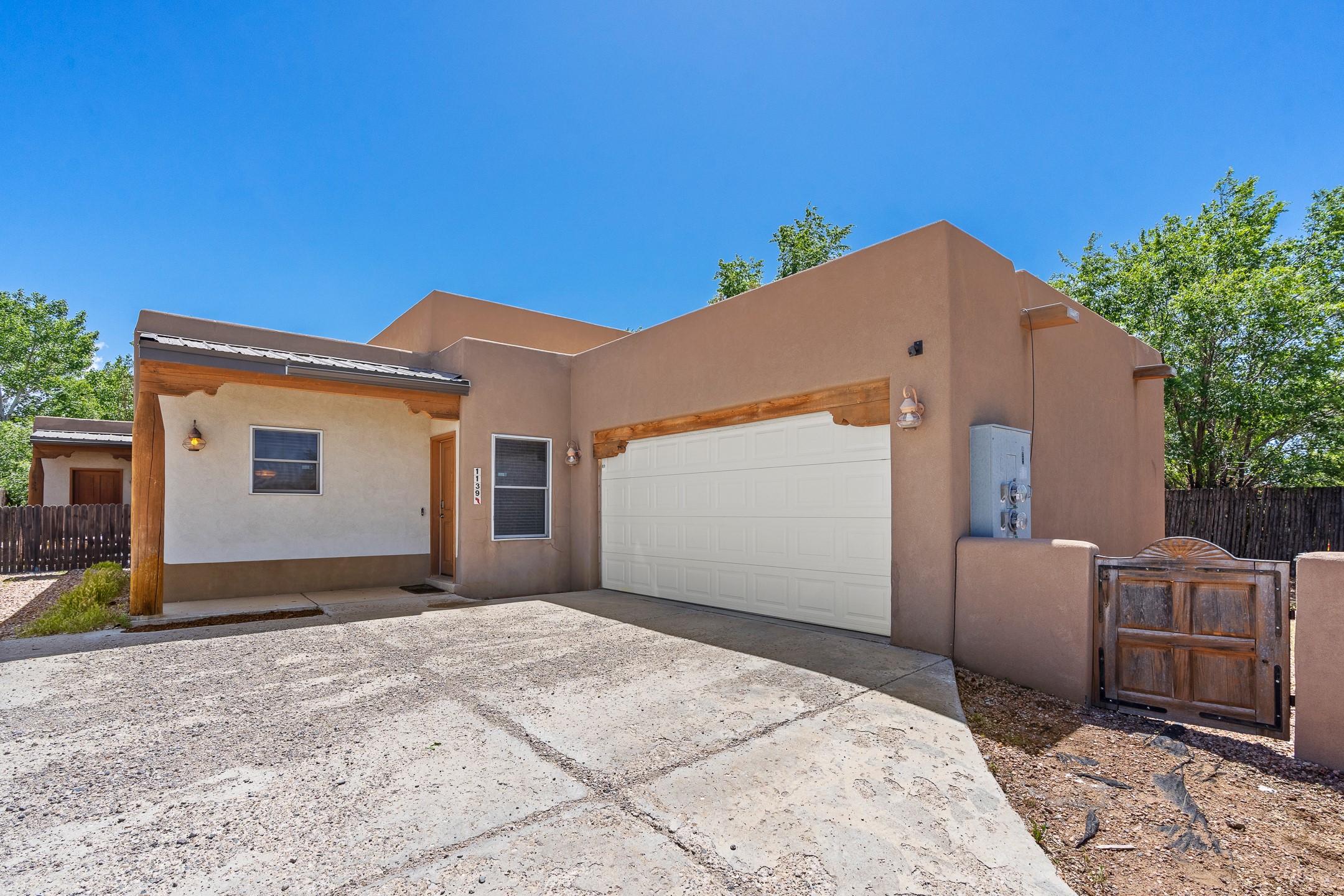 A versatile and charming property featuring a 3-bedroom, 2-bath main house plus a separate 1-bedroom, 1-bath guest house; ideal for rental income, extended family, or a home studio. The main house offers a spacious living area with tile floors, wood-beamed ceilings, and a traditional kiva fireplace, opening into the dining and kitchen area and a lovely covered patio area in a fully fenced yard. The primary suite includes a private bath and walk-in closet. A two-car garage adds to the flexible usage of the property. The guest house has its own entrance and includes a living area, kitchenette, bedroom, and full bath. There is also a washer / dryer hook-up, and it is separately metered. Centrally located, less than a 10-minute walk to restaurants such as Escondido and Tumbleroot Brewery, and a 10-minute drive to the Plaza.