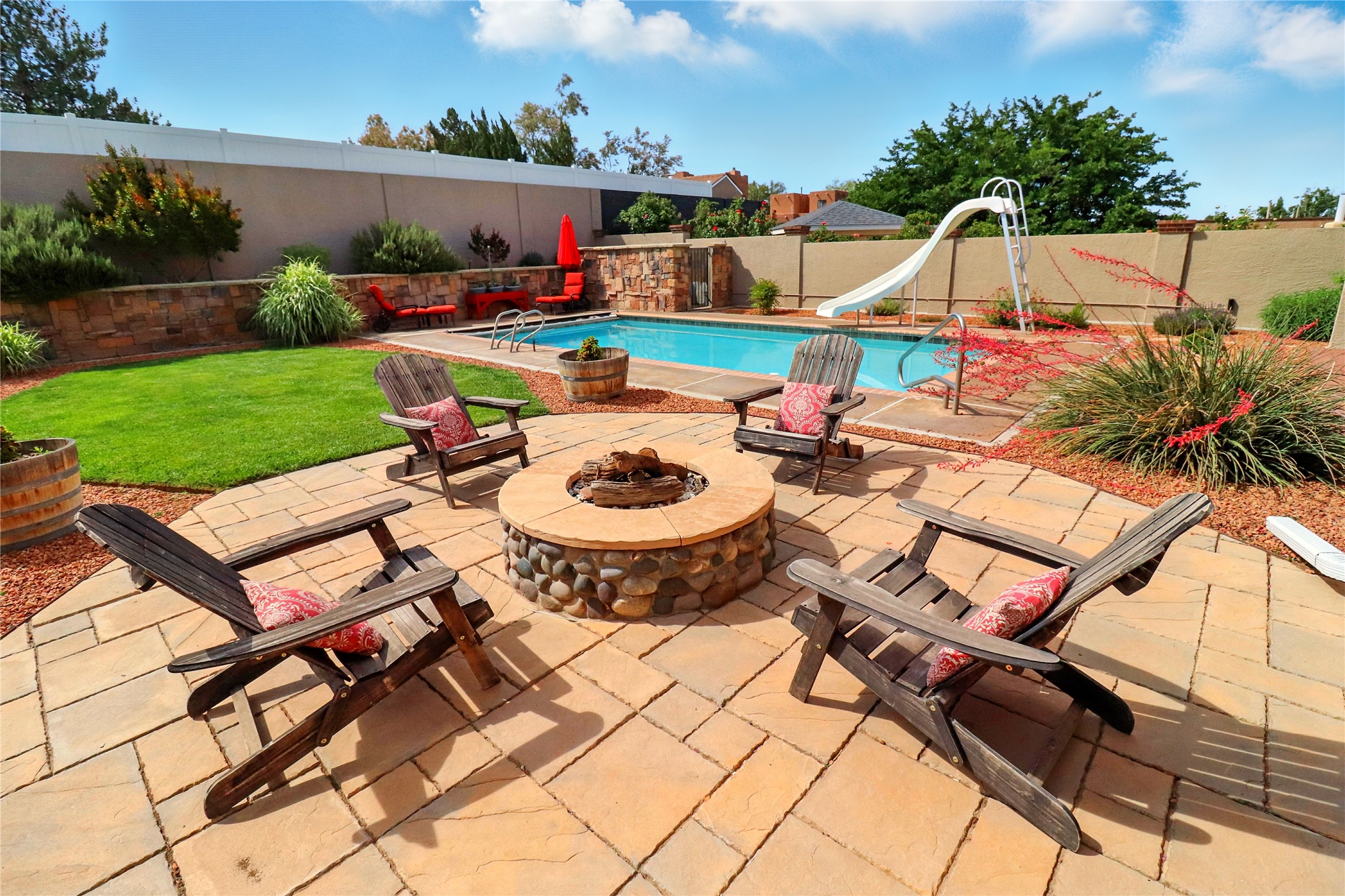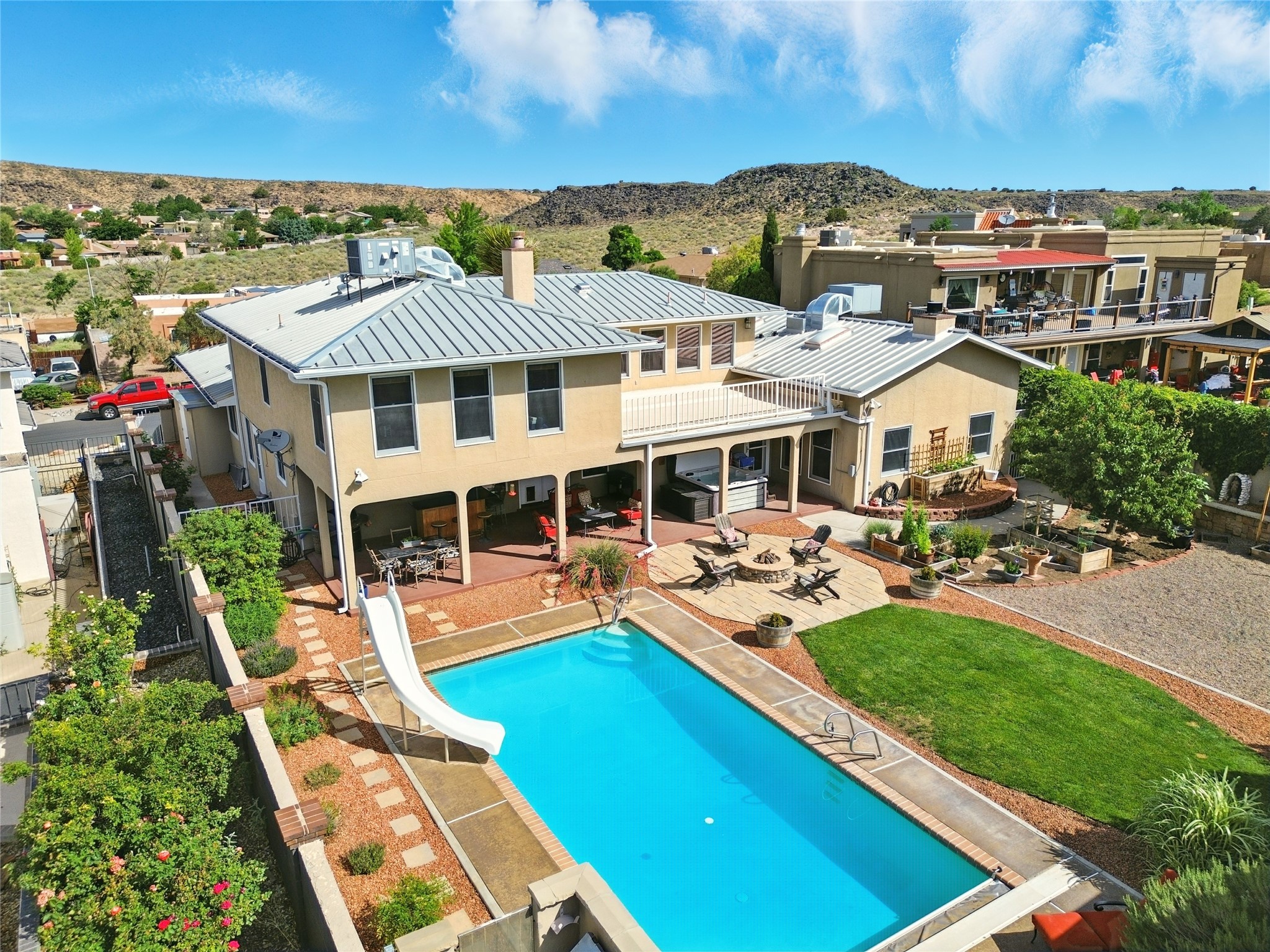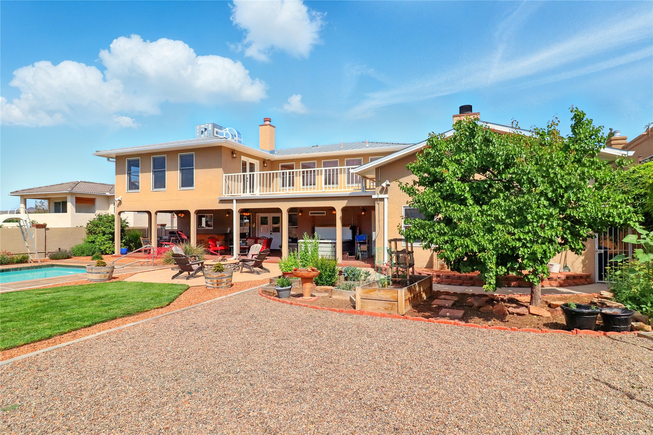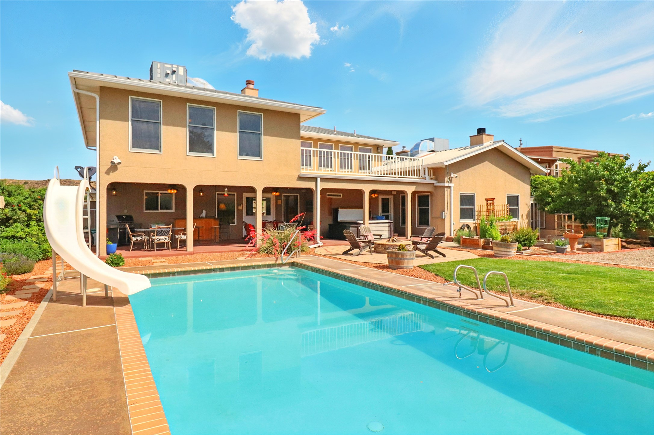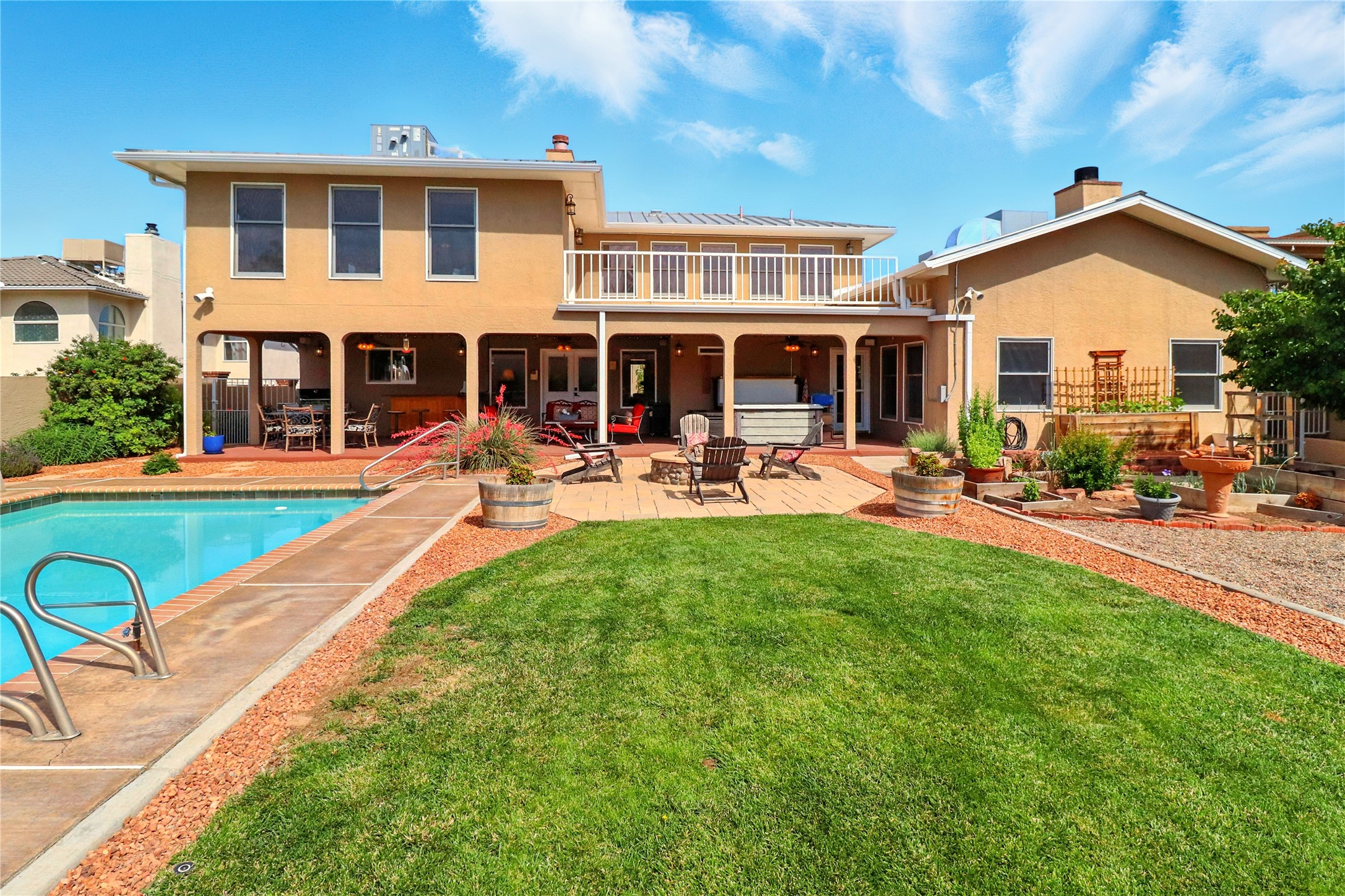 Nestled in the desirable Taylor Ranch community, this stunning 4-bedroom, 4-bathroom two-story home is an entertainer's dream! Through the welcoming entry courtyard, you enter into "La Sala Grande" with raised 12' newly painted ceilings, Venetian plaster walls, recessed lighting and a stone-covered wood burning fireplace. The lovely chef's kitchen contains stainless steel appliances, a double oven & separate island range, oak cabinets & granite countertops with ample space and storage. With both off-counter seating & a separate dining area you have plenty of space for family and guests. Up the wooden staircase, the second floor is a true private retreat. The landing space at the top of the staircase offers space for an office or workout area. Through the double wooden doors, you find the primary suite with its own stone fireplace, walk-in closet, balcony, jetted tub and oversized shower. Two bedrooms located downstairs contain ensuite bathrooms & the third guest bedroom has direct access to the beautifully landscaped backyard. An oasis of its own, the meticulously maintained backyard includes a covered portal, heated gunite pool w/electric safety cover, hot tub, fire pit, bar & speaker system for ultimate entertainment and enjoyment. Recent upkeeps include 3 newer refrigerated air units, sanded/refinished wooden doors throughout, newly painted ceilings & new TPO installed on patio roof off the primary suite with warranty. With lots of windows & skylights, tasteful wooden accents throughout, painted concrete outside, double-car garage with tons of storage space & a giant walk-in laundry room complete with cabinets, sink & counter space this magnificent home on an expansive lot is truly a must see. Experience peace, tranquility & the best of Albuquerque living in this exceptional, competitively priced home. Don't miss this incredible opportunity. Imagine the possibilities and schedule your private tour today!