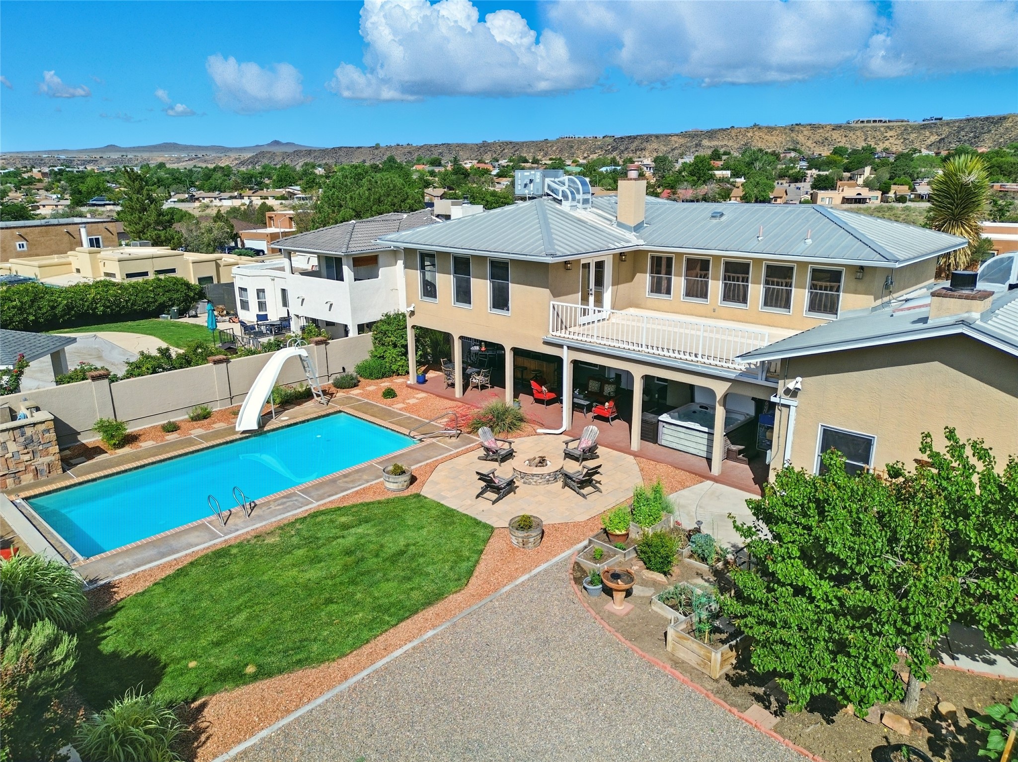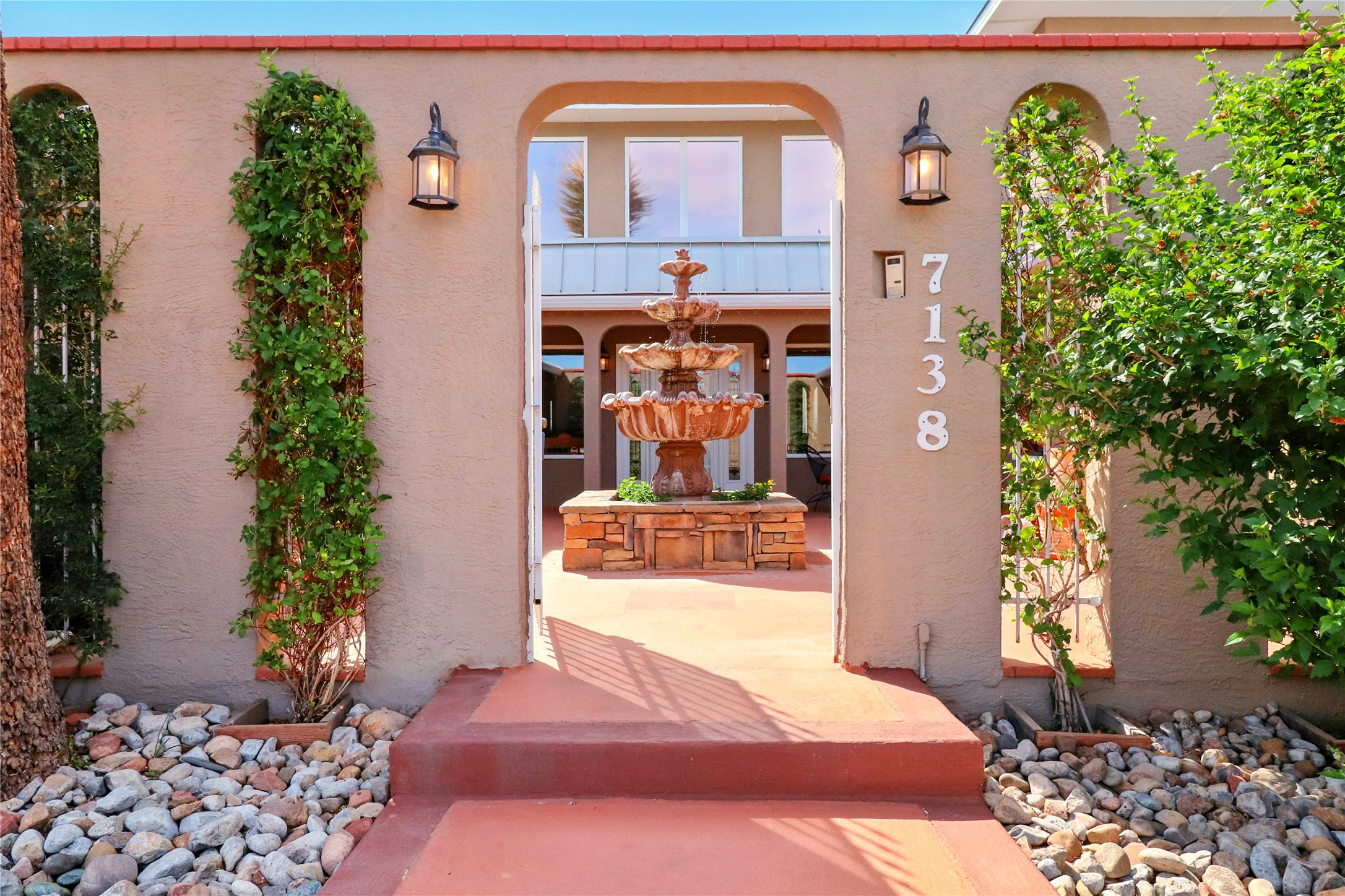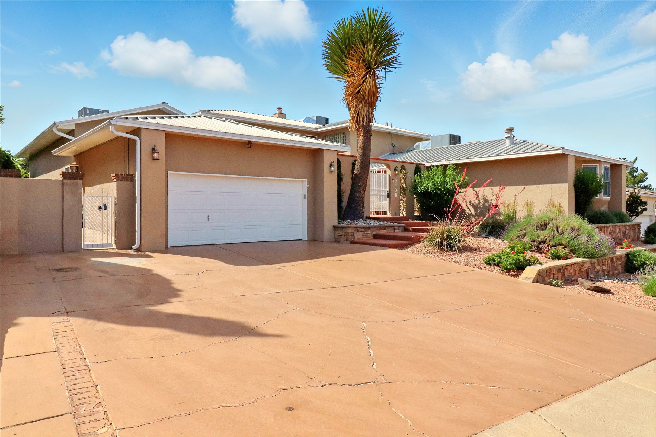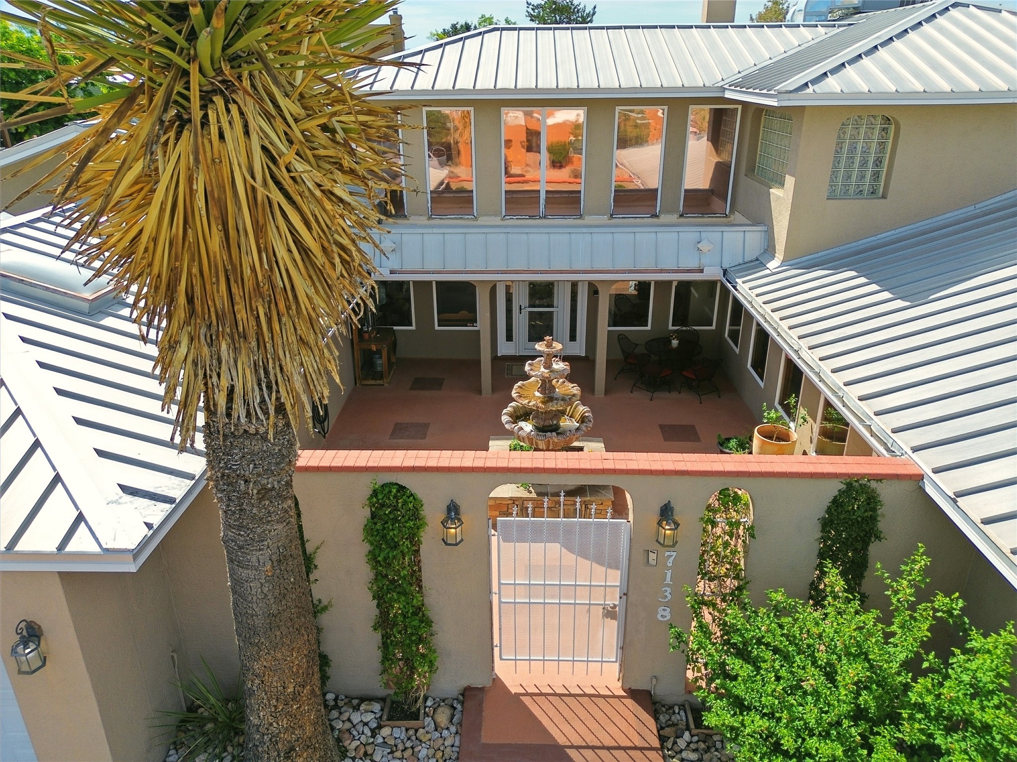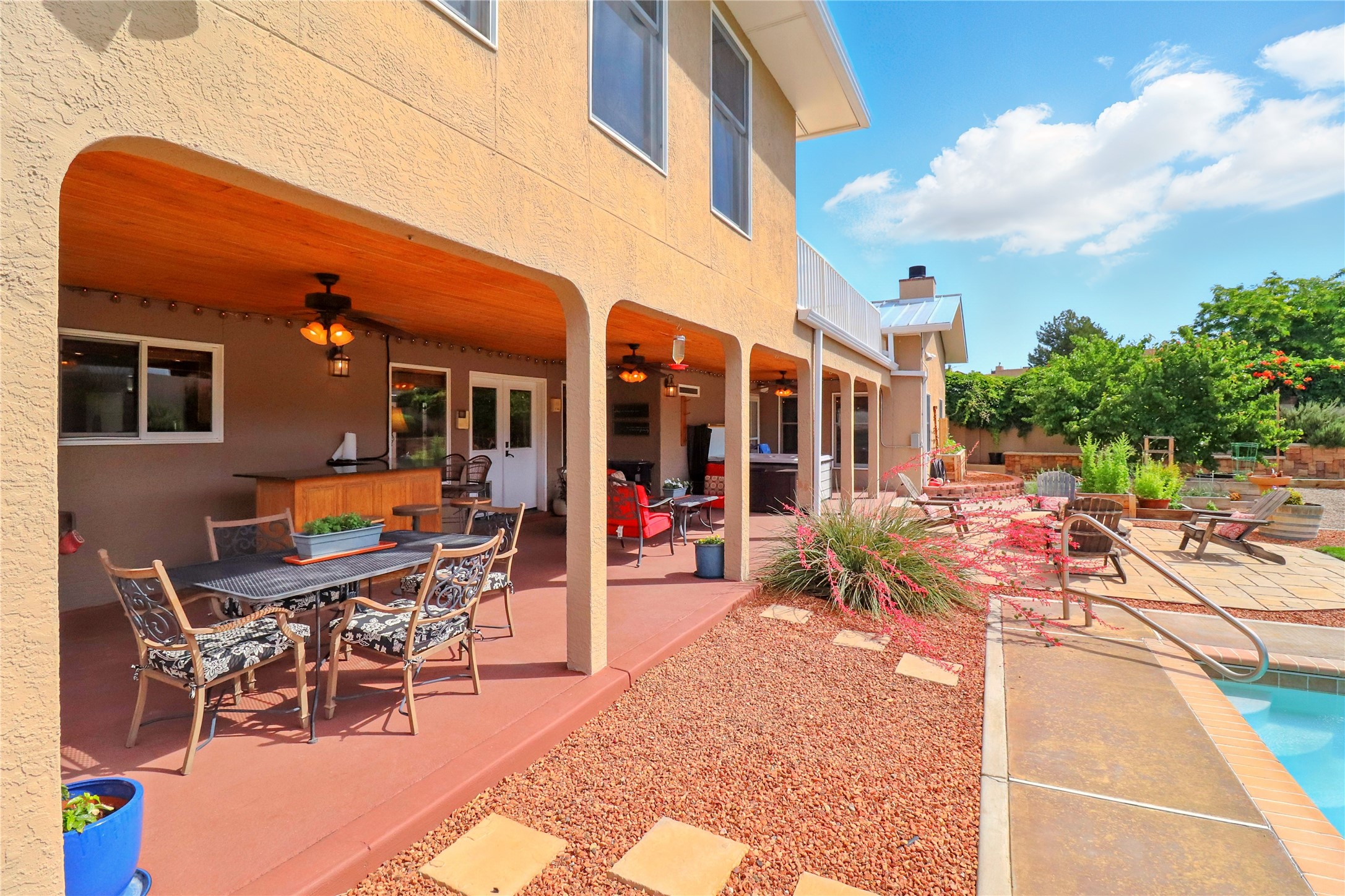 Nestled in the desirable Taylor Ranch community, this stunning 4-bedroom, 4-bathroom two-story home is an entertainer's dream! Through the welcoming entry courtyard, you enter into "La Sala Grande" with raised 12' newly painted ceilings, Venetian plaster walls, recessed lighting and a stone-covered wood burning fireplace. The lovely chef's kitchen contains stainless steel appliances, a double oven & separate island range, oak cabinets & granite countertops with ample space and storage. With both off-counter seating & a separate dining area you have plenty of space for family and guests. Up the wooden staircase, the second floor is a true private retreat. The landing space at the top of the staircase offers space for an office or workout area. Through the double wooden doors, you find the primary suite with its own stone fireplace, walk-in closet, balcony, jetted tub and oversized shower. Two bedrooms located downstairs contain ensuite bathrooms & the third guest bedroom has direct access to the beautifully landscaped backyard. An oasis of its own, the meticulously maintained backyard includes a covered portal, heated gunite pool w/electric safety cover, hot tub, fire pit, bar & speaker system for ultimate entertainment and enjoyment. Recent upkeeps include 3 newer refrigerated air units, sanded/refinished wooden doors throughout, newly painted ceilings & new TPO installed on patio roof off the primary suite with warranty. With lots of windows & skylights, tasteful wooden accents throughout, painted concrete outside, double-car garage with tons of storage space & a giant walk-in laundry room complete with cabinets, sink & counter space this magnificent home on an expansive lot is truly a must see. Experience peace, tranquility & the best of Albuquerque living in this exceptional, competitively priced home. Don't miss this incredible opportunity. Imagine the possibilities and schedule your private tour today!