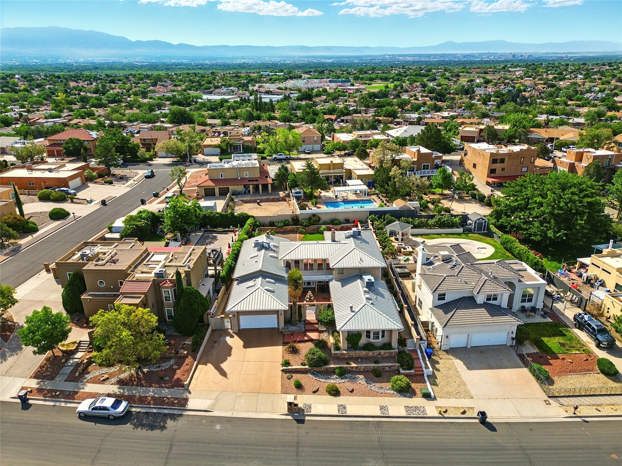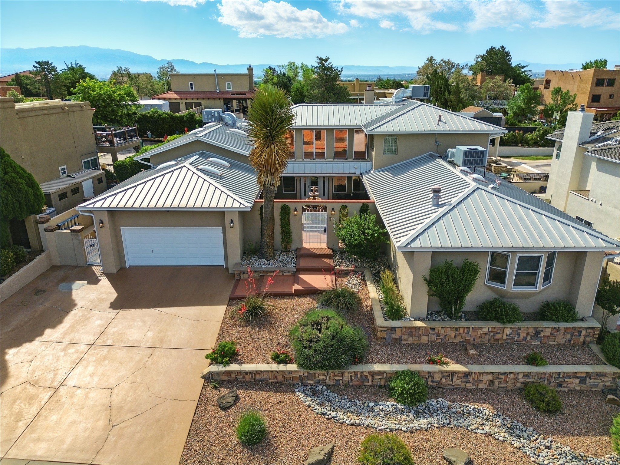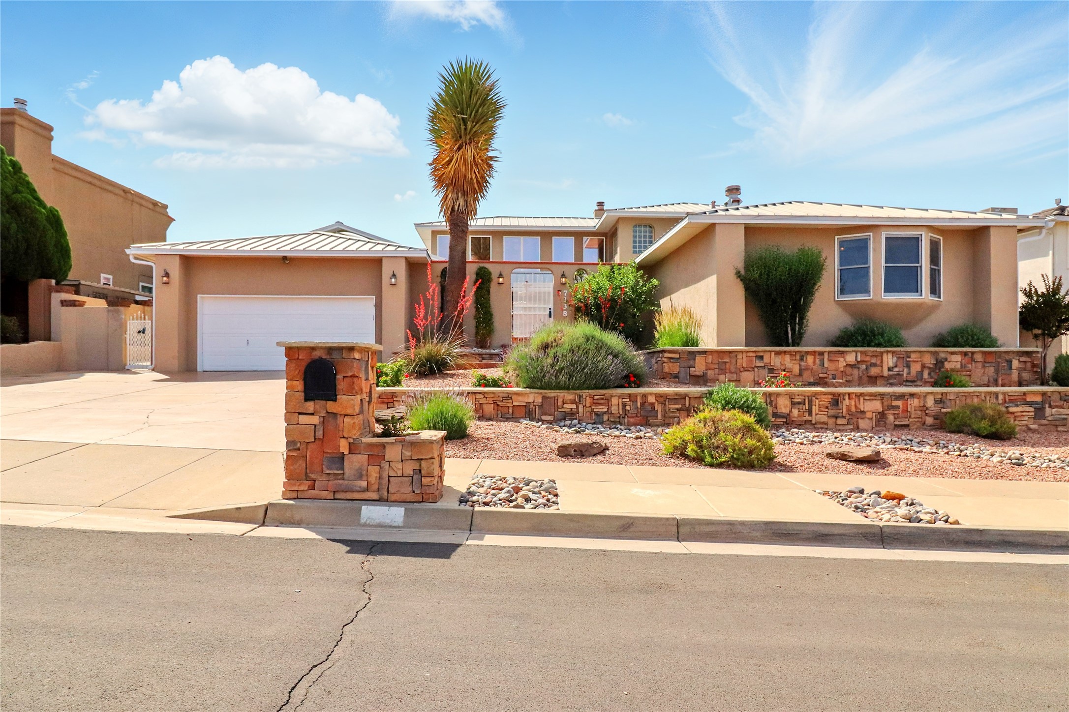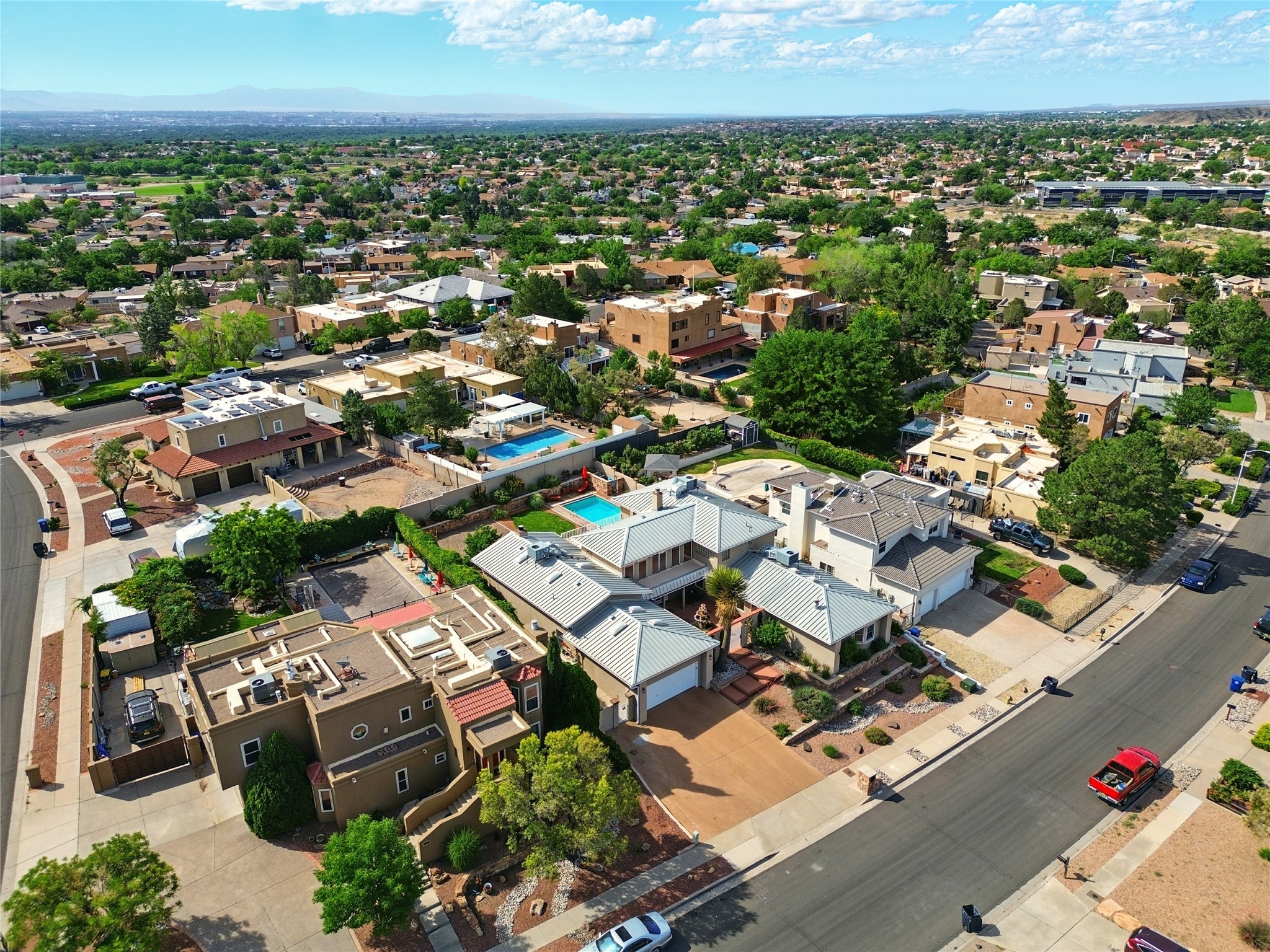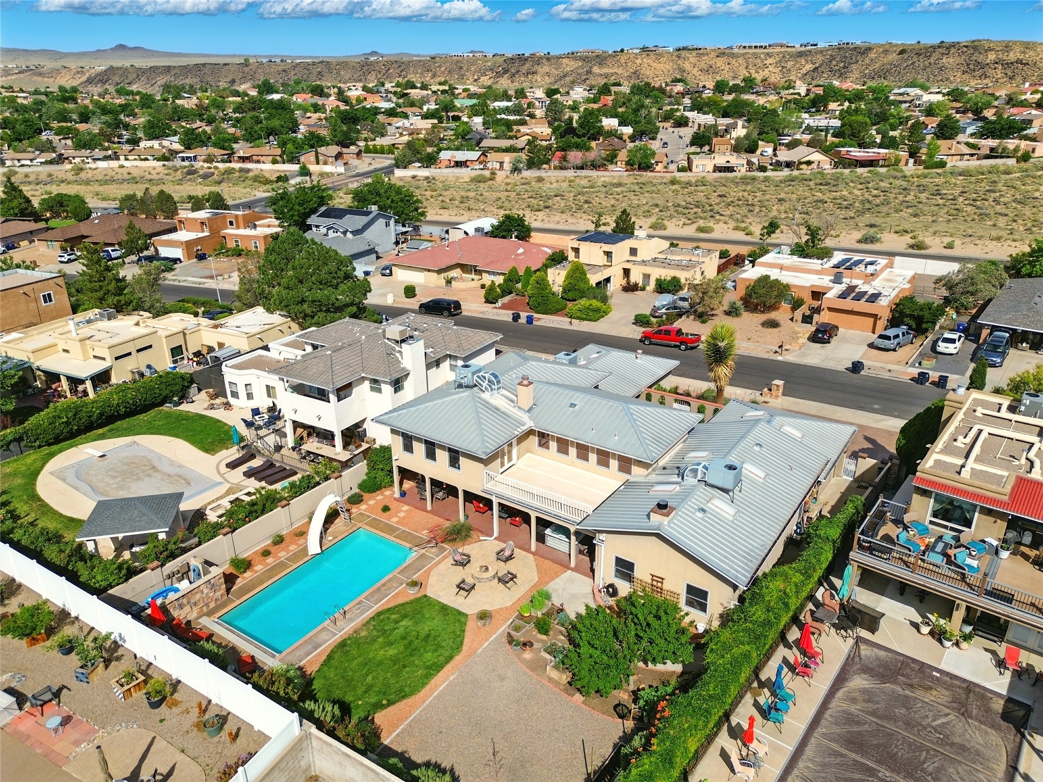 Nestled in the desirable Taylor Ranch community, this stunning 4-bedroom, 4-bathroom two-story home is an entertainer's dream! Through the welcoming entry courtyard, you enter into "La Sala Grande" with raised 12' newly painted ceilings, Venetian plaster walls, recessed lighting and a stone-covered wood burning fireplace. The lovely chef's kitchen contains stainless steel appliances, a double oven & separate island range, oak cabinets & granite countertops with ample space and storage. With both off-counter seating & a separate dining area you have plenty of space for family and guests. Up the wooden staircase, the second floor is a true private retreat. The landing space at the top of the staircase offers space for an office or workout area. Through the double wooden doors, you find the primary suite with its own stone fireplace, walk-in closet, balcony, jetted tub and oversized shower. Two bedrooms located downstairs contain ensuite bathrooms & the third guest bedroom has direct access to the beautifully landscaped backyard. An oasis of its own, the meticulously maintained backyard includes a covered portal, heated gunite pool w/electric safety cover, hot tub, fire pit, bar & speaker system for ultimate entertainment and enjoyment. Recent upkeeps include 3 newer refrigerated air units, sanded/refinished wooden doors throughout, newly painted ceilings & new TPO installed on patio roof off the primary suite with warranty. With lots of windows & skylights, tasteful wooden accents throughout, painted concrete outside, double-car garage with tons of storage space & a giant walk-in laundry room complete with cabinets, sink & counter space this magnificent home on an expansive lot is truly a must see. Experience peace, tranquility & the best of Albuquerque living in this exceptional, competitively priced home. Don't miss this incredible opportunity. Imagine the possibilities and schedule your private tour today!