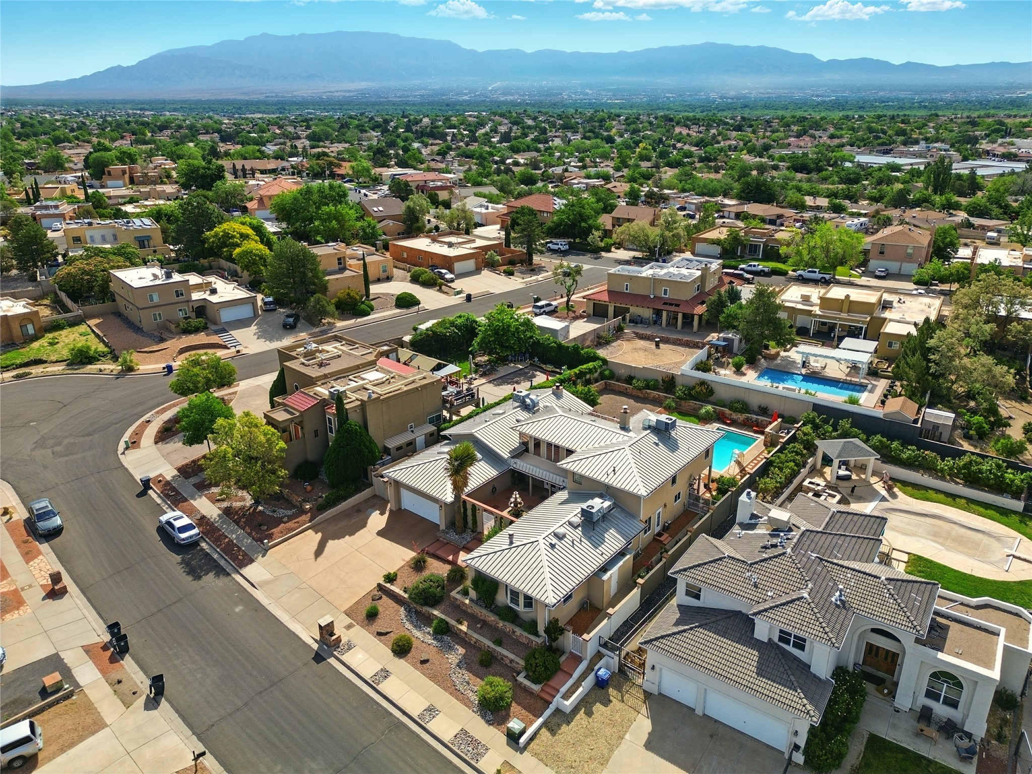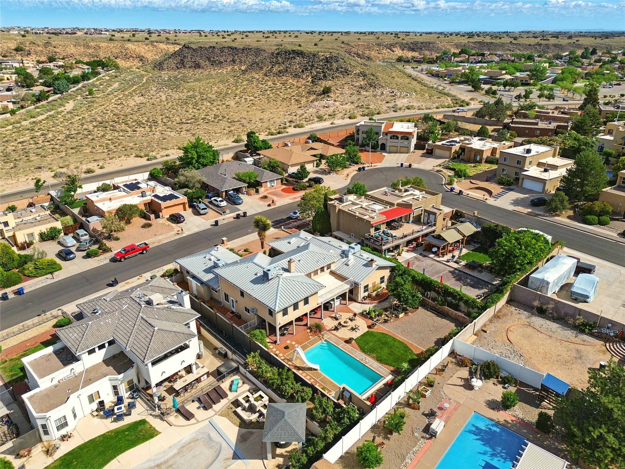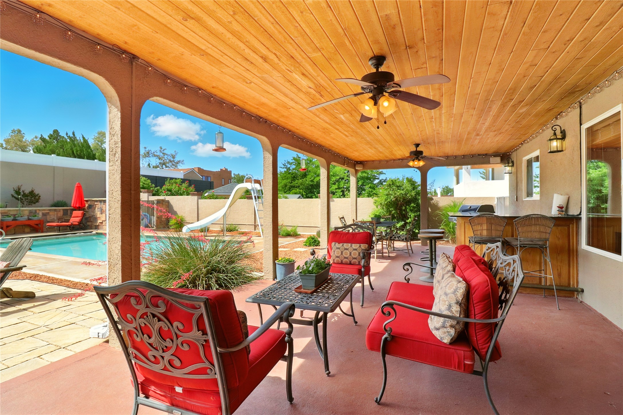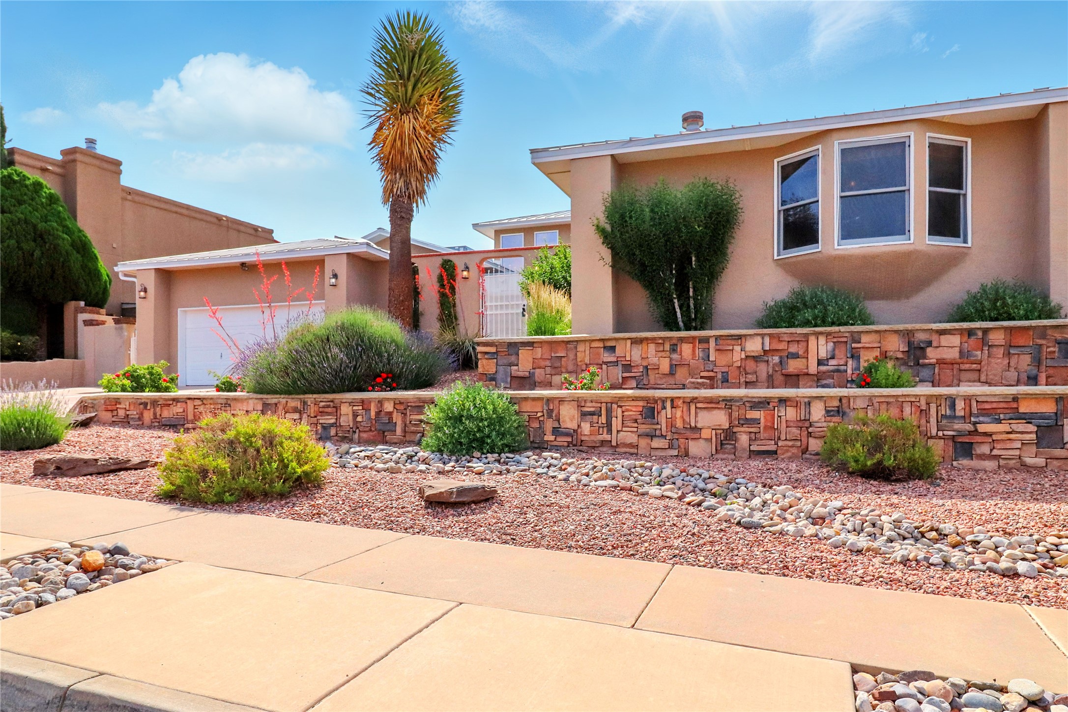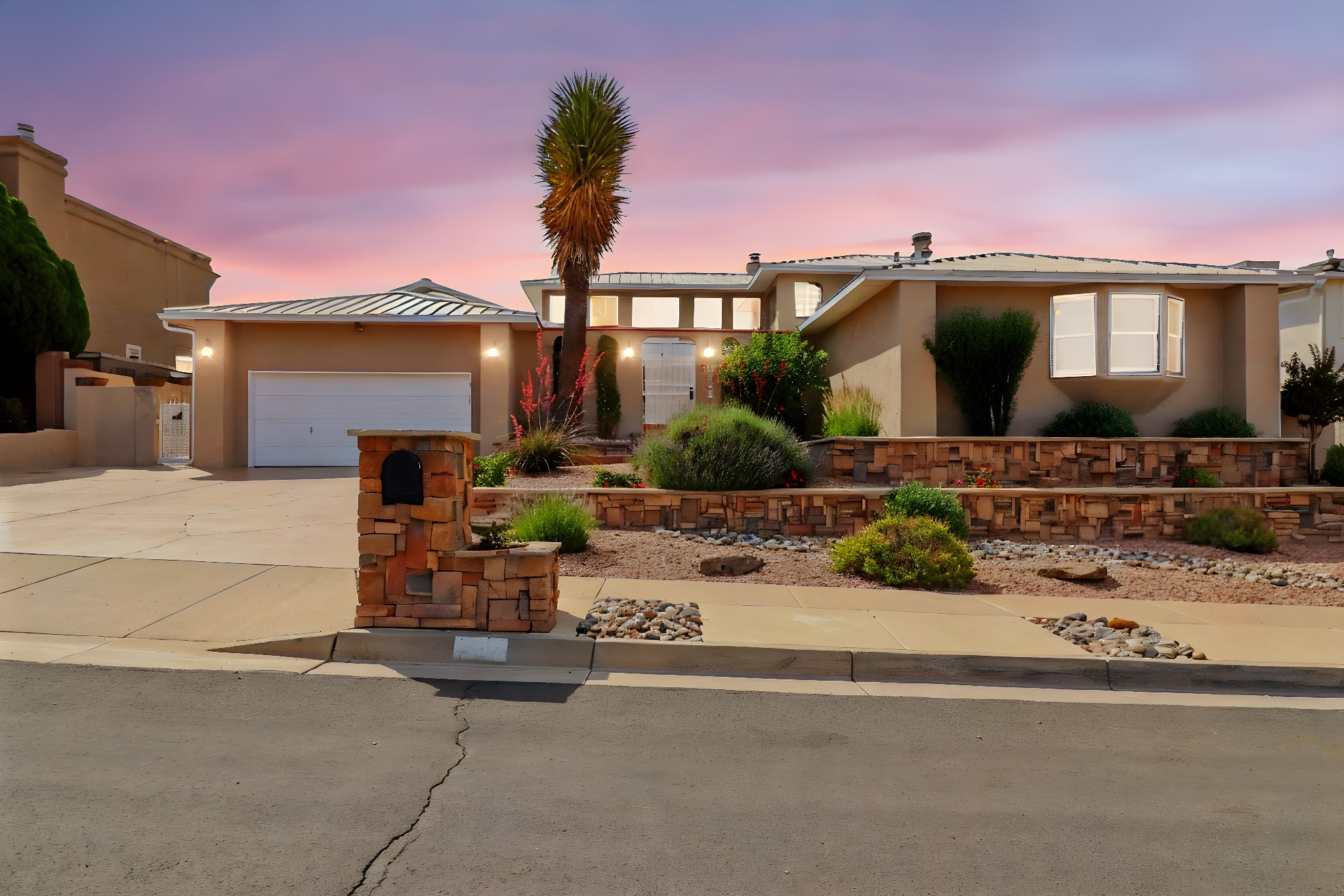 Nestled in the desirable Taylor Ranch community, this stunning 4-bedroom, 4-bathroom two-story home is an entertainer's dream! Through the welcoming entry courtyard, you enter into "La Sala Grande" with raised 12' newly painted ceilings, Venetian plaster walls, recessed lighting and a stone-covered wood burning fireplace. The lovely chef's kitchen contains stainless steel appliances, a double oven & separate island range, oak cabinets & granite countertops with ample space and storage. With both off-counter seating & a separate dining area you have plenty of space for family and guests. Up the wooden staircase, the second floor is a true private retreat. The landing space at the top of the staircase offers space for an office or workout area. Through the double wooden doors, you find the primary suite with its own stone fireplace, walk-in closet, balcony, jetted tub and oversized shower. Two bedrooms located downstairs contain ensuite bathrooms & the third guest bedroom has direct access to the beautifully landscaped backyard. An oasis of its own, the meticulously maintained backyard includes a covered portal, heated gunite pool w/electric safety cover, hot tub, fire pit, bar & speaker system for ultimate entertainment and enjoyment. Recent upkeeps include 3 newer refrigerated air units, sanded/refinished wooden doors throughout, newly painted ceilings & new TPO installed on patio roof off the primary suite with warranty. With lots of windows & skylights, tasteful wooden accents throughout, painted concrete outside, double-car garage with tons of storage space & a giant walk-in laundry room complete with cabinets, sink & counter space this magnificent home on an expansive lot is truly a must see. Experience peace, tranquility & the best of Albuquerque living in this exceptional, competitively priced home. Don't miss this incredible opportunity. Imagine the possibilities and schedule your private tour today!