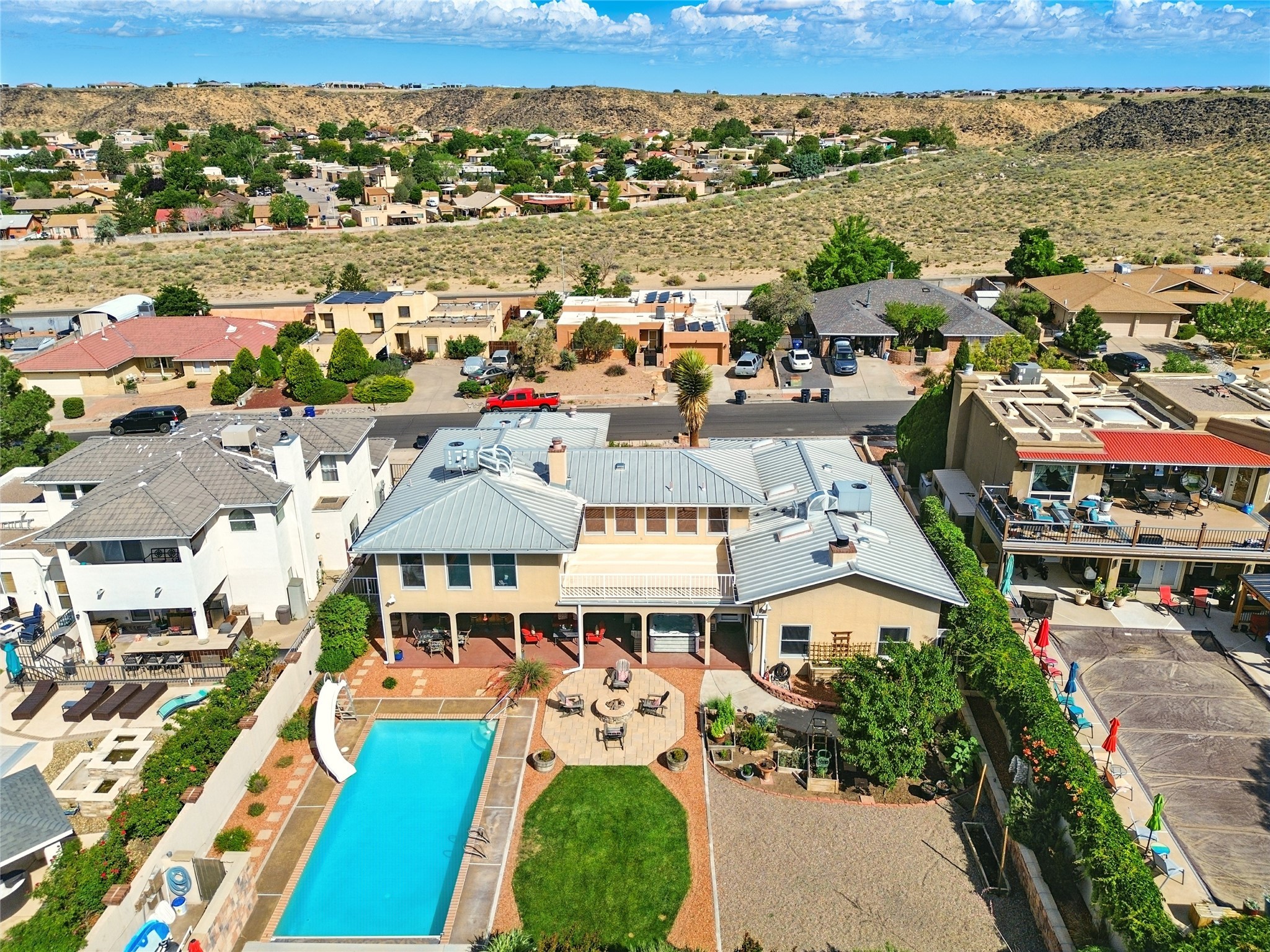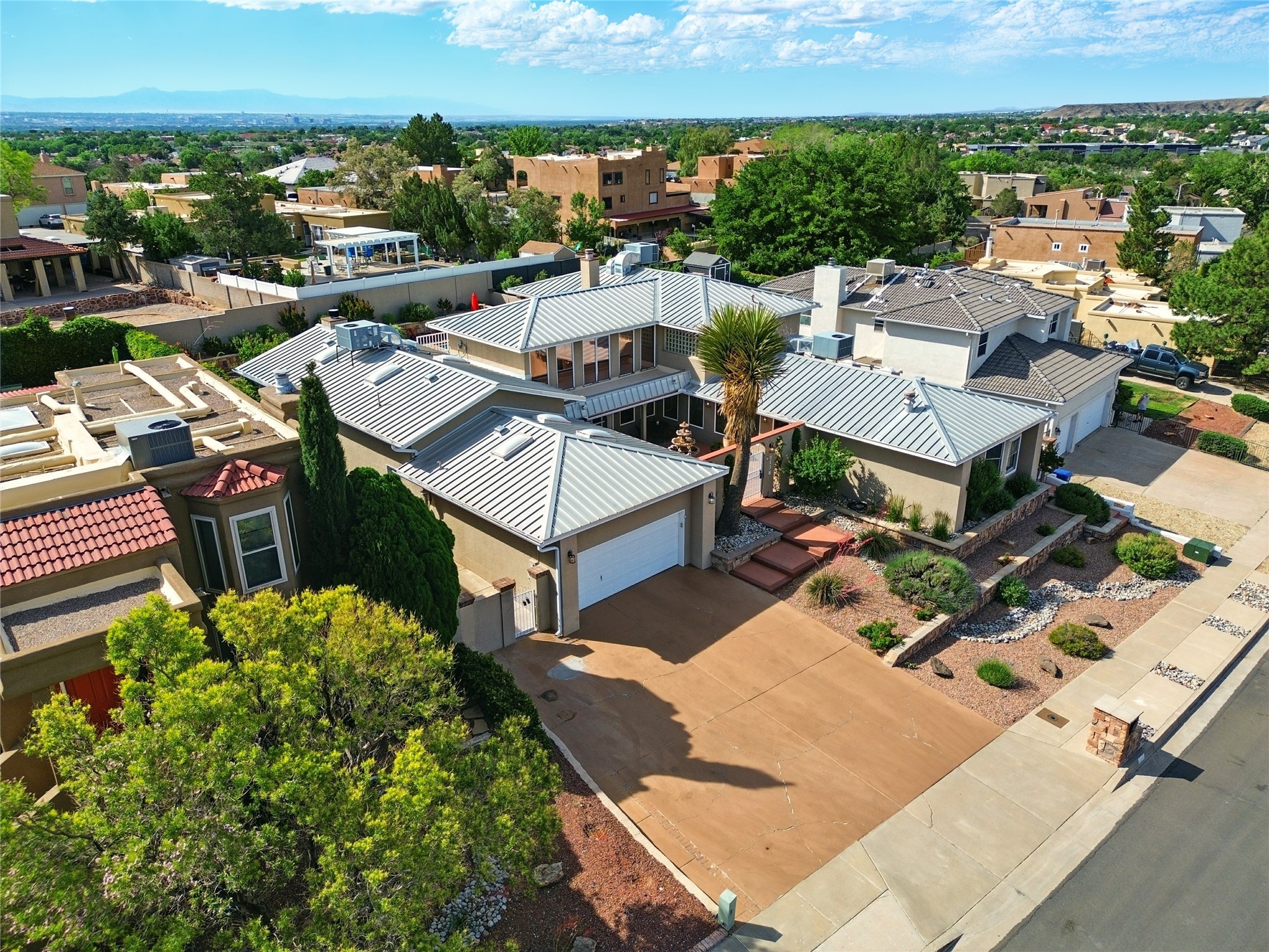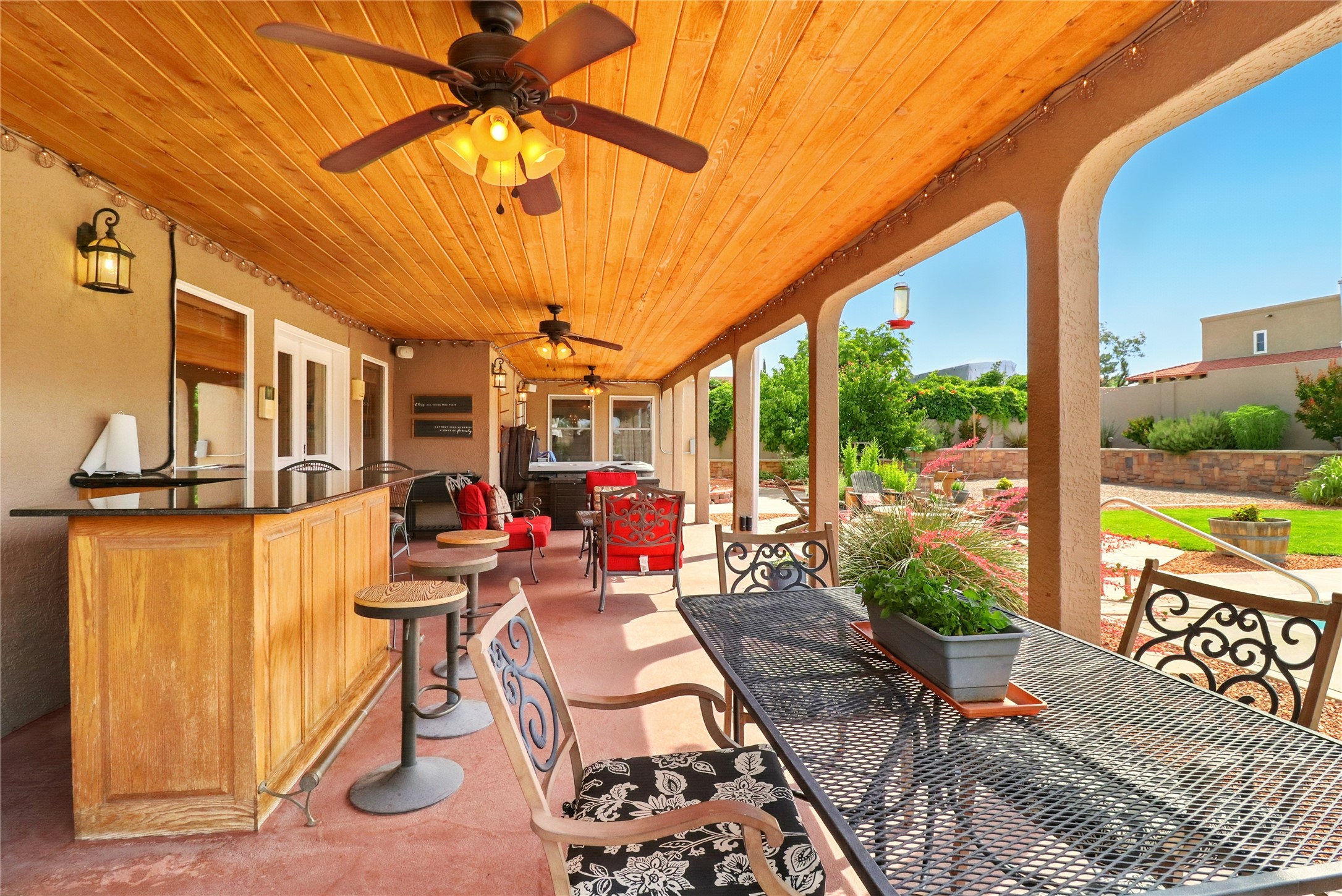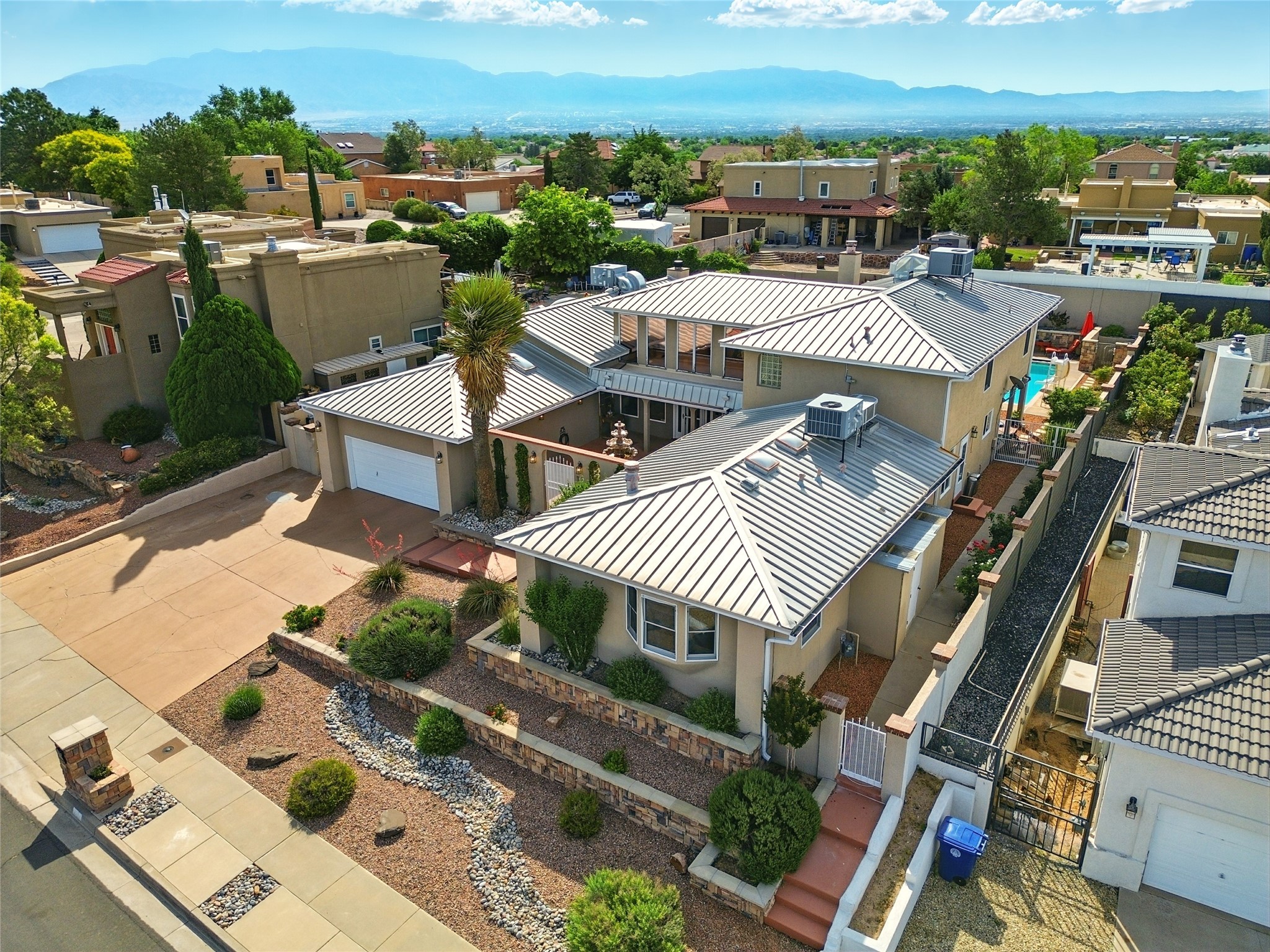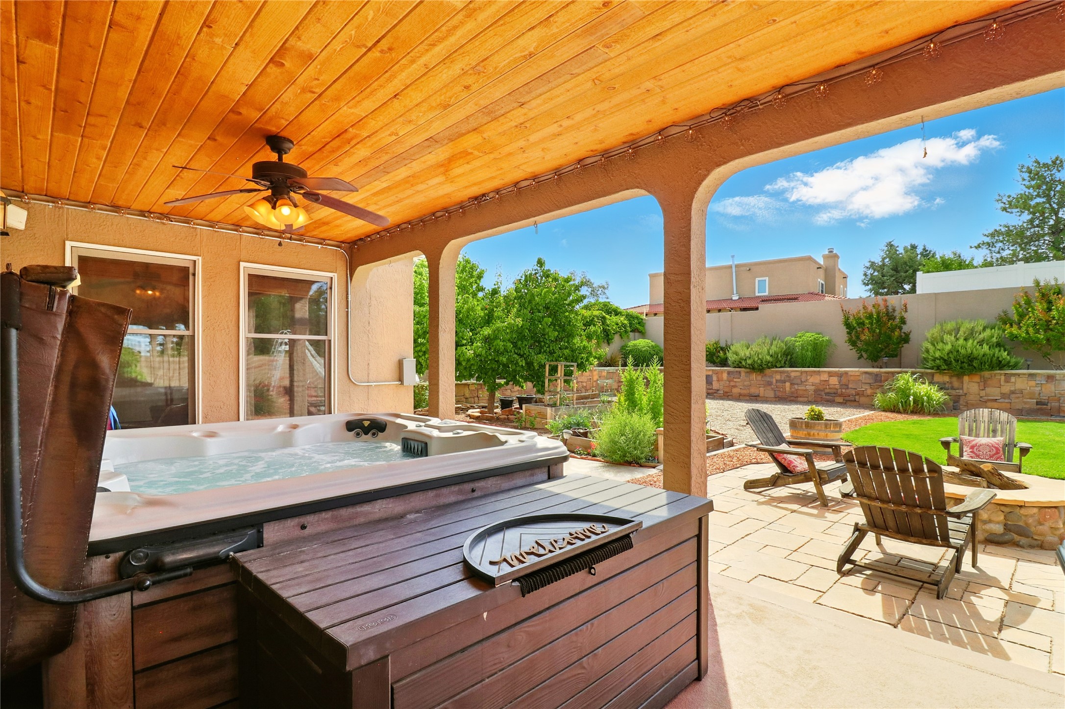 Nestled in the desirable Taylor Ranch community, this stunning 4-bedroom, 4-bathroom two-story home is an entertainer's dream! Through the welcoming entry courtyard, you enter into "La Sala Grande" with raised 12' newly painted ceilings, Venetian plaster walls, recessed lighting and a stone-covered wood burning fireplace. The lovely chef's kitchen contains stainless steel appliances, a double oven & separate island range, oak cabinets & granite countertops with ample space and storage. With both off-counter seating & a separate dining area you have plenty of space for family and guests. Up the wooden staircase, the second floor is a true private retreat. The landing space at the top of the staircase offers space for an office or workout area. Through the double wooden doors, you find the primary suite with its own stone fireplace, walk-in closet, balcony, jetted tub and oversized shower. Two bedrooms located downstairs contain ensuite bathrooms & the third guest bedroom has direct access to the beautifully landscaped backyard. An oasis of its own, the meticulously maintained backyard includes a covered portal, heated gunite pool w/electric safety cover, hot tub, fire pit, bar & speaker system for ultimate entertainment and enjoyment. Recent upkeeps include 3 newer refrigerated air units, sanded/refinished wooden doors throughout, newly painted ceilings & new TPO installed on patio roof off the primary suite with warranty. With lots of windows & skylights, tasteful wooden accents throughout, painted concrete outside, double-car garage with tons of storage space & a giant walk-in laundry room complete with cabinets, sink & counter space this magnificent home on an expansive lot is truly a must see. Experience peace, tranquility & the best of Albuquerque living in this exceptional, competitively priced home. Don't miss this incredible opportunity. Imagine the possibilities and schedule your private tour today!