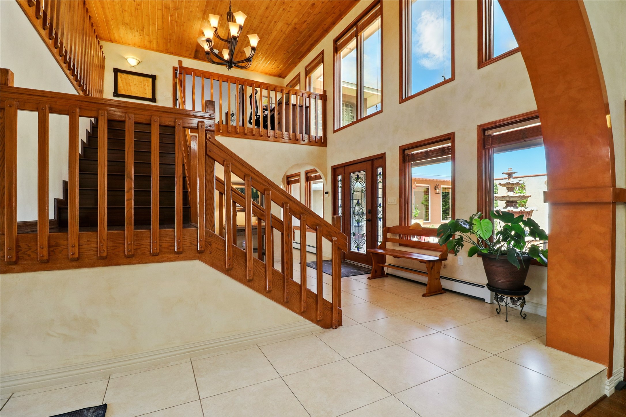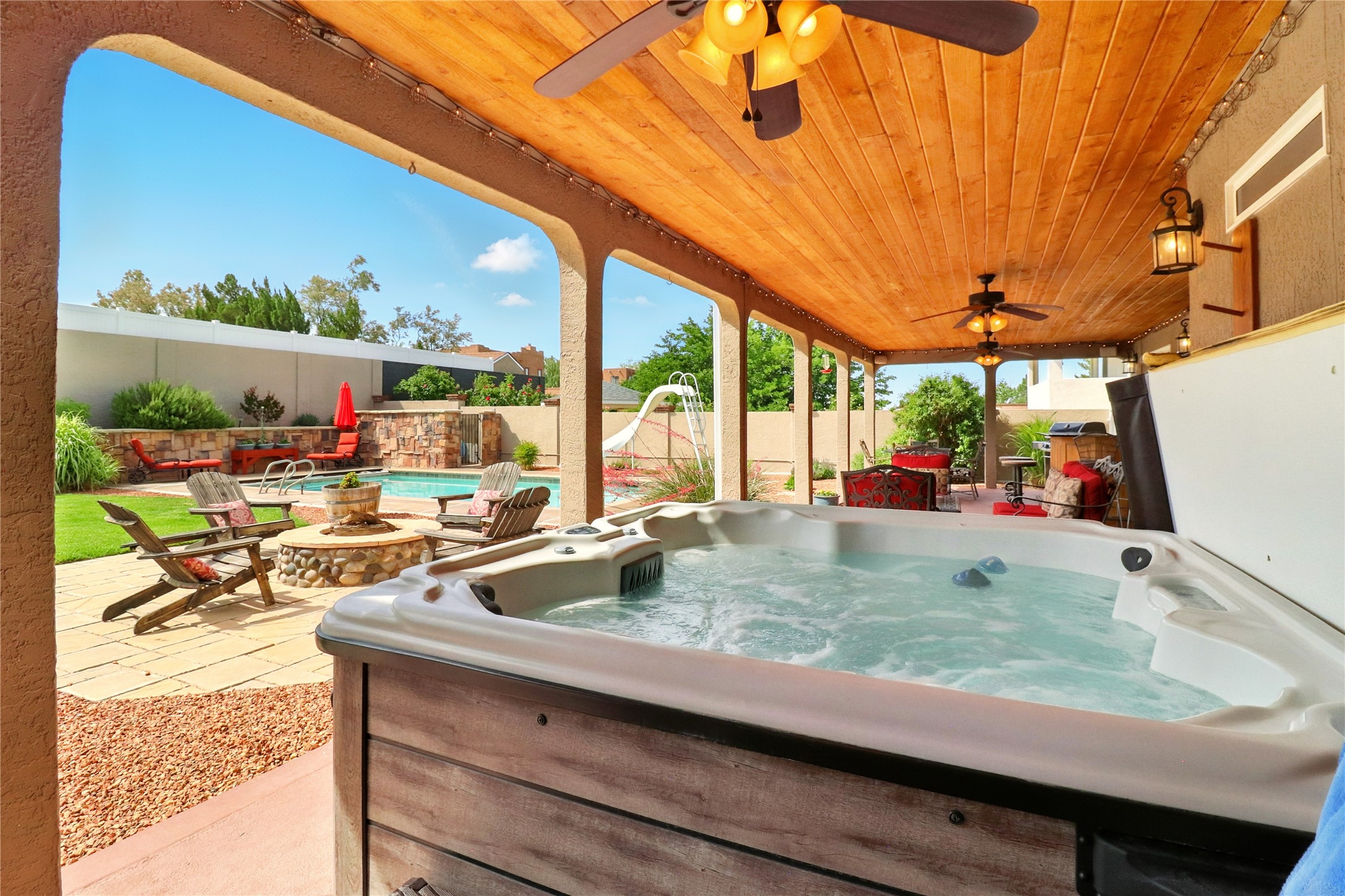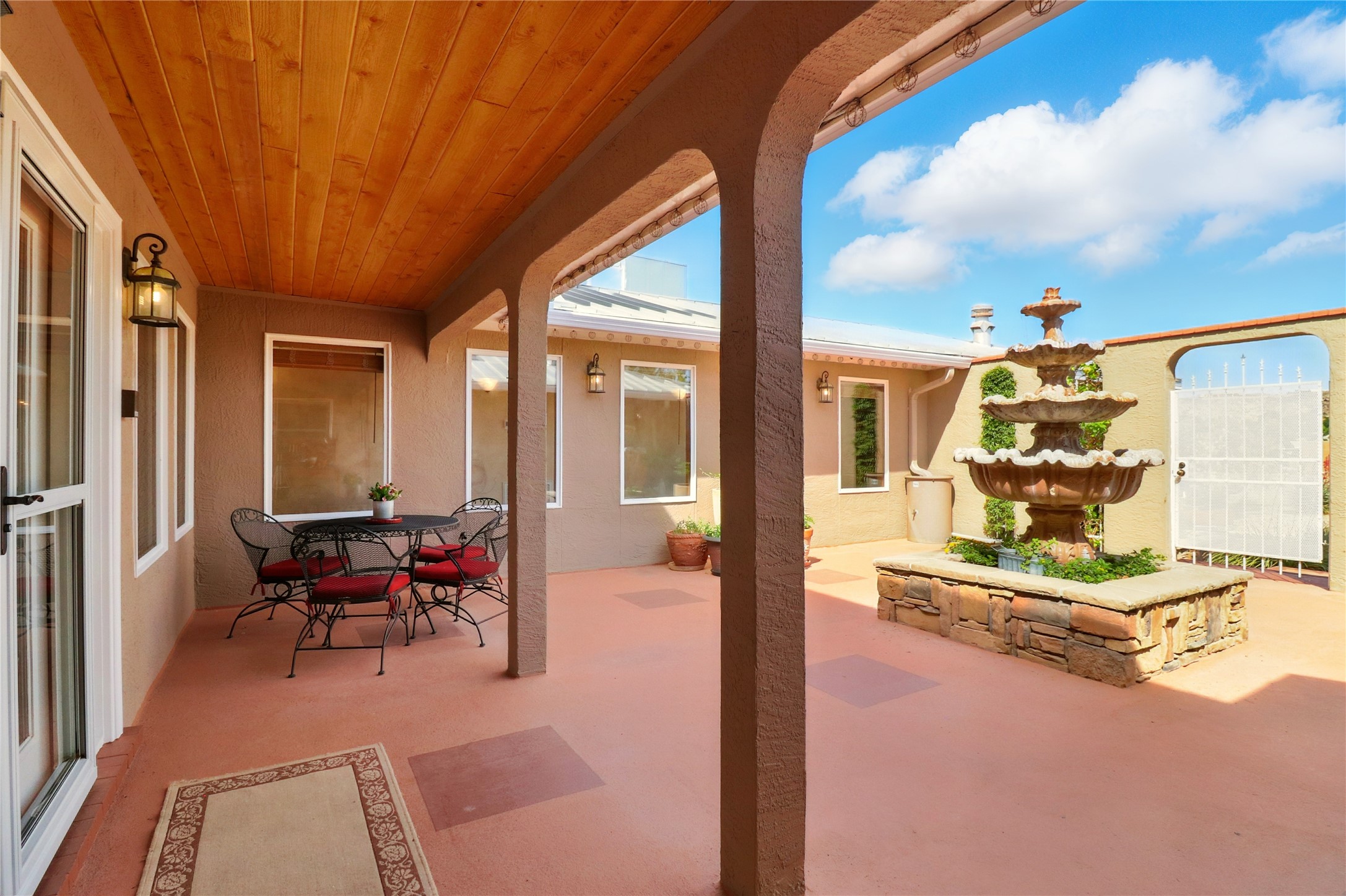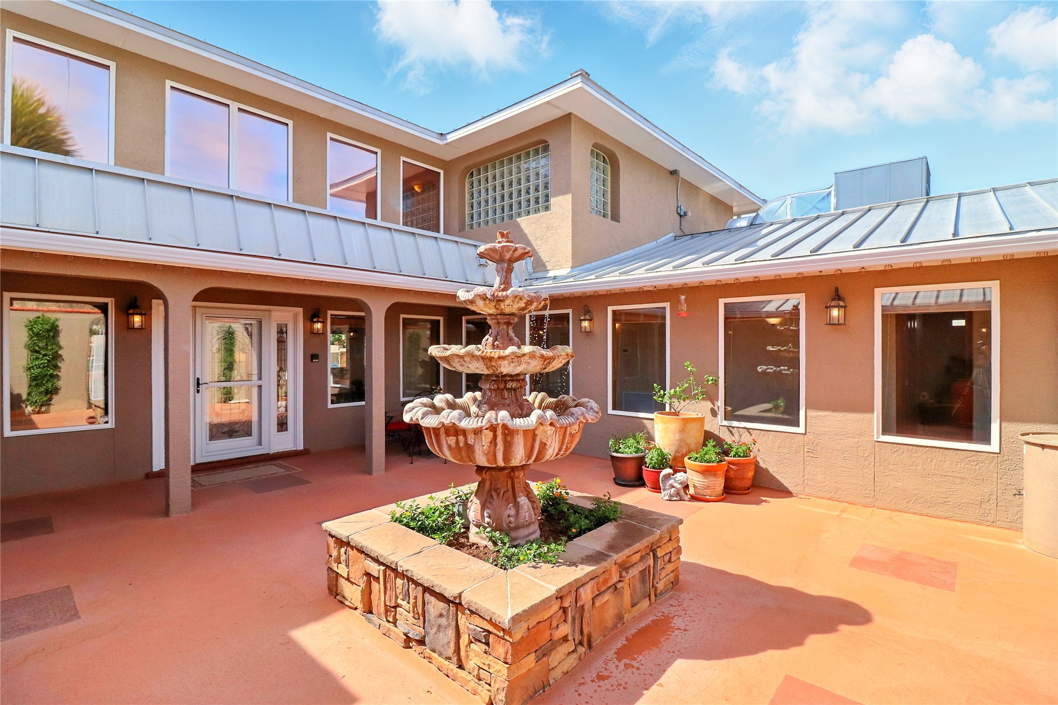 Nestled in the desirable Taylor Ranch community, this stunning 4-bedroom, 4-bathroom two-story home is an entertainer's dream! Through the welcoming entry courtyard, you enter into "La Sala Grande" with raised 12' newly painted ceilings, Venetian plaster walls, recessed lighting and a stone-covered wood burning fireplace. The lovely chef's kitchen contains stainless steel appliances, a double oven & separate island range, oak cabinets & granite countertops with ample space and storage. With both off-counter seating & a separate dining area you have plenty of space for family and guests. Up the wooden staircase, the second floor is a true private retreat. The landing space at the top of the staircase offers space for an office or workout area. Through the double wooden doors, you find the primary suite with its own stone fireplace, walk-in closet, balcony, jetted tub and oversized shower. Two bedrooms located downstairs contain ensuite bathrooms & the third guest bedroom has direct access to the beautifully landscaped backyard. An oasis of its own, the meticulously maintained backyard includes a covered portal, heated gunite pool w/electric safety cover, hot tub, fire pit, bar & speaker system for ultimate entertainment and enjoyment. Recent upkeeps include 3 newer refrigerated air units, sanded/refinished wooden doors throughout, newly painted ceilings & new TPO installed on patio roof off the primary suite with warranty. With lots of windows & skylights, tasteful wooden accents throughout, painted concrete outside, double-car garage with tons of storage space & a giant walk-in laundry room complete with cabinets, sink & counter space this magnificent home on an expansive lot is truly a must see. Experience peace, tranquility & the best of Albuquerque living in this exceptional, competitively priced home. Don't miss this incredible opportunity. Imagine the possibilities and schedule your private tour today!
