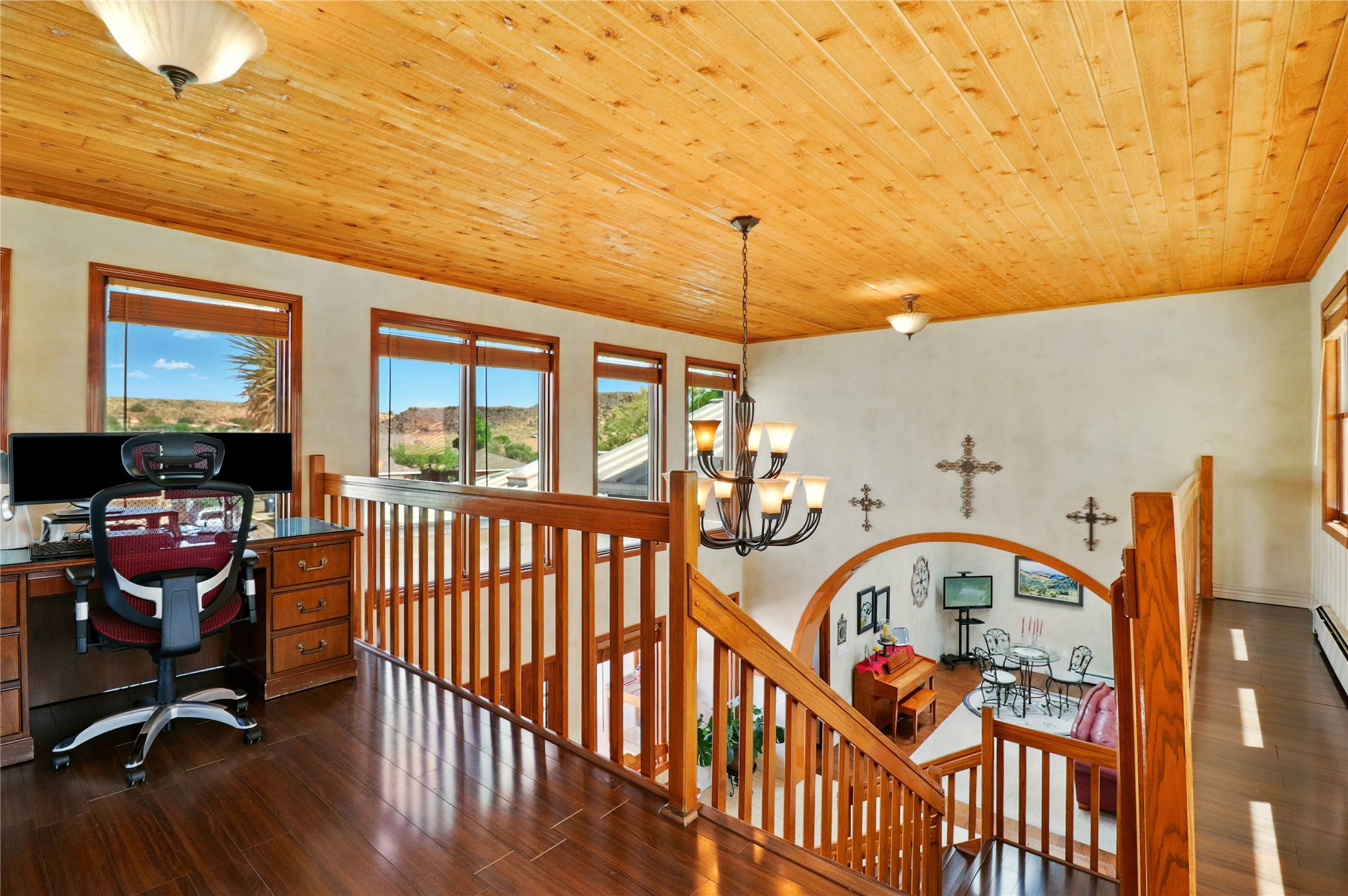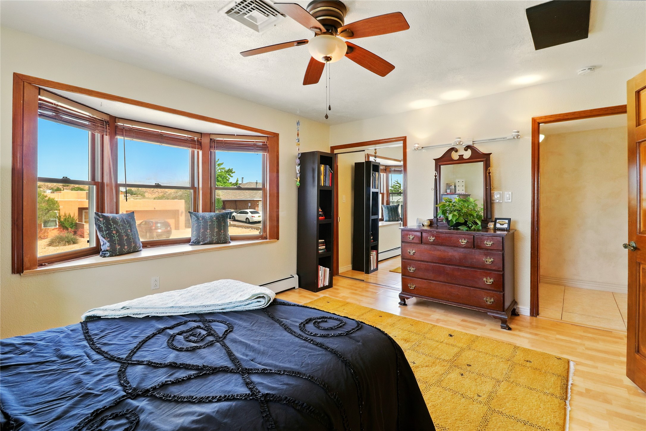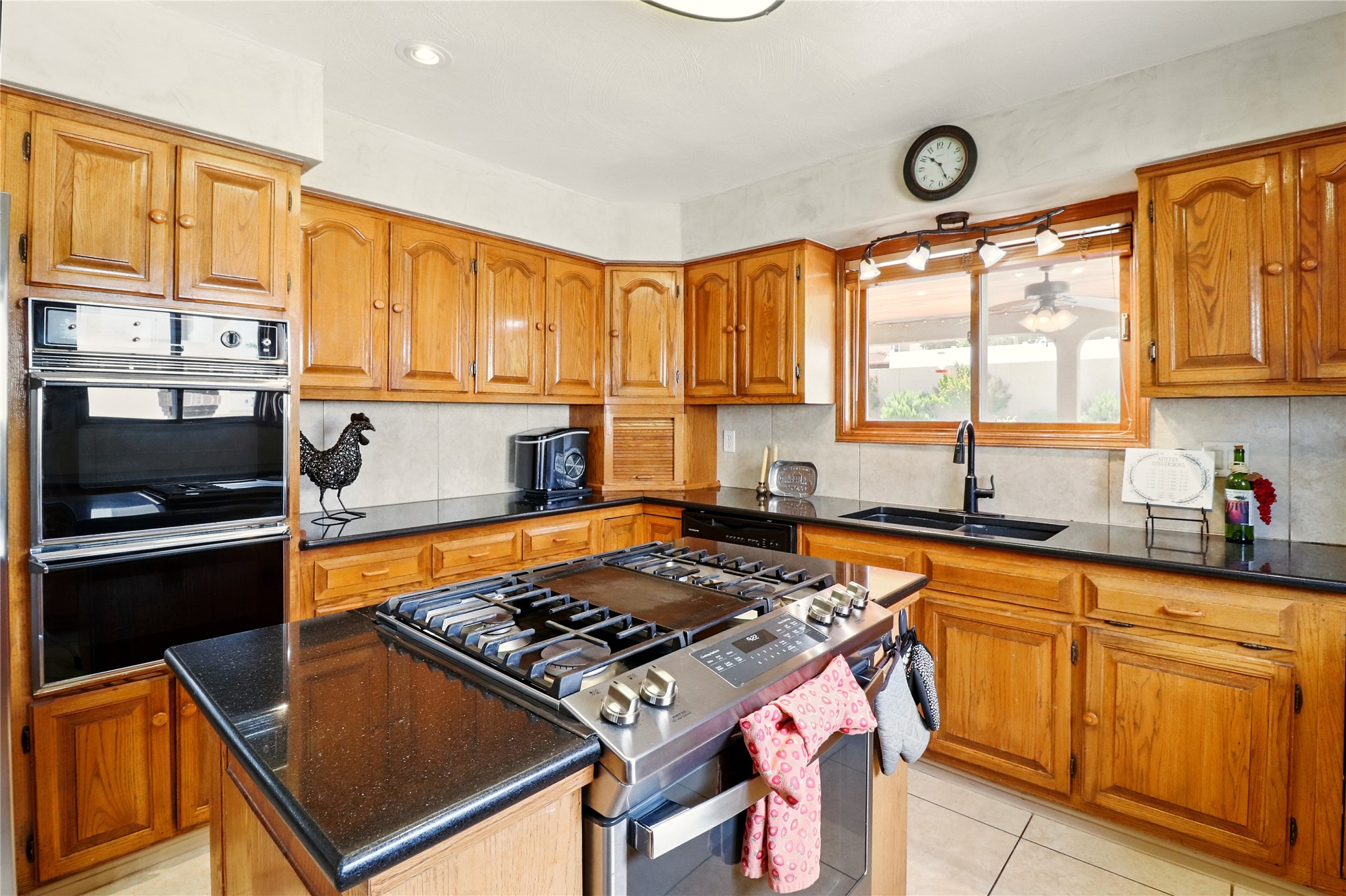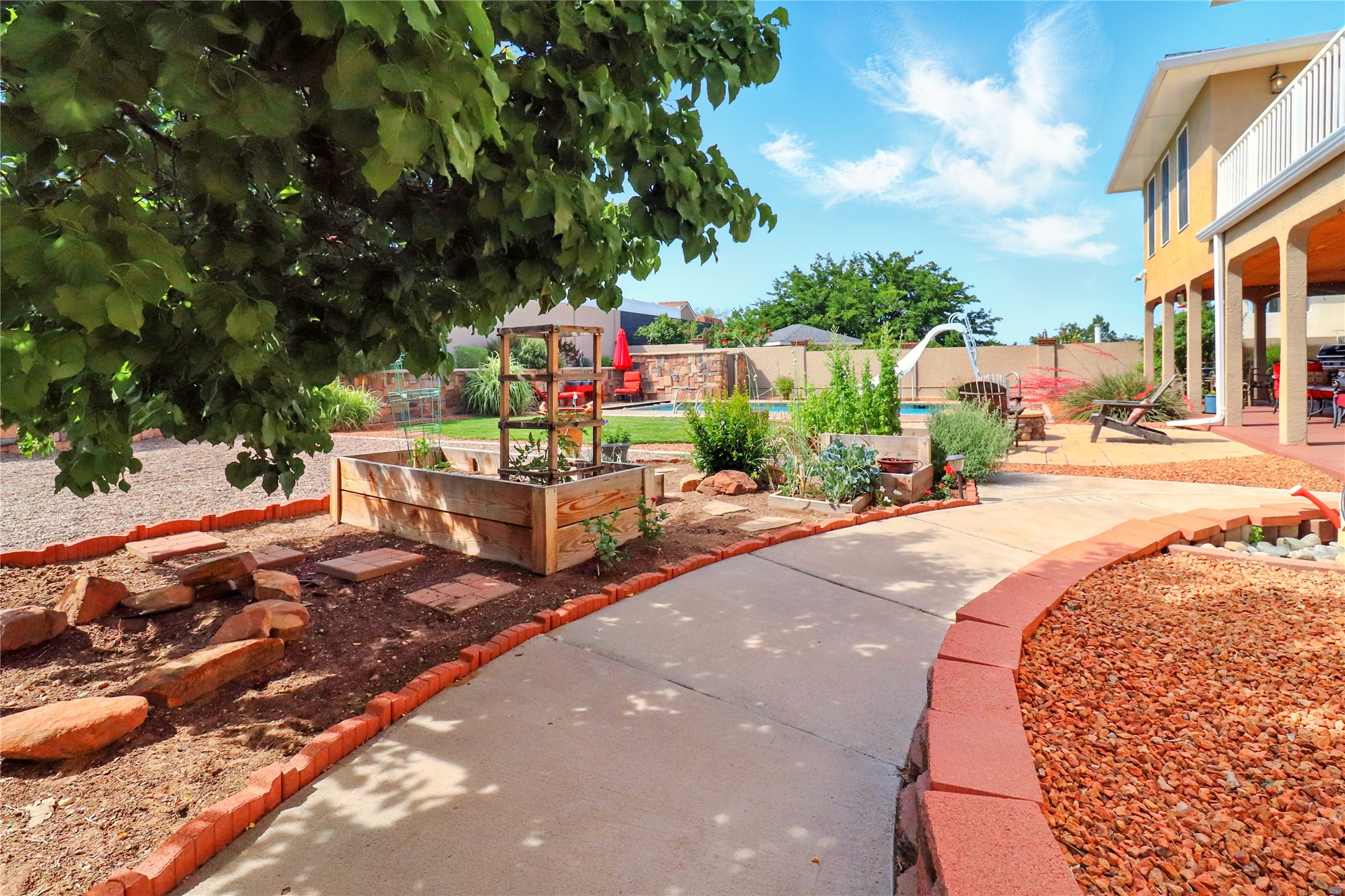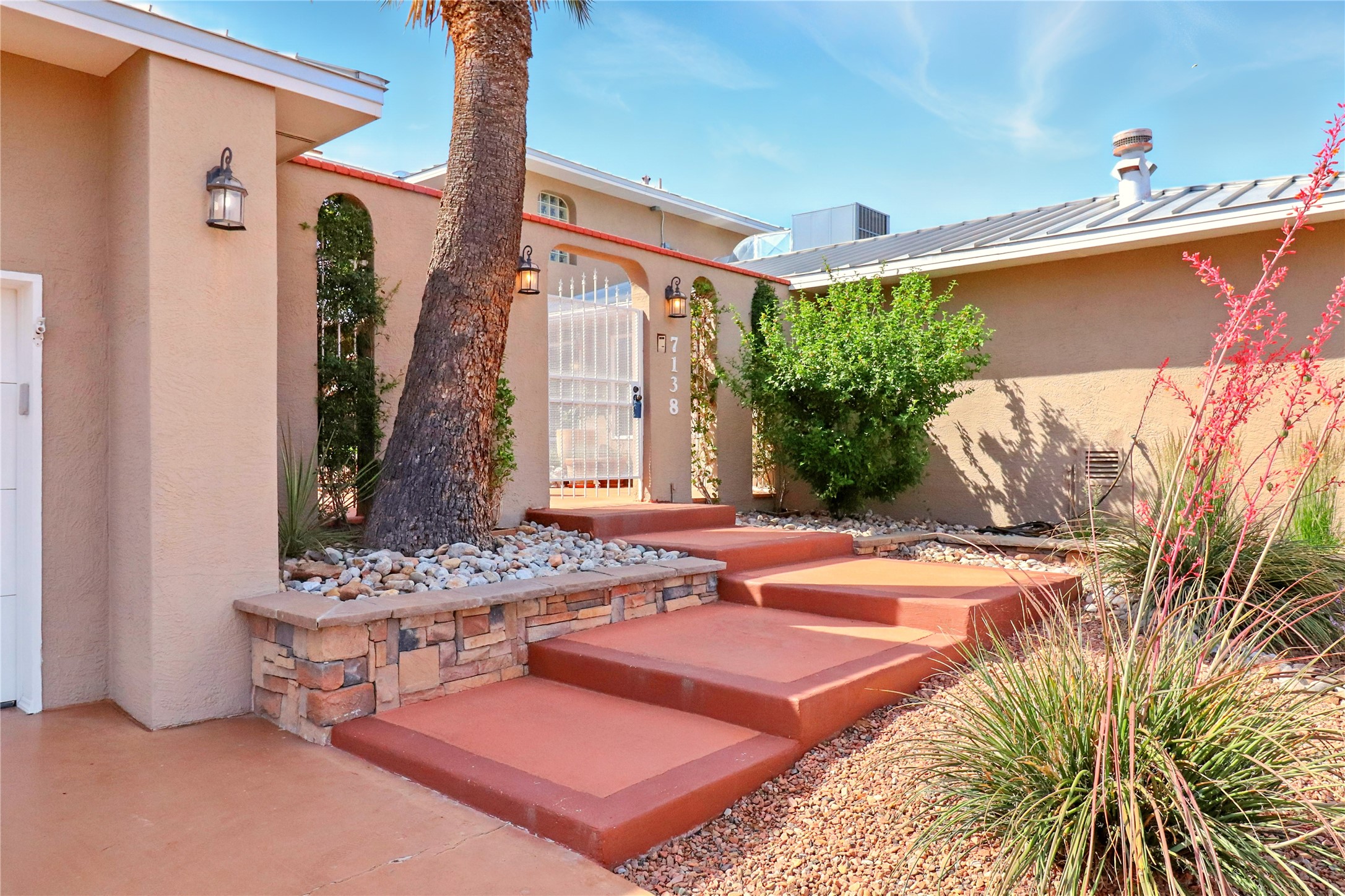 Nestled in the desirable Taylor Ranch community, this stunning 4-bedroom, 4-bathroom two-story home is an entertainer's dream! Through the welcoming entry courtyard, you enter into "La Sala Grande" with raised 12' newly painted ceilings, Venetian plaster walls, recessed lighting and a stone-covered wood burning fireplace. The lovely chef's kitchen contains stainless steel appliances, a double oven & separate island range, oak cabinets & granite countertops with ample space and storage. With both off-counter seating & a separate dining area you have plenty of space for family and guests. Up the wooden staircase, the second floor is a true private retreat. The landing space at the top of the staircase offers space for an office or workout area. Through the double wooden doors, you find the primary suite with its own stone fireplace, walk-in closet, balcony, jetted tub and oversized shower. Two bedrooms located downstairs contain ensuite bathrooms & the third guest bedroom has direct access to the beautifully landscaped backyard. An oasis of its own, the meticulously maintained backyard includes a covered portal, heated gunite pool w/electric safety cover, hot tub, fire pit, bar & speaker system for ultimate entertainment and enjoyment. Recent upkeeps include 3 newer refrigerated air units, sanded/refinished wooden doors throughout, newly painted ceilings & new TPO installed on patio roof off the primary suite with warranty. With lots of windows & skylights, tasteful wooden accents throughout, painted concrete outside, double-car garage with tons of storage space & a giant walk-in laundry room complete with cabinets, sink & counter space this magnificent home on an expansive lot is truly a must see. Experience peace, tranquility & the best of Albuquerque living in this exceptional, competitively priced home. Don't miss this incredible opportunity. Imagine the possibilities and schedule your private tour today!