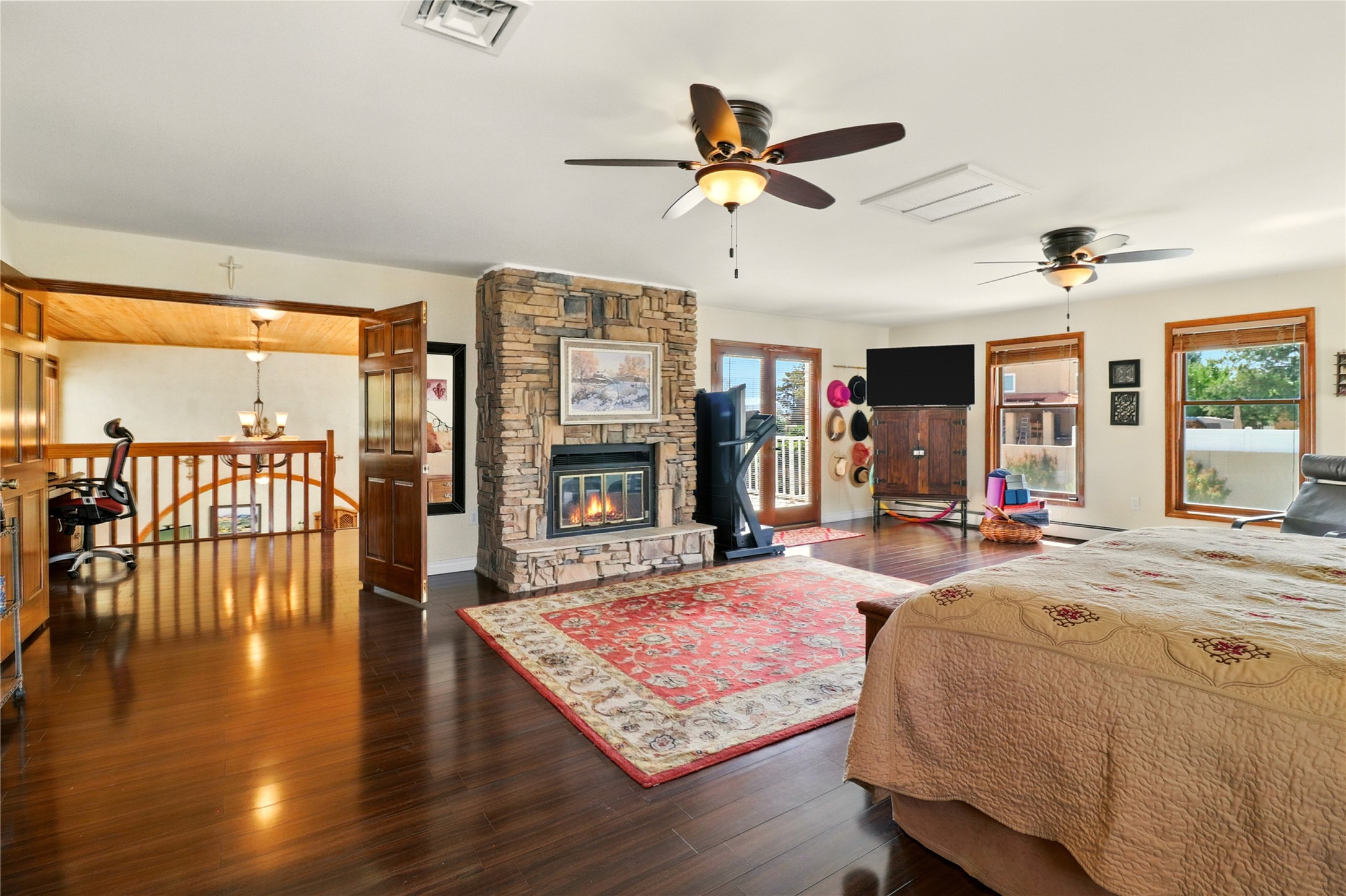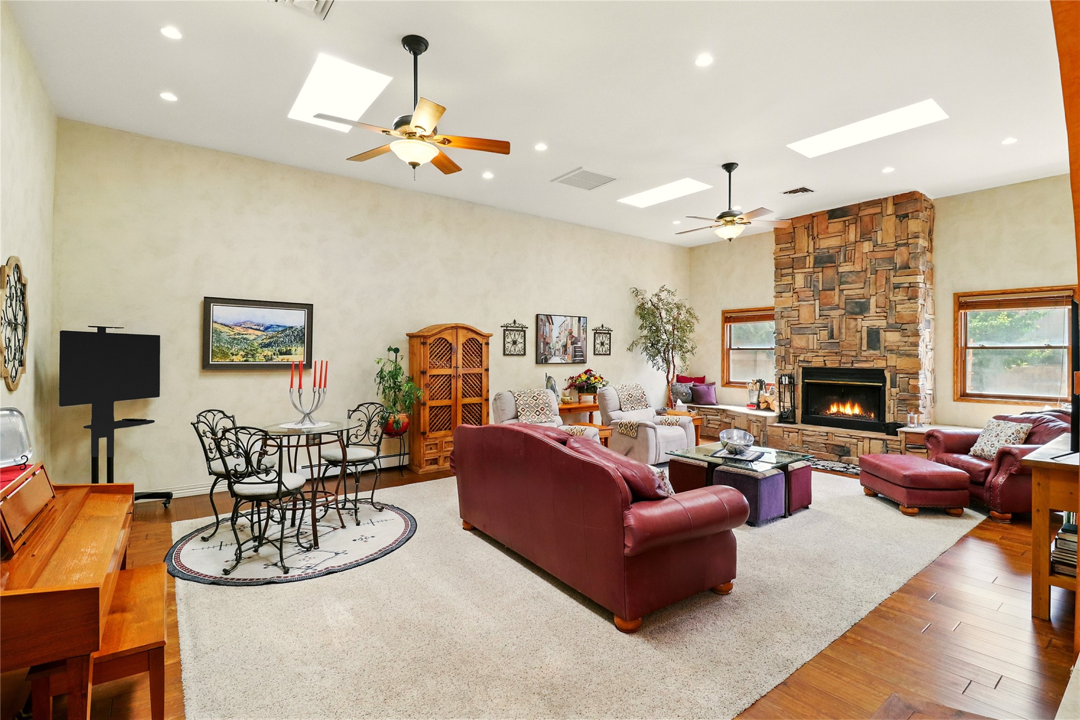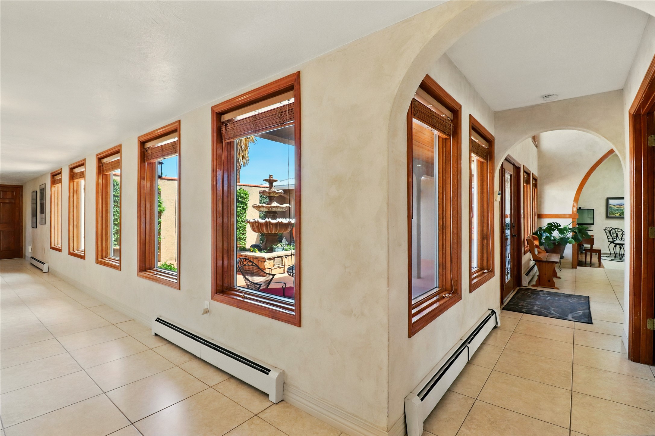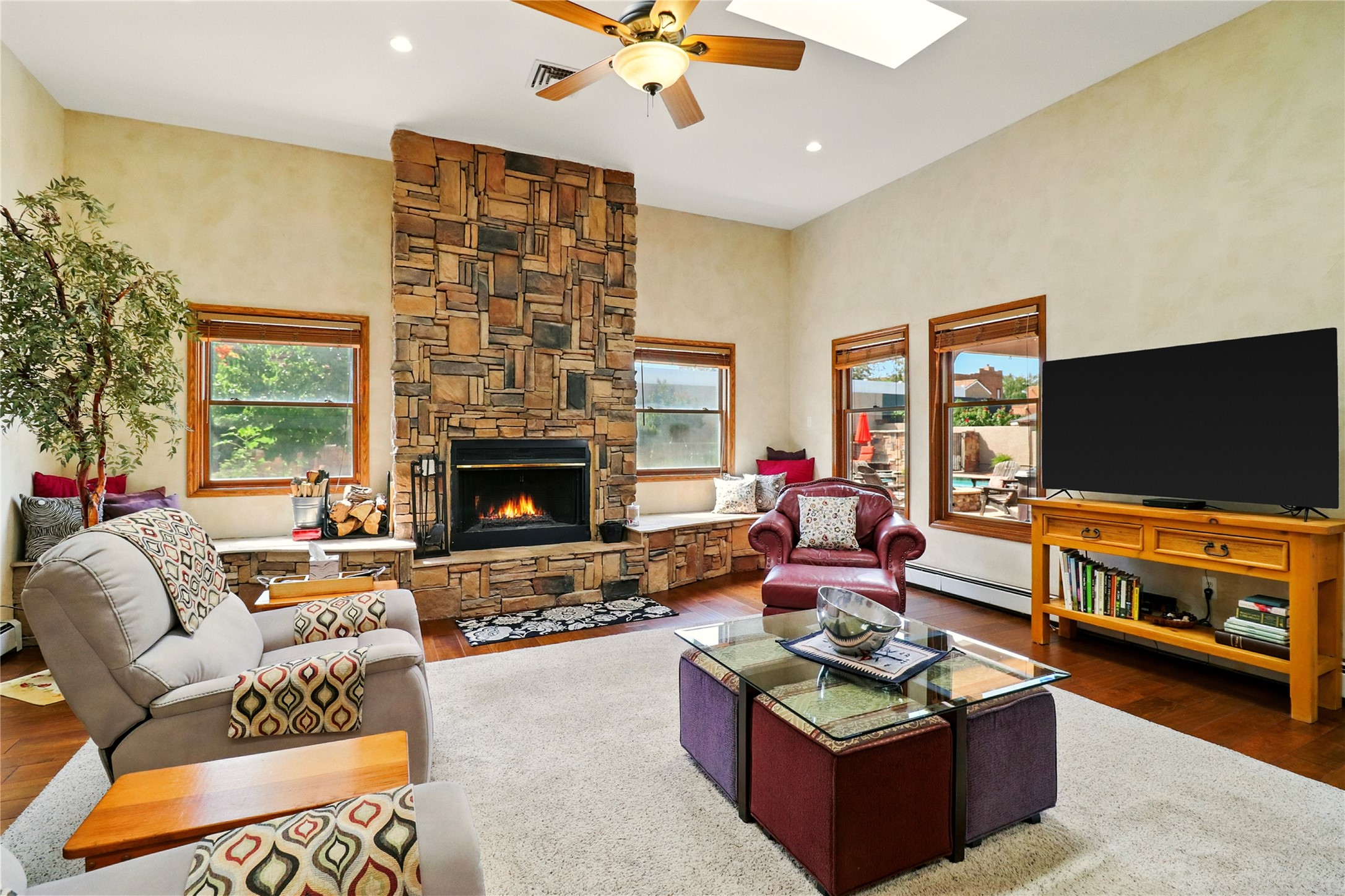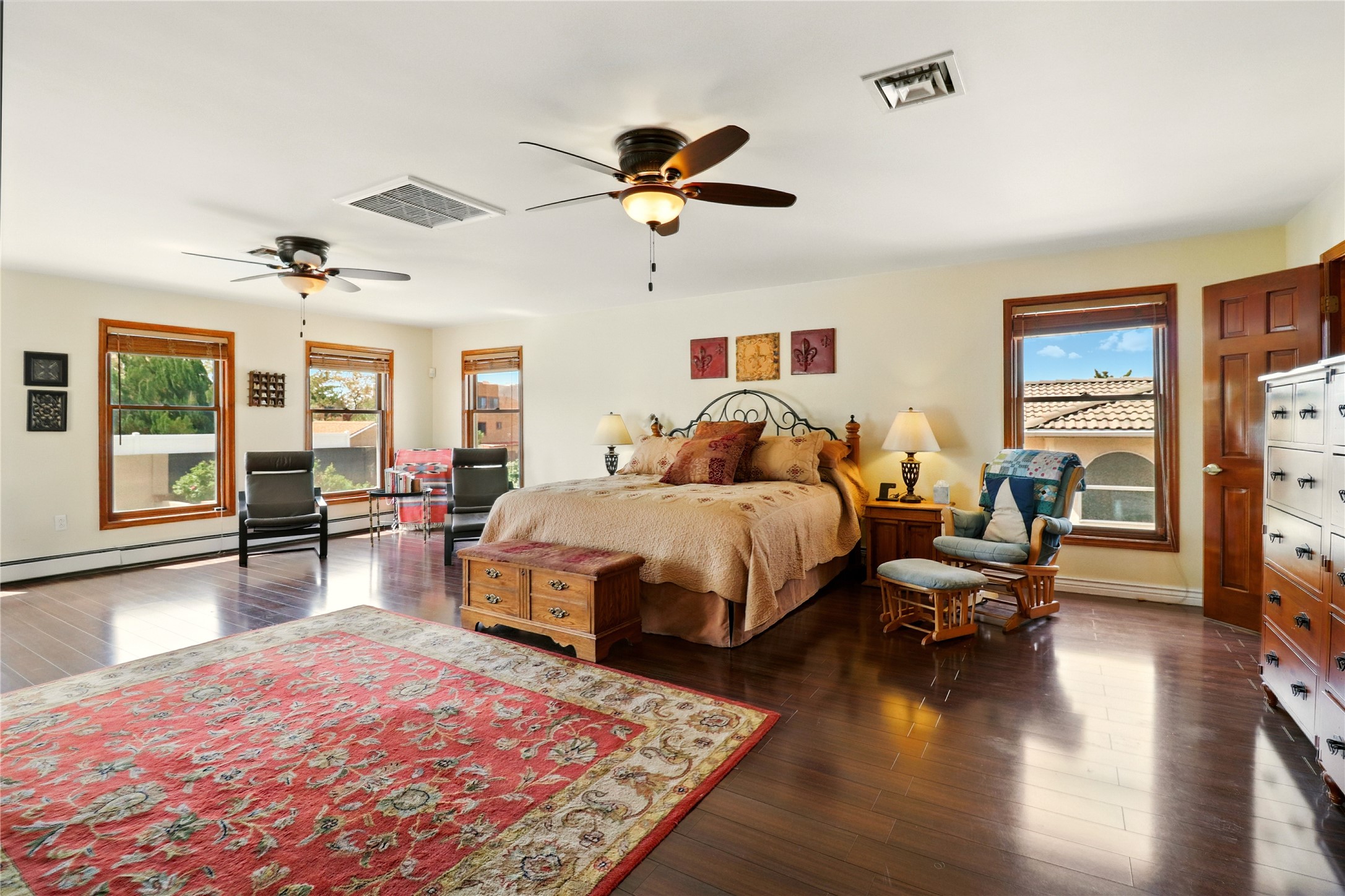 Nestled in the desirable Taylor Ranch community, this stunning 4-bedroom, 4-bathroom two-story home is an entertainer's dream! Through the welcoming entry courtyard, you enter into "La Sala Grande" with raised 12' newly painted ceilings, Venetian plaster walls, recessed lighting and a stone-covered wood burning fireplace. The lovely chef's kitchen contains stainless steel appliances, a double oven & separate island range, oak cabinets & granite countertops with ample space and storage. With both off-counter seating & a separate dining area you have plenty of space for family and guests. Up the wooden staircase, the second floor is a true private retreat. The landing space at the top of the staircase offers space for an office or workout area. Through the double wooden doors, you find the primary suite with its own stone fireplace, walk-in closet, balcony, jetted tub and oversized shower. Two bedrooms located downstairs contain ensuite bathrooms & the third guest bedroom has direct access to the beautifully landscaped backyard. An oasis of its own, the meticulously maintained backyard includes a covered portal, heated gunite pool w/electric safety cover, hot tub, fire pit, bar & speaker system for ultimate entertainment and enjoyment. Recent upkeeps include 3 newer refrigerated air units, sanded/refinished wooden doors throughout, newly painted ceilings & new TPO installed on patio roof off the primary suite with warranty. With lots of windows & skylights, tasteful wooden accents throughout, painted concrete outside, double-car garage with tons of storage space & a giant walk-in laundry room complete with cabinets, sink & counter space this magnificent home on an expansive lot is truly a must see. Experience peace, tranquility & the best of Albuquerque living in this exceptional, competitively priced home. Don't miss this incredible opportunity. Imagine the possibilities and schedule your private tour today!