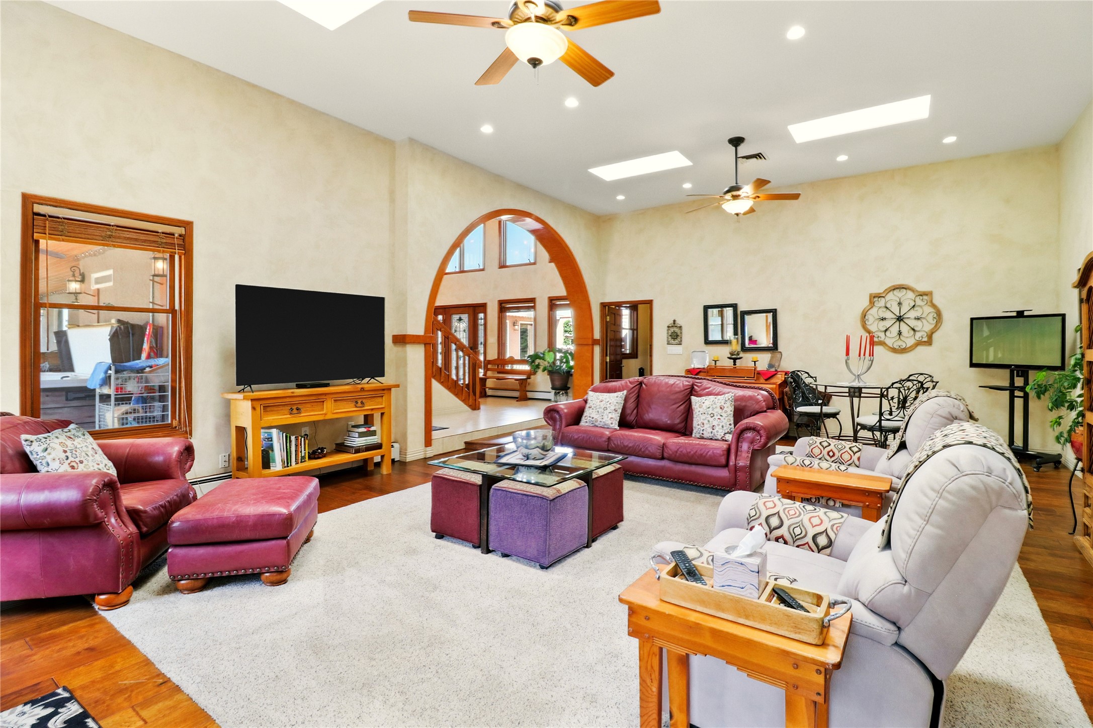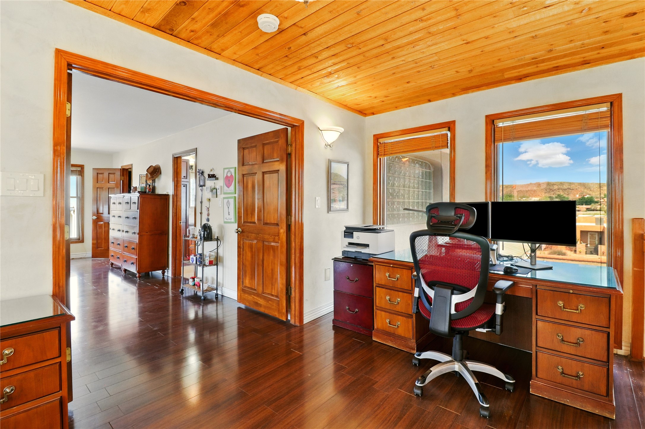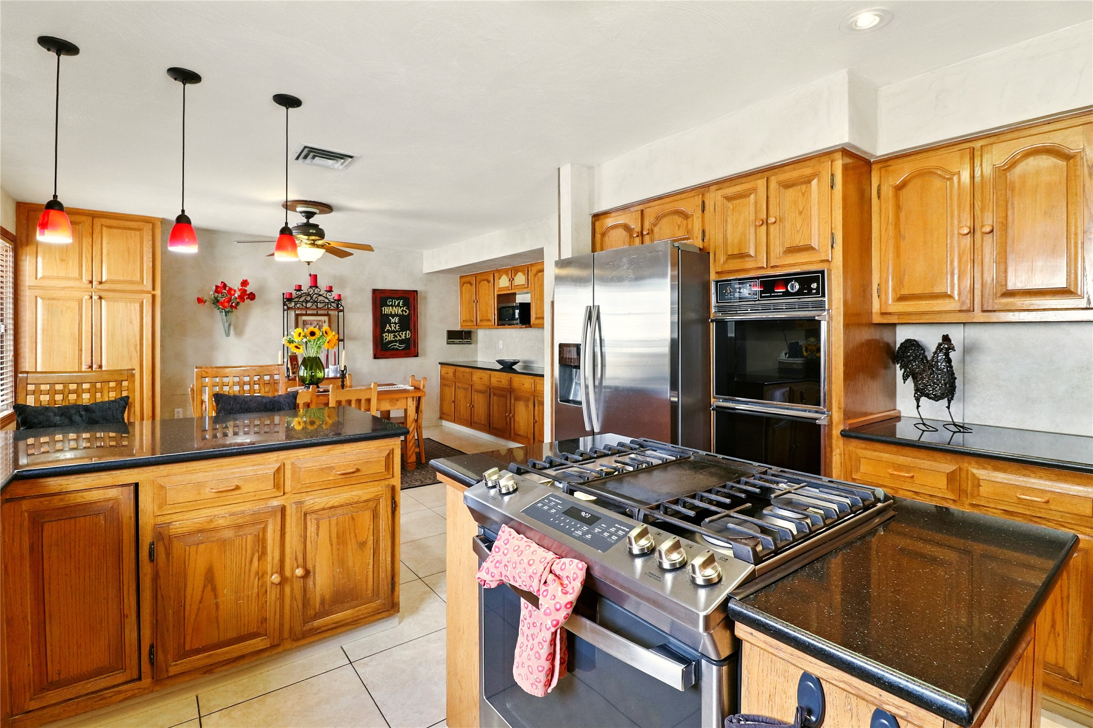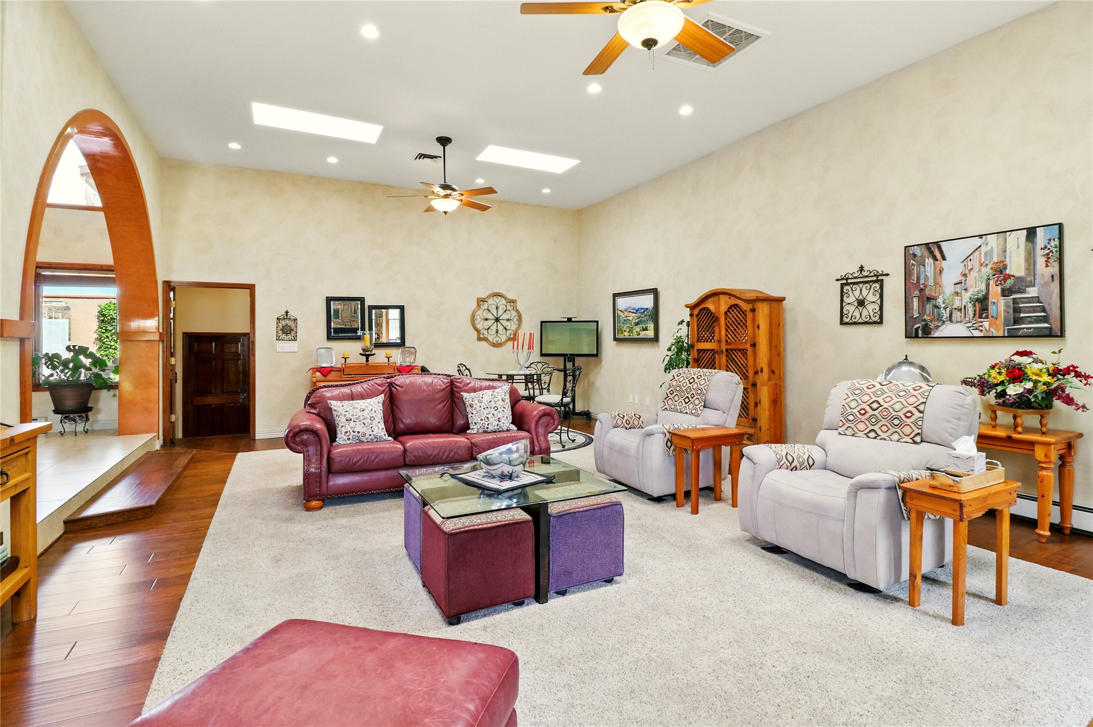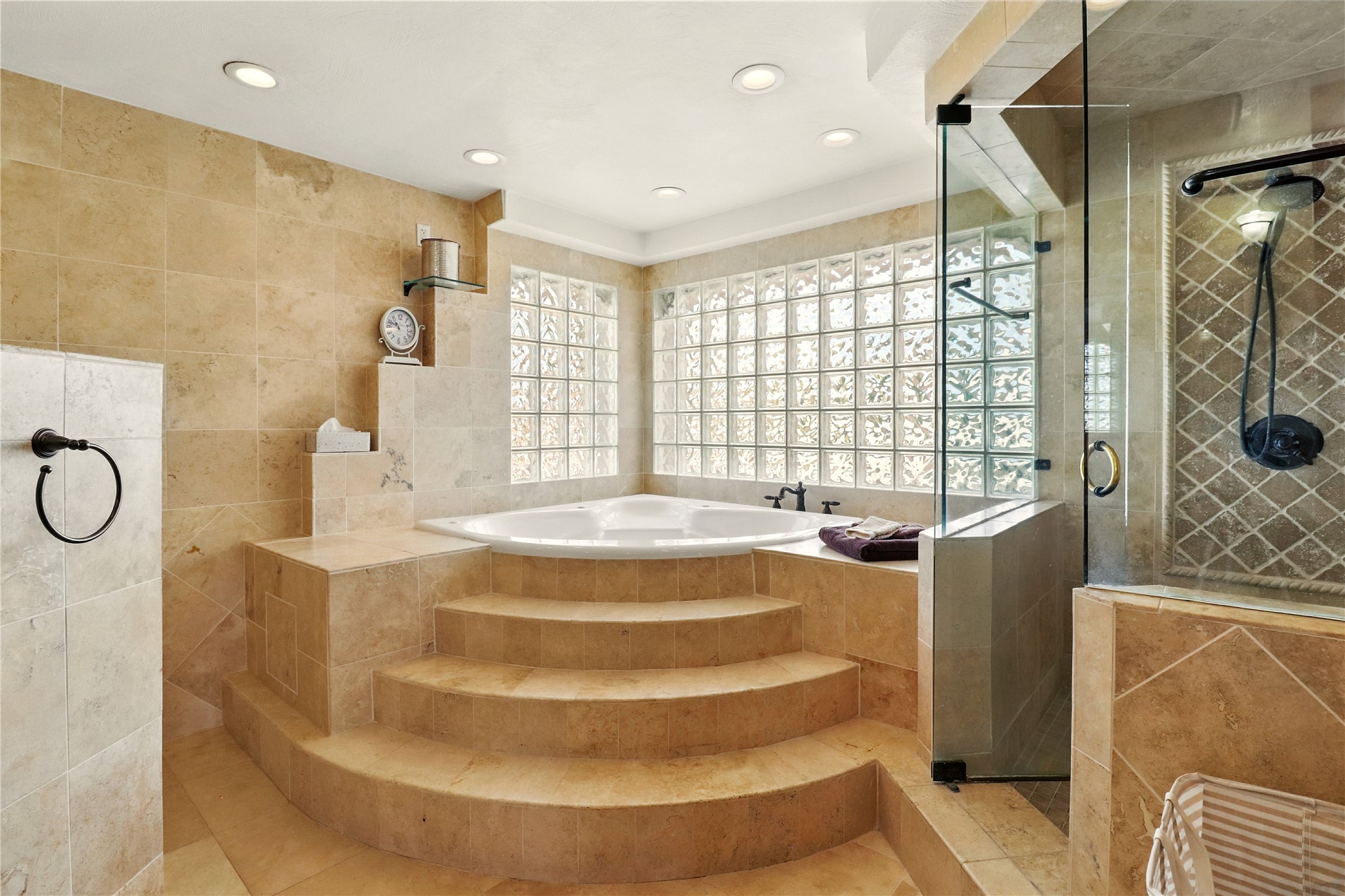 Nestled in the desirable Taylor Ranch community, this stunning 4-bedroom, 4-bathroom two-story home is an entertainer's dream! Through the welcoming entry courtyard, you enter into "La Sala Grande" with raised 12' newly painted ceilings, Venetian plaster walls, recessed lighting and a stone-covered wood burning fireplace. The lovely chef's kitchen contains stainless steel appliances, a double oven & separate island range, oak cabinets & granite countertops with ample space and storage. With both off-counter seating & a separate dining area you have plenty of space for family and guests. Up the wooden staircase, the second floor is a true private retreat. The landing space at the top of the staircase offers space for an office or workout area. Through the double wooden doors, you find the primary suite with its own stone fireplace, walk-in closet, balcony, jetted tub and oversized shower. Two bedrooms located downstairs contain ensuite bathrooms & the third guest bedroom has direct access to the beautifully landscaped backyard. An oasis of its own, the meticulously maintained backyard includes a covered portal, heated gunite pool w/electric safety cover, hot tub, fire pit, bar & speaker system for ultimate entertainment and enjoyment. Recent upkeeps include 3 newer refrigerated air units, sanded/refinished wooden doors throughout, newly painted ceilings & new TPO installed on patio roof off the primary suite with warranty. With lots of windows & skylights, tasteful wooden accents throughout, painted concrete outside, double-car garage with tons of storage space & a giant walk-in laundry room complete with cabinets, sink & counter space this magnificent home on an expansive lot is truly a must see. Experience peace, tranquility & the best of Albuquerque living in this exceptional, competitively priced home. Don't miss this incredible opportunity. Imagine the possibilities and schedule your private tour today!