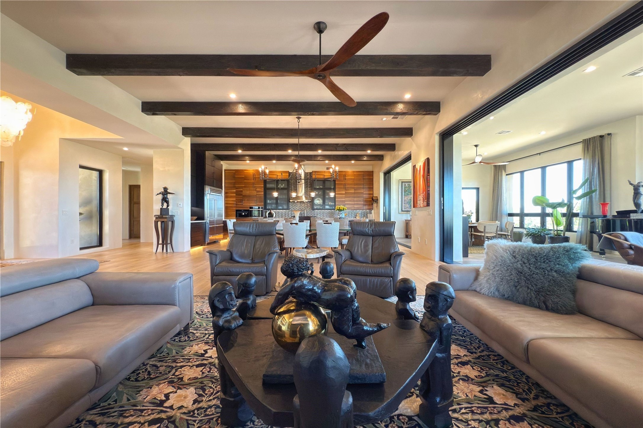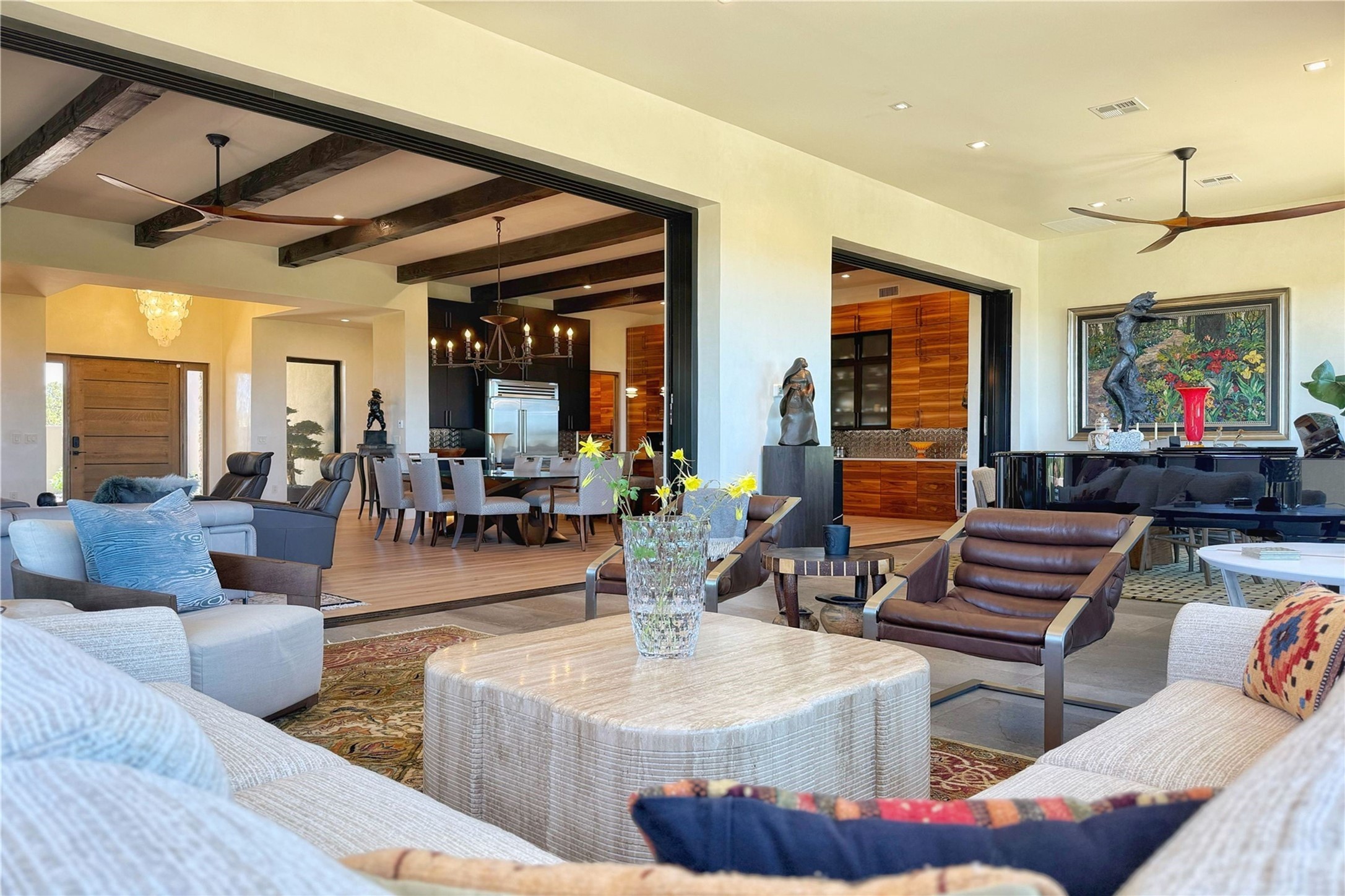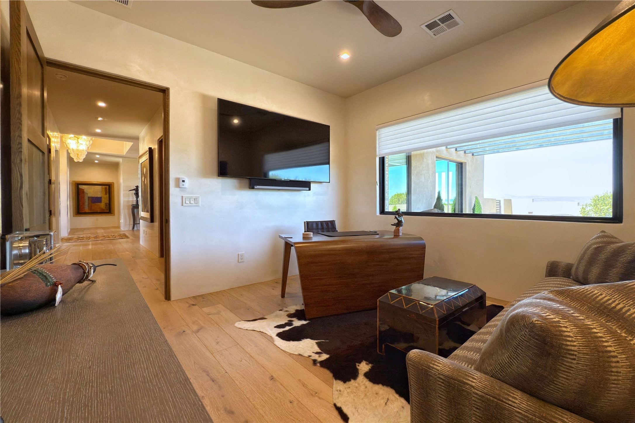 Contemporary Elegance with Designer TouchesA stunning contemporary residence thoughtfully curated celebrates Jemez mountain views and Santa Fe sunsets. This architectural gem offers high-end finishes, designer details, and expansive indoor-outdoor living in desirable Las Campanas.This home welcomes you with a zen-like garden and water feature. Step through the large pivoting wooden door and be greeted by a great room concept with soaring ceilings and abundant natural light. A contemporary glass chandelier adds dramatic flair and elegance.Living room features a floor to ceiling tiled fireplace, and flows seamlessly into the dining, kitchen and giant sunroom- converted from an outdoor portal to create year round living space. The gourmet kitchen is a designer's and chef's dream, featuring a massive island, black quartz counters, top-tier appliances, steam oven and large wine fridge. The butlers pantry makes entertainment a breeze and the walnut cabinetry is exquisite.Relax in a serene primary suite occupying in its own wing with southwest sunlight and a private portal. The primary bath is truly opulent,with quartz countertops, a steam shower with decorative tile and stone, and a deep soaking tub with views. Enjoy his-and-hers closets, and direct access to the laundry room.A guest wing includes an office and two guest suites with California closets, and gorgeous tiled baths.The powder room is a showstopper, with a vintage Venetian glass chandelier.Outdoor living is elevated with two large portals, expertly designed to maximize views, complete with a stone Montana fire pit. Outdoor metal sculptures convey with the property, adding artistic appeal to the serene surroundings.Solar panels and two EV charging plugs in the garage complete the functional ease of living here. This exceptional property also includes first right of refusal on the adjacent lot. Sellers' Las Campanas golf equity membership is available for purchase as well.