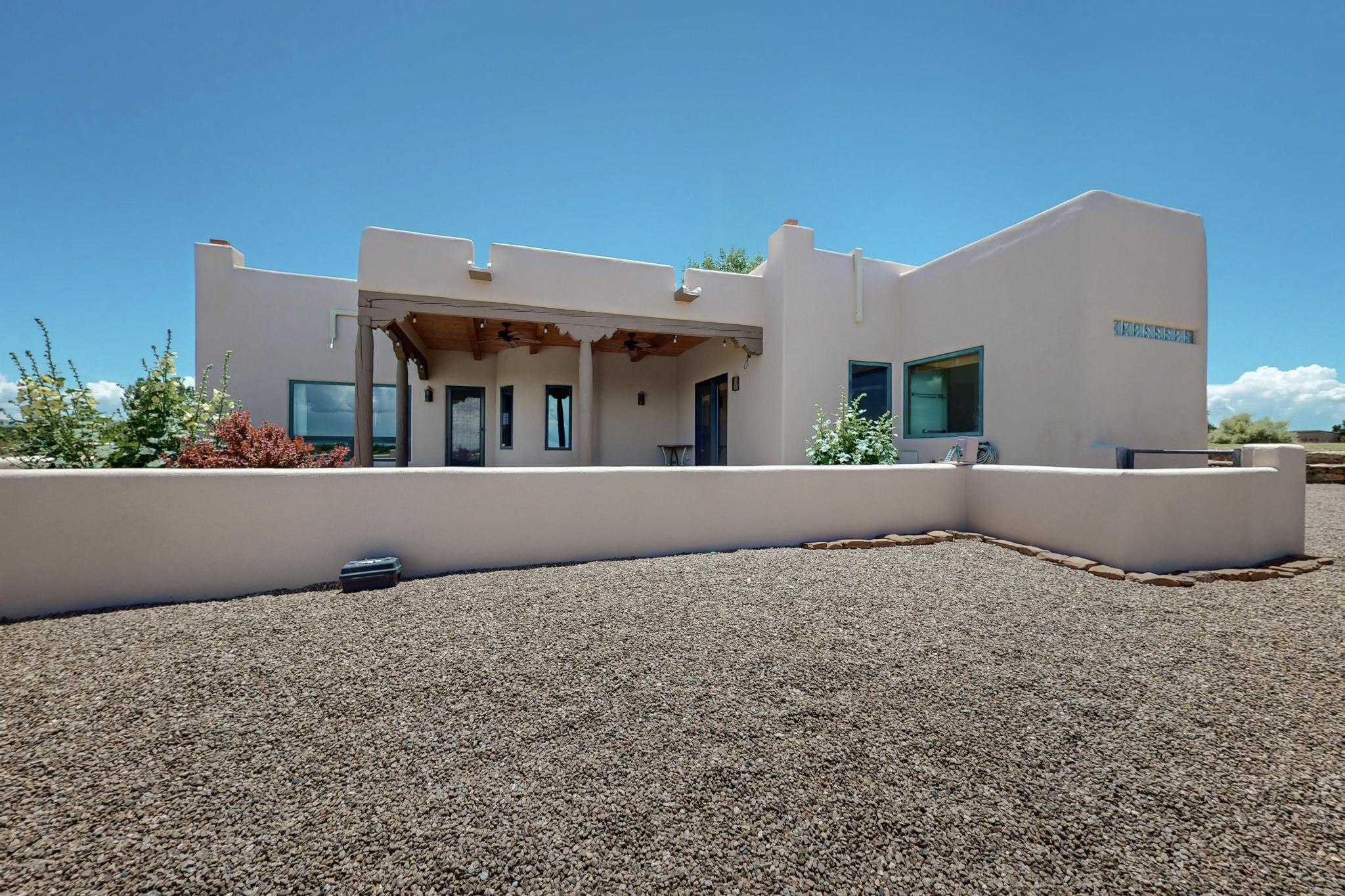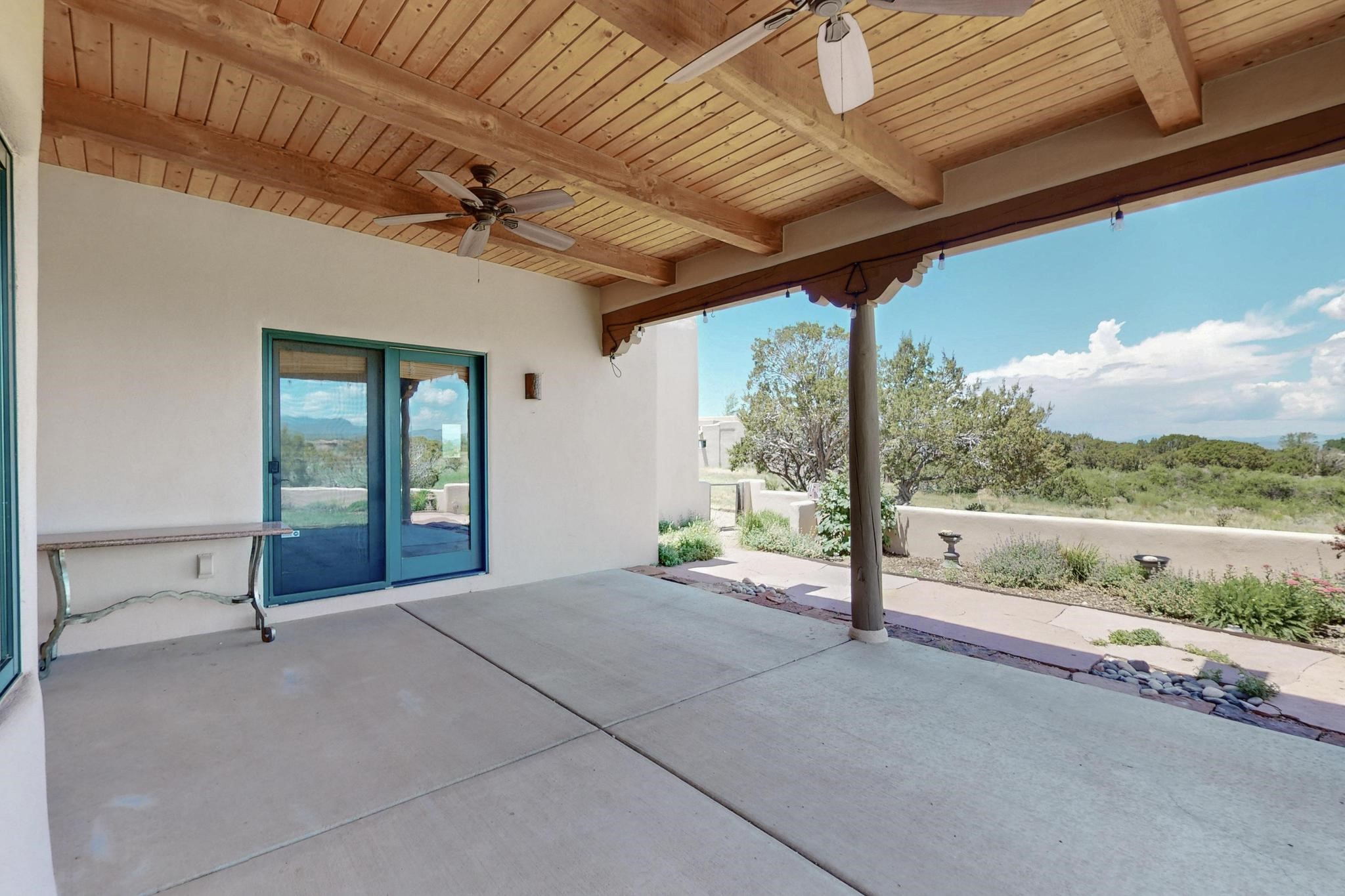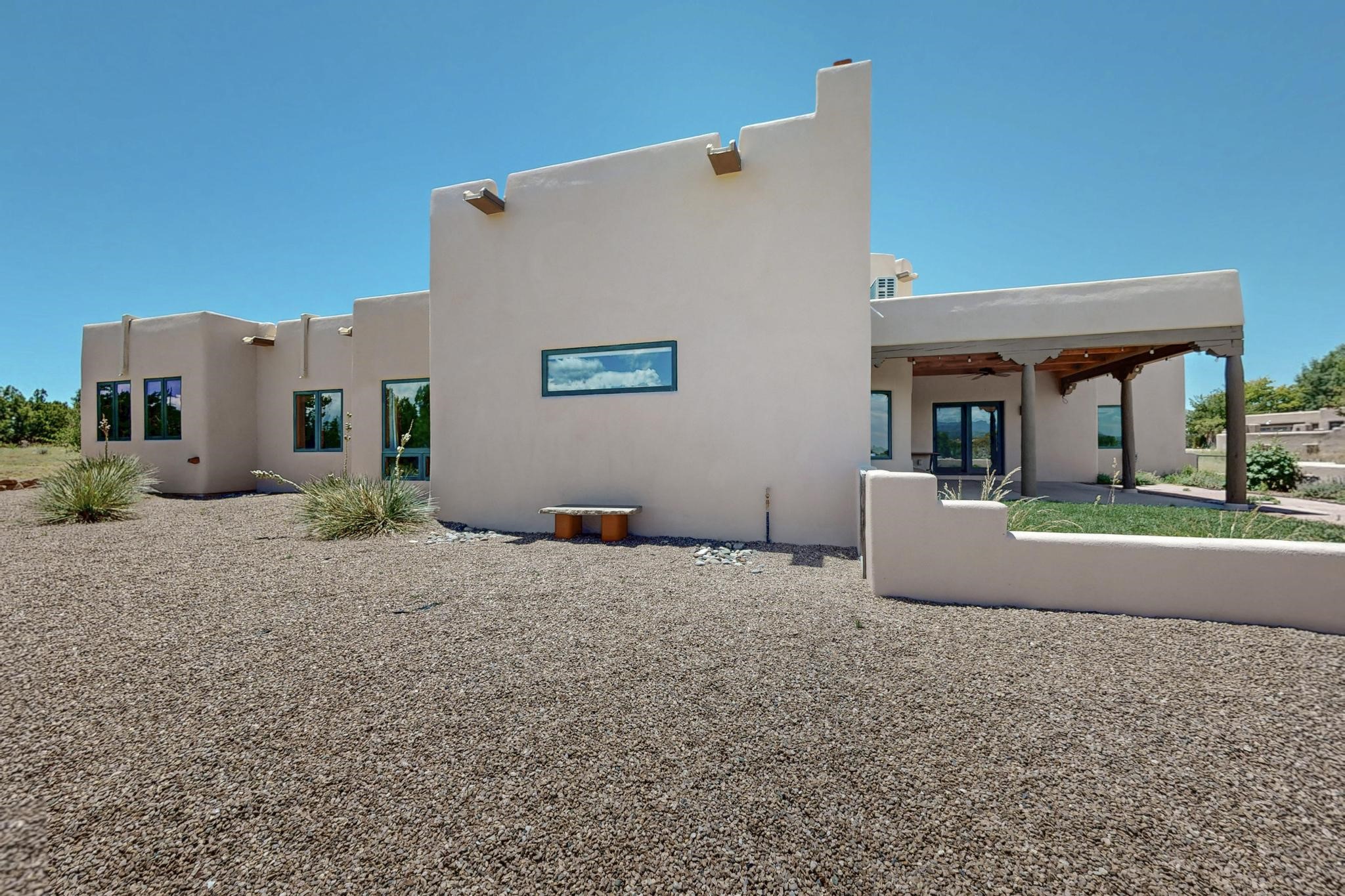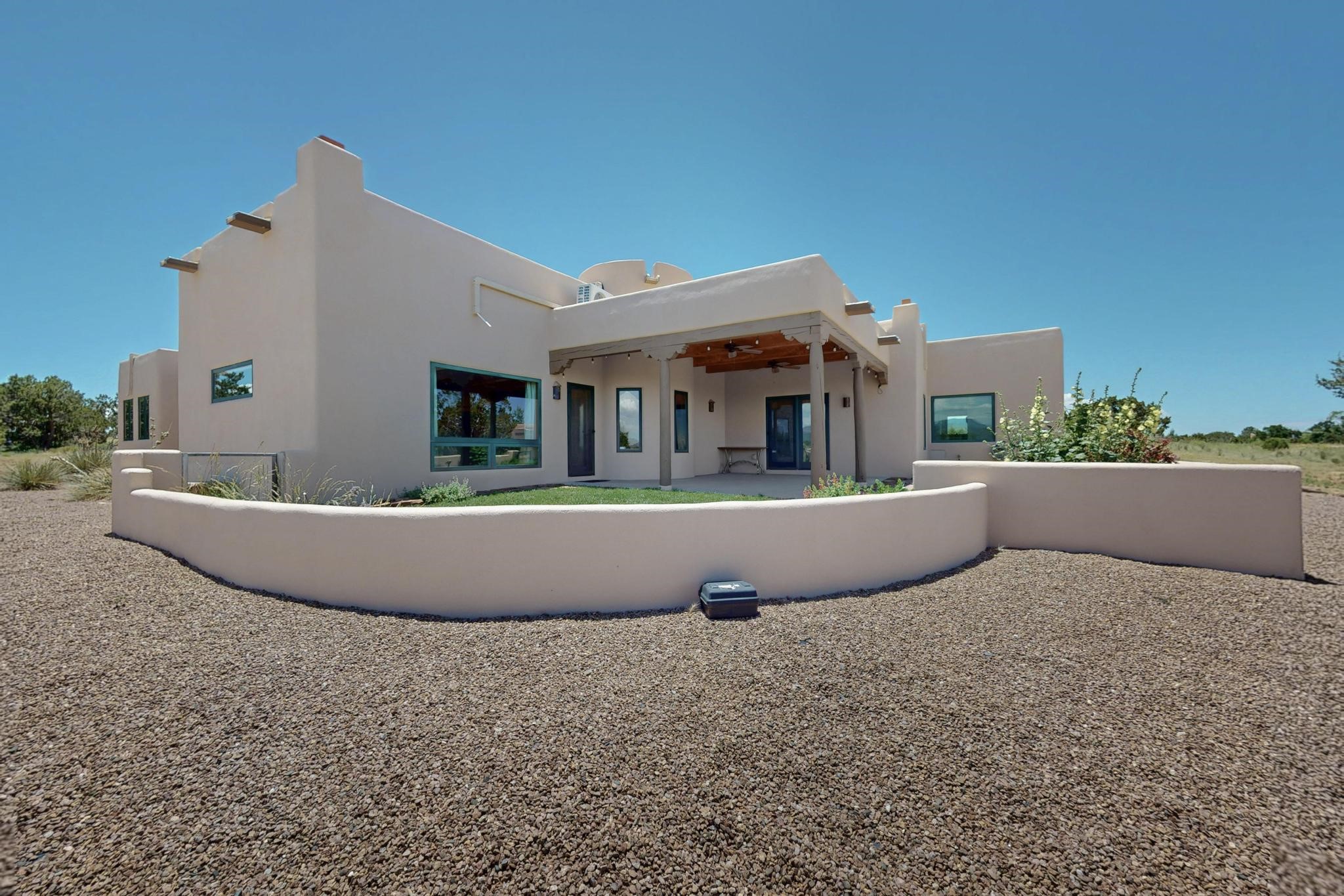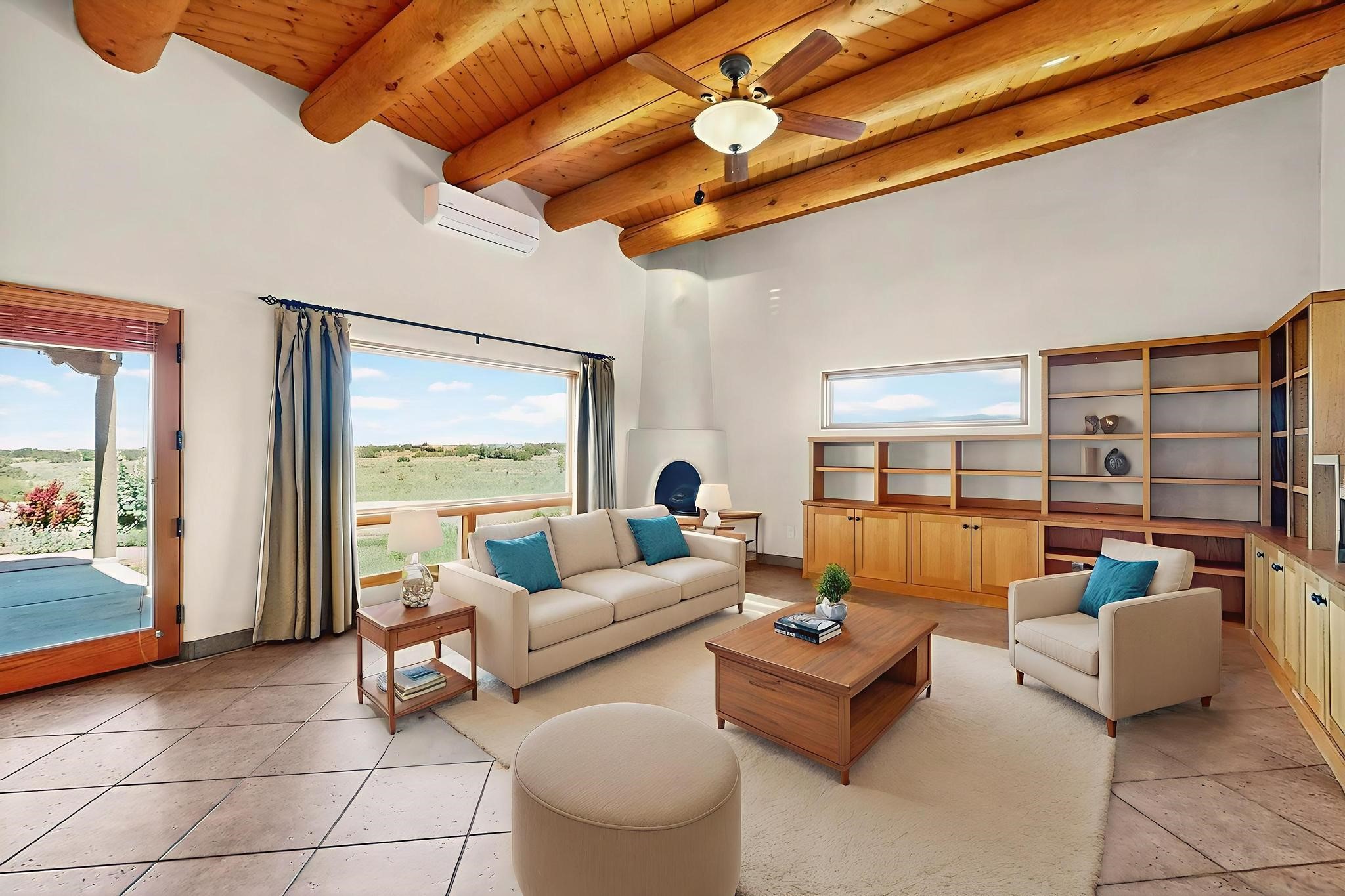 Wonderful custom design built by CPA Construction maximizing panoramic mountain views from across a large greenbelt. A private oasis with large picture windows from which to watch the wildlife go by. A large owners suite, totally separated from the guest wing, features high viga ceilings, a kiva fireplace and large walk in closet. The great room, dining room and kitchen open plan design allows for flexible use of space. There is a WirsboPex natural gas radiant heating system plus mini splits added in 2016 and annually maintained create comfortable summer and winter living. The roof was replaced with TPO in 2021, and stucco maintained recently. An additional 2 room and 1 bath casita /studio area with both direct entry from the home and an exterior entry. A private well supplies the domestic water and maintains the gardens, and an oversized 2 car finished garage with guest parking. Easy access to Eldorado amenities, parks and trails, local shopping, library, schools and only minutes into Santa Fe.