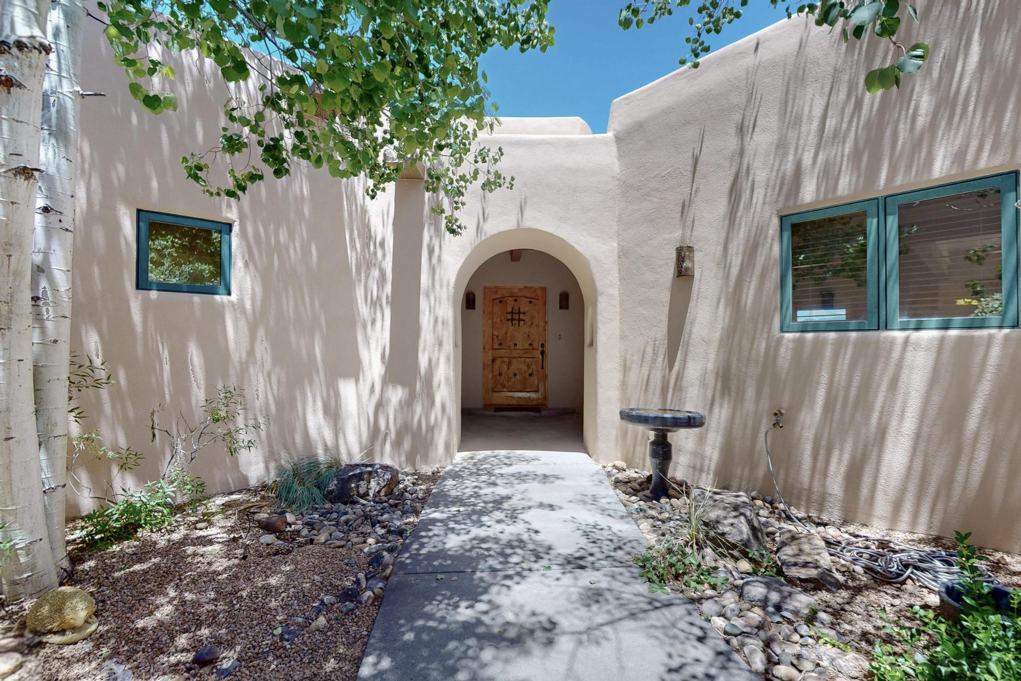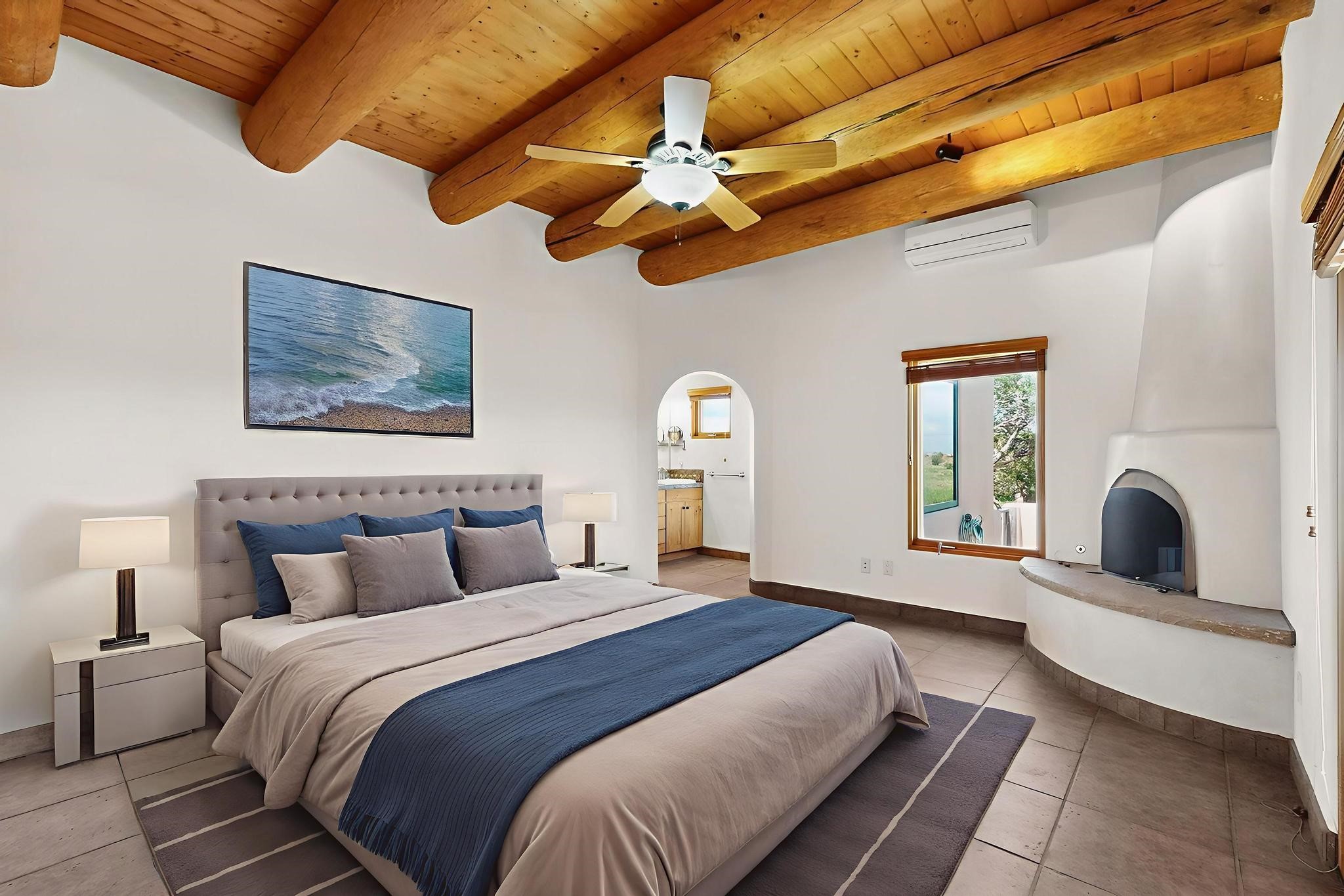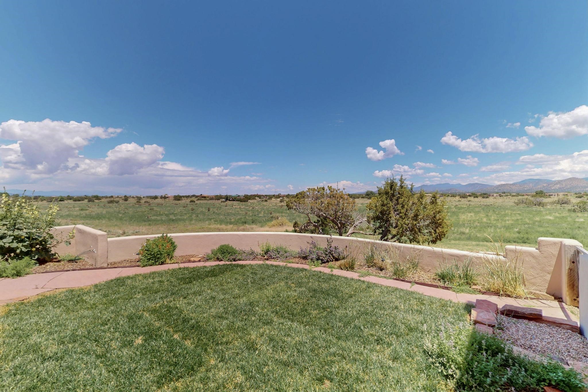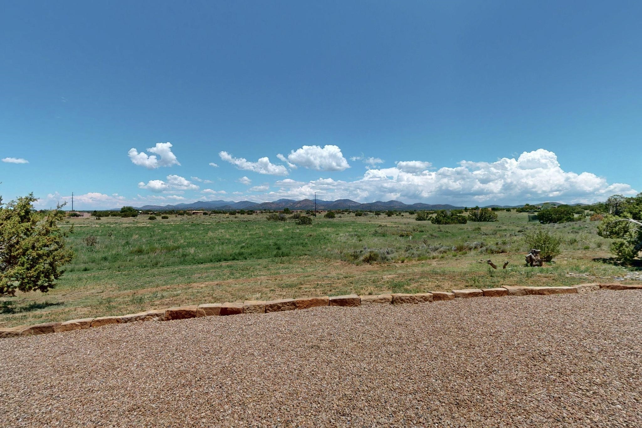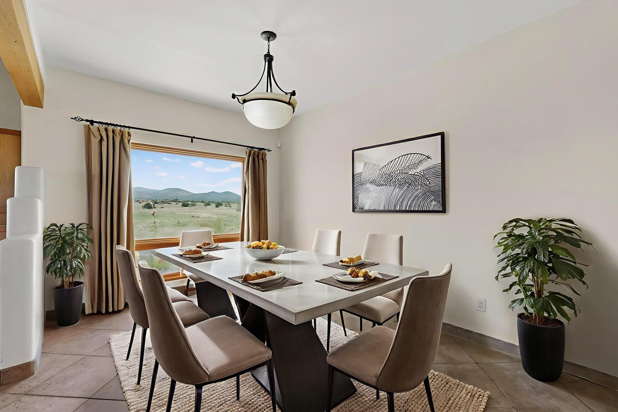 Wonderful custom design built by CPA Construction maximizing panoramic mountain views from across a large greenbelt. A private oasis with large picture windows from which to watch the wildlife go by. A large owners suite, totally separated from the guest wing, features high viga ceilings, a kiva fireplace and large walk in closet. The great room, dining room and kitchen open plan design allows for flexible use of space. There is a WirsboPex natural gas radiant heating system plus mini splits added in 2016 and annually maintained create comfortable summer and winter living. The roof was replaced with TPO in 2021, and stucco maintained recently. An additional 2 room and 1 bath casita /studio area with both direct entry from the home and an exterior entry. A private well supplies the domestic water and maintains the gardens, and an oversized 2 car finished garage with guest parking. Easy access to Eldorado amenities, parks and trails, local shopping, library, schools and only minutes into Santa Fe.