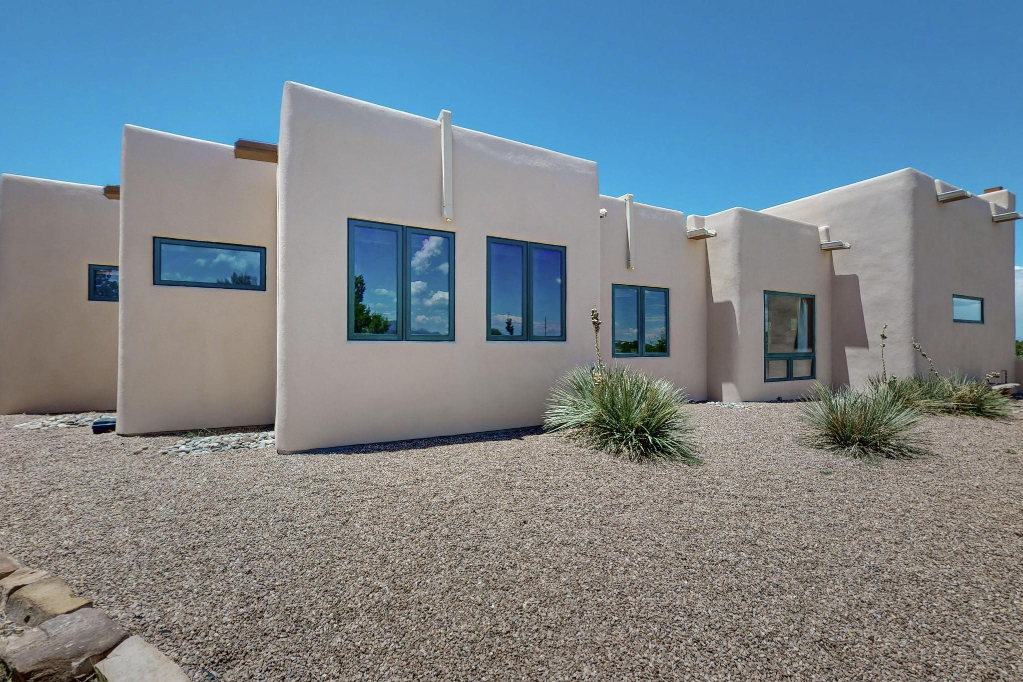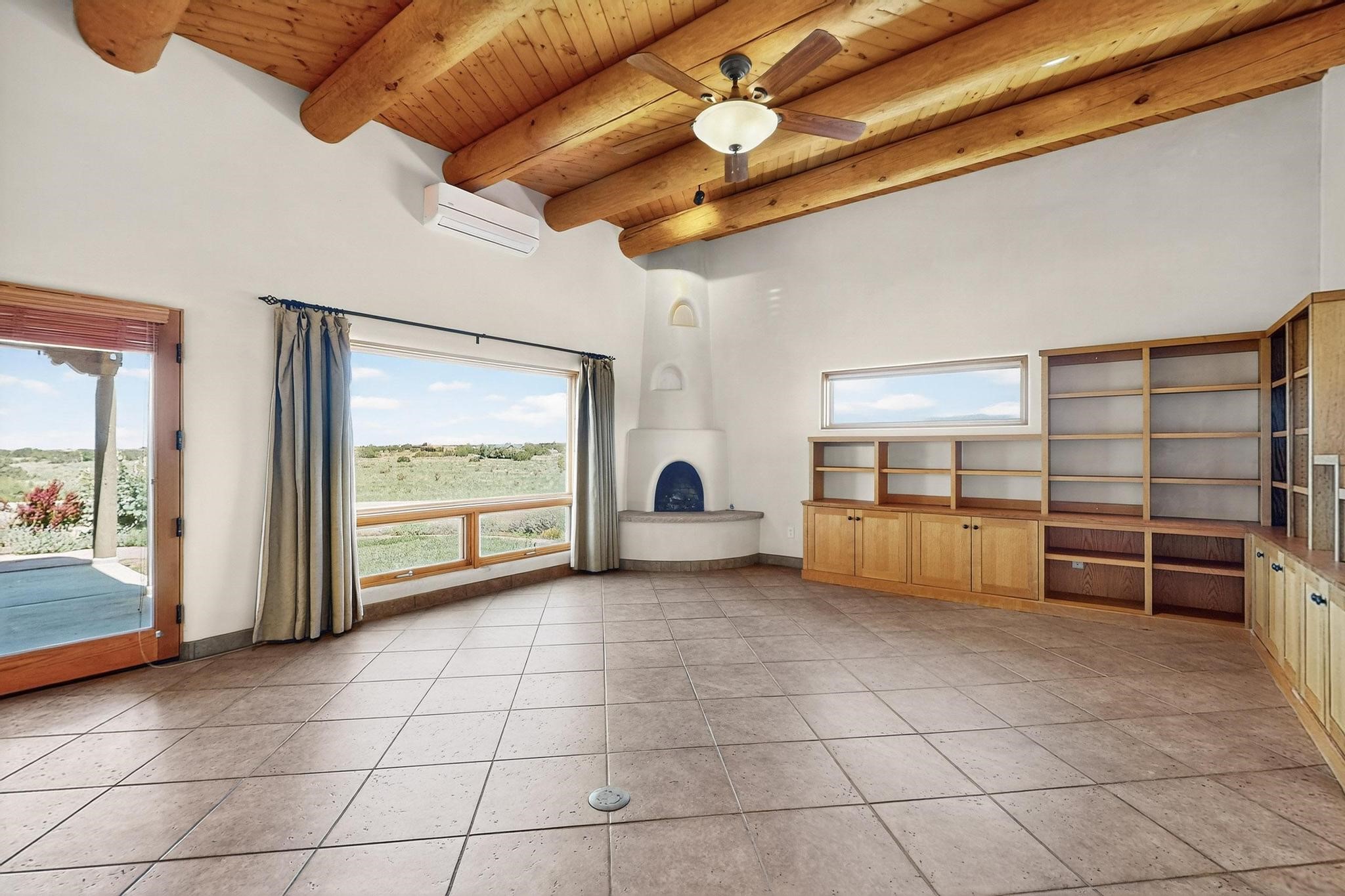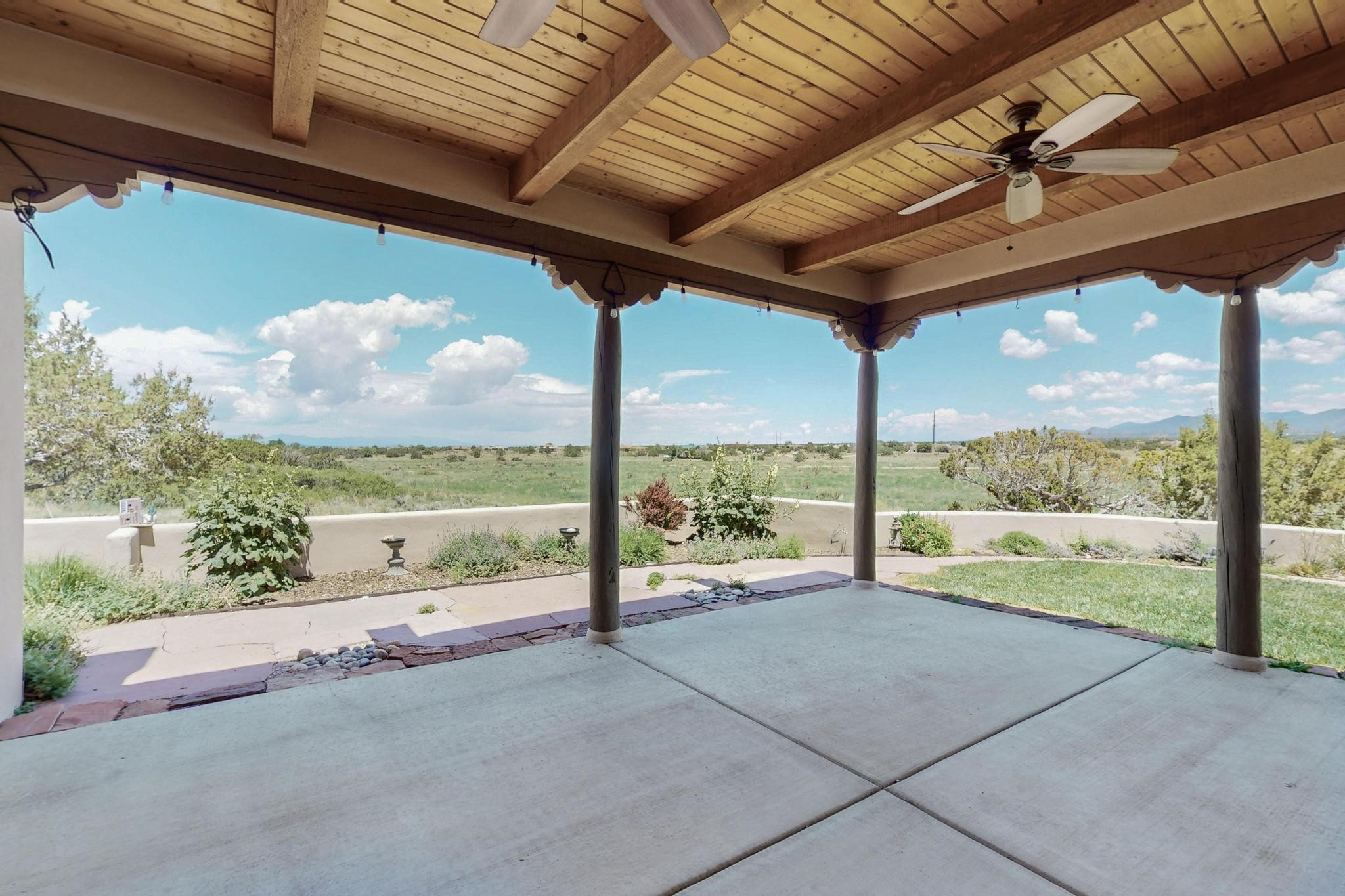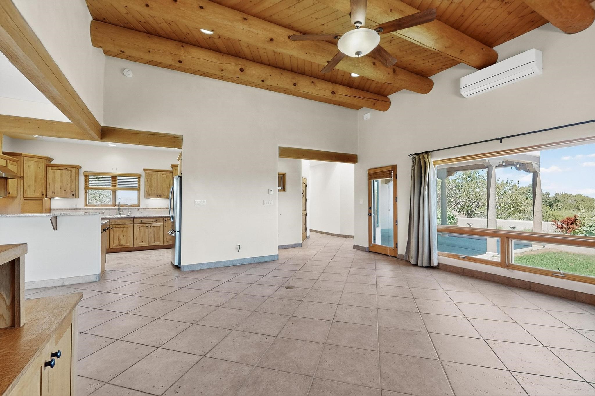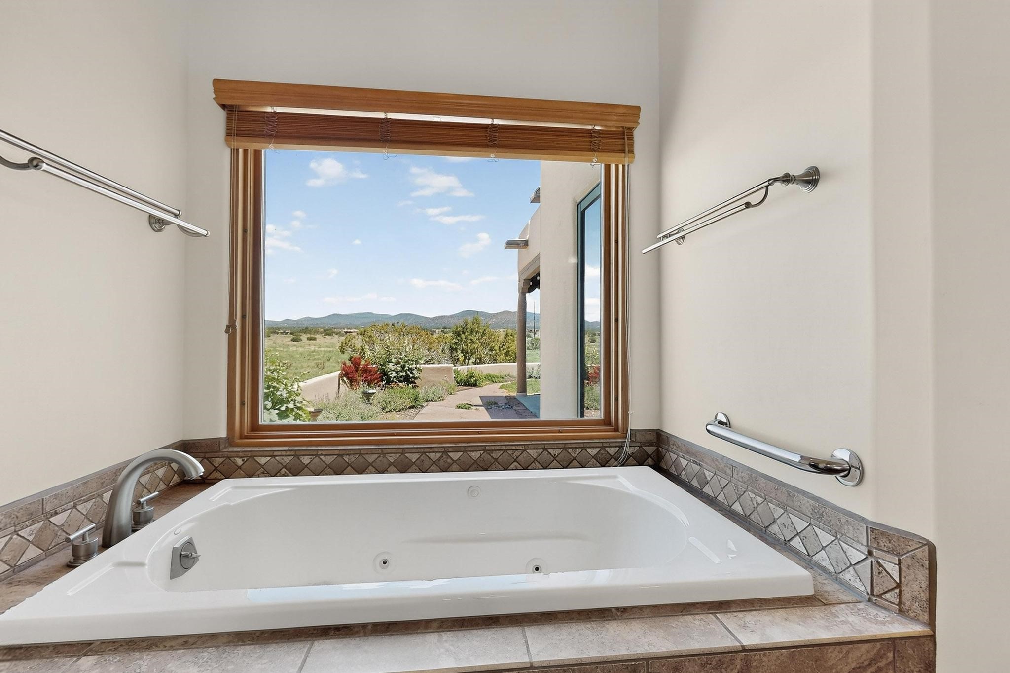 Wonderful custom design built by CPA Construction maximizing panoramic mountain views from across a large greenbelt. A private oasis with large picture windows from which to watch the wildlife go by. A large owners suite, totally separated from the guest wing, features high viga ceilings, a kiva fireplace and large walk in closet. The great room, dining room and kitchen open plan design allows for flexible use of space. There is a WirsboPex natural gas radiant heating system plus mini splits added in 2016 and annually maintained create comfortable summer and winter living. The roof was replaced with TPO in 2021, and stucco maintained recently. An additional 2 room and 1 bath casita /studio area with both direct entry from the home and an exterior entry. A private well supplies the domestic water and maintains the gardens, and an oversized 2 car finished garage with guest parking. Easy access to Eldorado amenities, parks and trails, local shopping, library, schools and only minutes into Santa Fe.