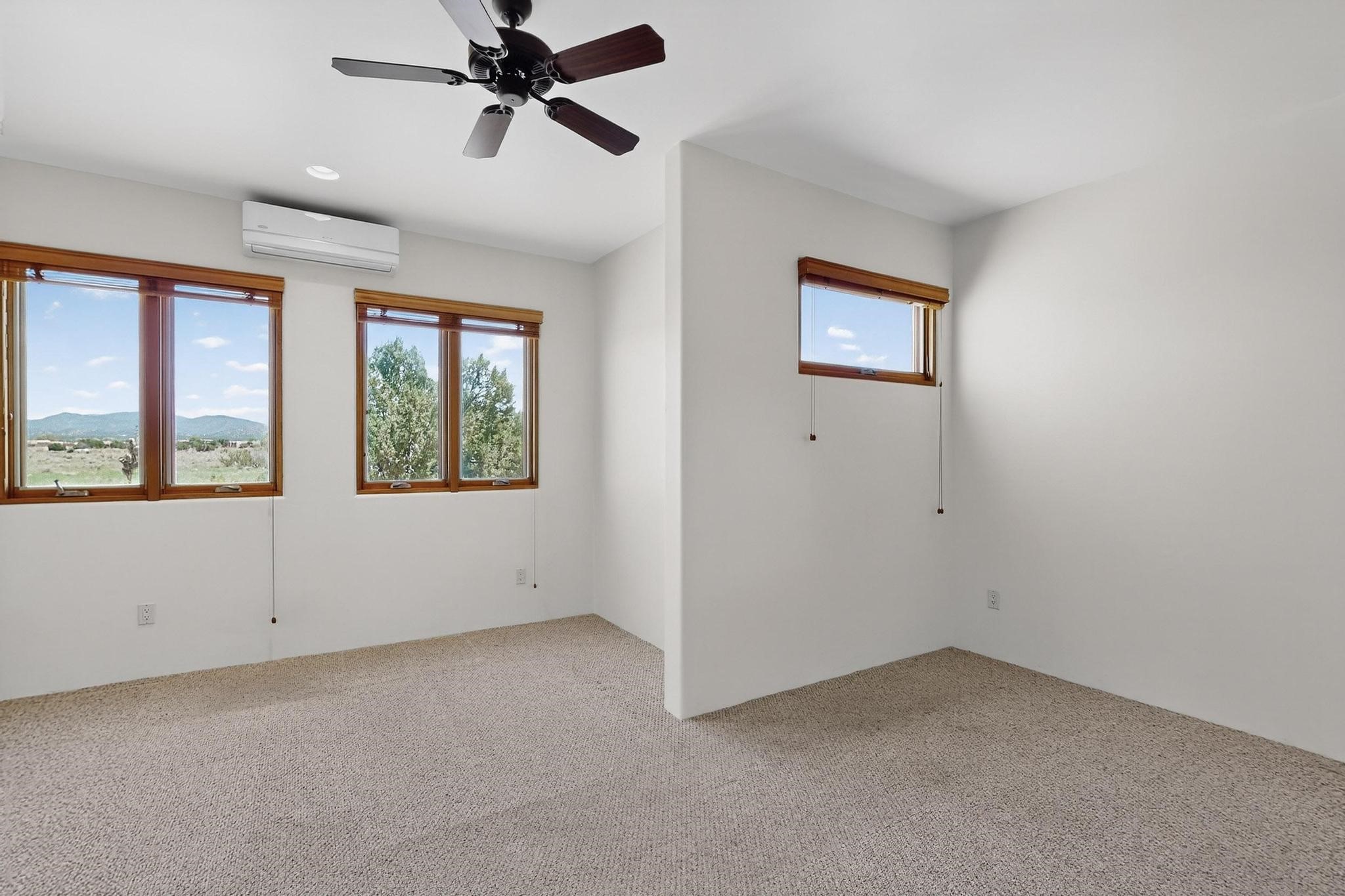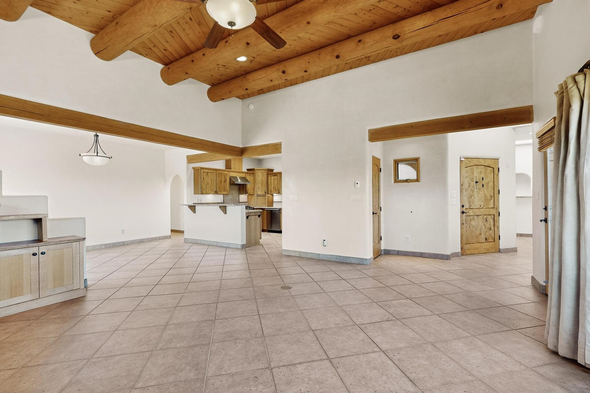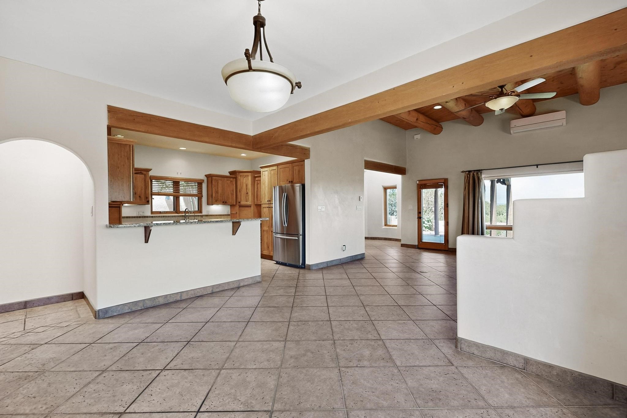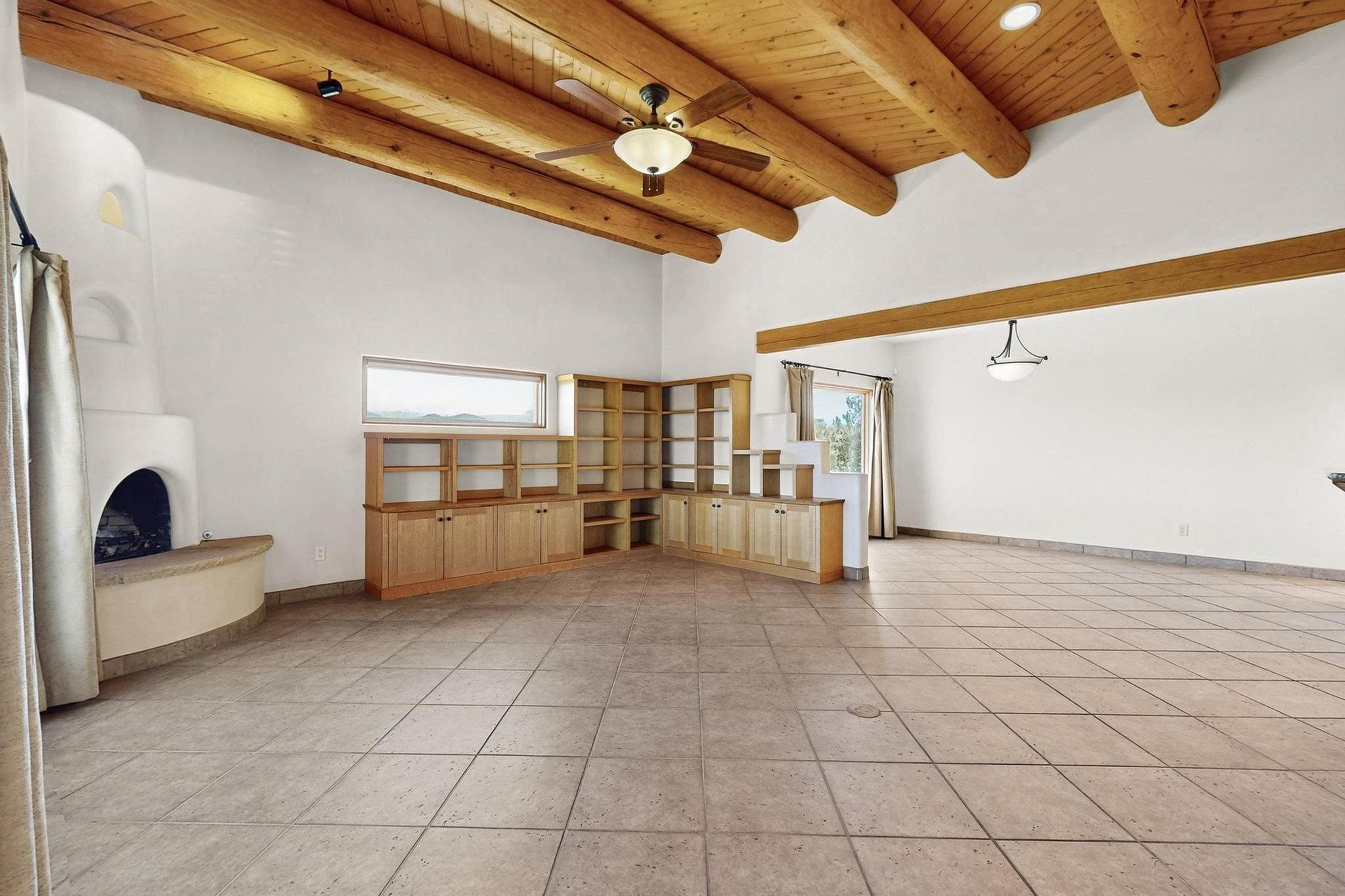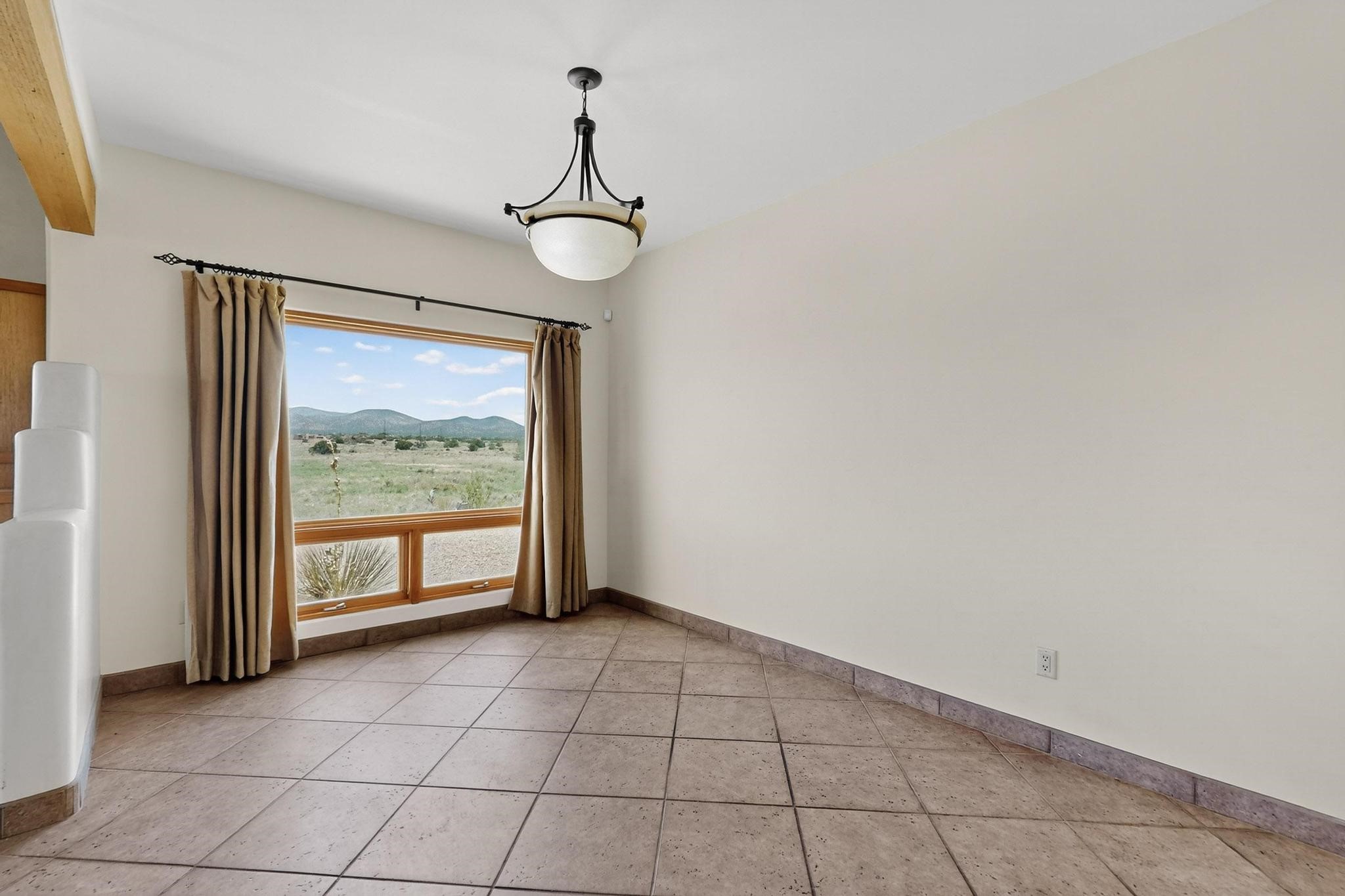 Wonderful custom design built by CPA Construction maximizing panoramic mountain views from across a large greenbelt. A private oasis with large picture windows from which to watch the wildlife go by. A large owners suite, totally separated from the guest wing, features high viga ceilings, a kiva fireplace and large walk in closet. The great room, dining room and kitchen open plan design allows for flexible use of space. There is a WirsboPex natural gas radiant heating system plus mini splits added in 2016 and annually maintained create comfortable summer and winter living. The roof was replaced with TPO in 2021, and stucco maintained recently. An additional 2 room and 1 bath casita /studio area with both direct entry from the home and an exterior entry. A private well supplies the domestic water and maintains the gardens, and an oversized 2 car finished garage with guest parking. Easy access to Eldorado amenities, parks and trails, local shopping, library, schools and only minutes into Santa Fe.