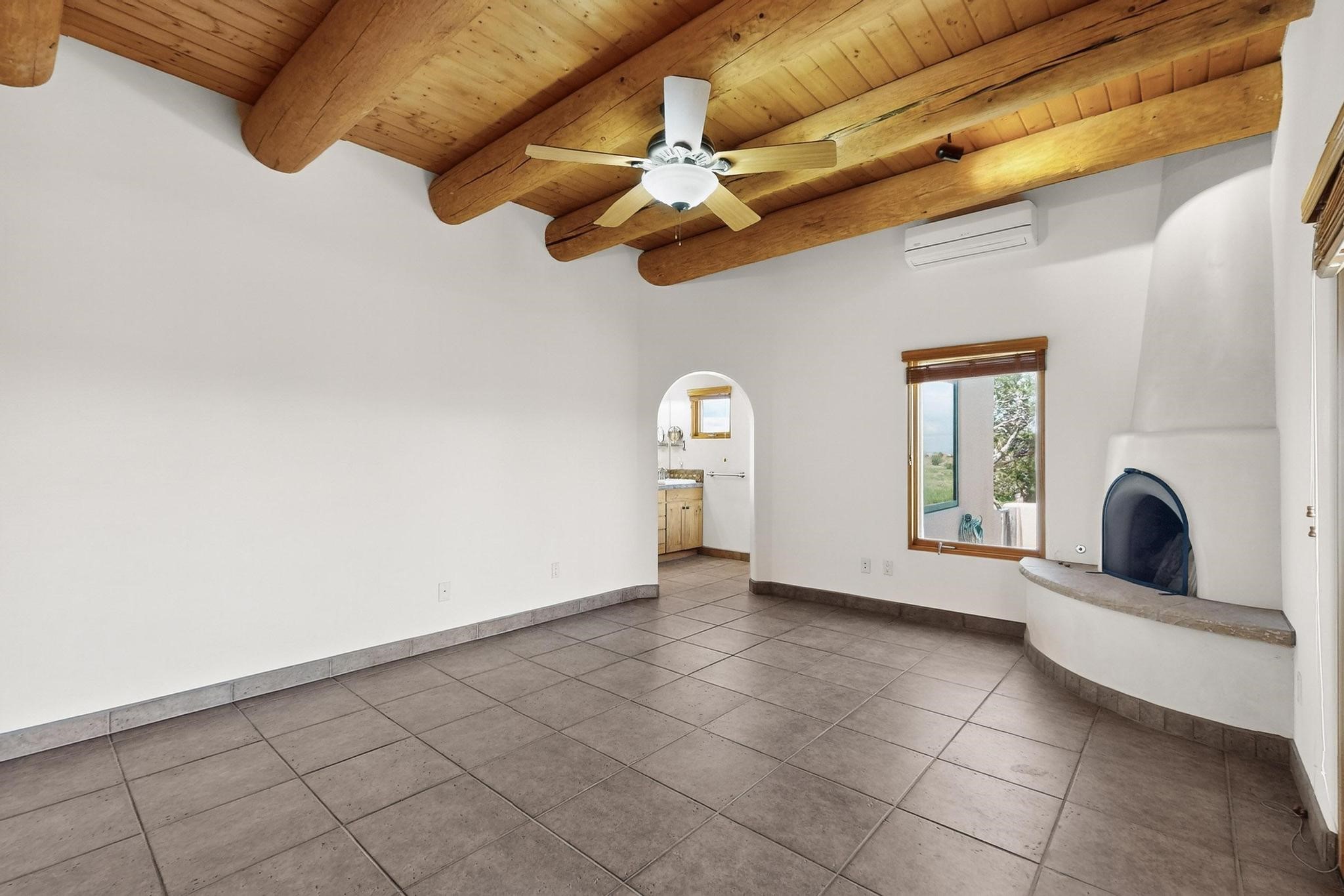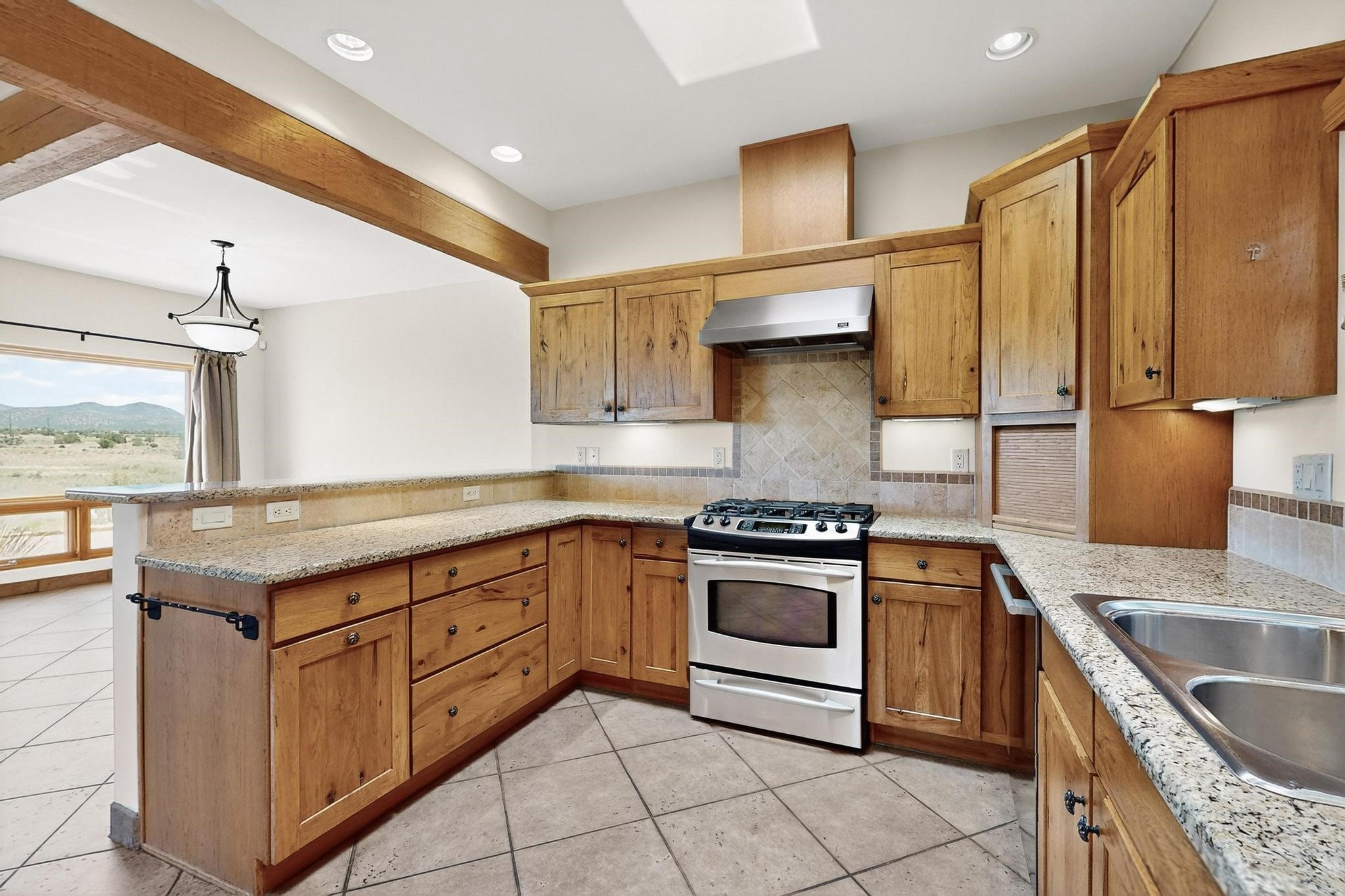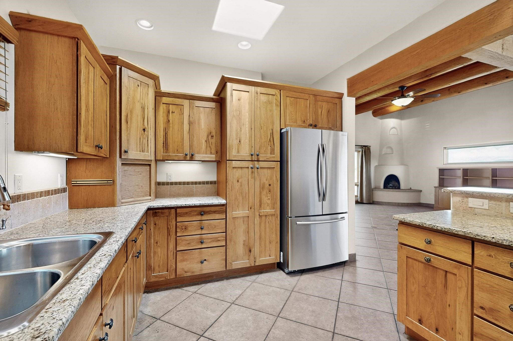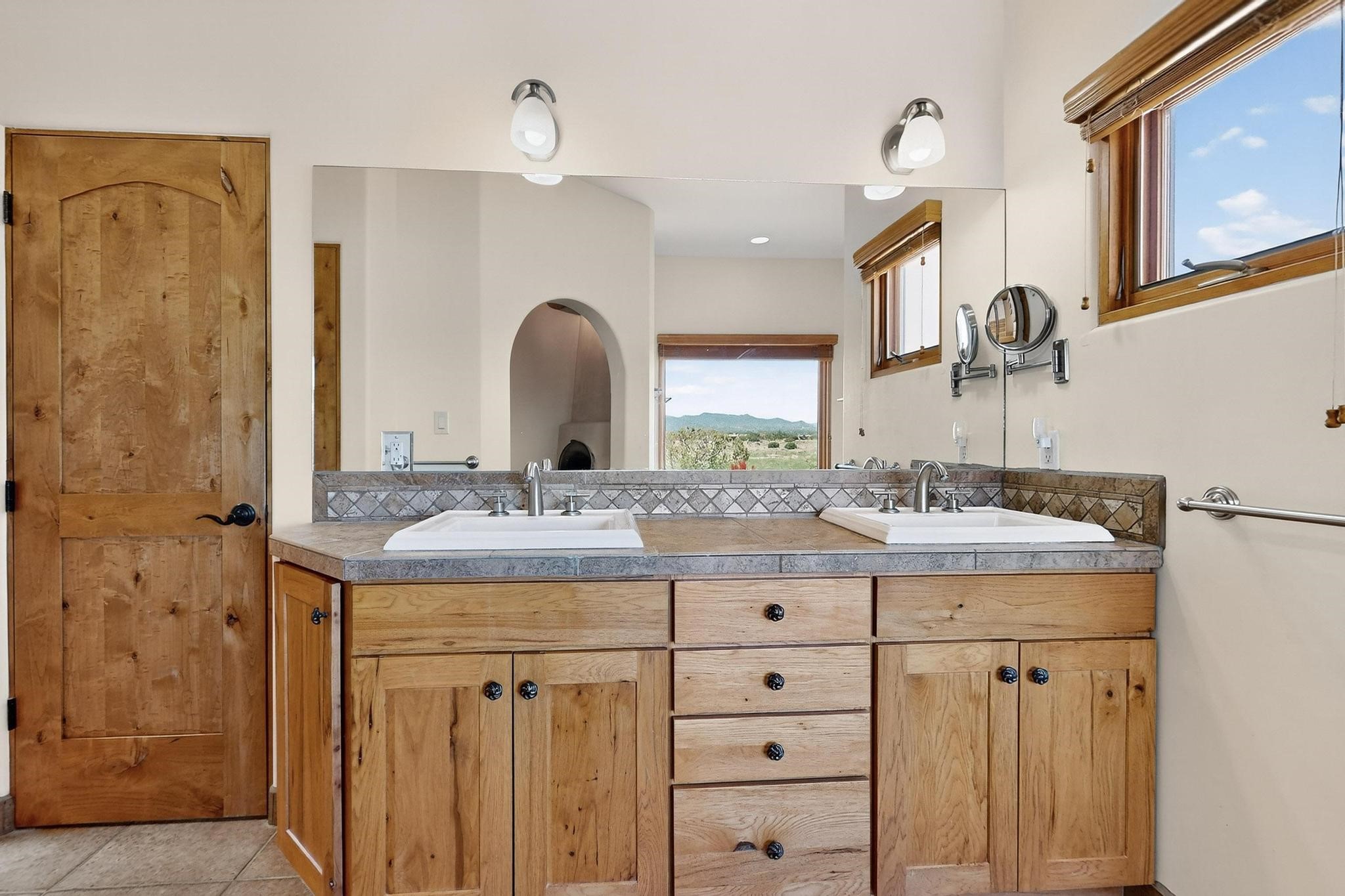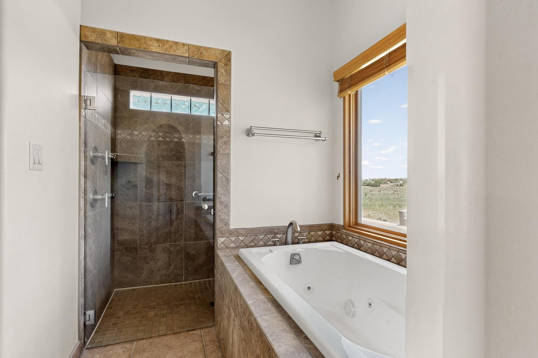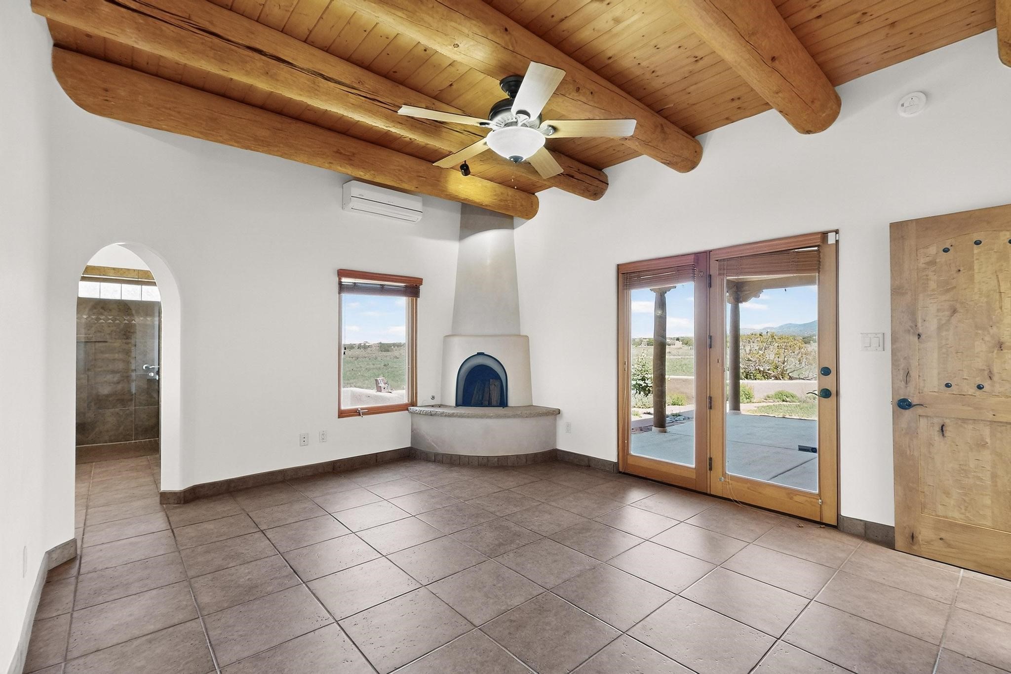 Wonderful custom design built by CPA Construction maximizing panoramic mountain views from across a large greenbelt. A private oasis with large picture windows from which to watch the wildlife go by. A large owners suite, totally separated from the guest wing, features high viga ceilings, a kiva fireplace and large walk in closet. The great room, dining room and kitchen open plan design allows for flexible use of space. There is a WirsboPex natural gas radiant heating system plus mini splits added in 2016 and annually maintained create comfortable summer and winter living. The roof was replaced with TPO in 2021, and stucco maintained recently. An additional 2 room and 1 bath casita /studio area with both direct entry from the home and an exterior entry. A private well supplies the domestic water and maintains the gardens, and an oversized 2 car finished garage with guest parking. Easy access to Eldorado amenities, parks and trails, local shopping, library, schools and only minutes into Santa Fe.