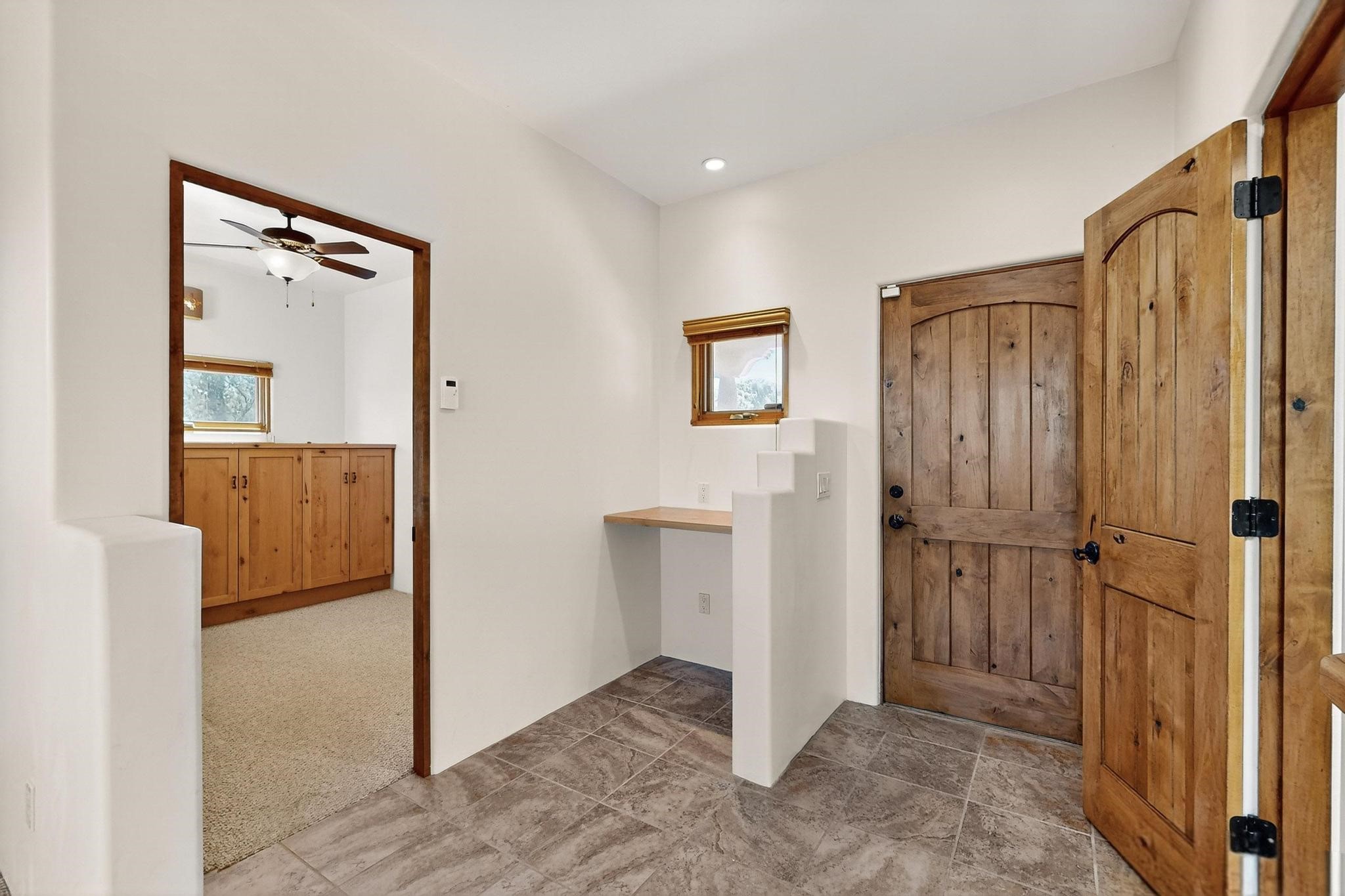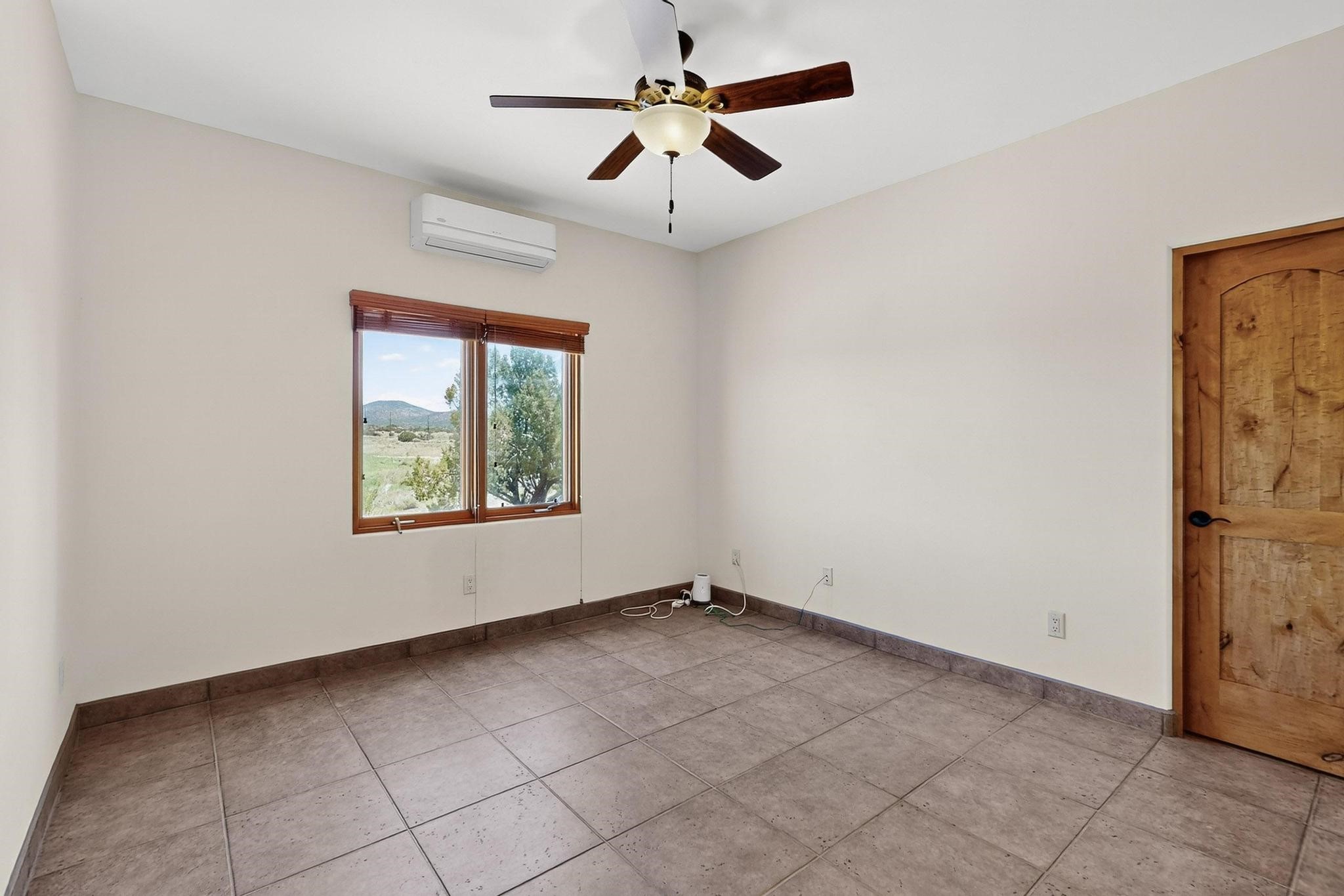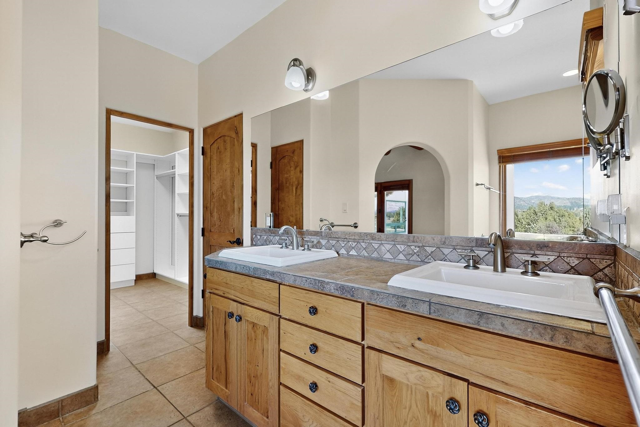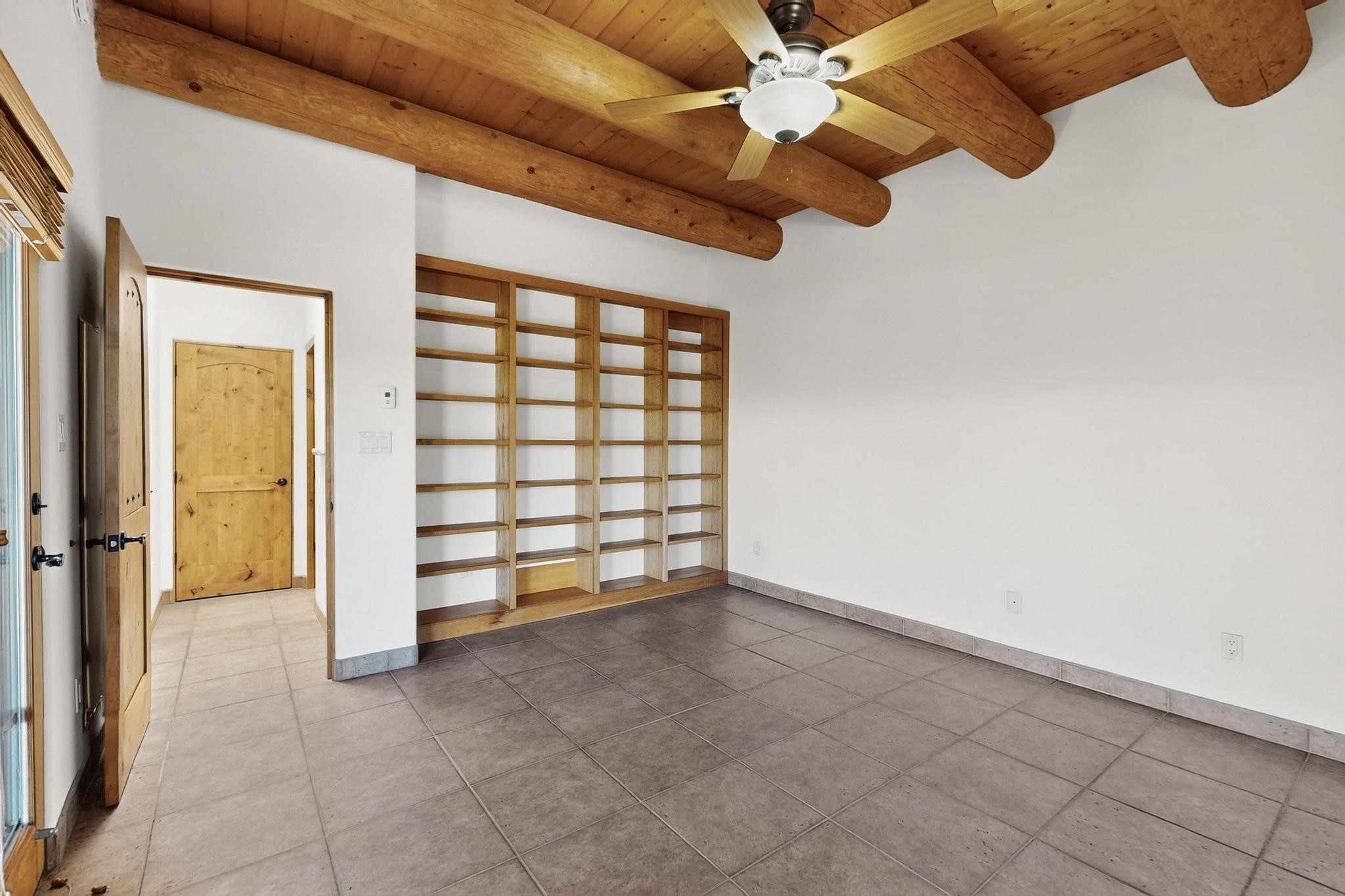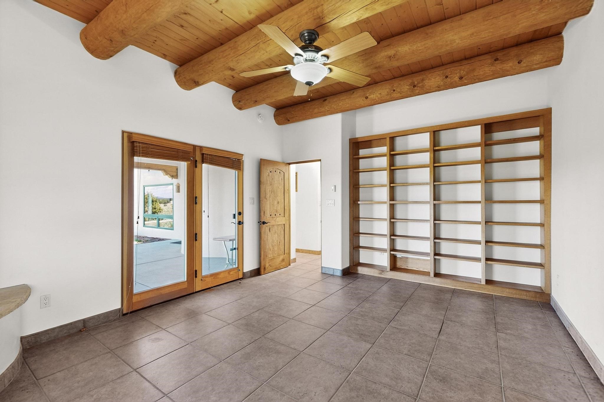 Wonderful custom design built by CPA Construction maximizing panoramic mountain views from across a large greenbelt. A private oasis with large picture windows from which to watch the wildlife go by. A large owners suite, totally separated from the guest wing, features high viga ceilings, a kiva fireplace and large walk in closet. The great room, dining room and kitchen open plan design allows for flexible use of space. There is a WirsboPex natural gas radiant heating system plus mini splits added in 2016 and annually maintained create comfortable summer and winter living. The roof was replaced with TPO in 2021, and stucco maintained recently. An additional 2 room and 1 bath casita /studio area with both direct entry from the home and an exterior entry. A private well supplies the domestic water and maintains the gardens, and an oversized 2 car finished garage with guest parking. Easy access to Eldorado amenities, parks and trails, local shopping, library, schools and only minutes into Santa Fe.