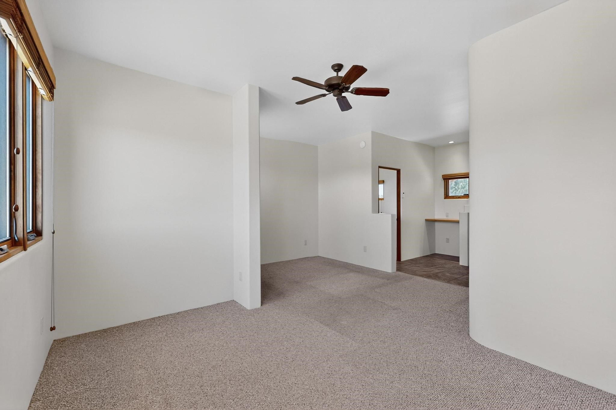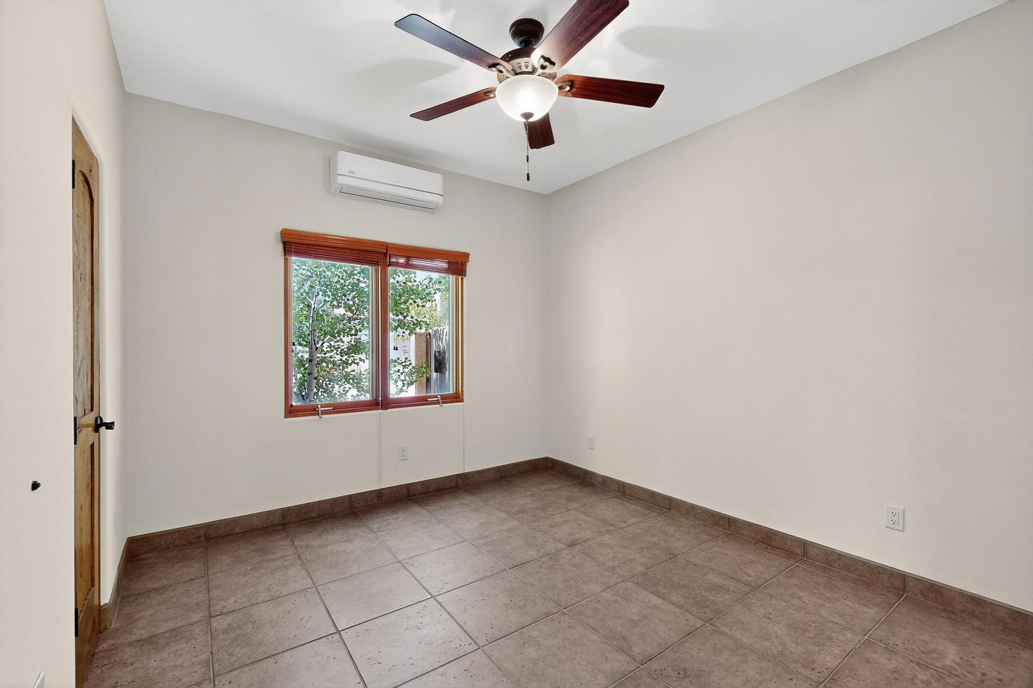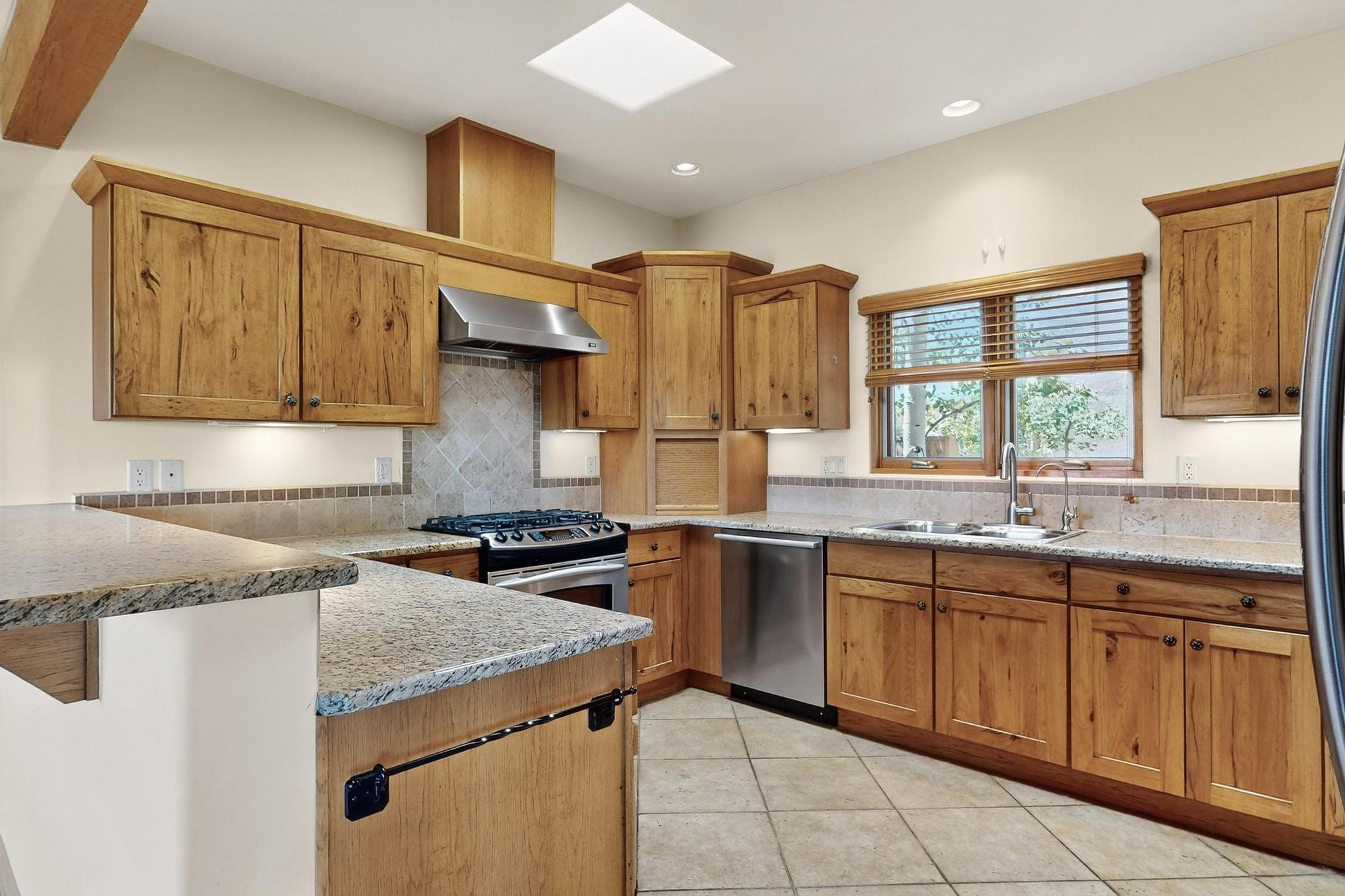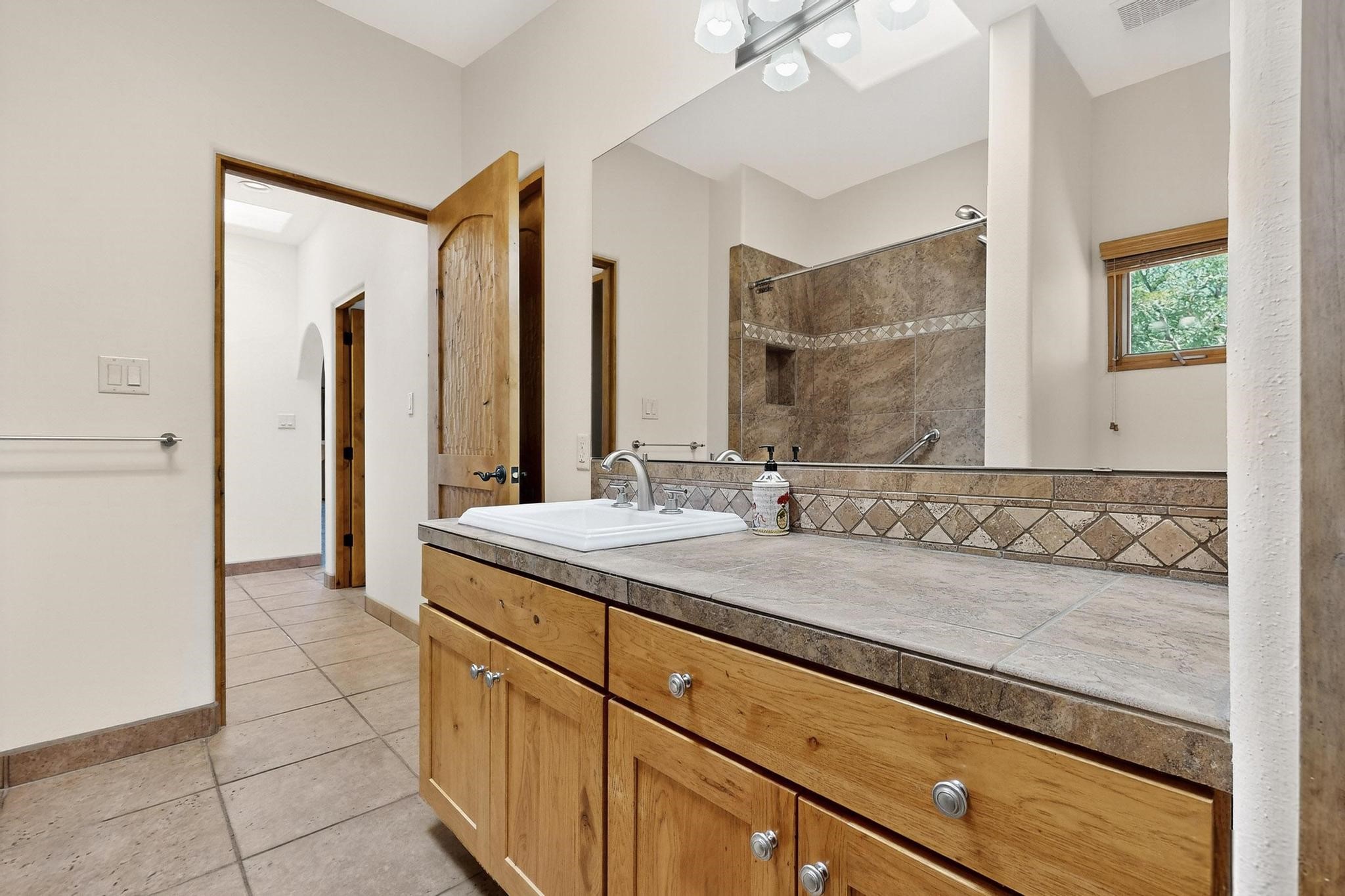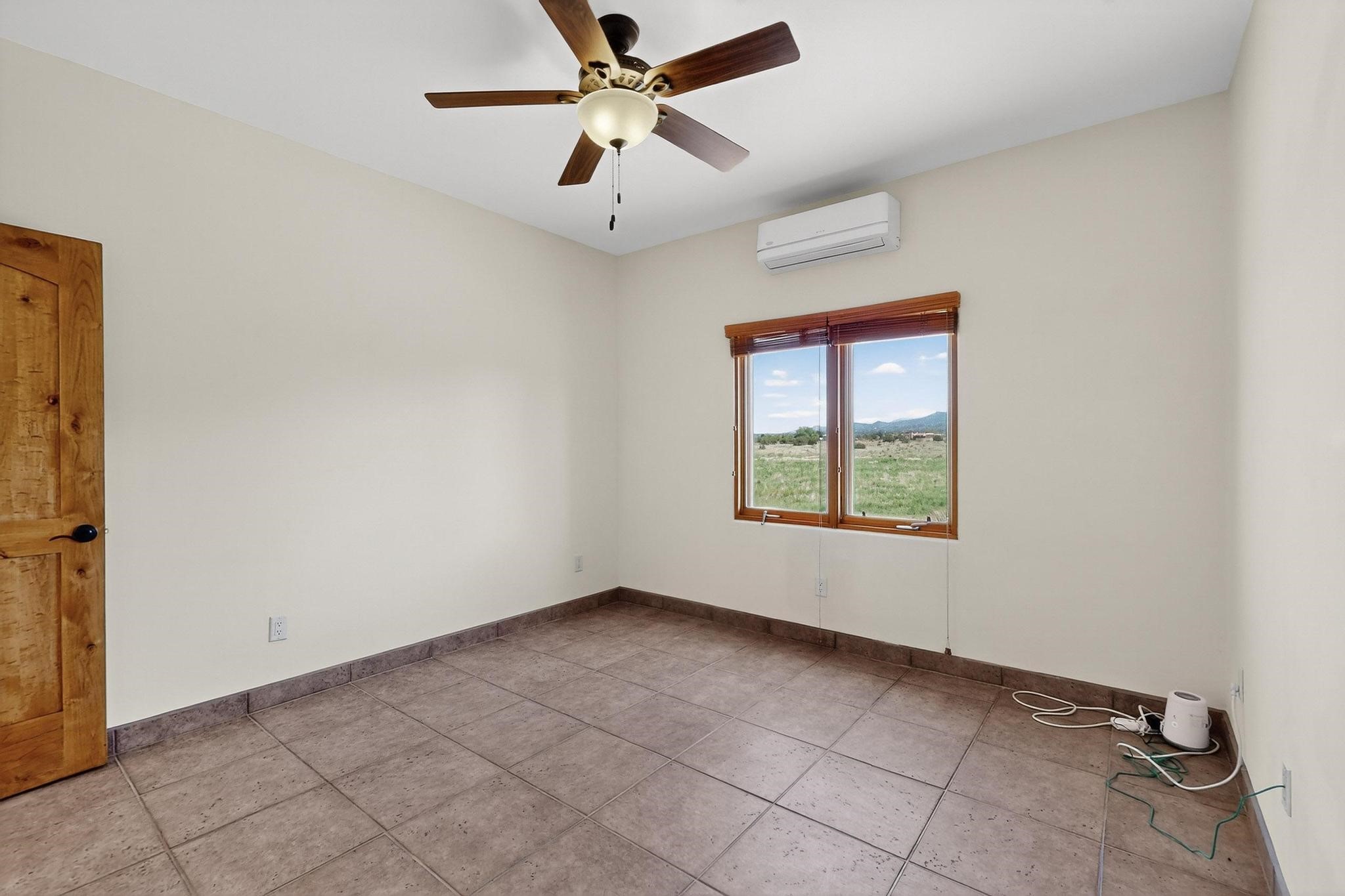 Wonderful custom design built by CPA Construction maximizing panoramic mountain views from across a large greenbelt. A private oasis with large picture windows from which to watch the wildlife go by. A large owners suite, totally separated from the guest wing, features high viga ceilings, a kiva fireplace and large walk in closet. The great room, dining room and kitchen open plan design allows for flexible use of space. There is a WirsboPex natural gas radiant heating system plus mini splits added in 2016 and annually maintained create comfortable summer and winter living. The roof was replaced with TPO in 2021, and stucco maintained recently. An additional 2 room and 1 bath casita /studio area with both direct entry from the home and an exterior entry. A private well supplies the domestic water and maintains the gardens, and an oversized 2 car finished garage with guest parking. Easy access to Eldorado amenities, parks and trails, local shopping, library, schools and only minutes into Santa Fe.