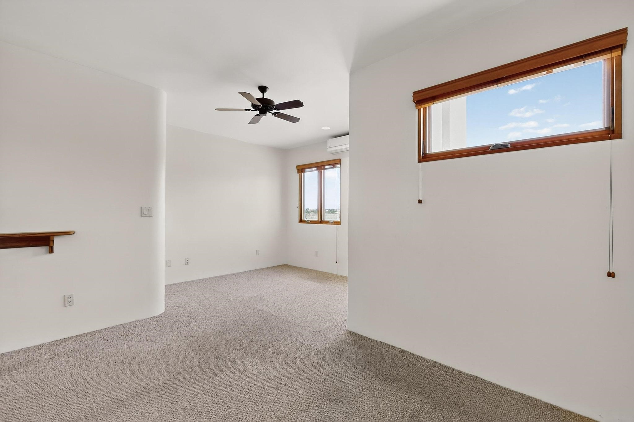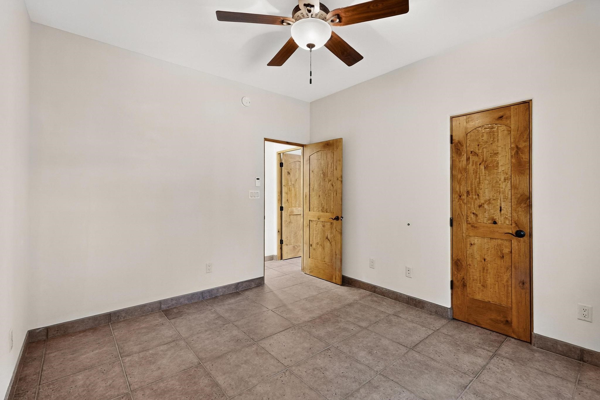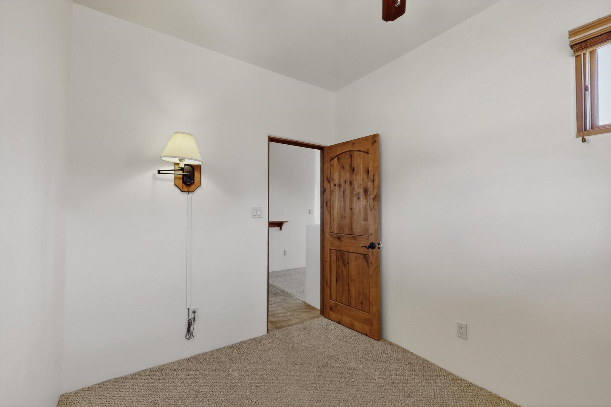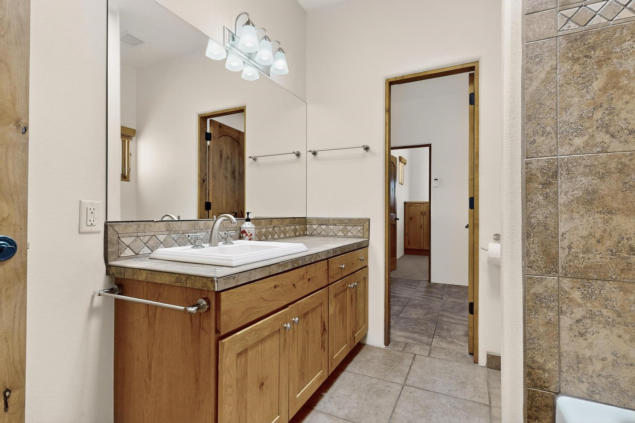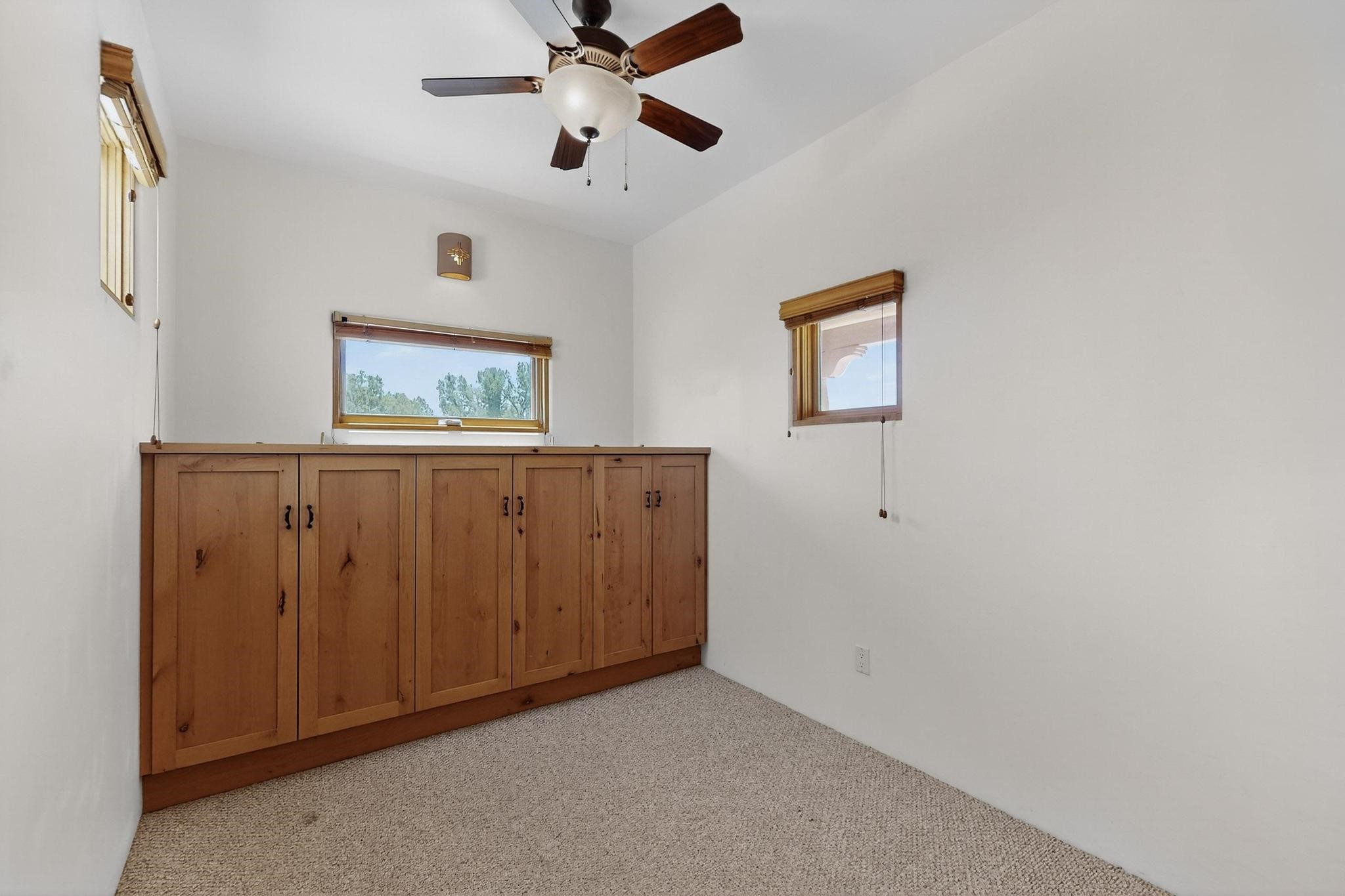 Wonderful custom design built by CPA Construction maximizing panoramic mountain views from across a large greenbelt. A private oasis with large picture windows from which to watch the wildlife go by. A large owners suite, totally separated from the guest wing, features high viga ceilings, a kiva fireplace and large walk in closet. The great room, dining room and kitchen open plan design allows for flexible use of space. There is a WirsboPex natural gas radiant heating system plus mini splits added in 2016 and annually maintained create comfortable summer and winter living. The roof was replaced with TPO in 2021, and stucco maintained recently. An additional 2 room and 1 bath casita /studio area with both direct entry from the home and an exterior entry. A private well supplies the domestic water and maintains the gardens, and an oversized 2 car finished garage with guest parking. Easy access to Eldorado amenities, parks and trails, local shopping, library, schools and only minutes into Santa Fe.