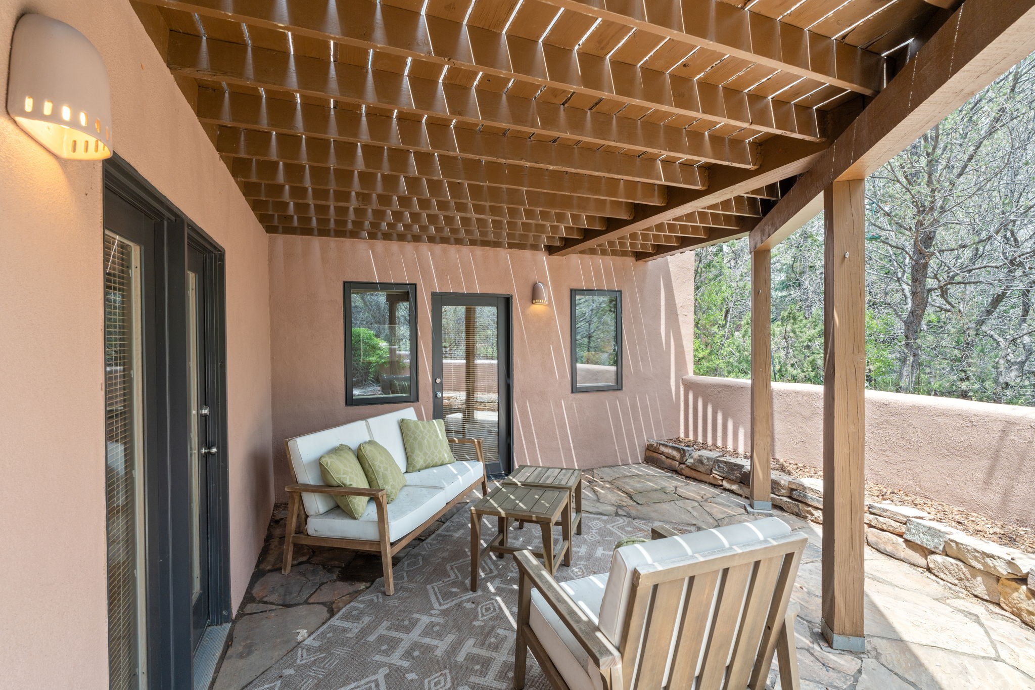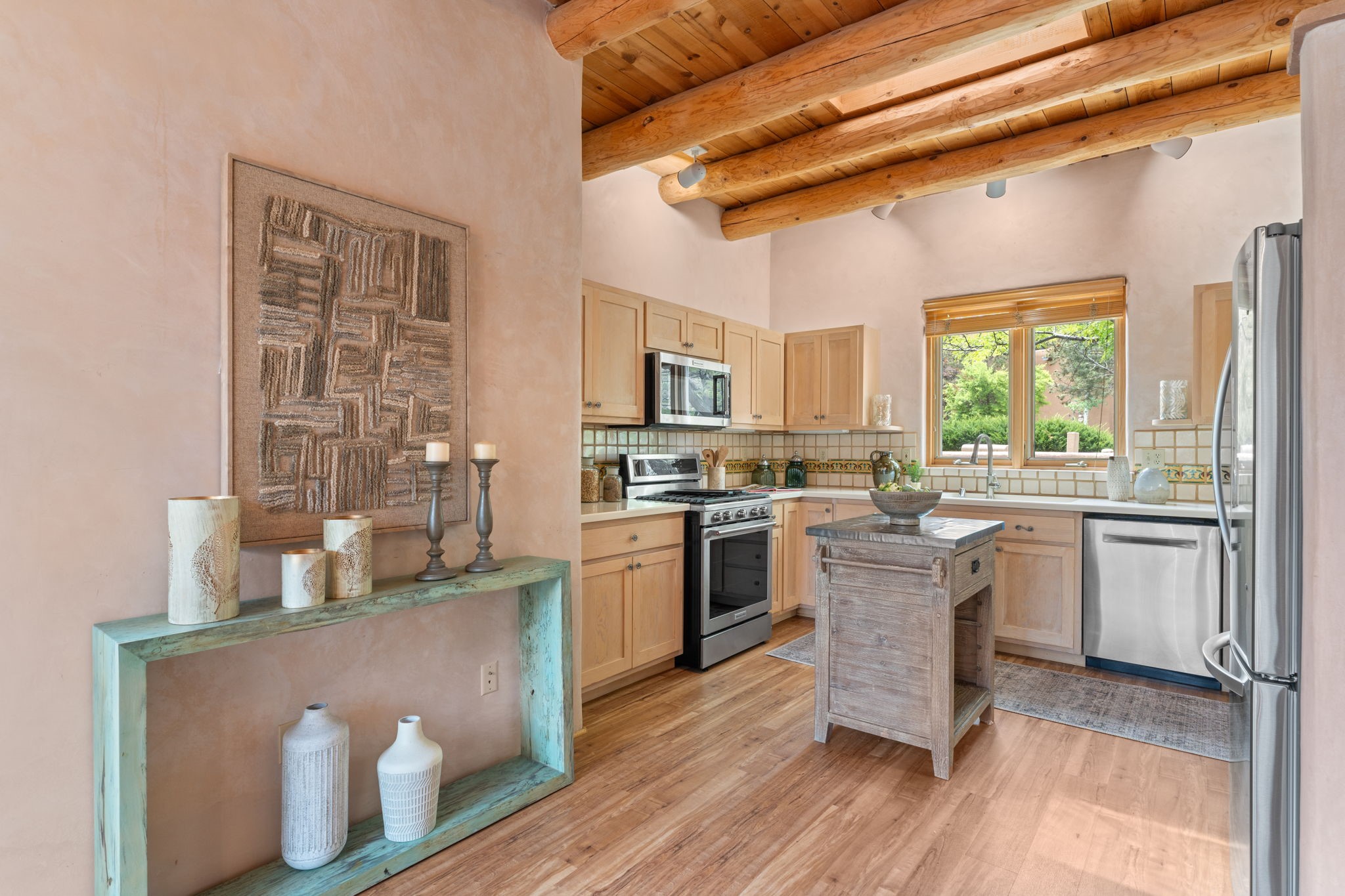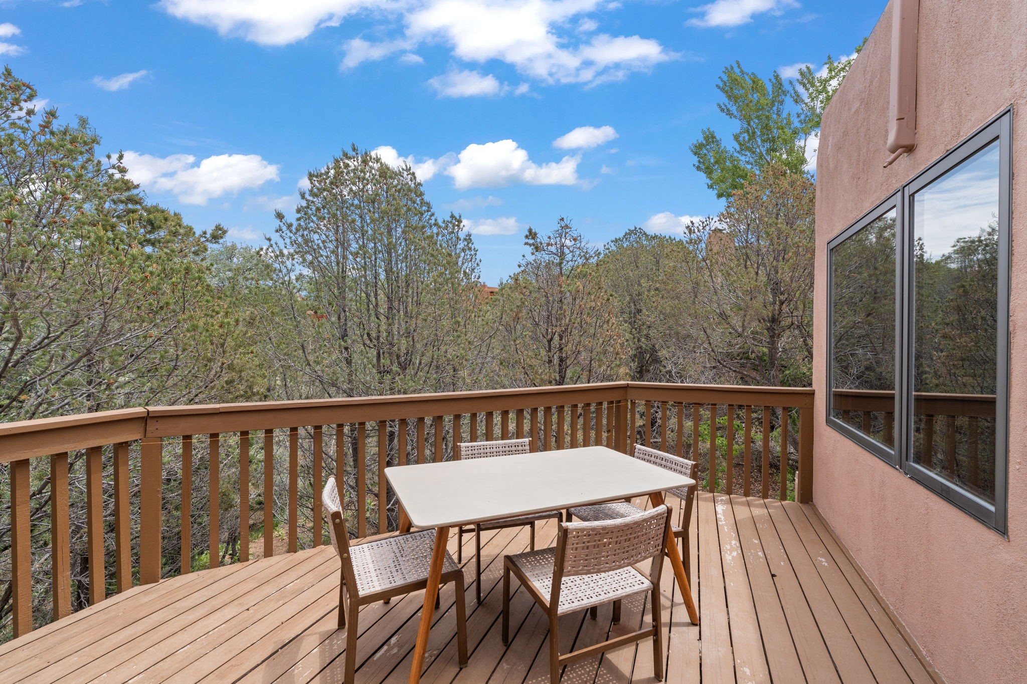 Sophisticated In-Town Living in highly sought-after Estancias Primera on charming La Viveza Court. Leave your home and walk to the Plaza via the lush arroyo. This two-story home has three outside living with an open living/dining/kitchen floor plan with wood-burning Kiva fireplace, plaster walls, wood floors and vigas, a main level powder room and tree-scaped patio. The two well-sized bedrooms have doors to walk out on to the terrace and feature en-suite full baths. In addition to a heated two-car garage with shelving, there are two nicely-sized storage areas. Estancias Primera is known for its reasonable HOA fees, privacy, and has a seasonal swimming pool, tennis courts and a clubhouse. This is the perfect lock-and-leave or full-time home. In five minutes, you're at the Plaza or Dale Ball trail system and in 20 minutes, the ski basin. The home has radiant floor heating and mini splits for air conditioning and additional heating.
