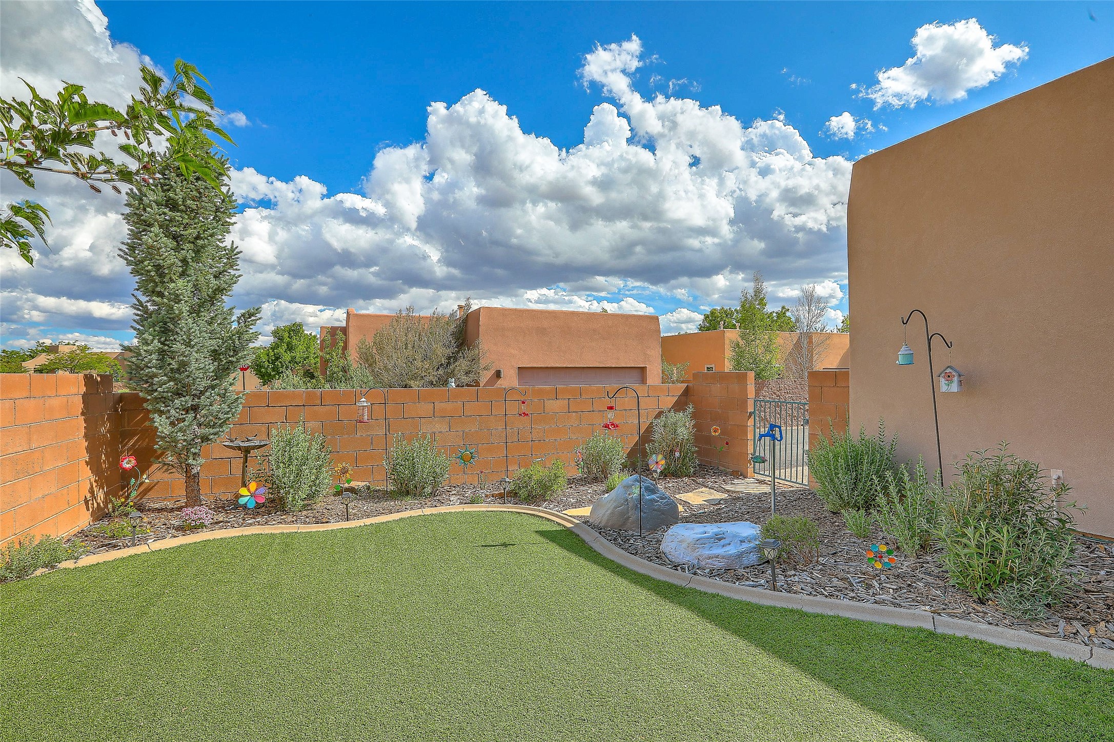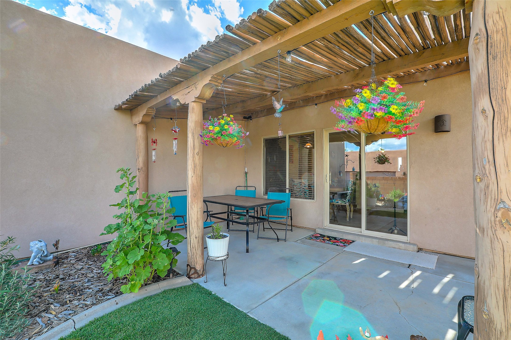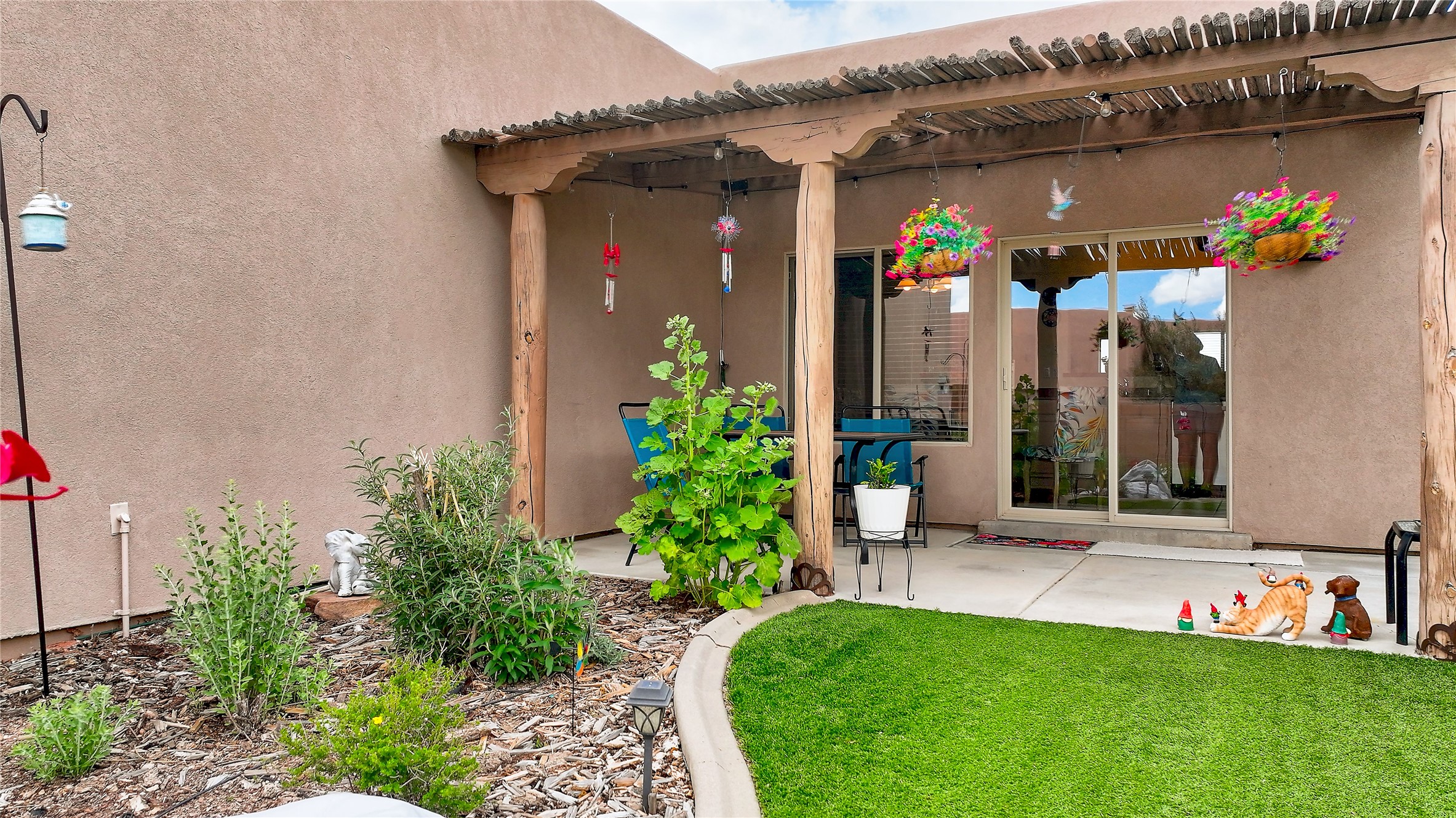 Well loved and cared for home. Move-In Ready with thoughtful touches! Why wait to build? Well designed, this updated lovely home with a newer roof, stucco, & appliances. Spacious layout and great outdoor space. Lots of privacy, end unit with open space and views surrounding it. One level, light and bright & impeccably clean. Guest parking out front of home. 2 car attached garage off alley for easy access. HOA includes trash pickup, road maintenance & snow removal. Community parks, walking, biking and hiking trails everywhere! The open-concept design combines the large kitchen dining area and the main large living room space. Outside, the covered portal showcases to a private backyard oasis enclosed by a privacy wall. Beautiful landscaping, combined with astroturf for pets, allows for beauty with low maintenance. Night time skies for relaxing while stargazing at night. Located in the highly desirable Rancho Viejo community, this home is part of a unique village concept dedicated to open space. With more than 14 miles of scenic walking trails and numerous parks, residents enjoy a serene and active lifestyle. Plus, you're roughly 14 miles from the Santa Fe Plaza, making it easy to experience all the culture, dining, & entertainment Santa Fe has to offer. Don't miss this rare opportunity to own this newly updated home in a tree filled community--schedule your showing today, this one won't be on the market long!