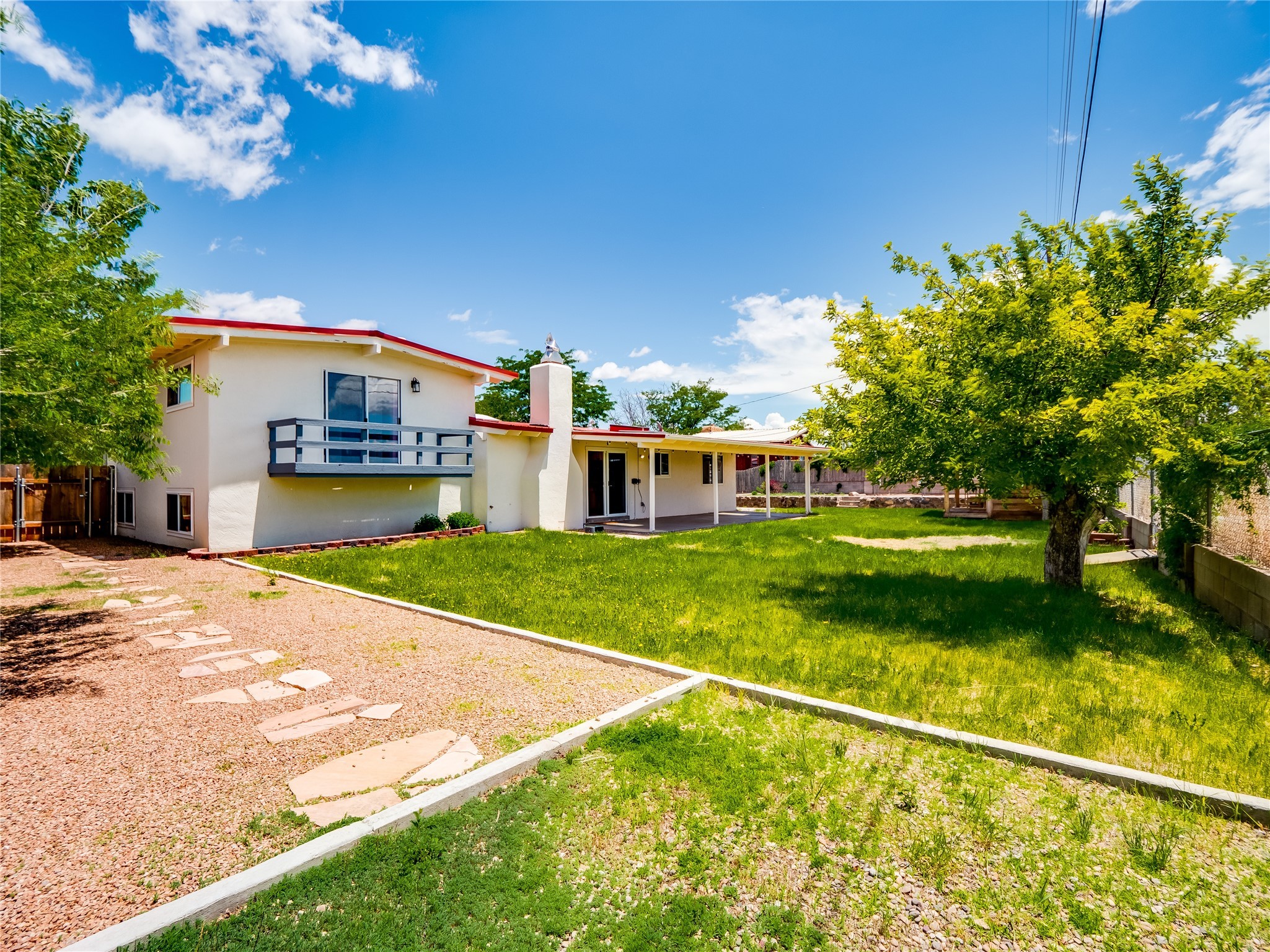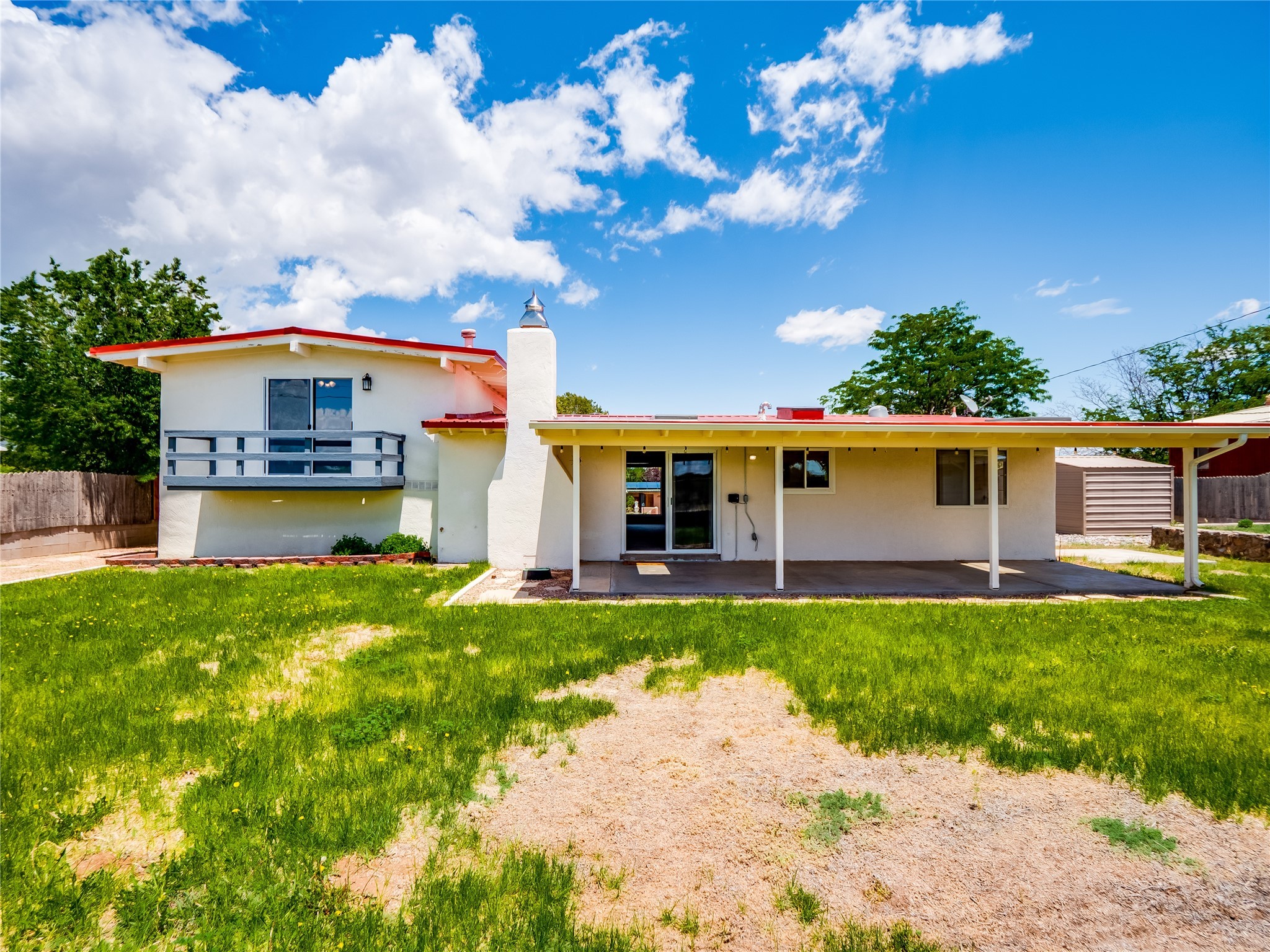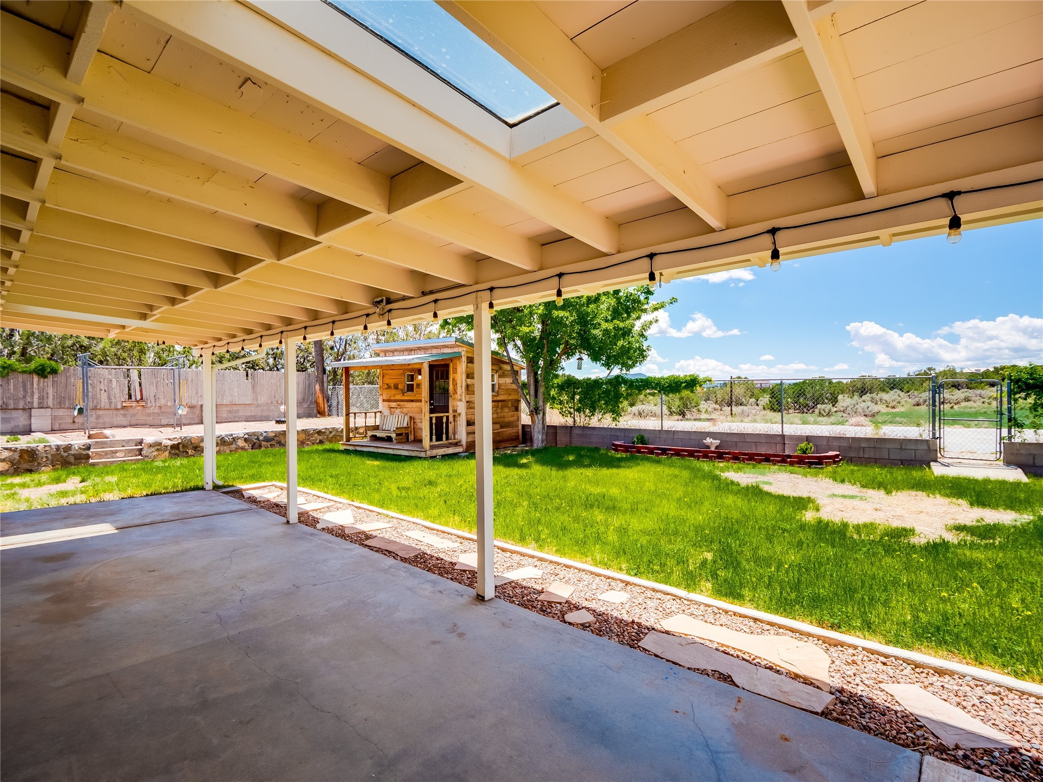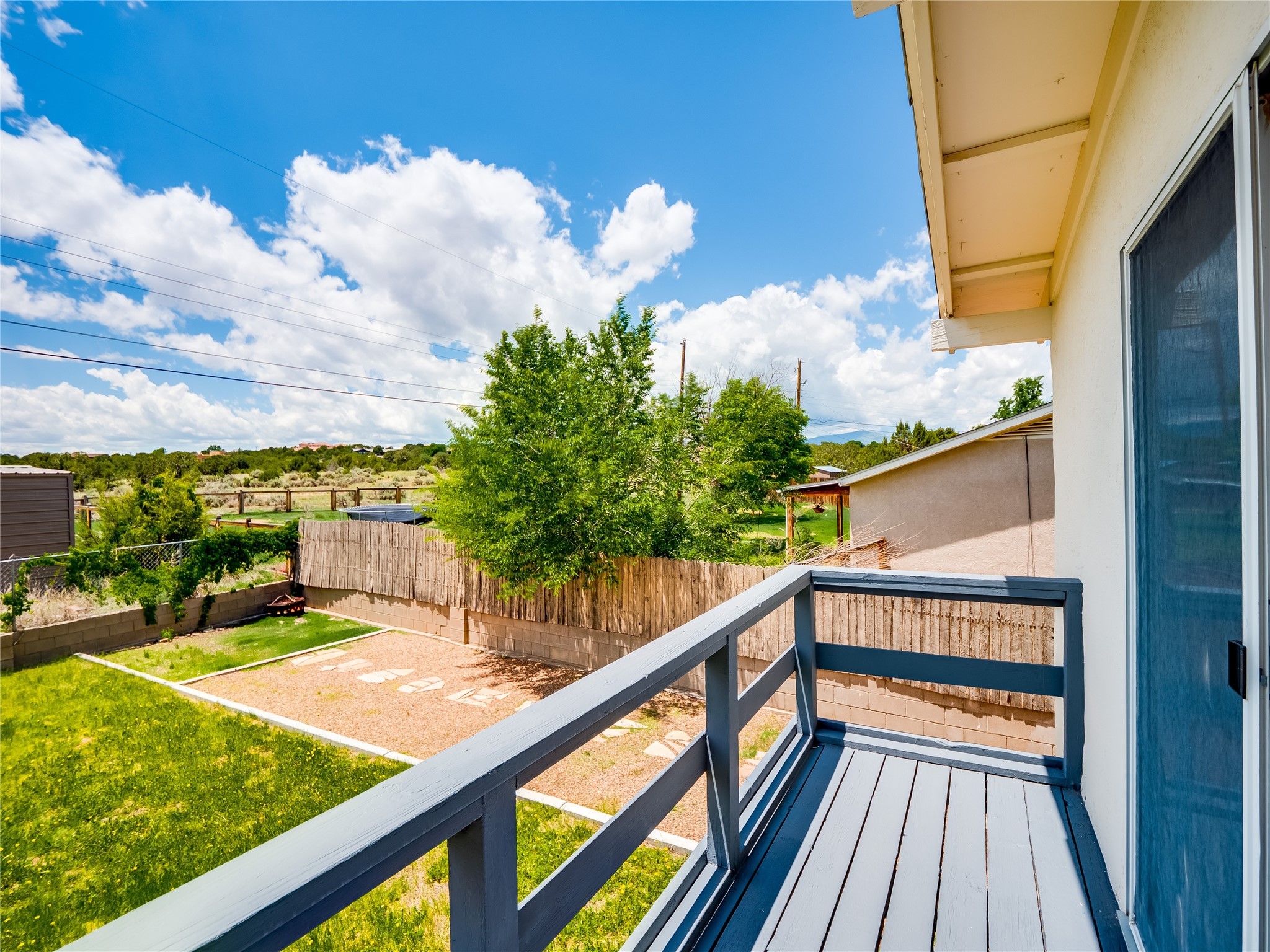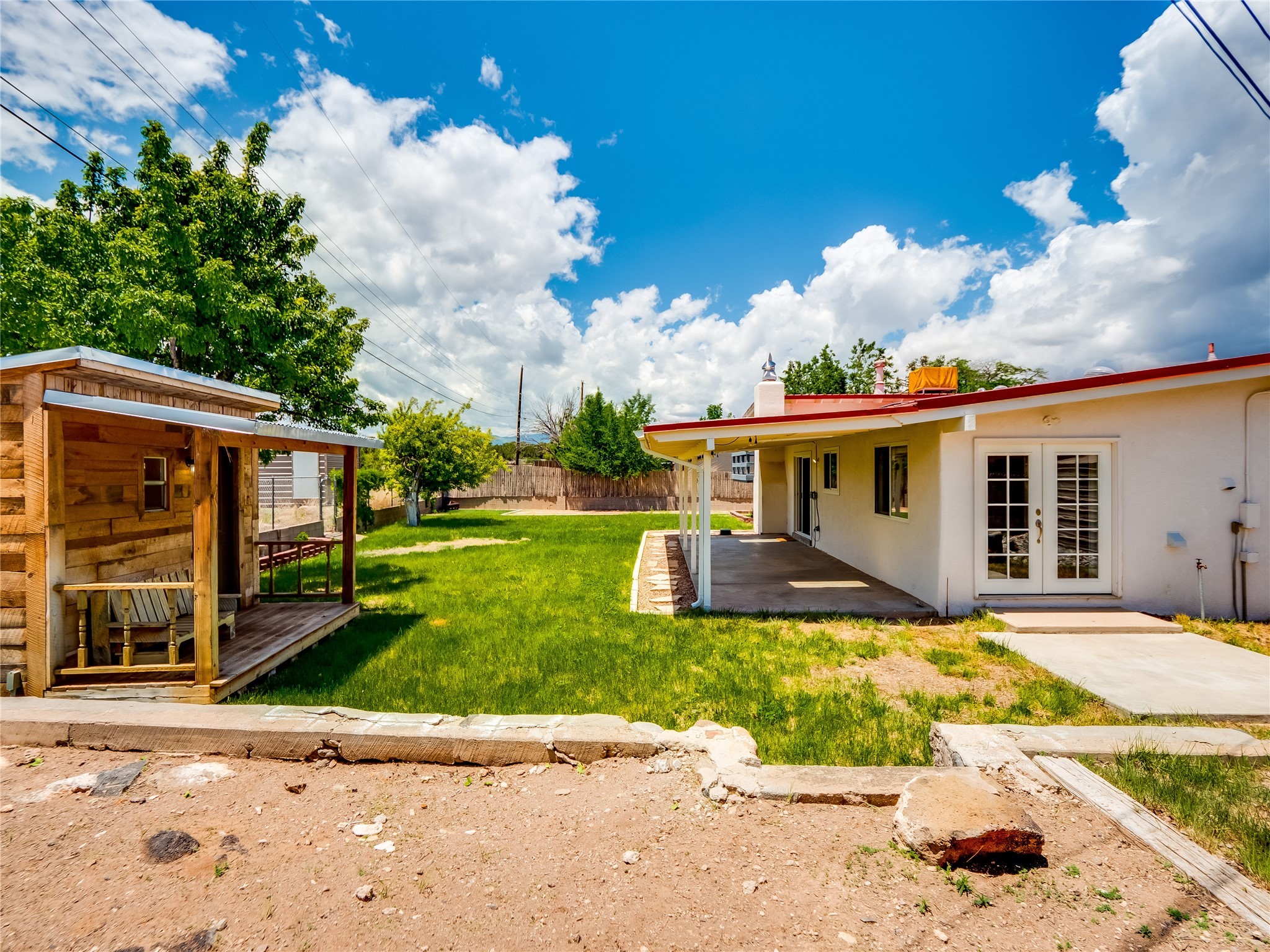Magnificent updated split level home on .4 acre lot in White Rock! Huge low maintenance front yard with stone retaining wall planters. Opened entryway with wood floors leads to the carpeted Living Room with a front facing picture window, a pellet Stove, wood burning fireplace with brick surround and sliding doors leading to the backyard. Off the Living Room is the galley style Kitchen with Beautiful wood cabinets with chrome hardware, granite counters, Wood floors, and a dining area with French doors leading to a side patio. From there you access the laundry room and a spacious Pantry with counters and shelving, and the two car garage. Downstairs is two large bedrooms and a bright and white bath with subway tile shower/tub, single sink vanity and tile flooring. Upstairs is another guest bedroom with a deck overlooking the backyard views and the large Primary Bedroom with doors leading to a deck with views of the Sangre de Cristo Mountains. There's a full guest bath with single sink vanity and tiled shower/tub that connects to the Primary bedroom. Supersized fenced in backyard with a covered patio, grass, retaining walls, a basketball court, two large outbuildings the larger one with a basement that has electric, And a little cabin bunk house with electric. With no structures behind, you can take full advantage of the open sky views and access to the many hiking trails and parks located just steps from your backyard. Fantastic modern home, this beauty wont last long!
