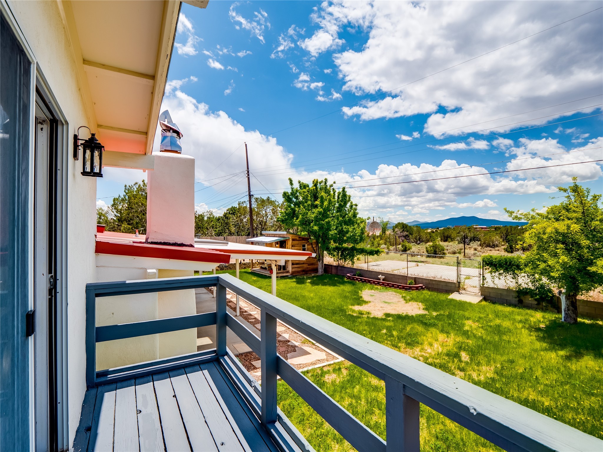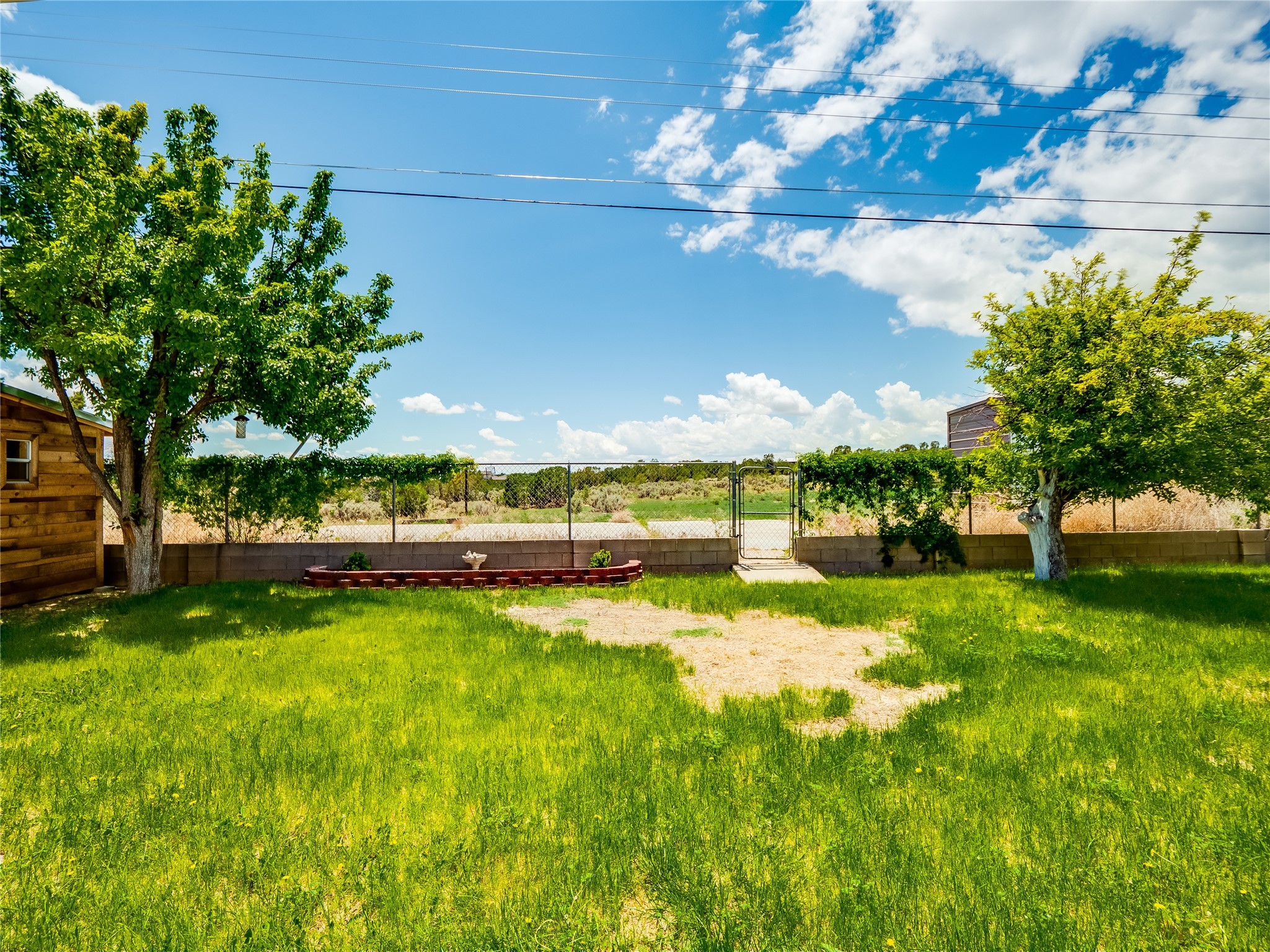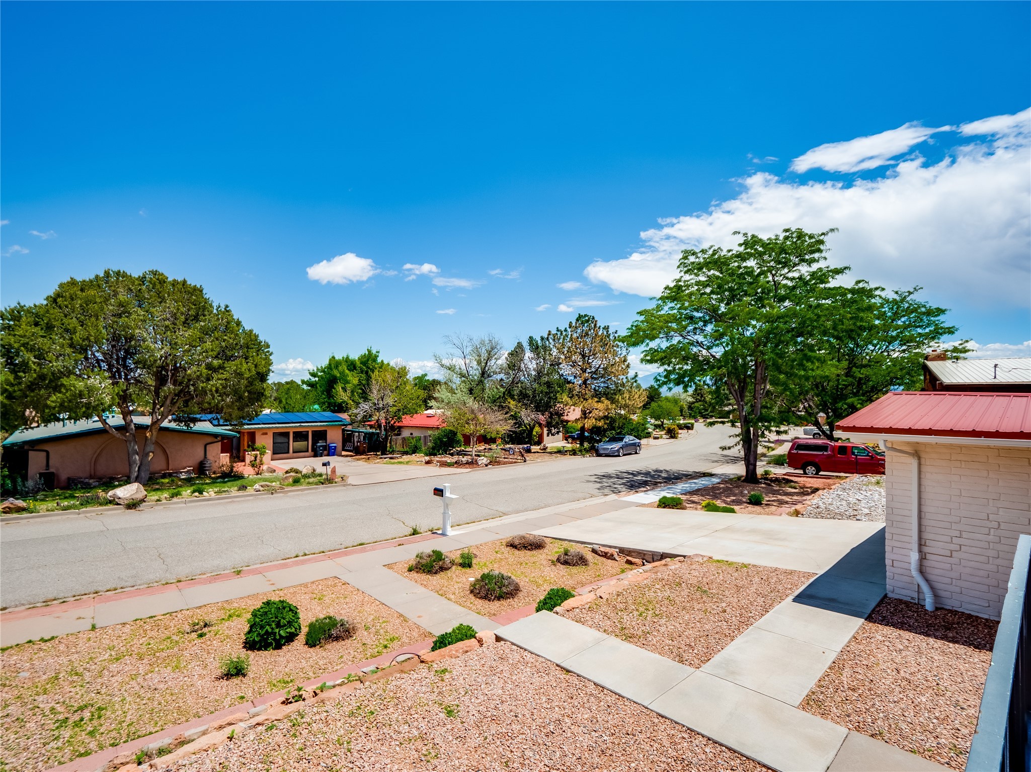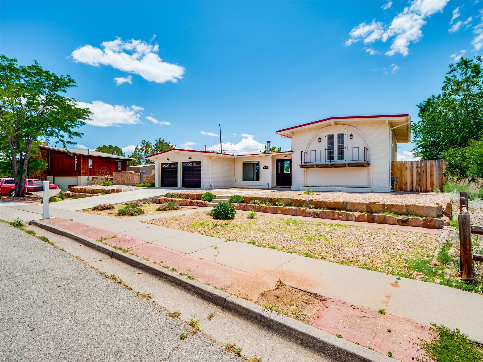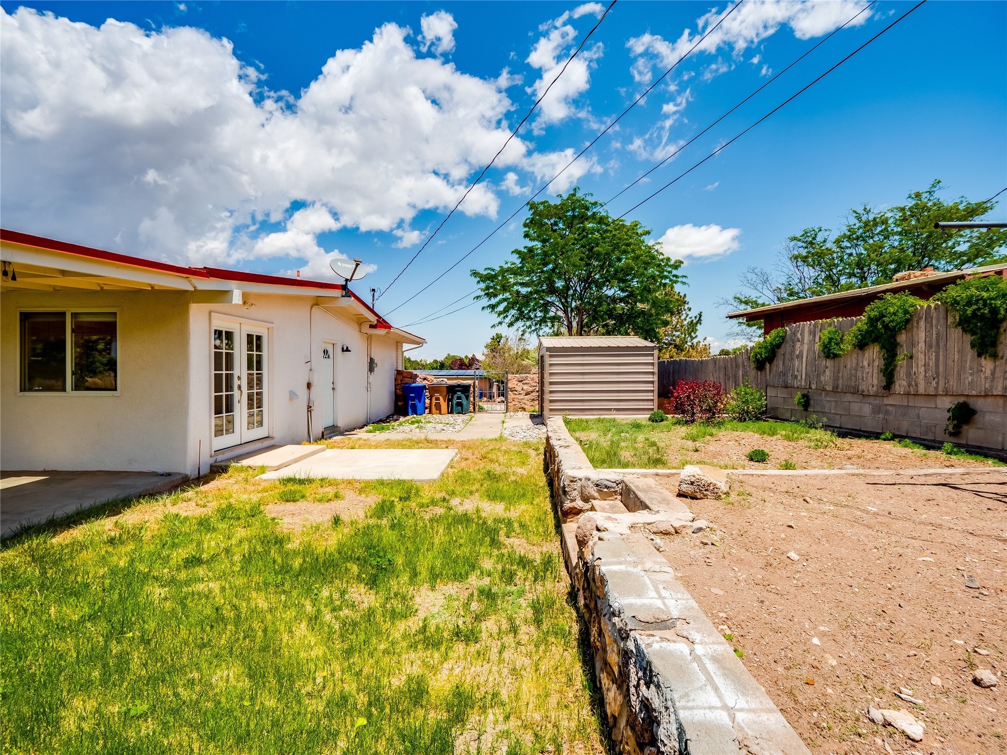 Magnificent updated split level home on .4 acre lot in White Rock! Huge low maintenance front yard with stone retaining wall planters. Opened entryway with wood floors leads to the carpeted Living Room with a front facing picture window, a pellet Stove, wood burning fireplace with brick surround and sliding doors leading to the backyard. Off the Living Room is the galley style Kitchen with Beautiful wood cabinets with chrome hardware, granite counters, Wood floors, and a dining area with French doors leading to a side patio. From there you access the laundry room and a spacious Pantry with counters and shelving, and the two car garage. Downstairs is two large bedrooms and a bright and white bath with subway tile shower/tub, single sink vanity and tile flooring. Upstairs is another guest bedroom with a deck overlooking the backyard views and the large Primary Bedroom with doors leading to a deck with views of the Sangre de Cristo Mountains. There's a full guest bath with single sink vanity and tiled shower/tub that connects to the Primary bedroom. Supersized fenced in backyard with a covered patio, grass, retaining walls, a basketball court, two large outbuildings the larger one with a basement that has electric, And a little cabin bunk house with electric. With no structures behind, you can take full advantage of the open sky views and access to the many hiking trails and parks located just steps from your backyard. Fantastic modern home, this beauty wont last long!