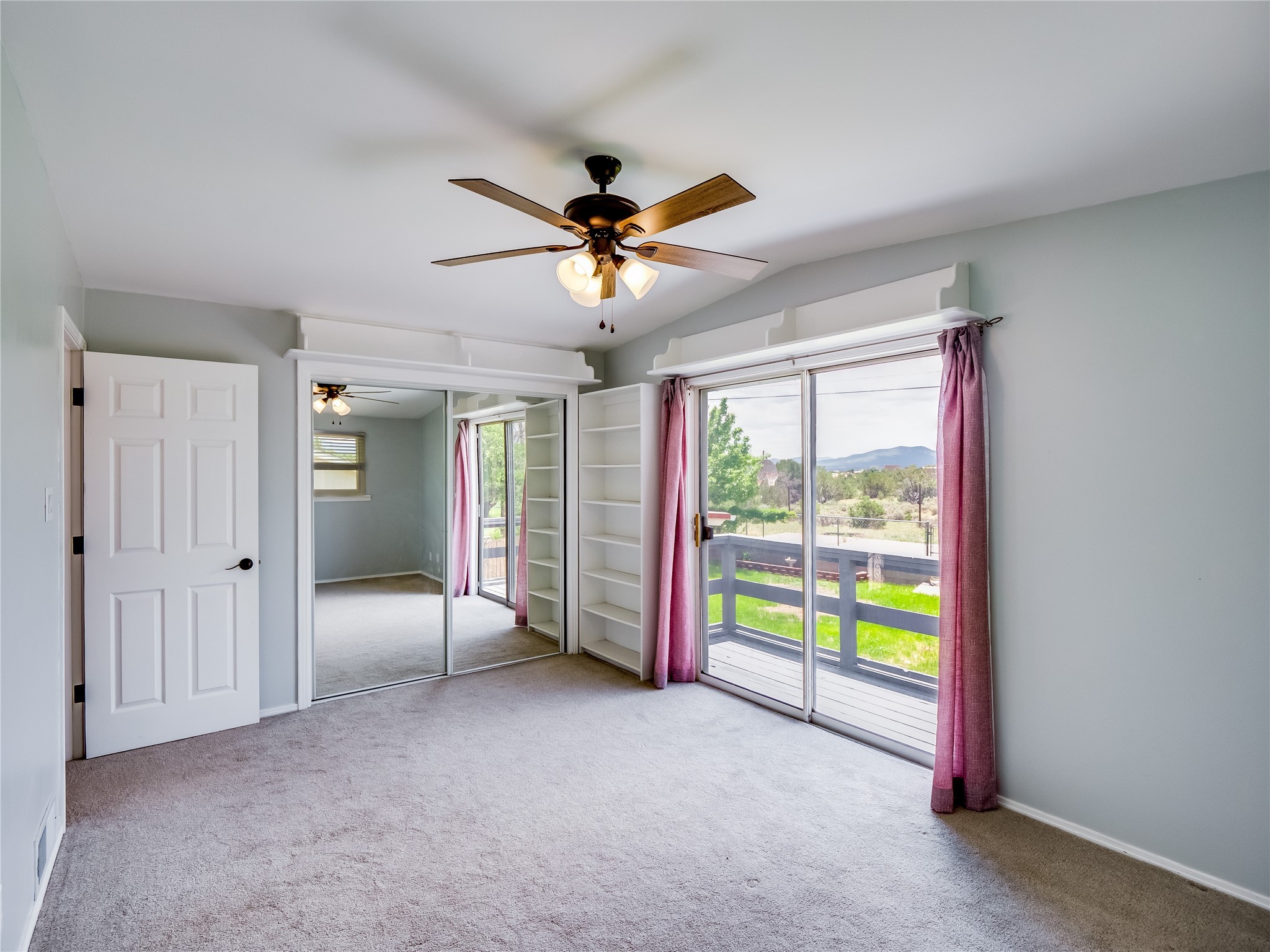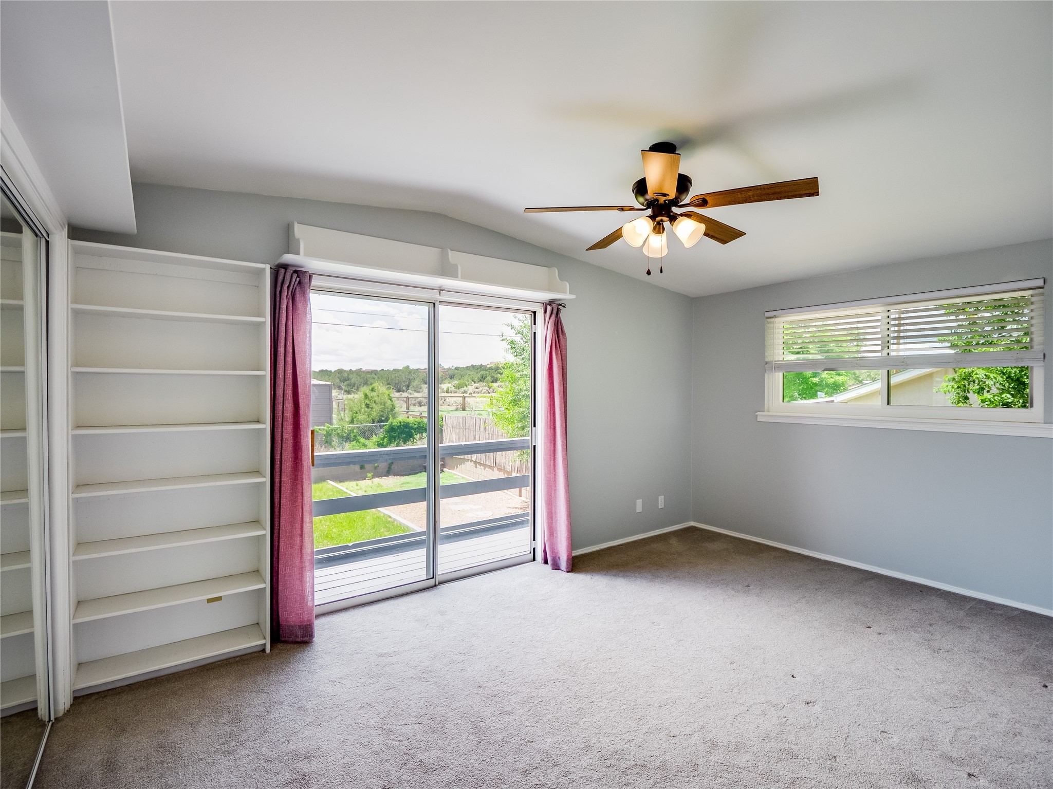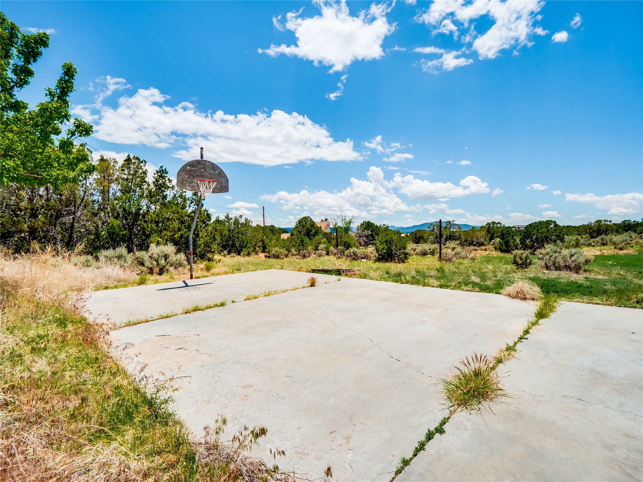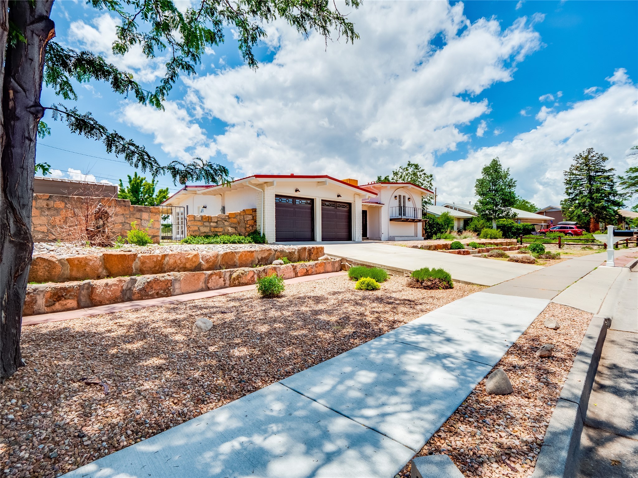 Magnificent updated split level home on .4 acre lot in White Rock! Huge low maintenance front yard with stone retaining wall planters. Opened entryway with wood floors leads to the carpeted Living Room with a front facing picture window, a pellet Stove, wood burning fireplace with brick surround and sliding doors leading to the backyard. Off the Living Room is the galley style Kitchen with Beautiful wood cabinets with chrome hardware, granite counters, Wood floors, and a dining area with French doors leading to a side patio. From there you access the laundry room and a spacious Pantry with counters and shelving, and the two car garage. Downstairs is two large bedrooms and a bright and white bath with subway tile shower/tub, single sink vanity and tile flooring. Upstairs is another guest bedroom with a deck overlooking the backyard views and the large Primary Bedroom with doors leading to a deck with views of the Sangre de Cristo Mountains. There's a full guest bath with single sink vanity and tiled shower/tub that connects to the Primary bedroom. Supersized fenced in backyard with a covered patio, grass, retaining walls, a basketball court, two large outbuildings the larger one with a basement that has electric, And a little cabin bunk house with electric. With no structures behind, you can take full advantage of the open sky views and access to the many hiking trails and parks located just steps from your backyard. Fantastic modern home, this beauty wont last long!