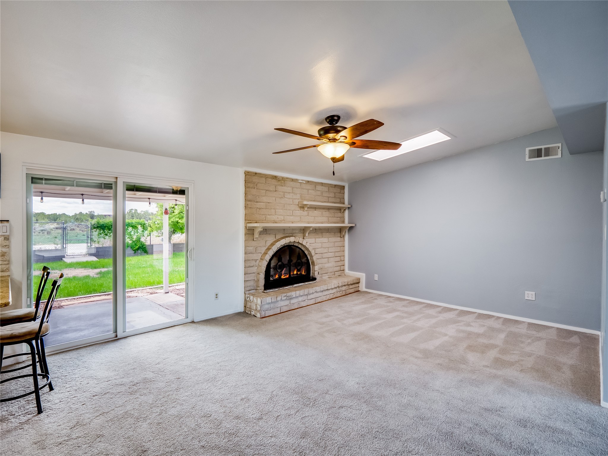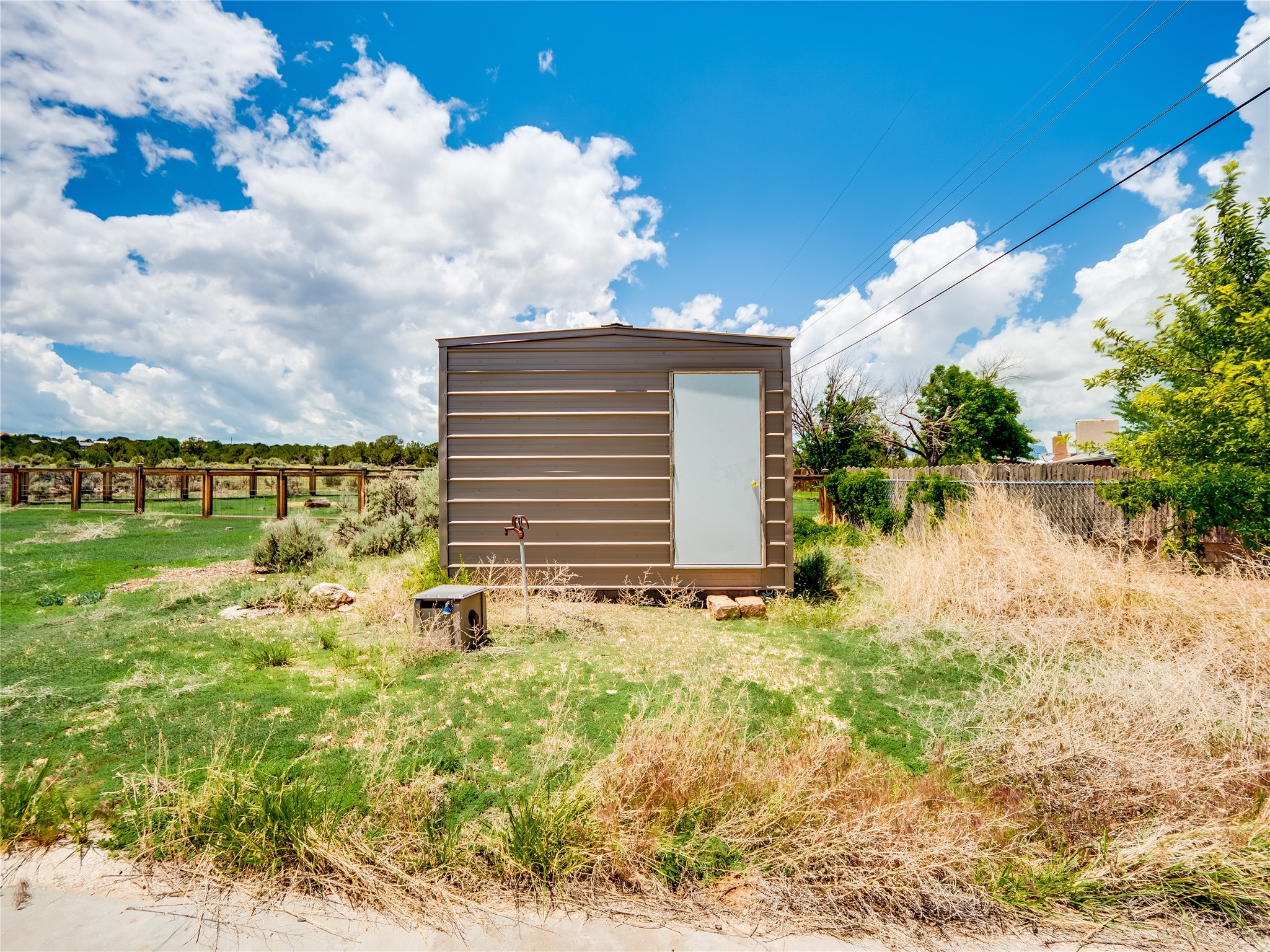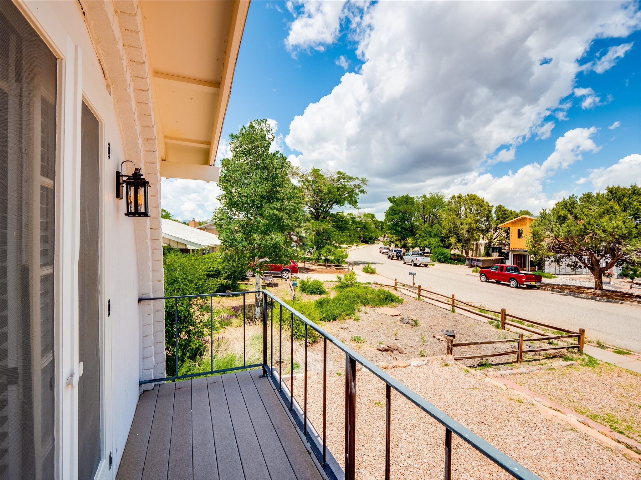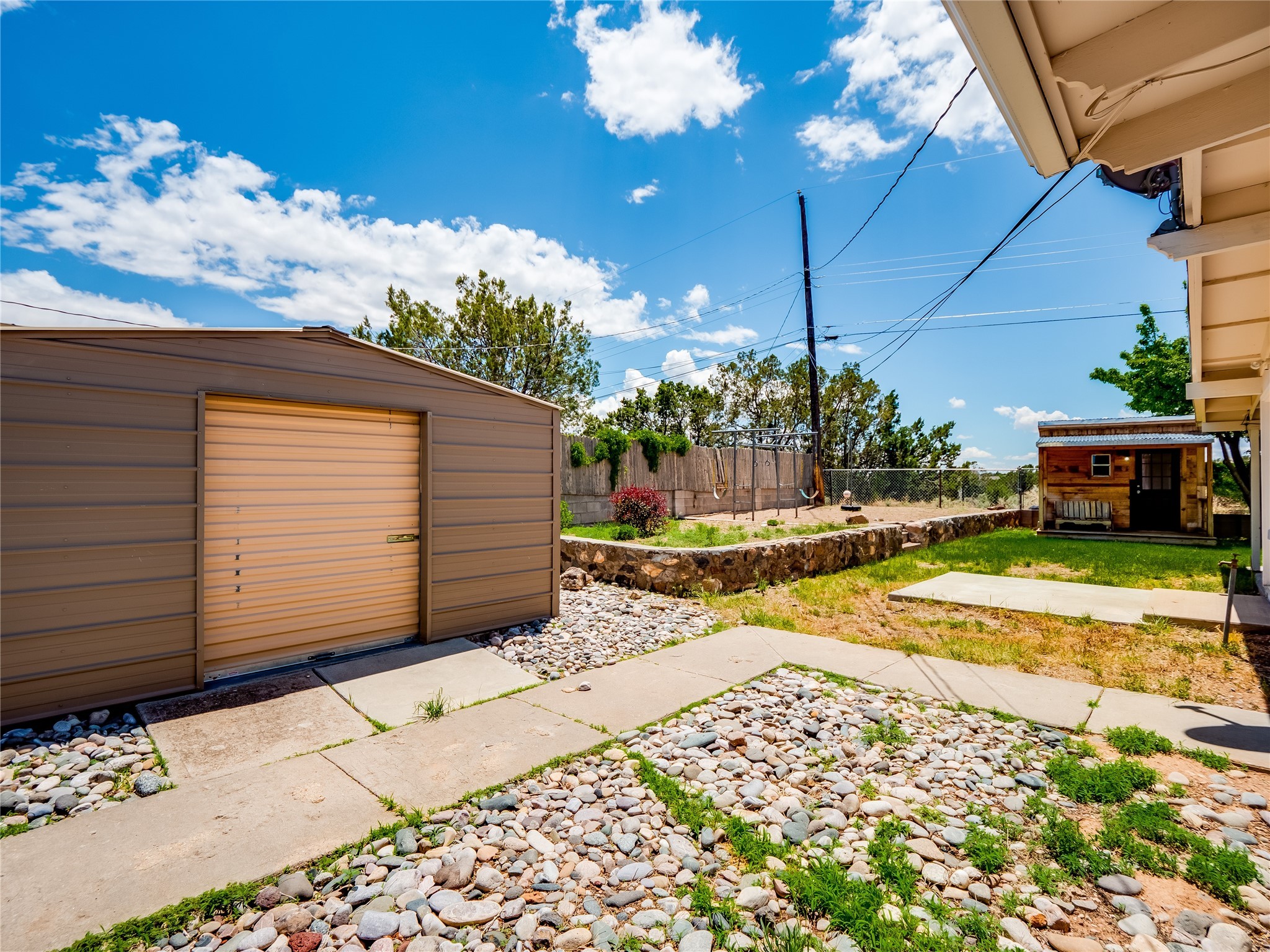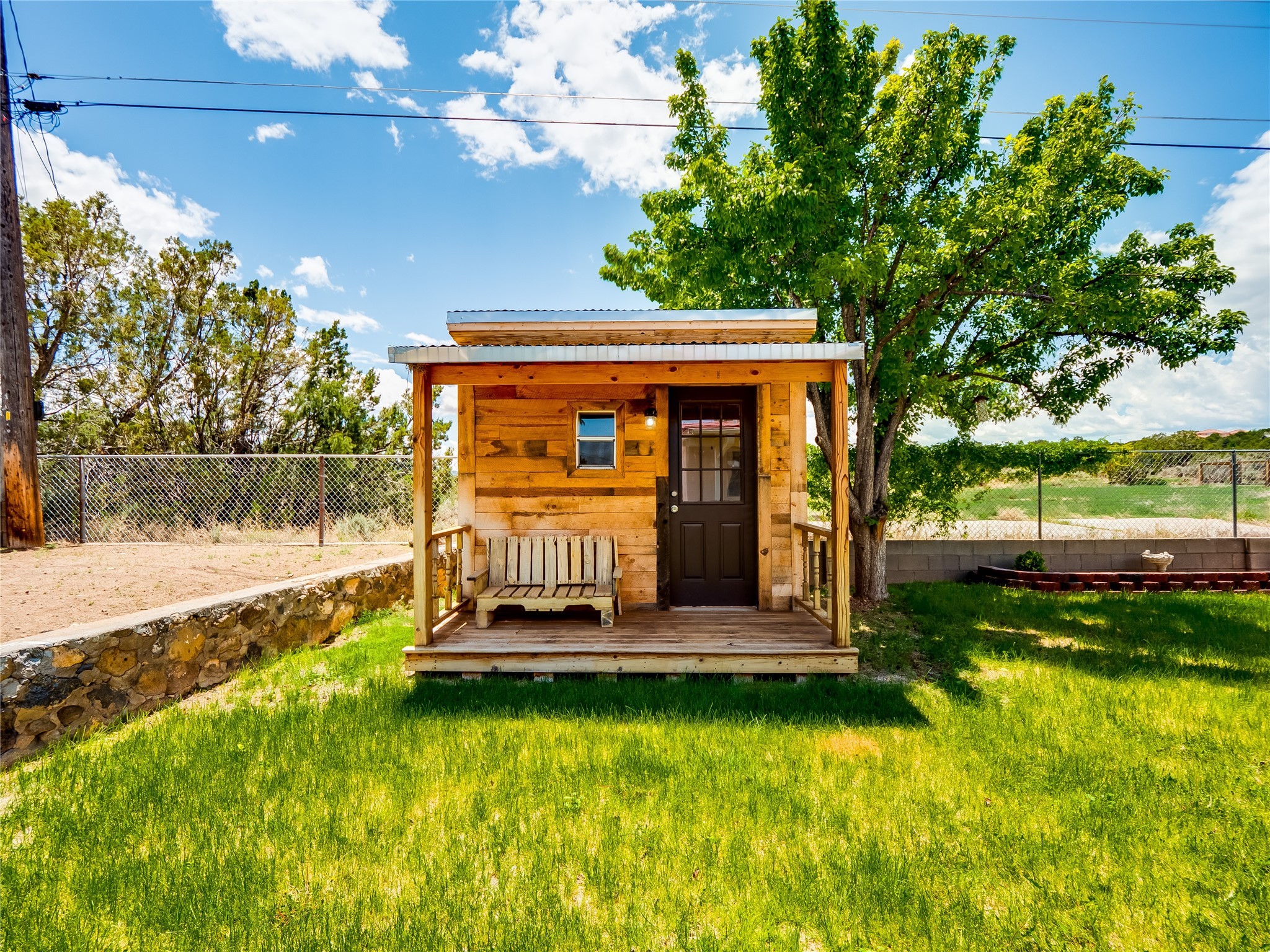 Magnificent updated split level home on .4 acre lot in White Rock! Huge low maintenance front yard with stone retaining wall planters. Opened entryway with wood floors leads to the carpeted Living Room with a front facing picture window, a pellet Stove, wood burning fireplace with brick surround and sliding doors leading to the backyard. Off the Living Room is the galley style Kitchen with Beautiful wood cabinets with chrome hardware, granite counters, Wood floors, and a dining area with French doors leading to a side patio. From there you access the laundry room and a spacious Pantry with counters and shelving, and the two car garage. Downstairs is two large bedrooms and a bright and white bath with subway tile shower/tub, single sink vanity and tile flooring. Upstairs is another guest bedroom with a deck overlooking the backyard views and the large Primary Bedroom with doors leading to a deck with views of the Sangre de Cristo Mountains. There's a full guest bath with single sink vanity and tiled shower/tub that connects to the Primary bedroom. Supersized fenced in backyard with a covered patio, grass, retaining walls, a basketball court, two large outbuildings the larger one with a basement that has electric, And a little cabin bunk house with electric. With no structures behind, you can take full advantage of the open sky views and access to the many hiking trails and parks located just steps from your backyard. Fantastic modern home, this beauty wont last long!
