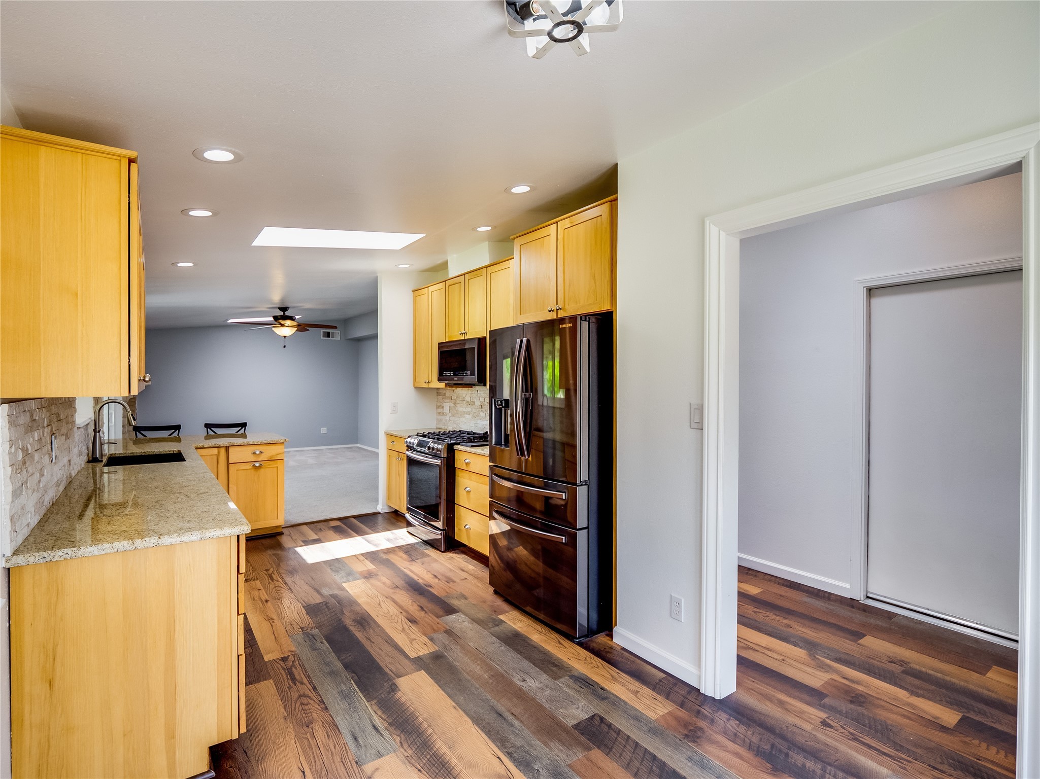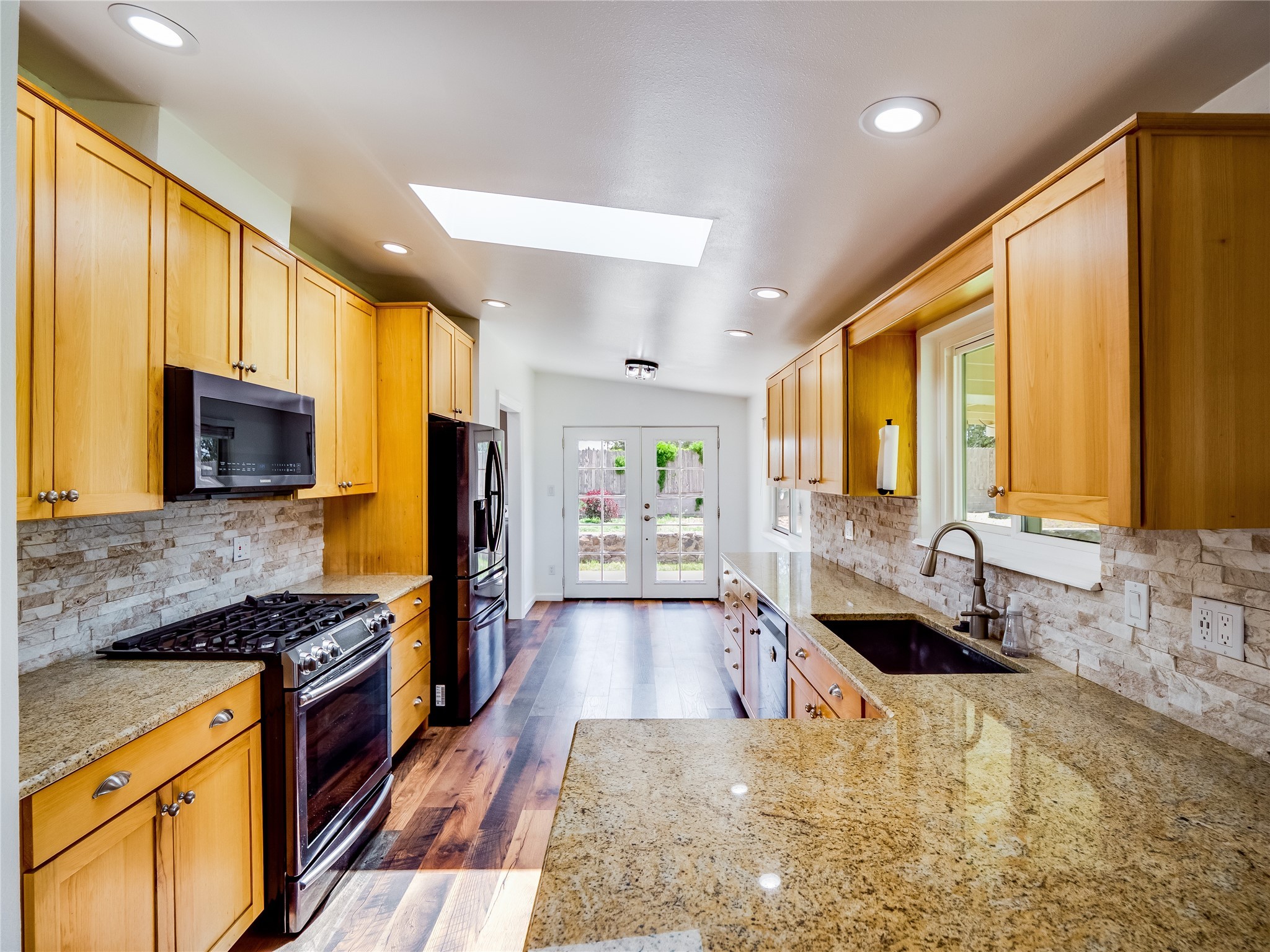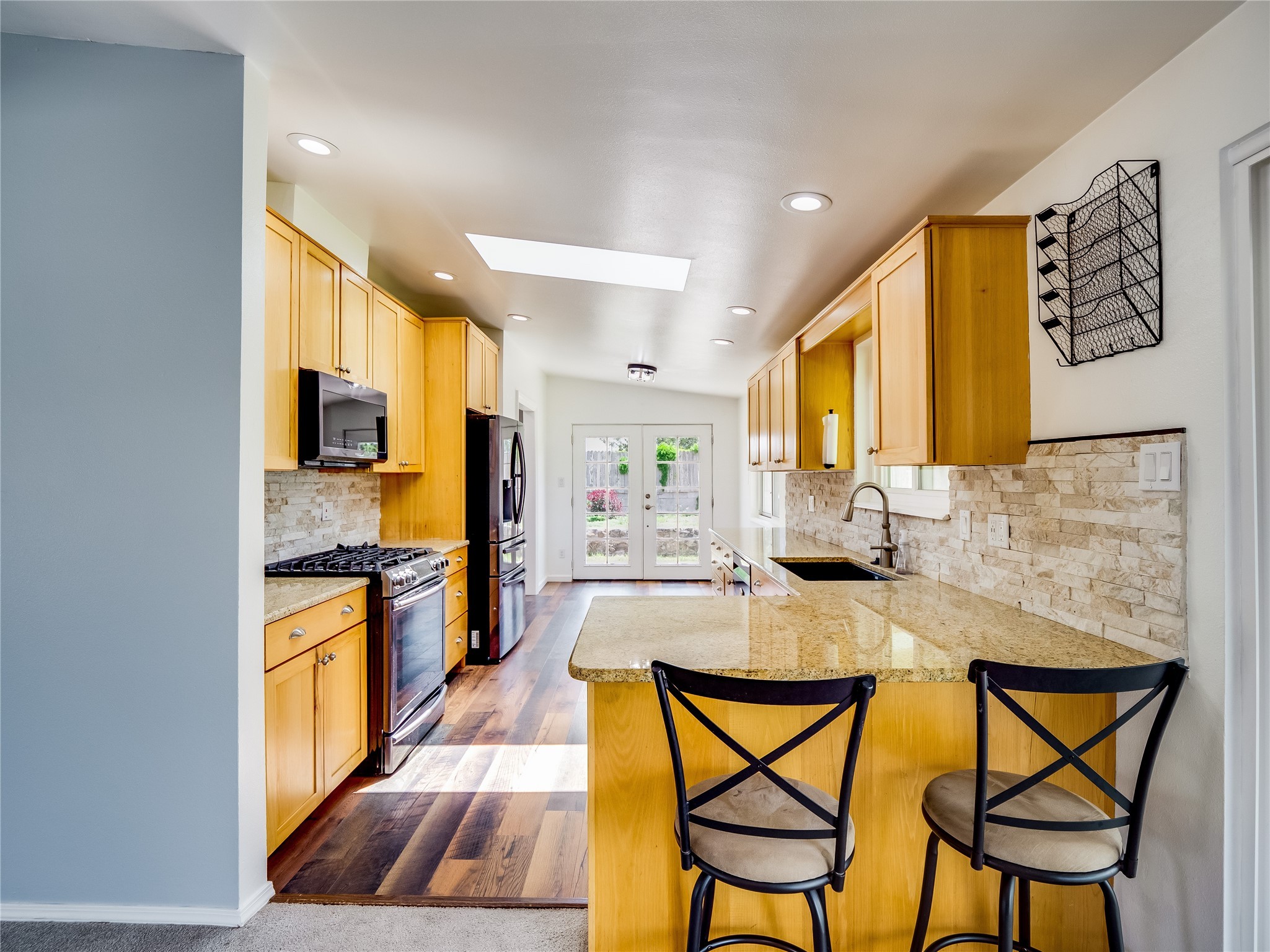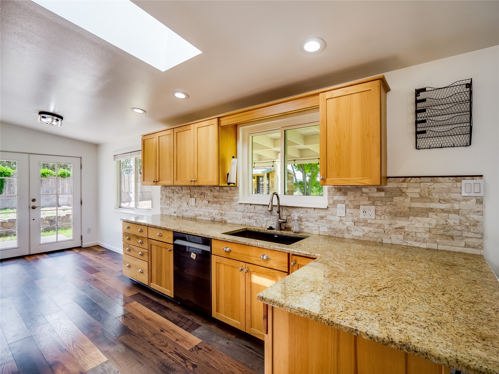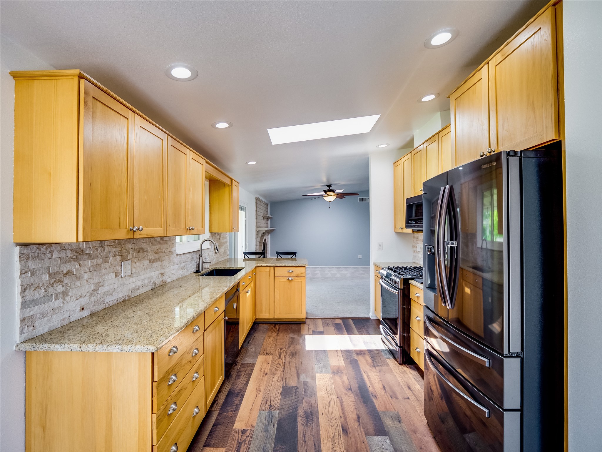 Magnificent updated split level home on .4 acre lot in White Rock! Huge low maintenance front yard with stone retaining wall planters. Opened entryway with wood floors leads to the carpeted Living Room with a front facing picture window, a pellet Stove, wood burning fireplace with brick surround and sliding doors leading to the backyard. Off the Living Room is the galley style Kitchen with Beautiful wood cabinets with chrome hardware, granite counters, Wood floors, and a dining area with French doors leading to a side patio. From there you access the laundry room and a spacious Pantry with counters and shelving, and the two car garage. Downstairs is two large bedrooms and a bright and white bath with subway tile shower/tub, single sink vanity and tile flooring. Upstairs is another guest bedroom with a deck overlooking the backyard views and the large Primary Bedroom with doors leading to a deck with views of the Sangre de Cristo Mountains. There's a full guest bath with single sink vanity and tiled shower/tub that connects to the Primary bedroom. Supersized fenced in backyard with a covered patio, grass, retaining walls, a basketball court, two large outbuildings the larger one with a basement that has electric, And a little cabin bunk house with electric. With no structures behind, you can take full advantage of the open sky views and access to the many hiking trails and parks located just steps from your backyard. Fantastic modern home, this beauty wont last long!