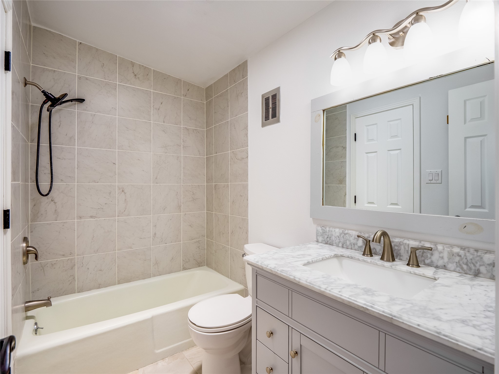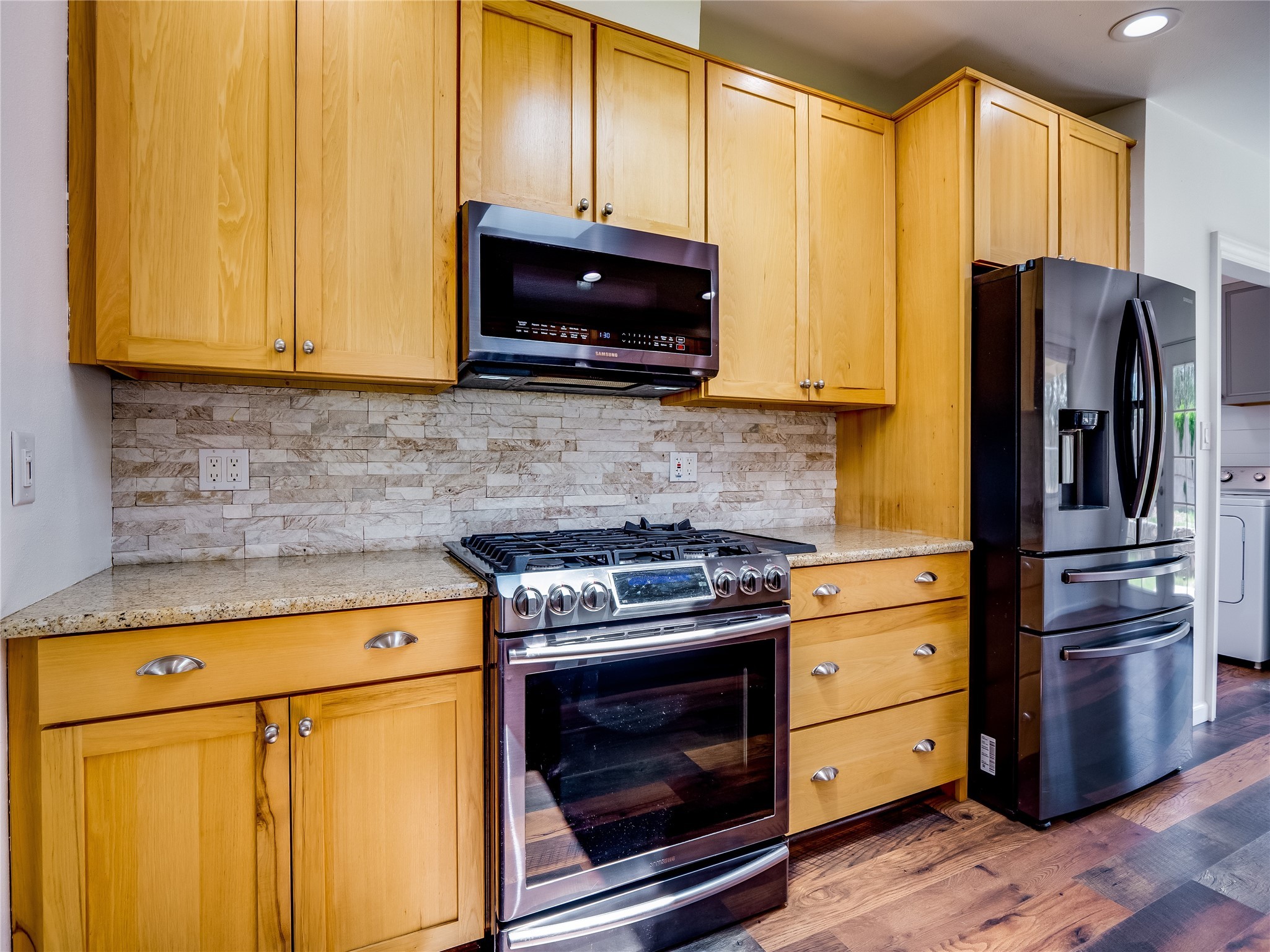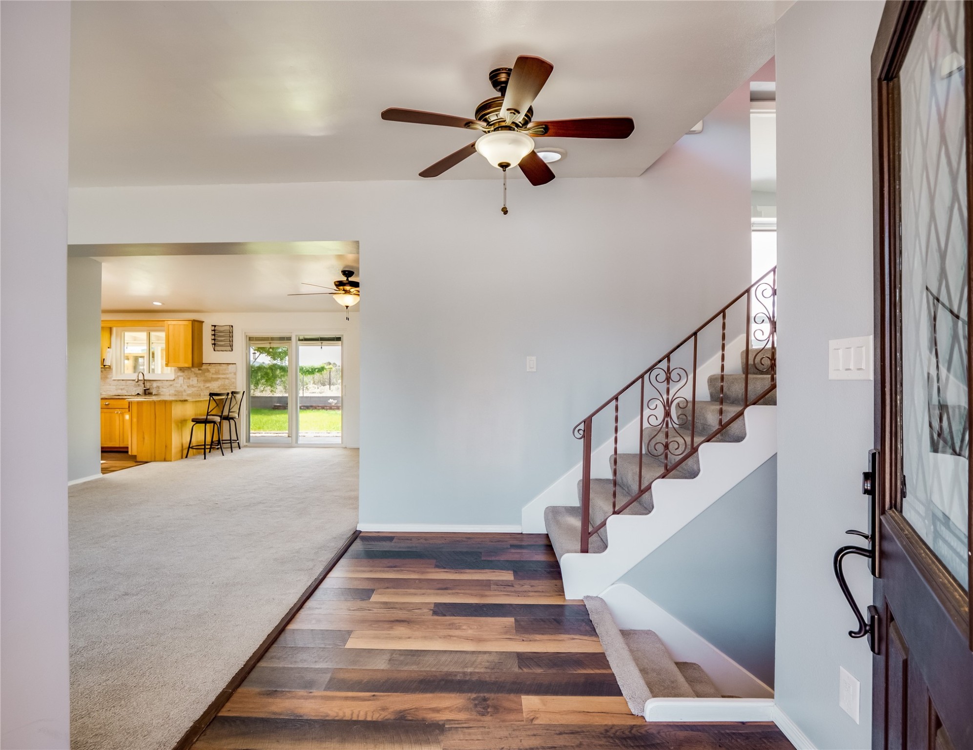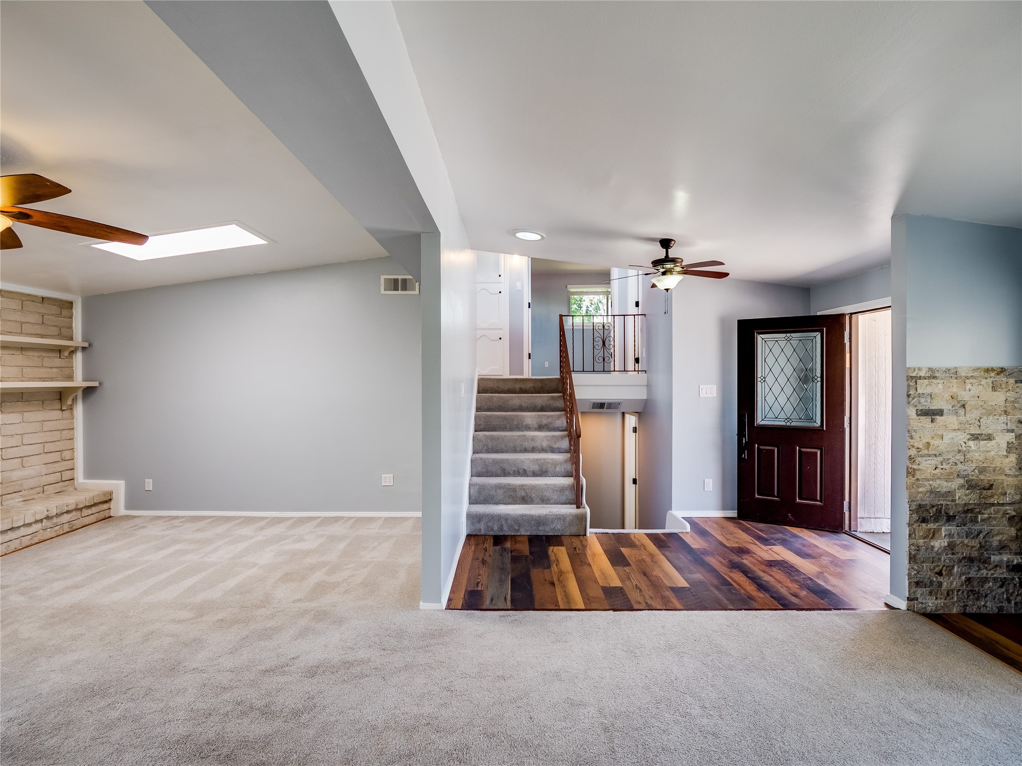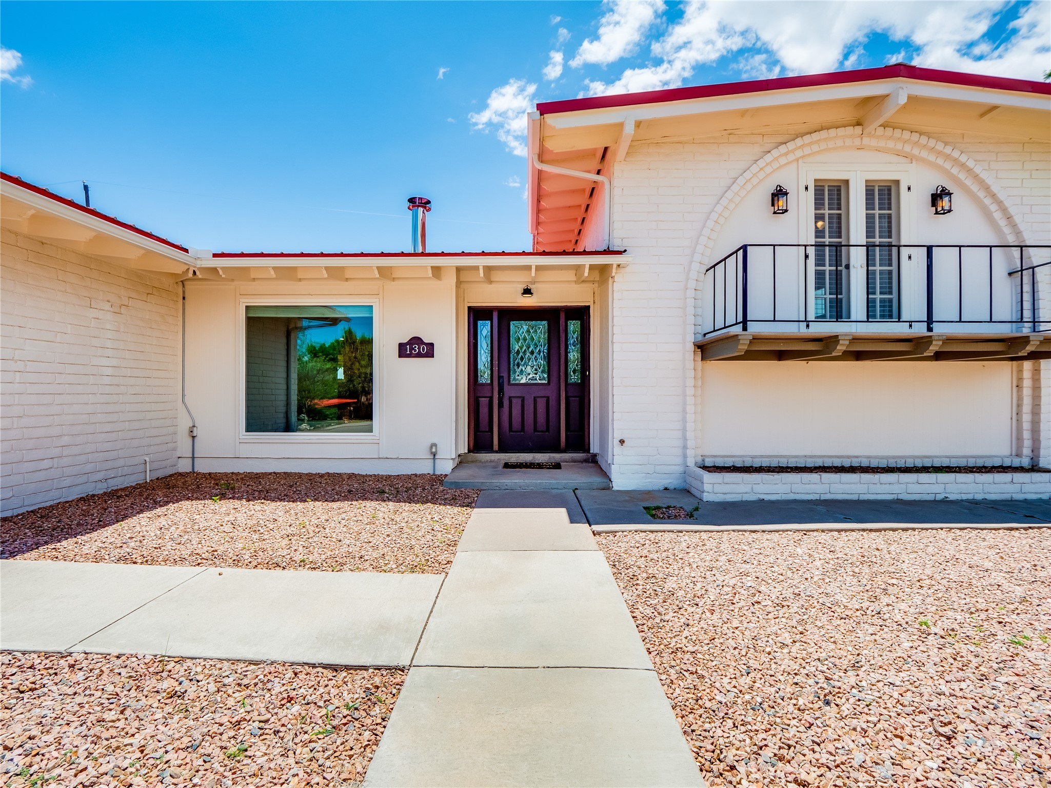 Magnificent updated split level home on .4 acre lot in White Rock! Huge low maintenance front yard with stone retaining wall planters. Opened entryway with wood floors leads to the carpeted Living Room with a front facing picture window, a pellet Stove, wood burning fireplace with brick surround and sliding doors leading to the backyard. Off the Living Room is the galley style Kitchen with Beautiful wood cabinets with chrome hardware, granite counters, Wood floors, and a dining area with French doors leading to a side patio. From there you access the laundry room and a spacious Pantry with counters and shelving, and the two car garage. Downstairs is two large bedrooms and a bright and white bath with subway tile shower/tub, single sink vanity and tile flooring. Upstairs is another guest bedroom with a deck overlooking the backyard views and the large Primary Bedroom with doors leading to a deck with views of the Sangre de Cristo Mountains. There's a full guest bath with single sink vanity and tiled shower/tub that connects to the Primary bedroom. Supersized fenced in backyard with a covered patio, grass, retaining walls, a basketball court, two large outbuildings the larger one with a basement that has electric, And a little cabin bunk house with electric. With no structures behind, you can take full advantage of the open sky views and access to the many hiking trails and parks located just steps from your backyard. Fantastic modern home, this beauty wont last long!