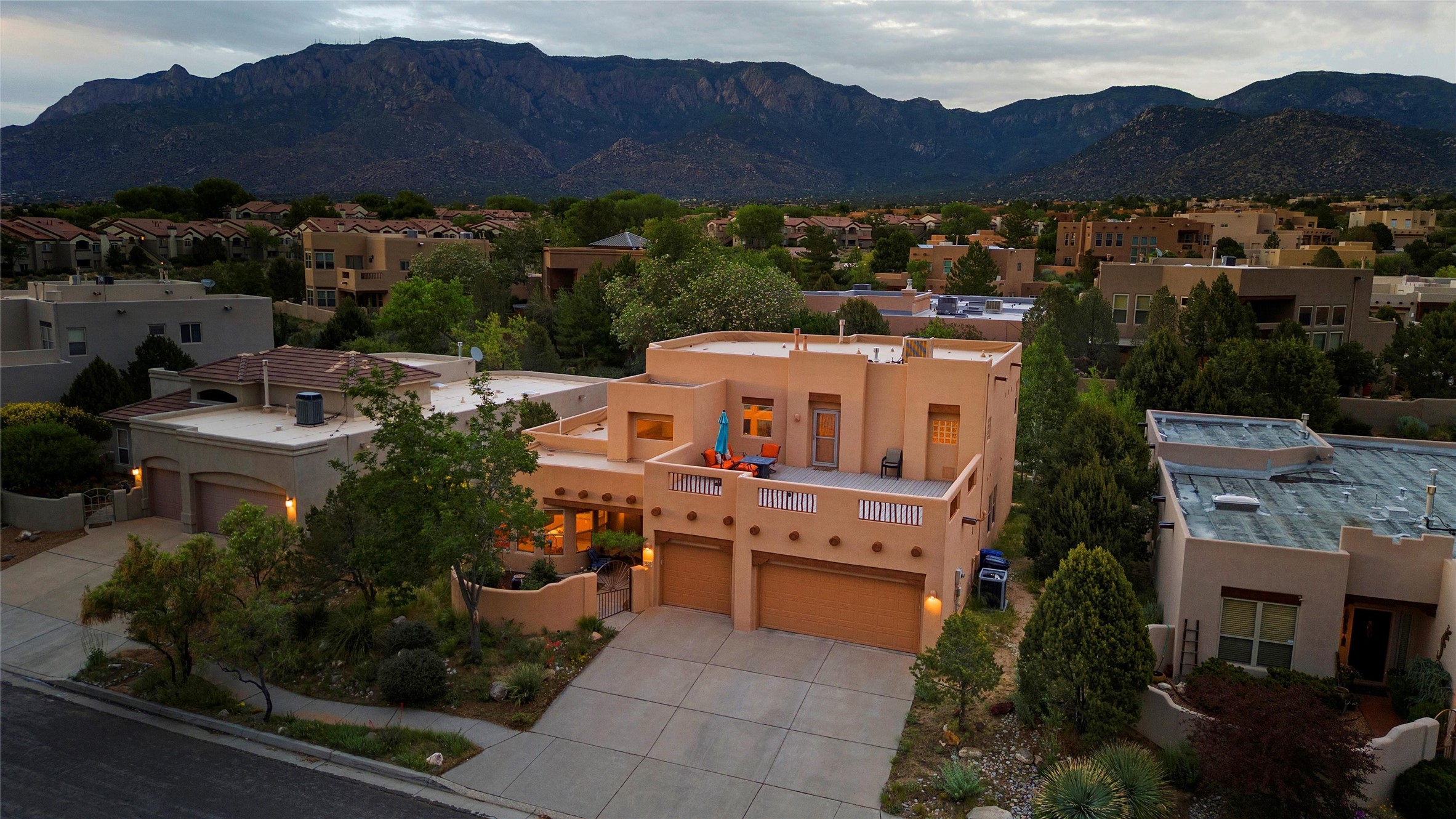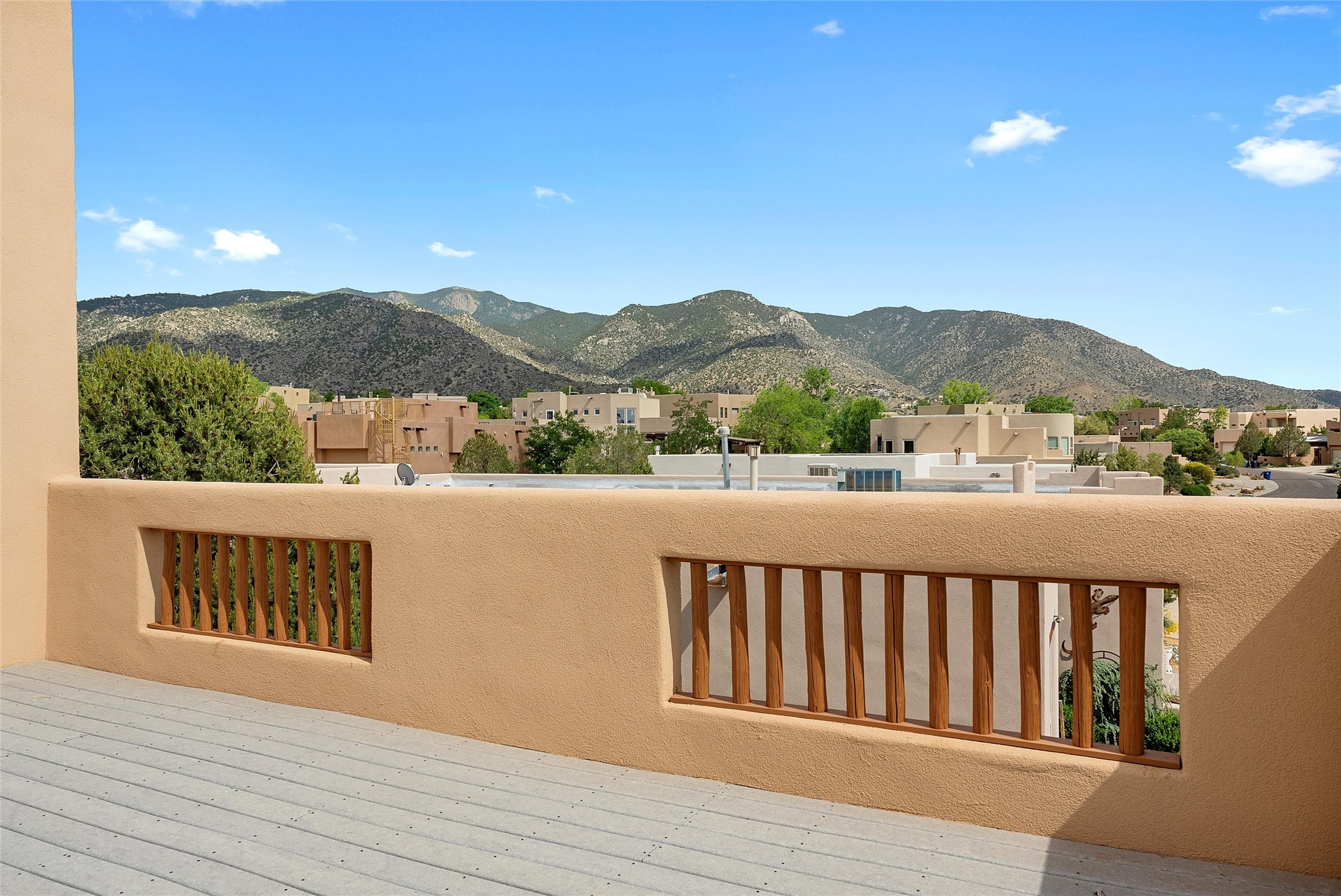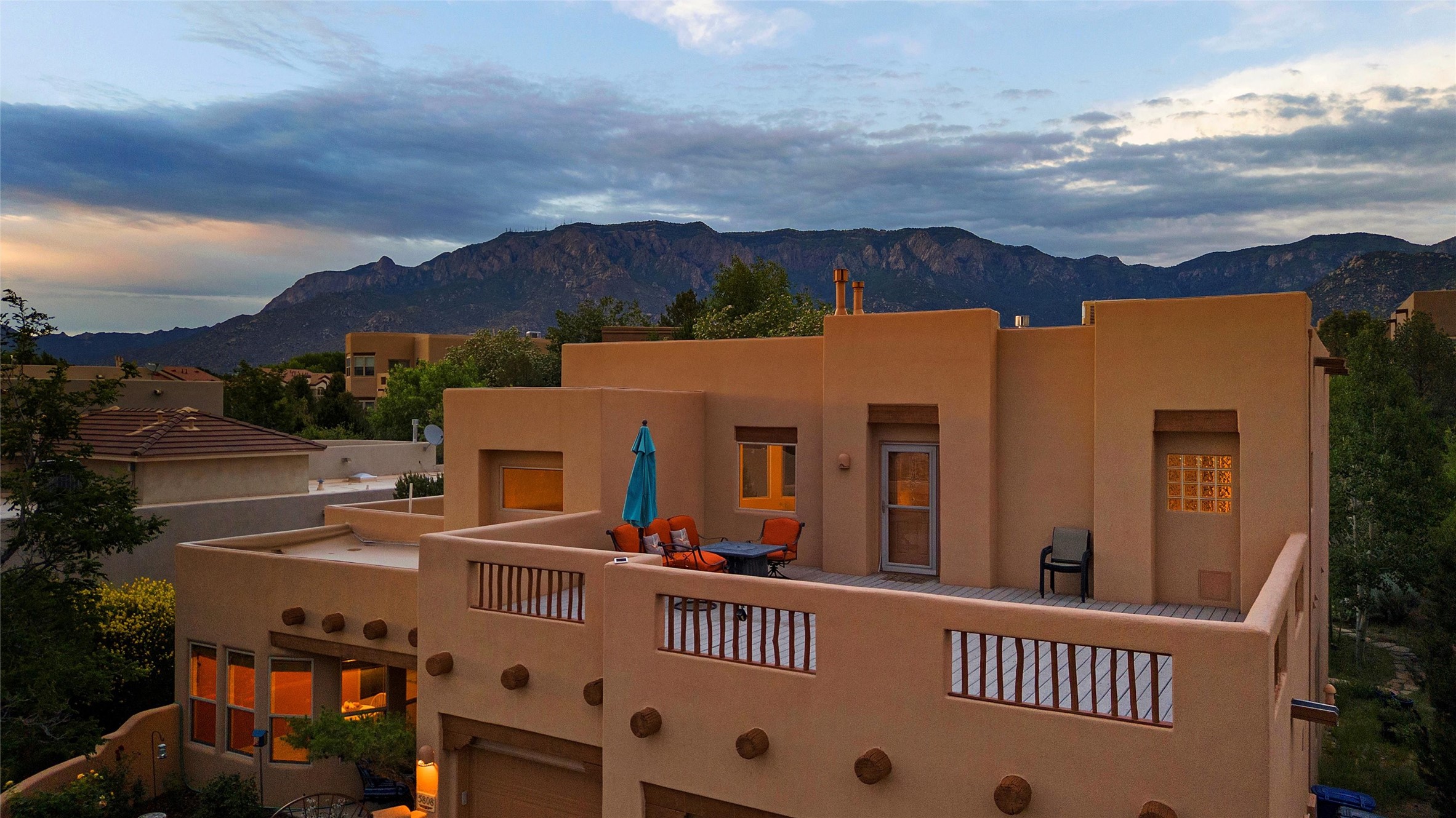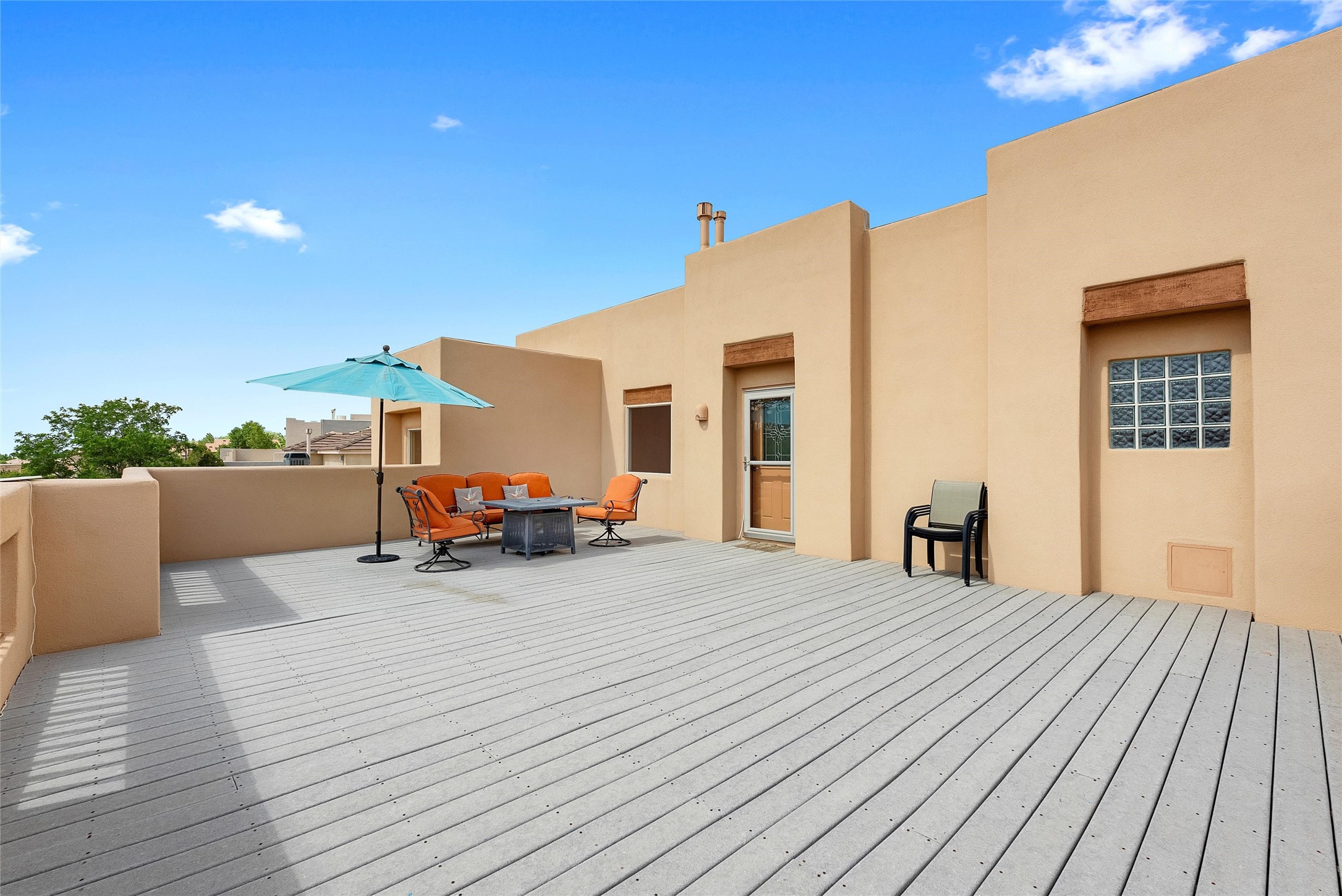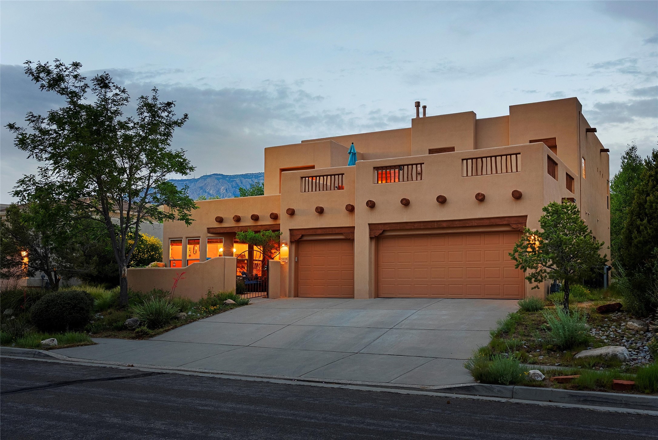 Tucked away on a no-through street, in the coveted Solterra at High Desert community, this serene sanctuary offers a rare blend of comfort and elegance. Passing through the peaceful courtyard into the home you are welcomed with Brazilian cherry wood floors, soaring cathedral ceilings, and a dramatic wall of windows that flood the living space with natural light. The entire top floor is dedicated to the comfort and enjoyment of the primary residents - with a spacious bedroom that includes a reading nook or office, a luxurious bath, and an organized closet space. Opposite the bedroom is a stunning balcony with mountain views and a peek of the city, ideal for sunrise coffee, intimate stargazing, or inviting friends up to watch fireworks or balloons. One of the three downstairs bedrooms has an ensuite bath and separate entrance - perfect for guests or multi-generational living. The kitchen and living areas flow seamlessly into a beautifully landscaped backyard with a water feature --an ideal spot for outdoor dining or quiet reflection. With a 3-car garage, an oversized under-stair closet, and thoughtful upgrades like a whole house humidifier, NUVO water softener, and TPO roof, this home balances beauty and practicality in a premier Albuquerque neighborhood.