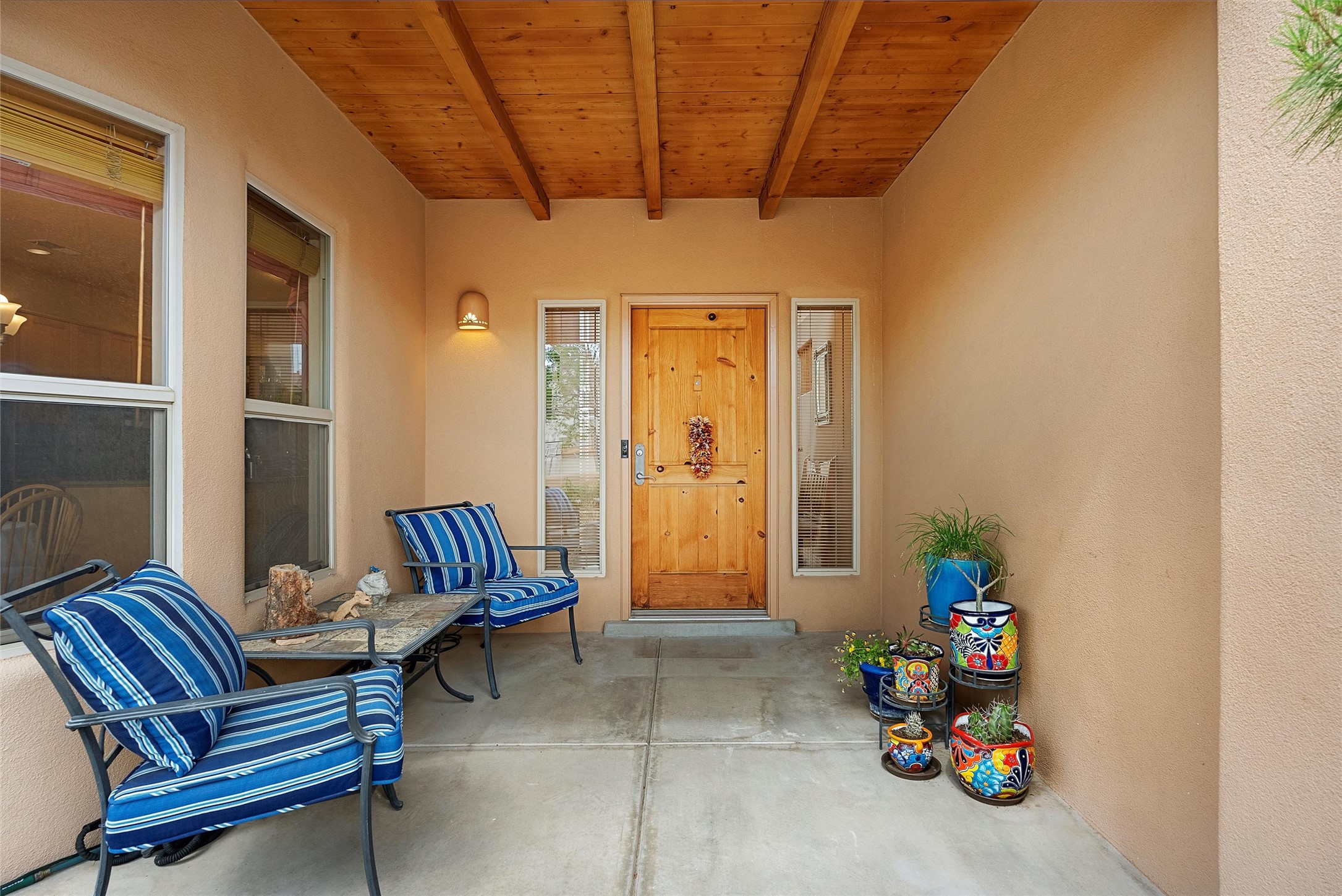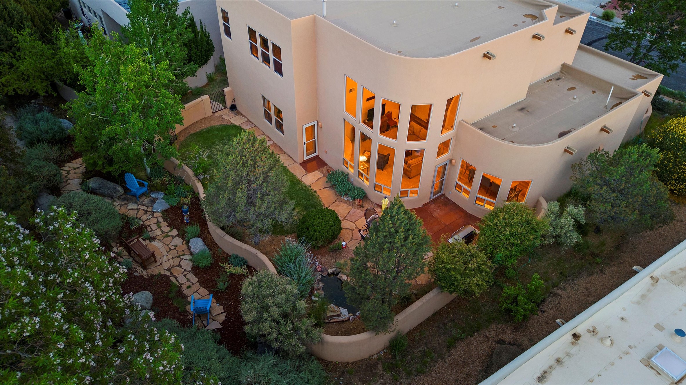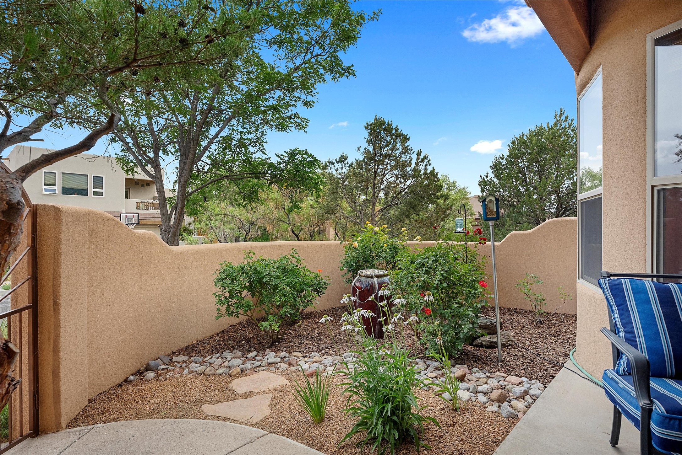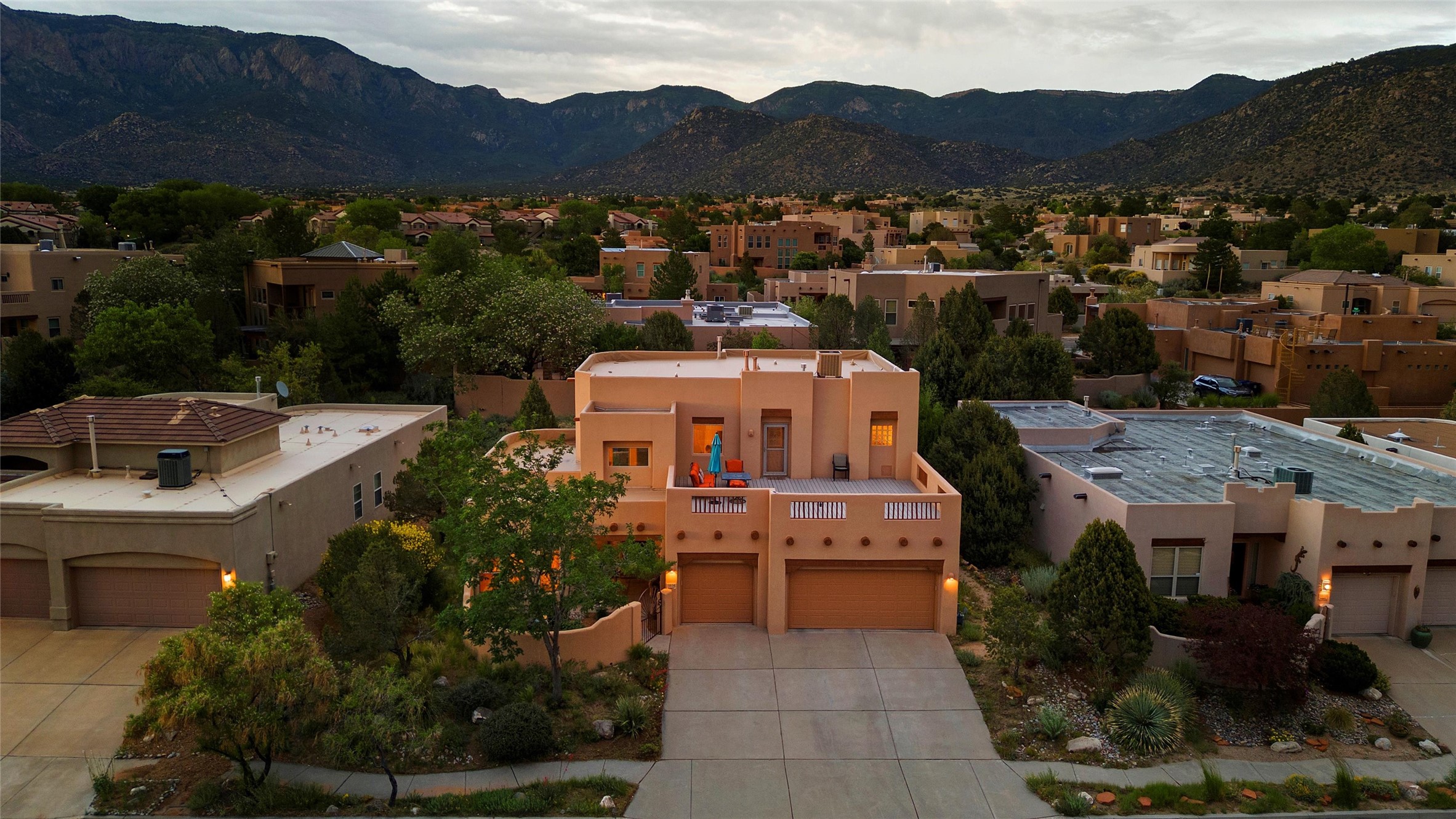 Tucked away on a no-through street, in the coveted Solterra at High Desert community, this serene sanctuary offers a rare blend of comfort and elegance. Passing through the peaceful courtyard into the home you are welcomed with Brazilian cherry wood floors, soaring cathedral ceilings, and a dramatic wall of windows that flood the living space with natural light. The entire top floor is dedicated to the comfort and enjoyment of the primary residents - with a spacious bedroom that includes a reading nook or office, a luxurious bath, and an organized closet space. Opposite the bedroom is a stunning balcony with mountain views and a peek of the city, ideal for sunrise coffee, intimate stargazing, or inviting friends up to watch fireworks or balloons. One of the three downstairs bedrooms has an ensuite bath and separate entrance - perfect for guests or multi-generational living. The kitchen and living areas flow seamlessly into a beautifully landscaped backyard with a water feature --an ideal spot for outdoor dining or quiet reflection. With a 3-car garage, an oversized under-stair closet, and thoughtful upgrades like a whole house humidifier, NUVO water softener, and TPO roof, this home balances beauty and practicality in a premier Albuquerque neighborhood.