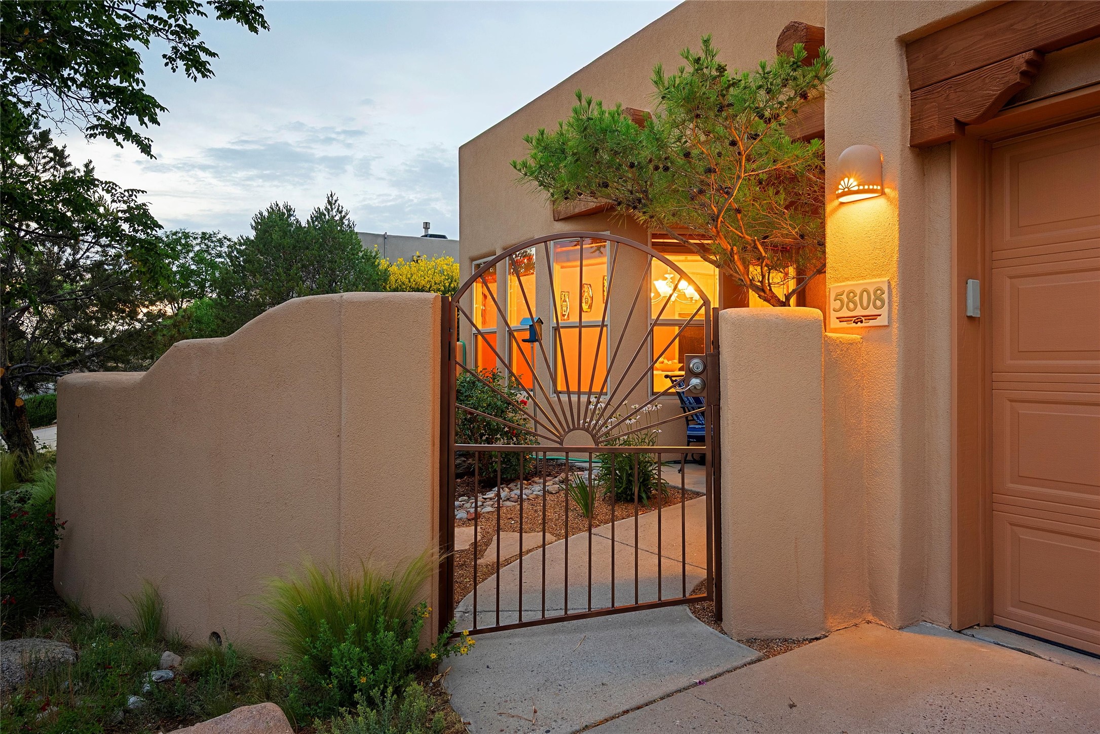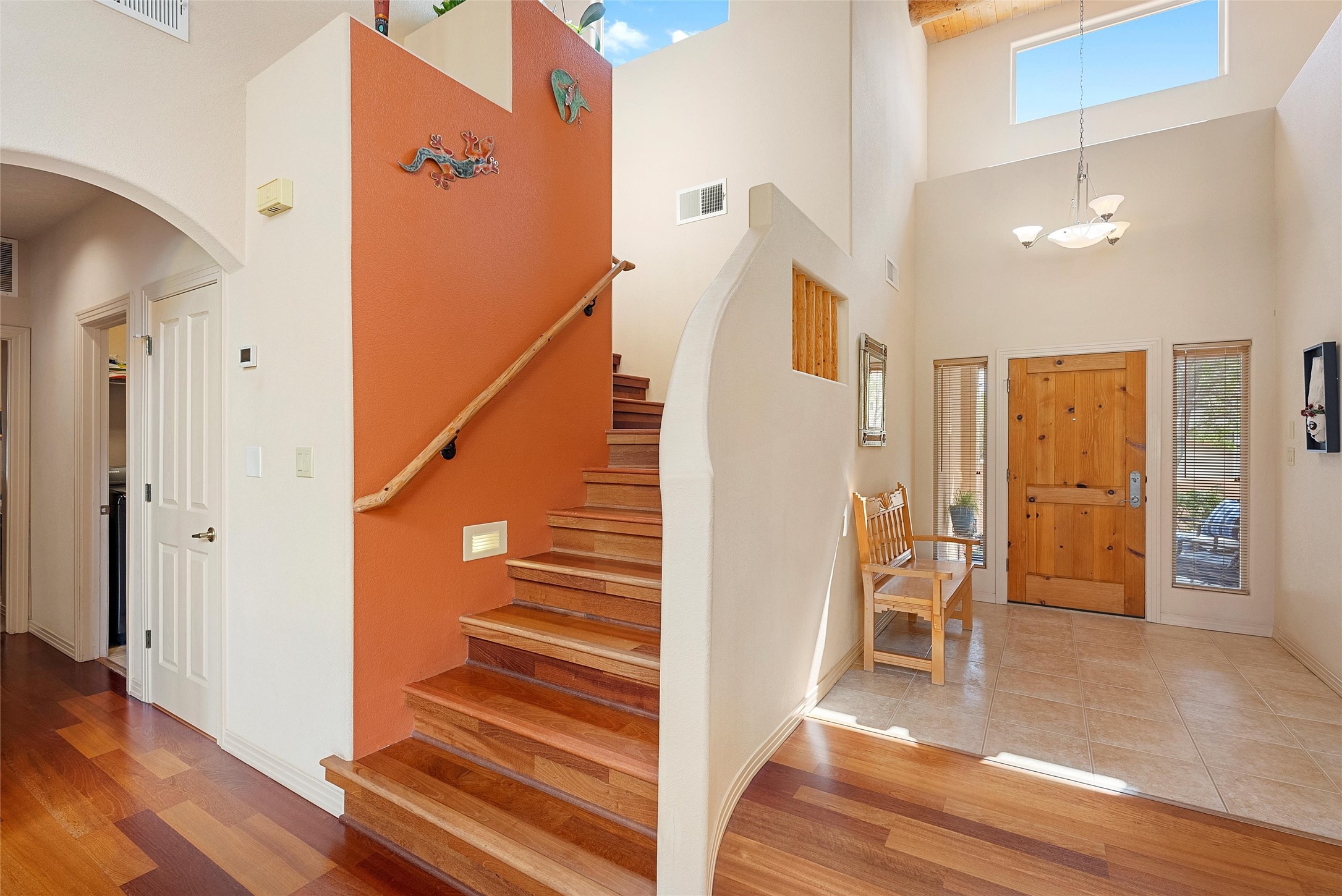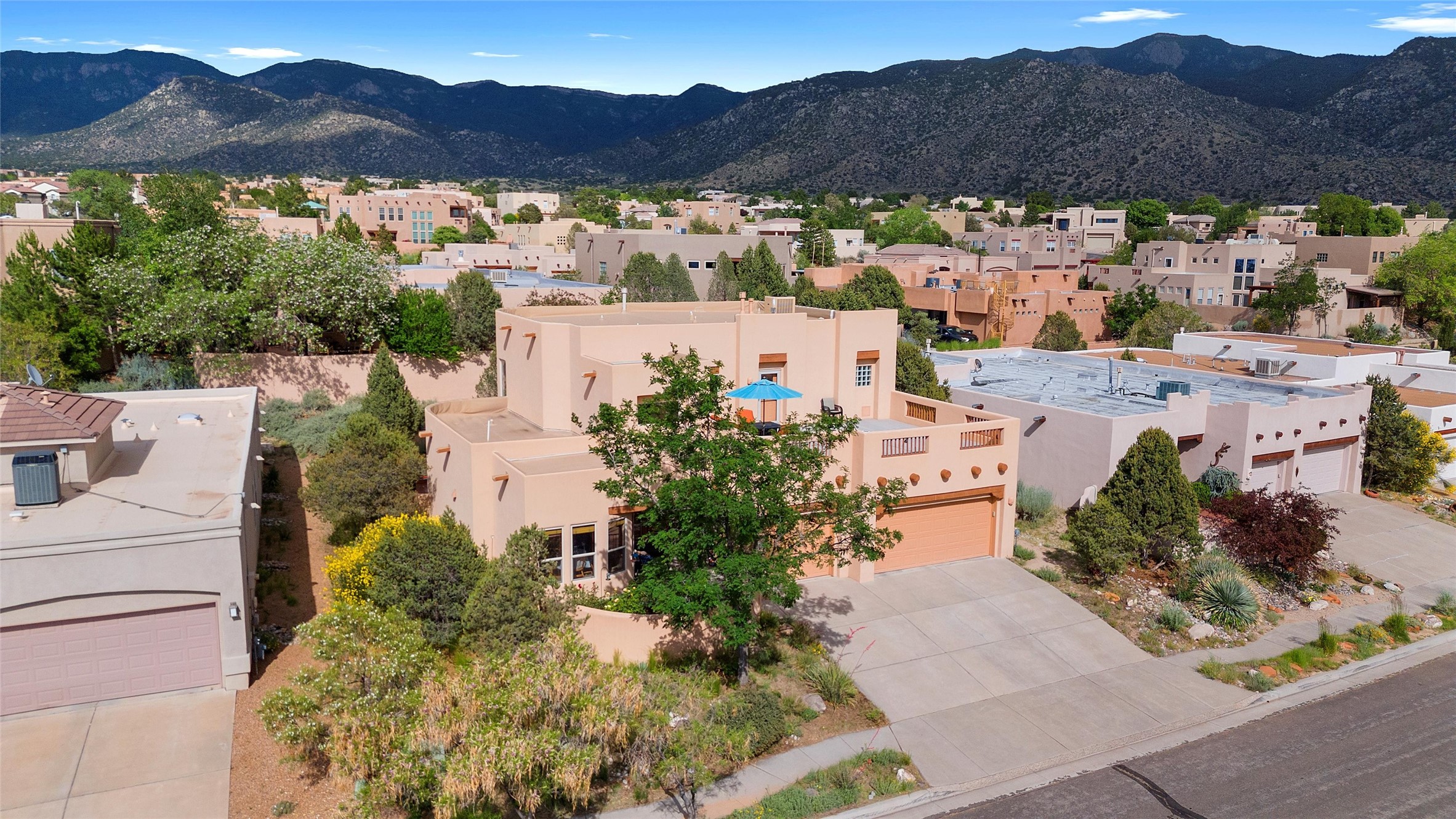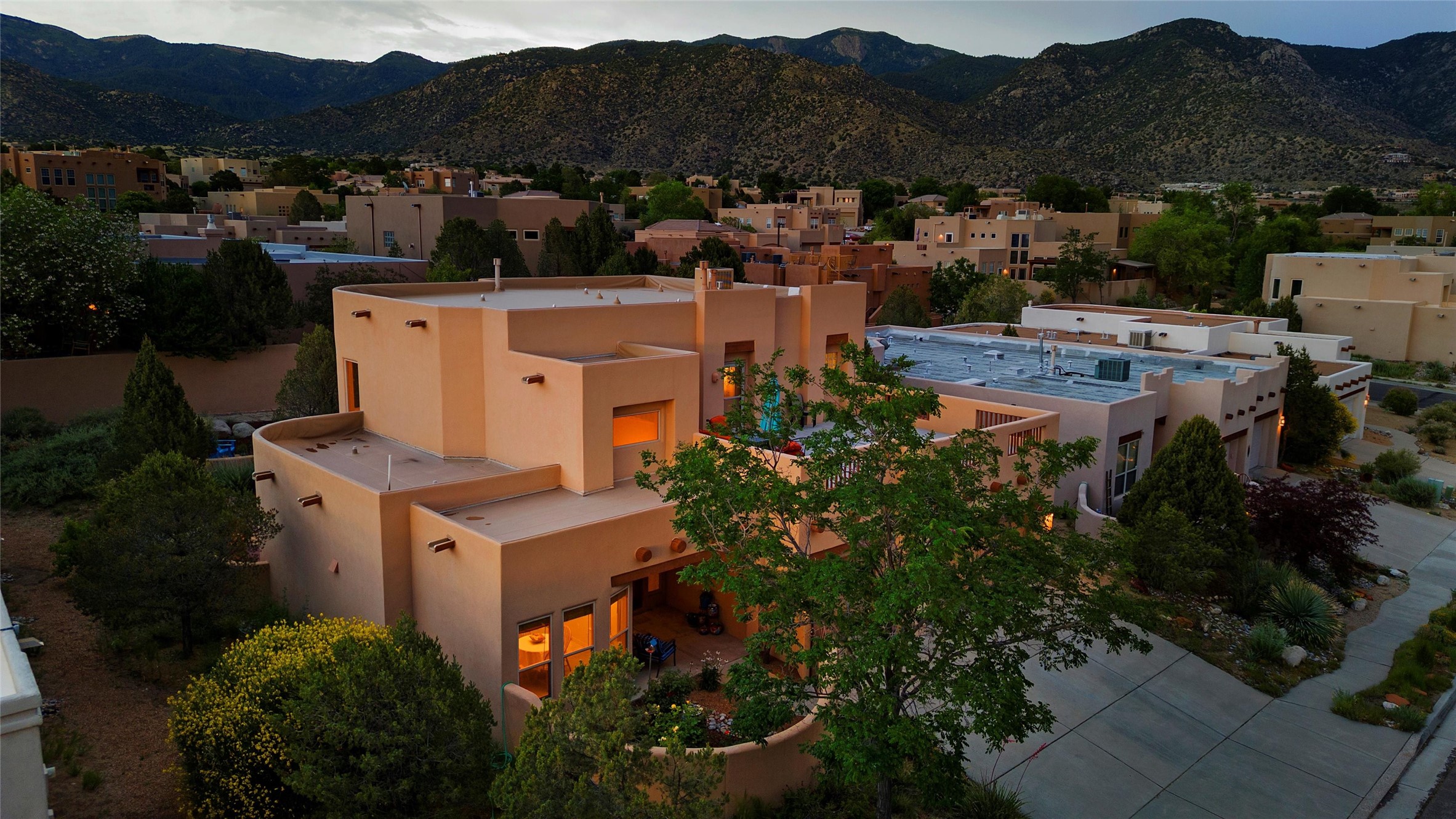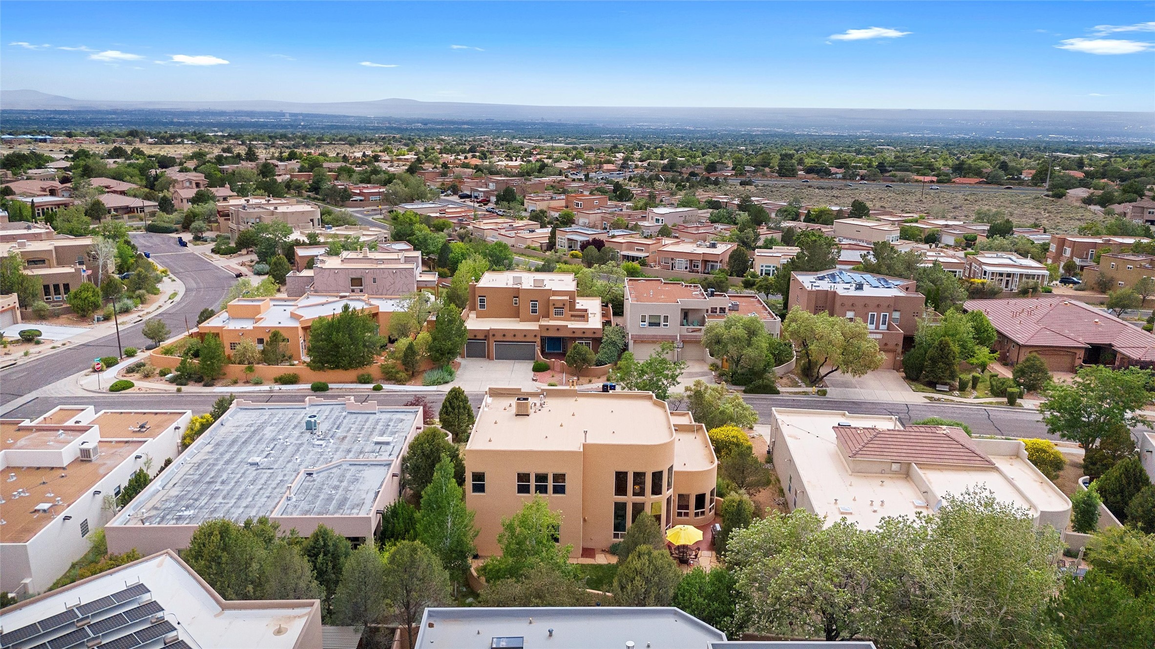 Tucked away on a no-through street, in the coveted Solterra at High Desert community, this serene sanctuary offers a rare blend of comfort and elegance. Passing through the peaceful courtyard into the home you are welcomed with Brazilian cherry wood floors, soaring cathedral ceilings, and a dramatic wall of windows that flood the living space with natural light. The entire top floor is dedicated to the comfort and enjoyment of the primary residents - with a spacious bedroom that includes a reading nook or office, a luxurious bath, and an organized closet space. Opposite the bedroom is a stunning balcony with mountain views and a peek of the city, ideal for sunrise coffee, intimate stargazing, or inviting friends up to watch fireworks or balloons. One of the three downstairs bedrooms has an ensuite bath and separate entrance - perfect for guests or multi-generational living. The kitchen and living areas flow seamlessly into a beautifully landscaped backyard with a water feature --an ideal spot for outdoor dining or quiet reflection. With a 3-car garage, an oversized under-stair closet, and thoughtful upgrades like a whole house humidifier, NUVO water softener, and TPO roof, this home balances beauty and practicality in a premier Albuquerque neighborhood.