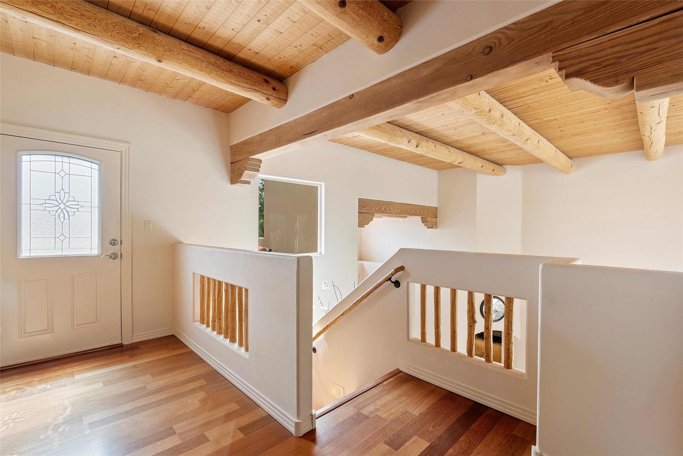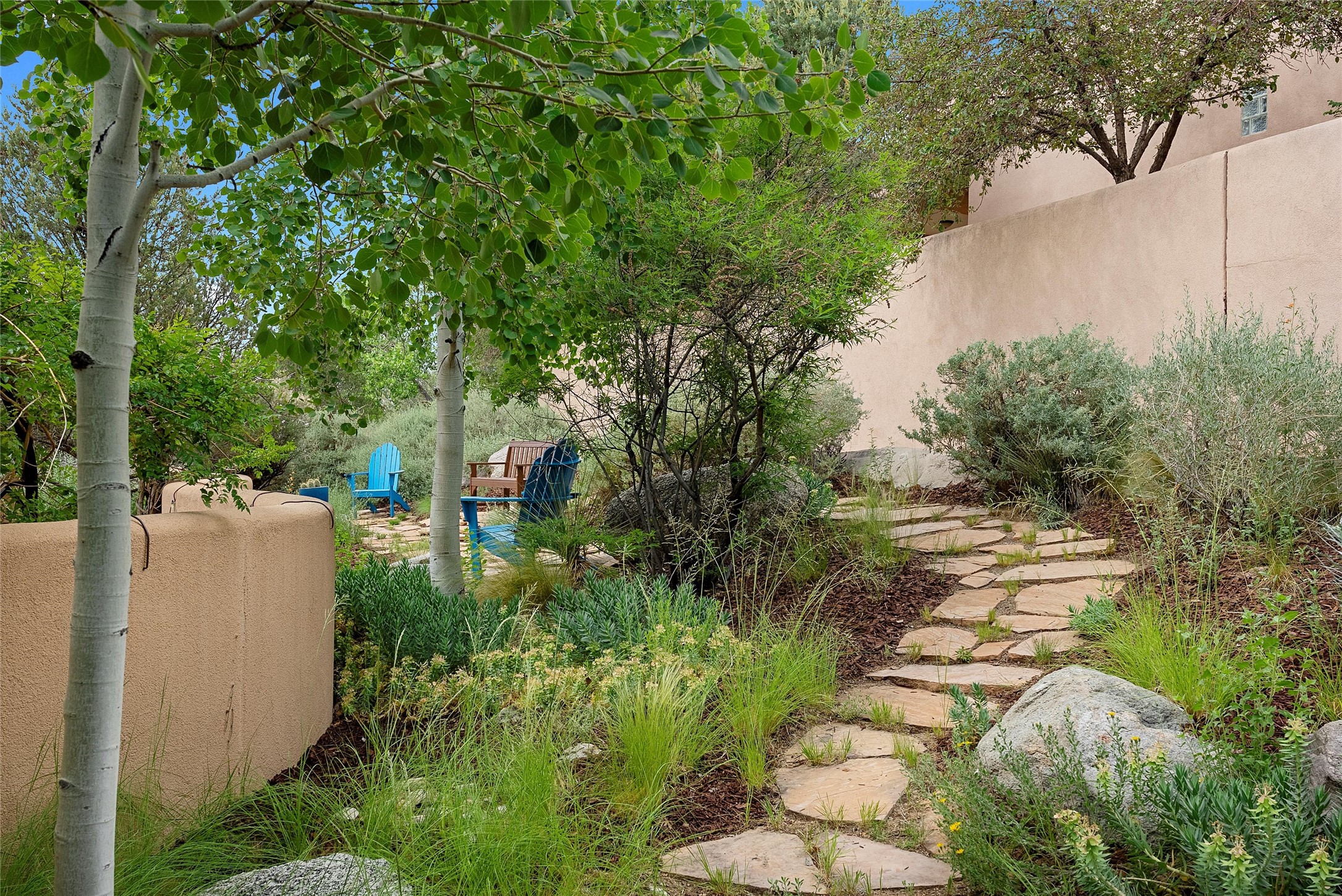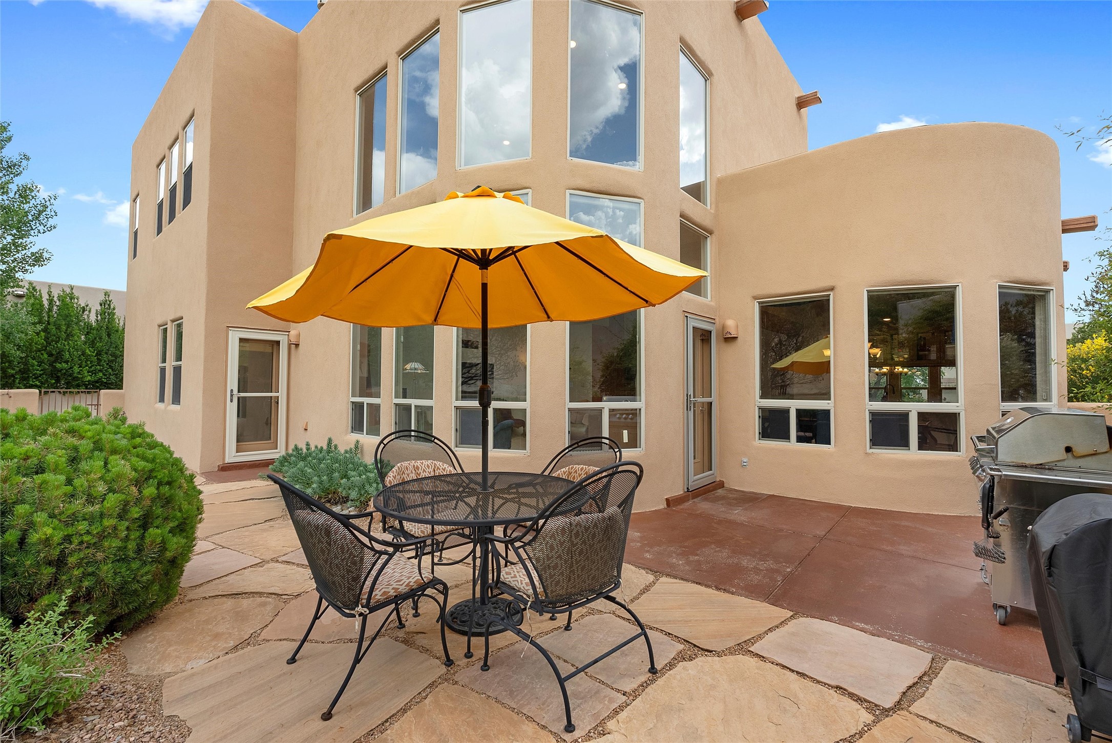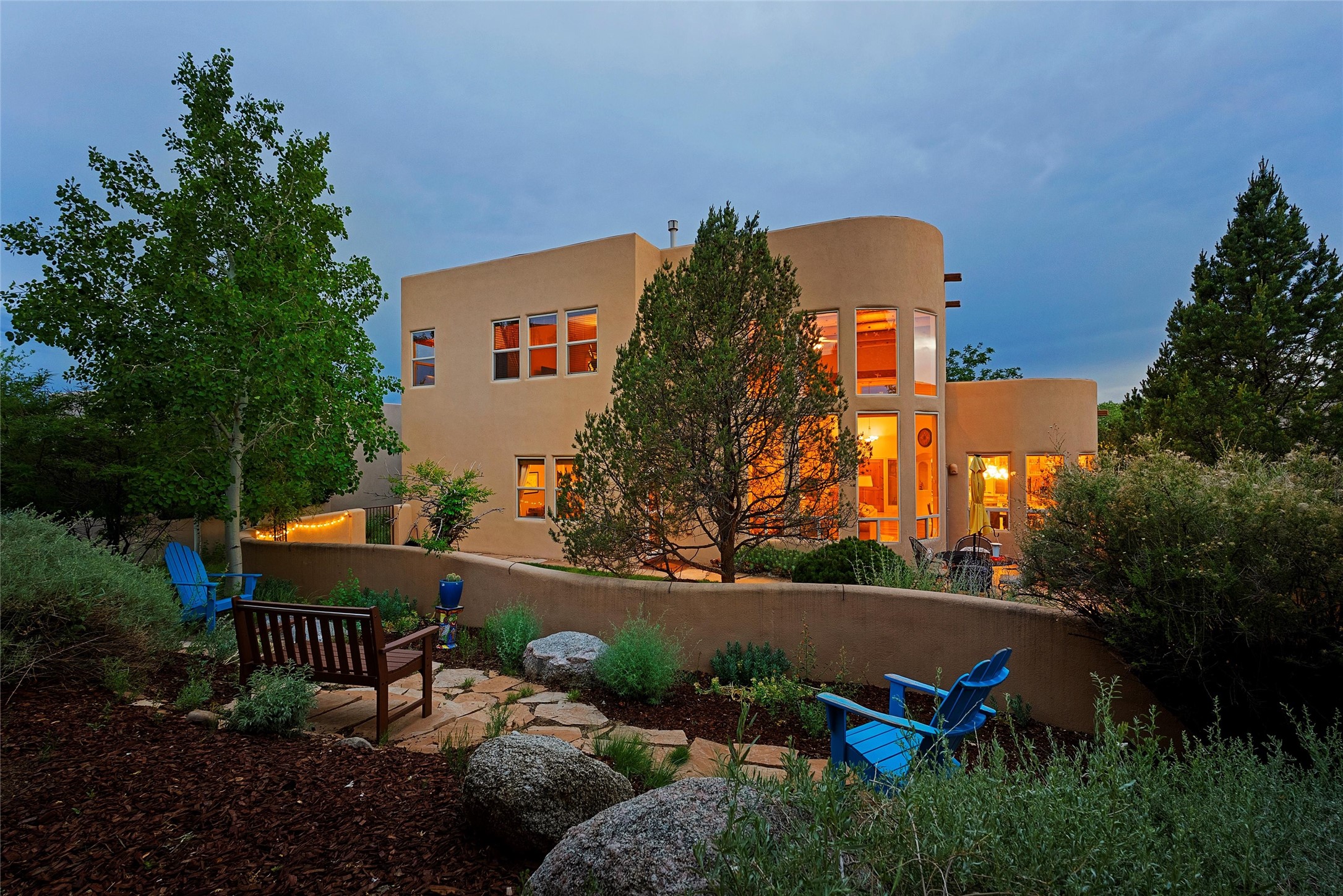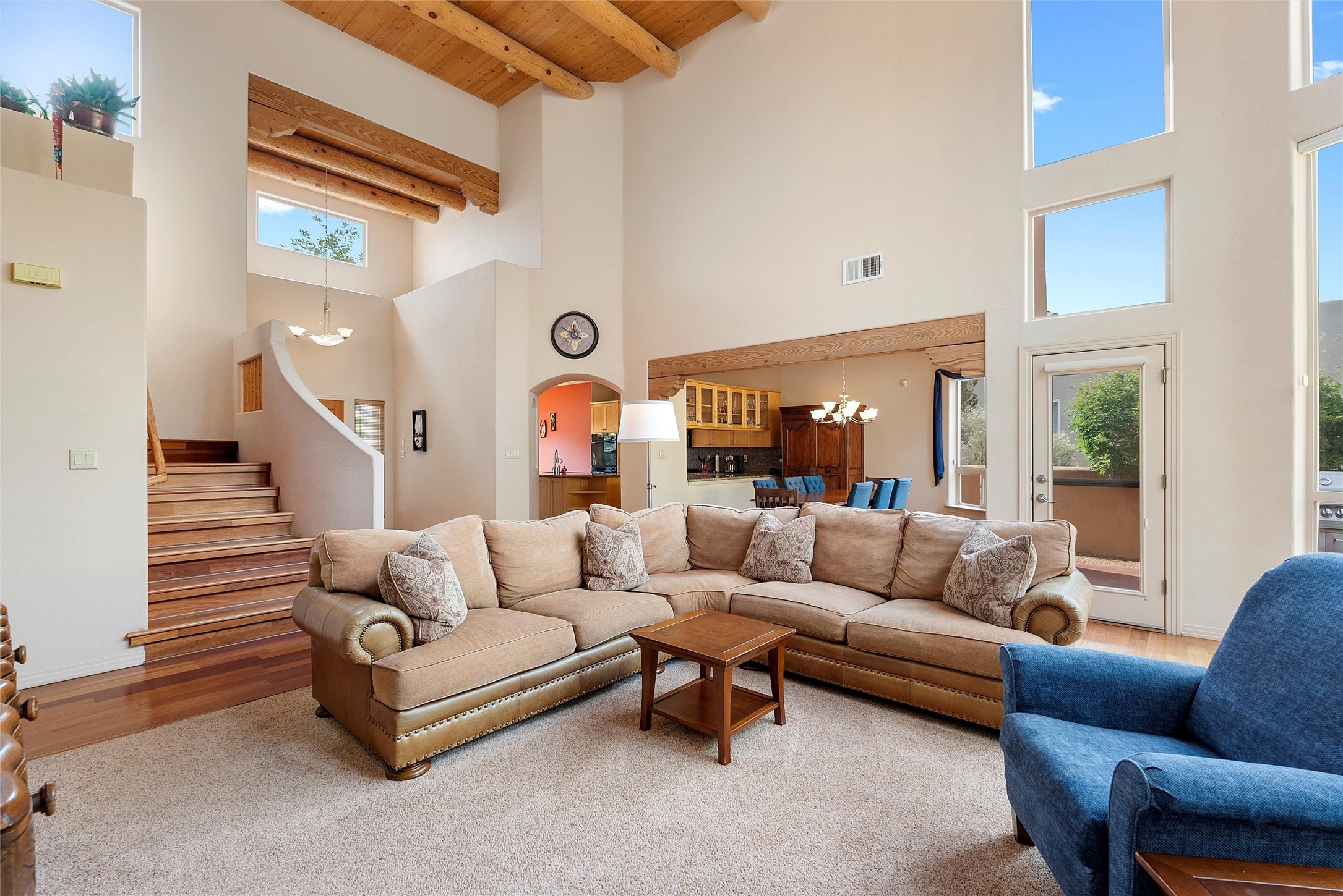 Tucked away on a no-through street, in the coveted Solterra at High Desert community, this serene sanctuary offers a rare blend of comfort and elegance. Passing through the peaceful courtyard into the home you are welcomed with Brazilian cherry wood floors, soaring cathedral ceilings, and a dramatic wall of windows that flood the living space with natural light. The entire top floor is dedicated to the comfort and enjoyment of the primary residents - with a spacious bedroom that includes a reading nook or office, a luxurious bath, and an organized closet space. Opposite the bedroom is a stunning balcony with mountain views and a peek of the city, ideal for sunrise coffee, intimate stargazing, or inviting friends up to watch fireworks or balloons. One of the three downstairs bedrooms has an ensuite bath and separate entrance - perfect for guests or multi-generational living. The kitchen and living areas flow seamlessly into a beautifully landscaped backyard with a water feature --an ideal spot for outdoor dining or quiet reflection. With a 3-car garage, an oversized under-stair closet, and thoughtful upgrades like a whole house humidifier, NUVO water softener, and TPO roof, this home balances beauty and practicality in a premier Albuquerque neighborhood.