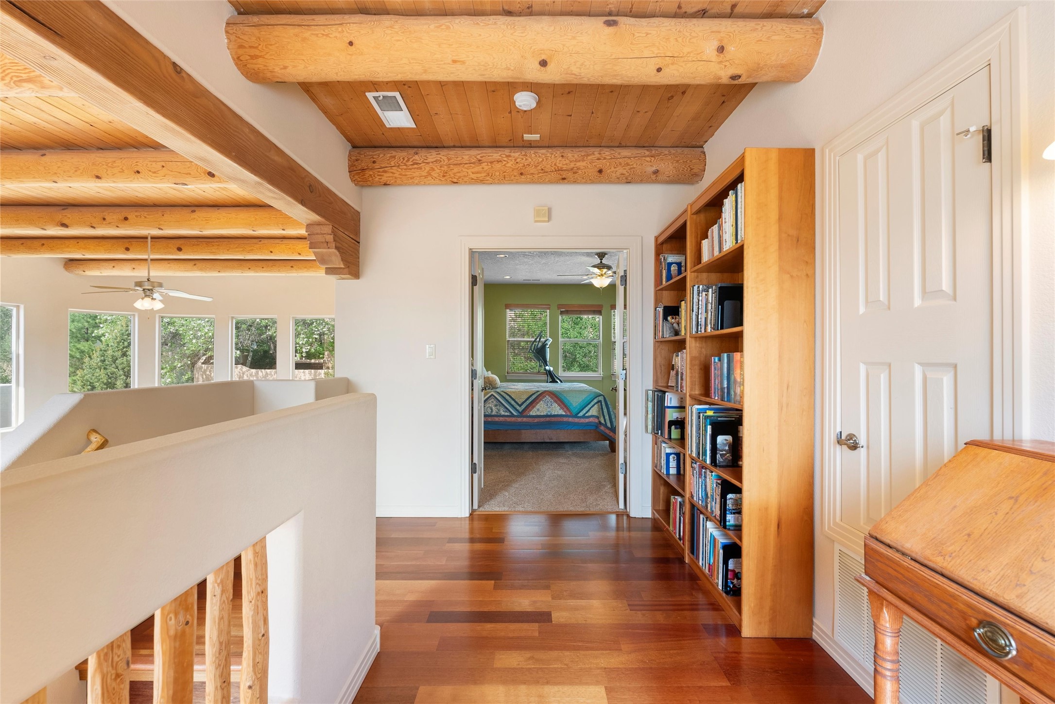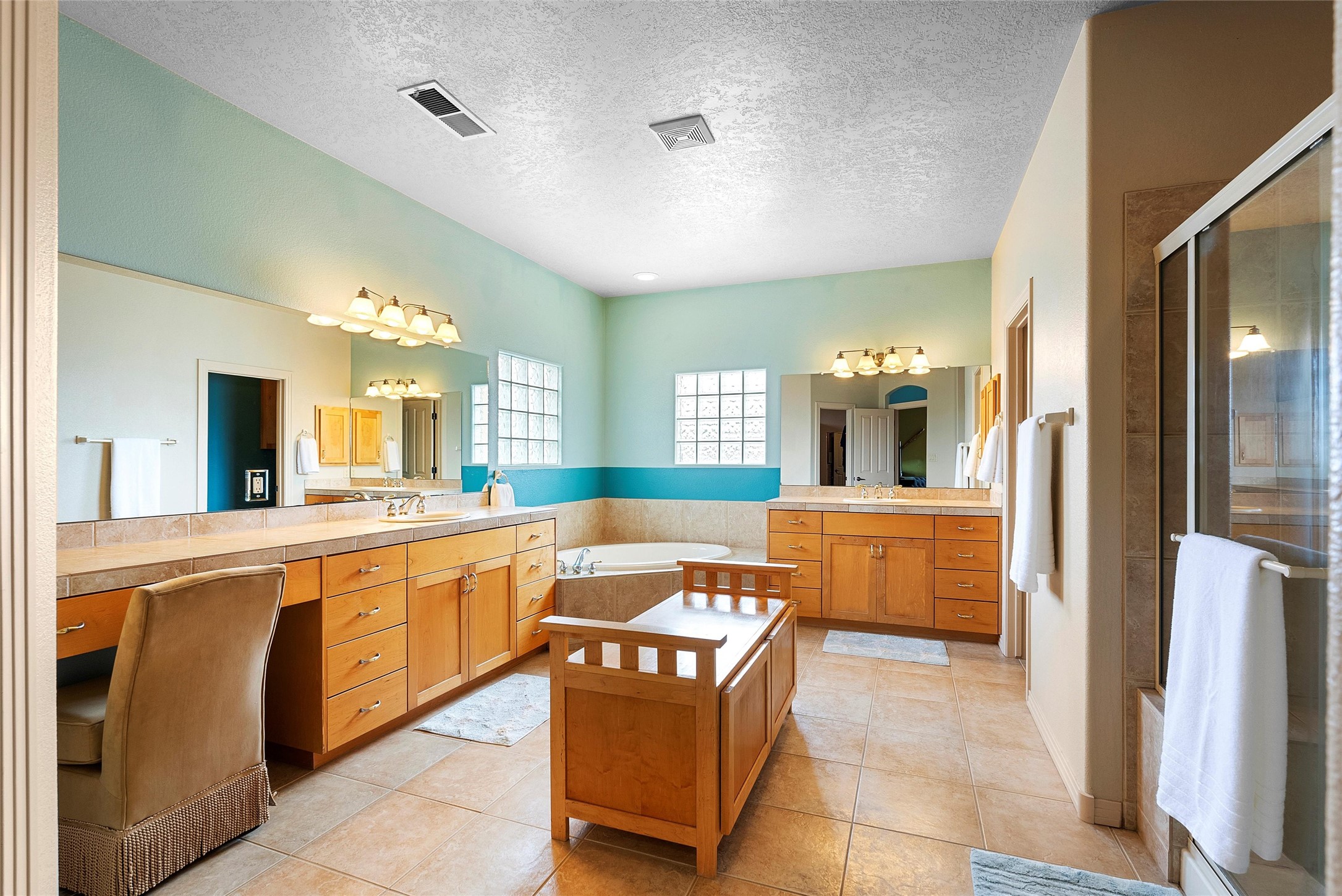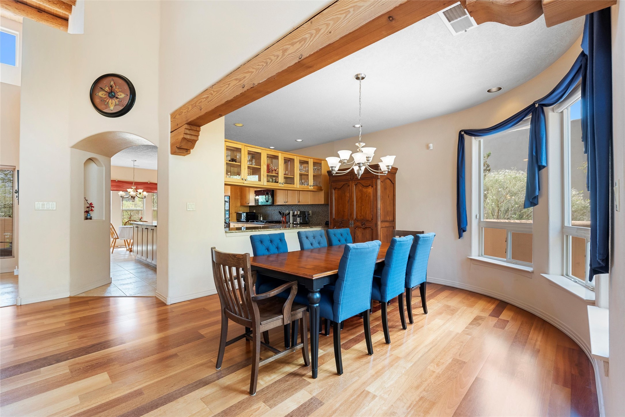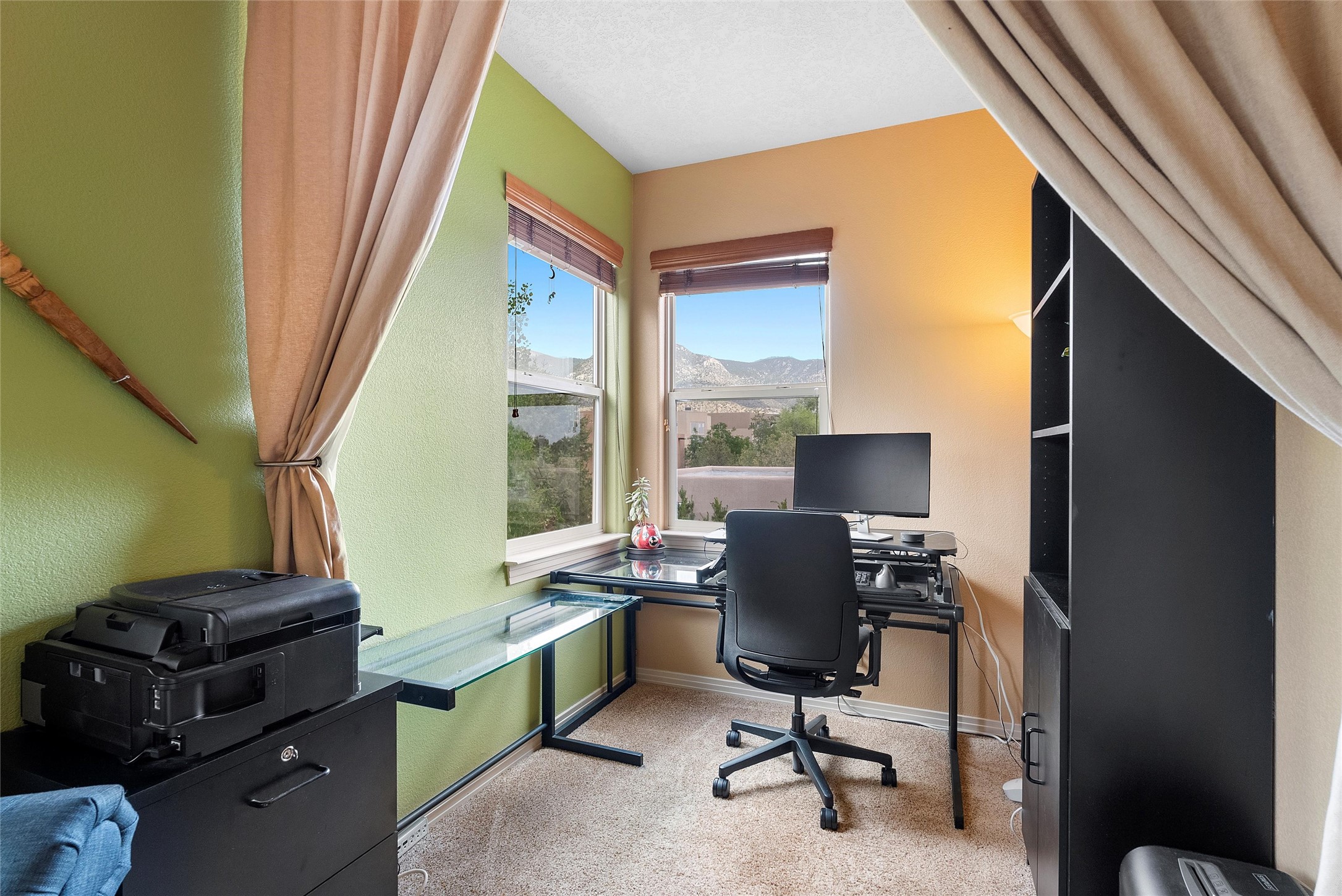 Tucked away on a no-through street, in the coveted Solterra at High Desert community, this serene sanctuary offers a rare blend of comfort and elegance. Passing through the peaceful courtyard into the home you are welcomed with Brazilian cherry wood floors, soaring cathedral ceilings, and a dramatic wall of windows that flood the living space with natural light. The entire top floor is dedicated to the comfort and enjoyment of the primary residents - with a spacious bedroom that includes a reading nook or office, a luxurious bath, and an organized closet space. Opposite the bedroom is a stunning balcony with mountain views and a peek of the city, ideal for sunrise coffee, intimate stargazing, or inviting friends up to watch fireworks or balloons. One of the three downstairs bedrooms has an ensuite bath and separate entrance - perfect for guests or multi-generational living. The kitchen and living areas flow seamlessly into a beautifully landscaped backyard with a water feature --an ideal spot for outdoor dining or quiet reflection. With a 3-car garage, an oversized under-stair closet, and thoughtful upgrades like a whole house humidifier, NUVO water softener, and TPO roof, this home balances beauty and practicality in a premier Albuquerque neighborhood.