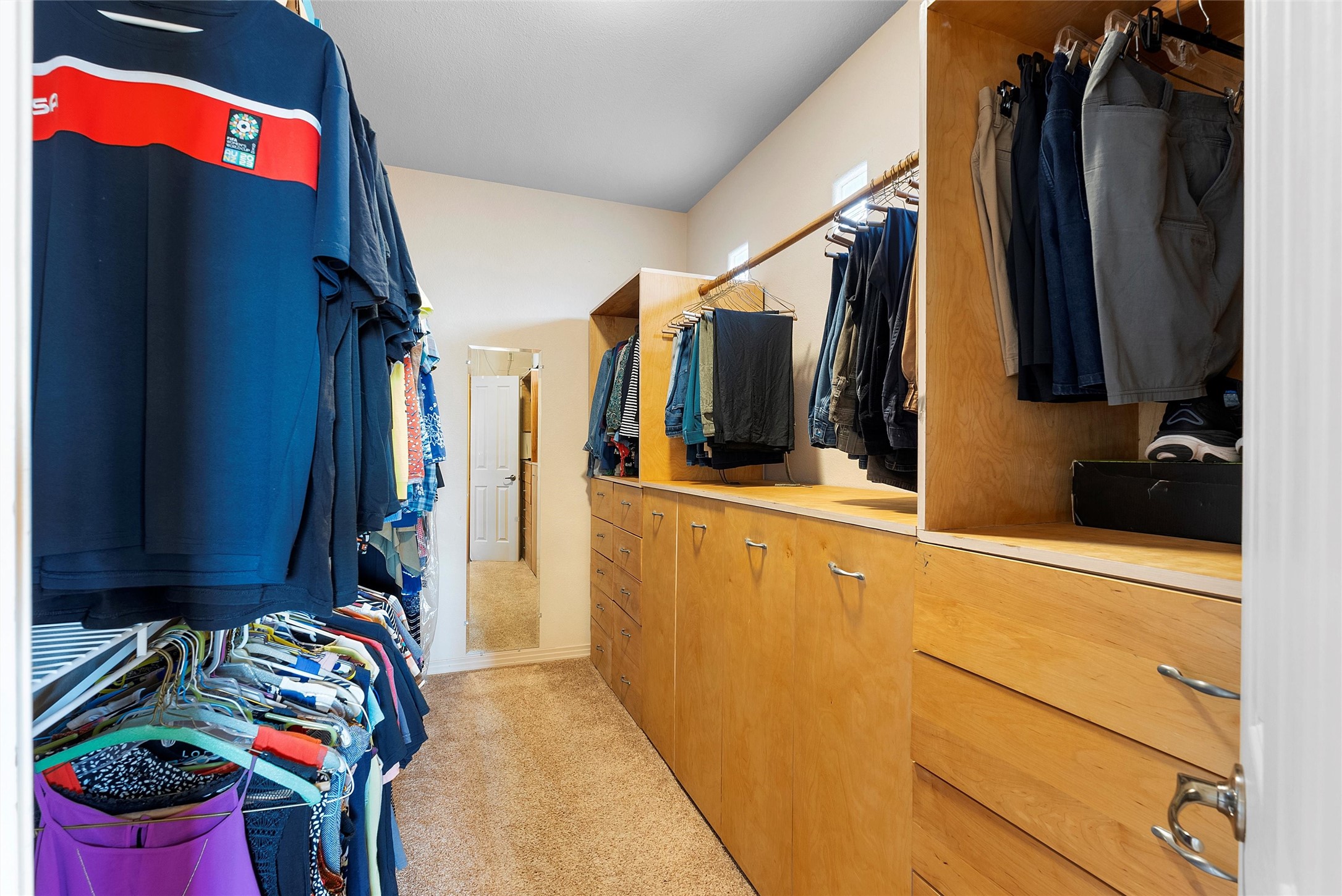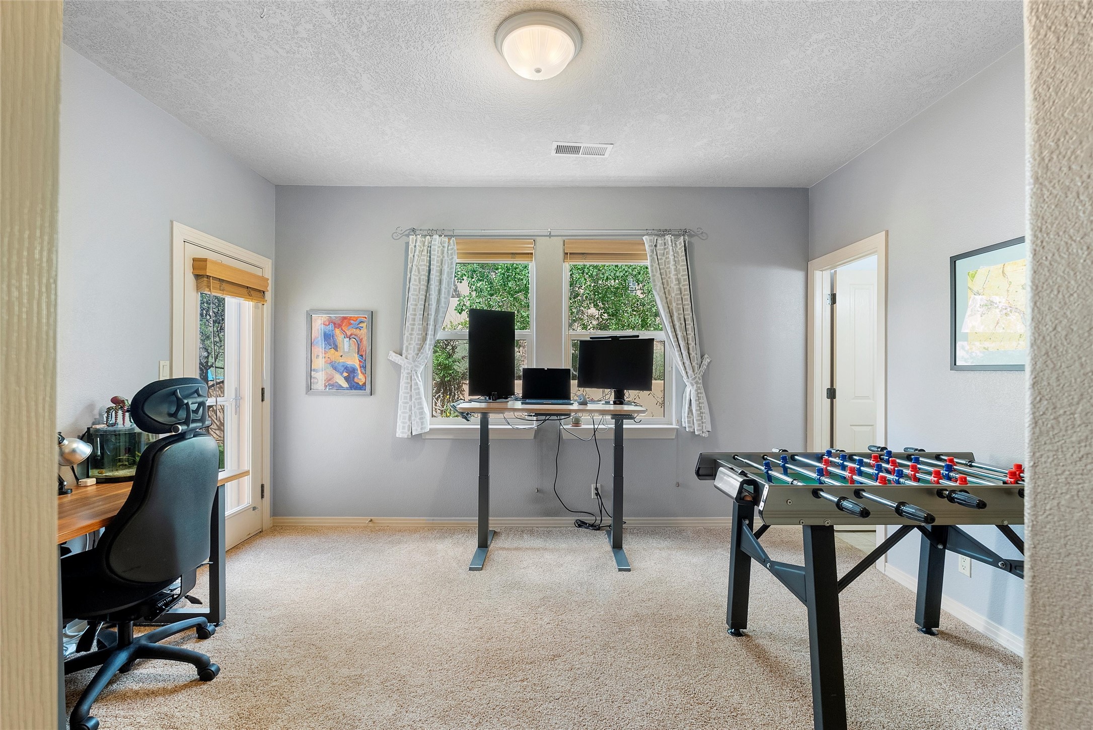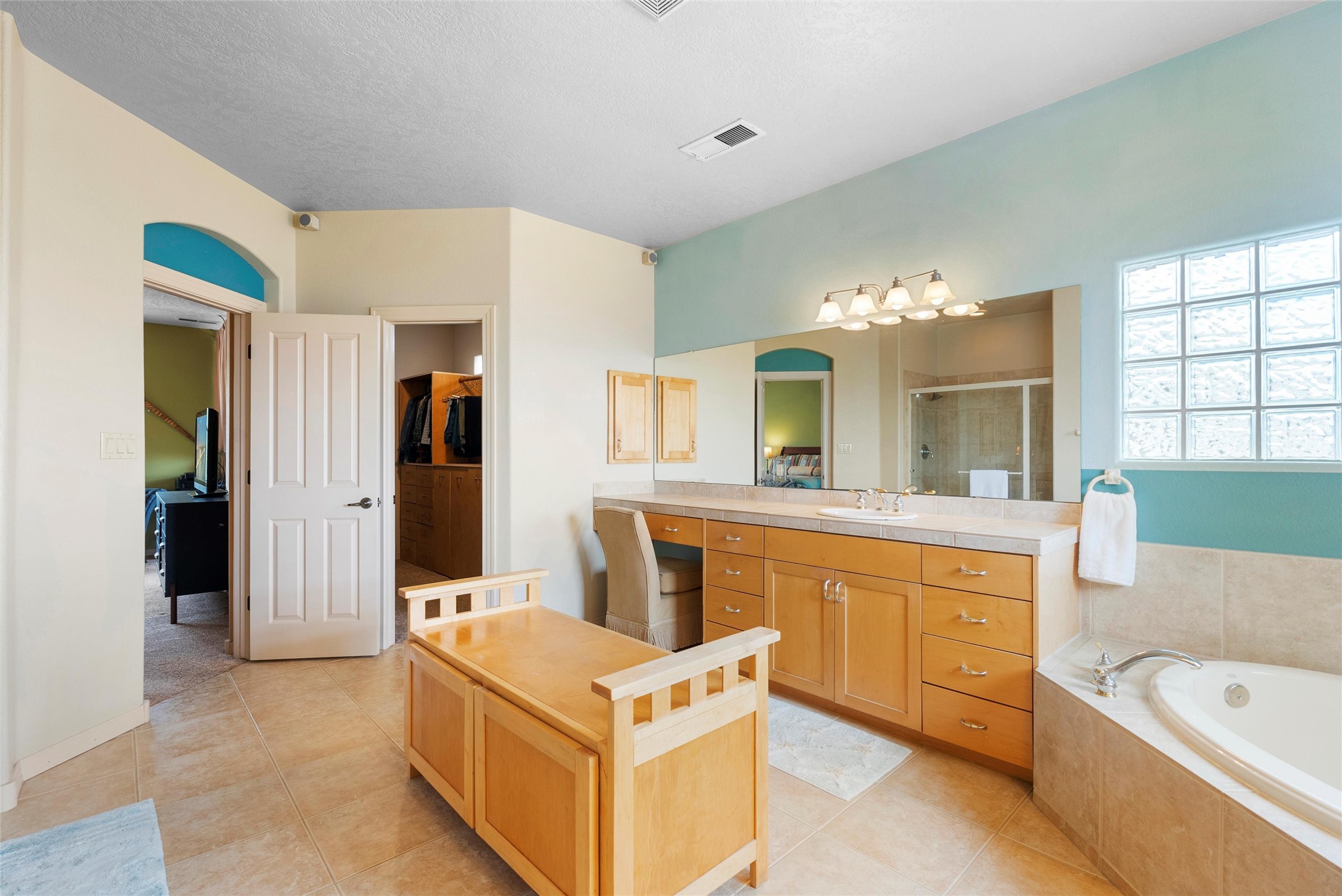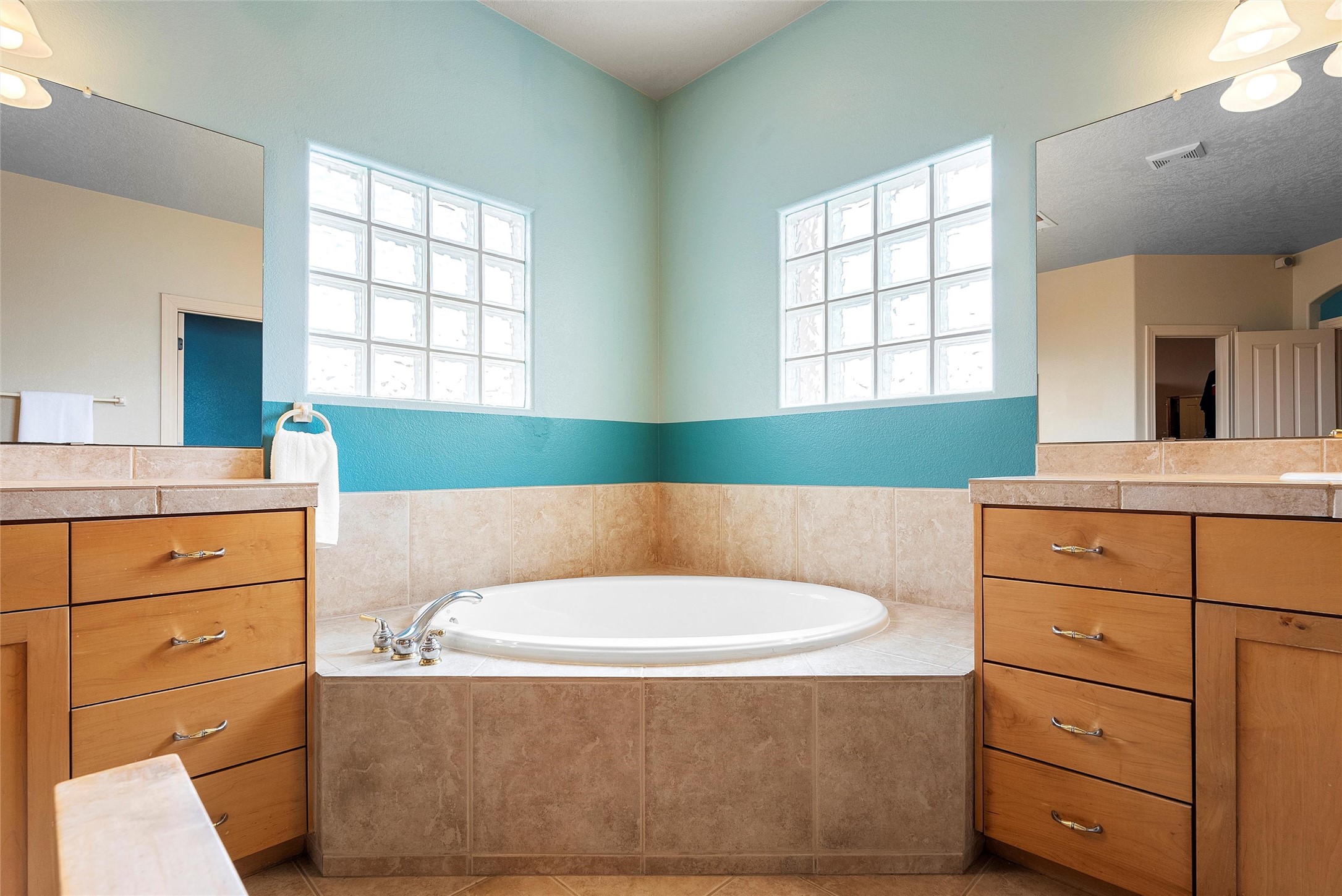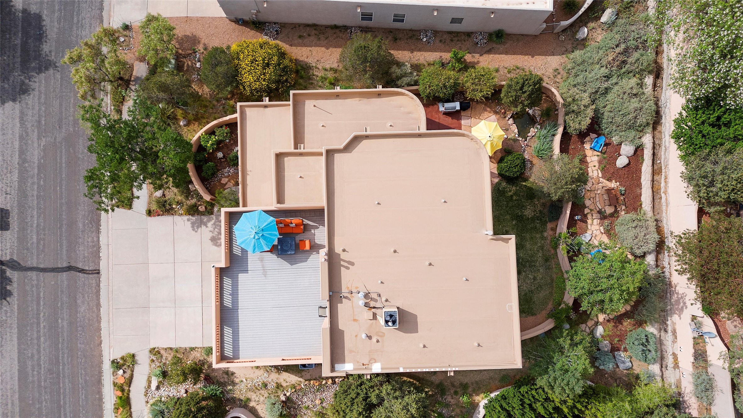 Tucked away on a no-through street, in the coveted Solterra at High Desert community, this serene sanctuary offers a rare blend of comfort and elegance. Passing through the peaceful courtyard into the home you are welcomed with Brazilian cherry wood floors, soaring cathedral ceilings, and a dramatic wall of windows that flood the living space with natural light. The entire top floor is dedicated to the comfort and enjoyment of the primary residents - with a spacious bedroom that includes a reading nook or office, a luxurious bath, and an organized closet space. Opposite the bedroom is a stunning balcony with mountain views and a peek of the city, ideal for sunrise coffee, intimate stargazing, or inviting friends up to watch fireworks or balloons. One of the three downstairs bedrooms has an ensuite bath and separate entrance - perfect for guests or multi-generational living. The kitchen and living areas flow seamlessly into a beautifully landscaped backyard with a water feature --an ideal spot for outdoor dining or quiet reflection. With a 3-car garage, an oversized under-stair closet, and thoughtful upgrades like a whole house humidifier, NUVO water softener, and TPO roof, this home balances beauty and practicality in a premier Albuquerque neighborhood.