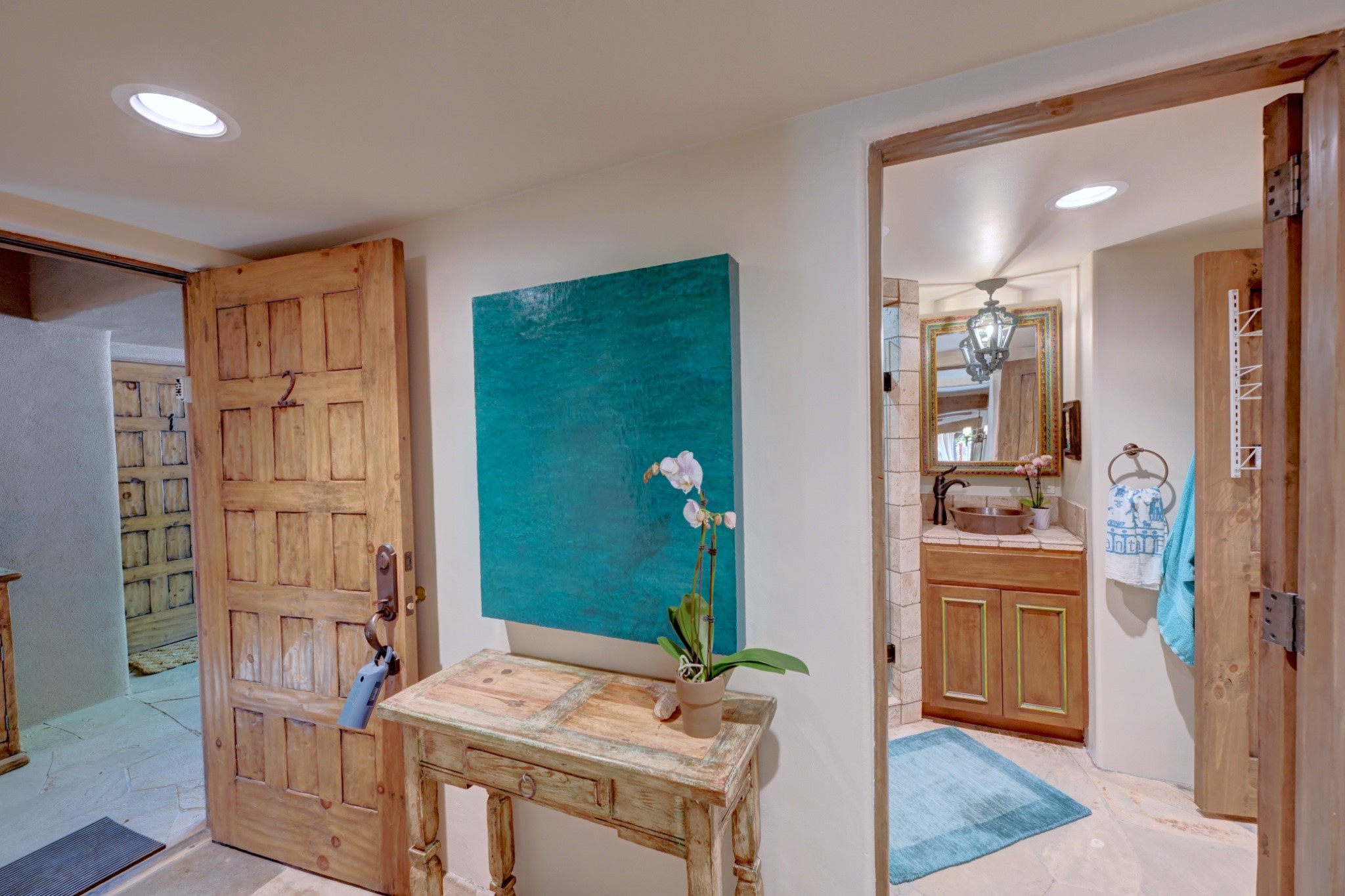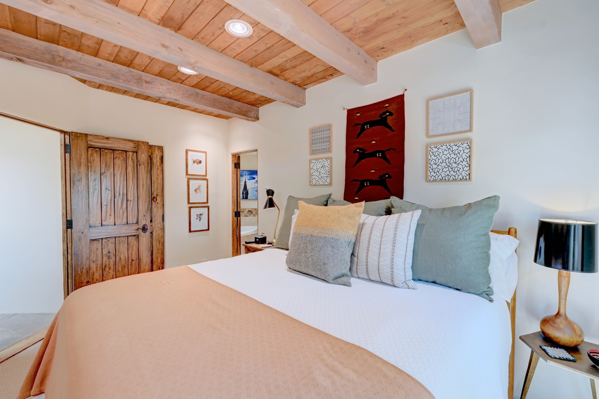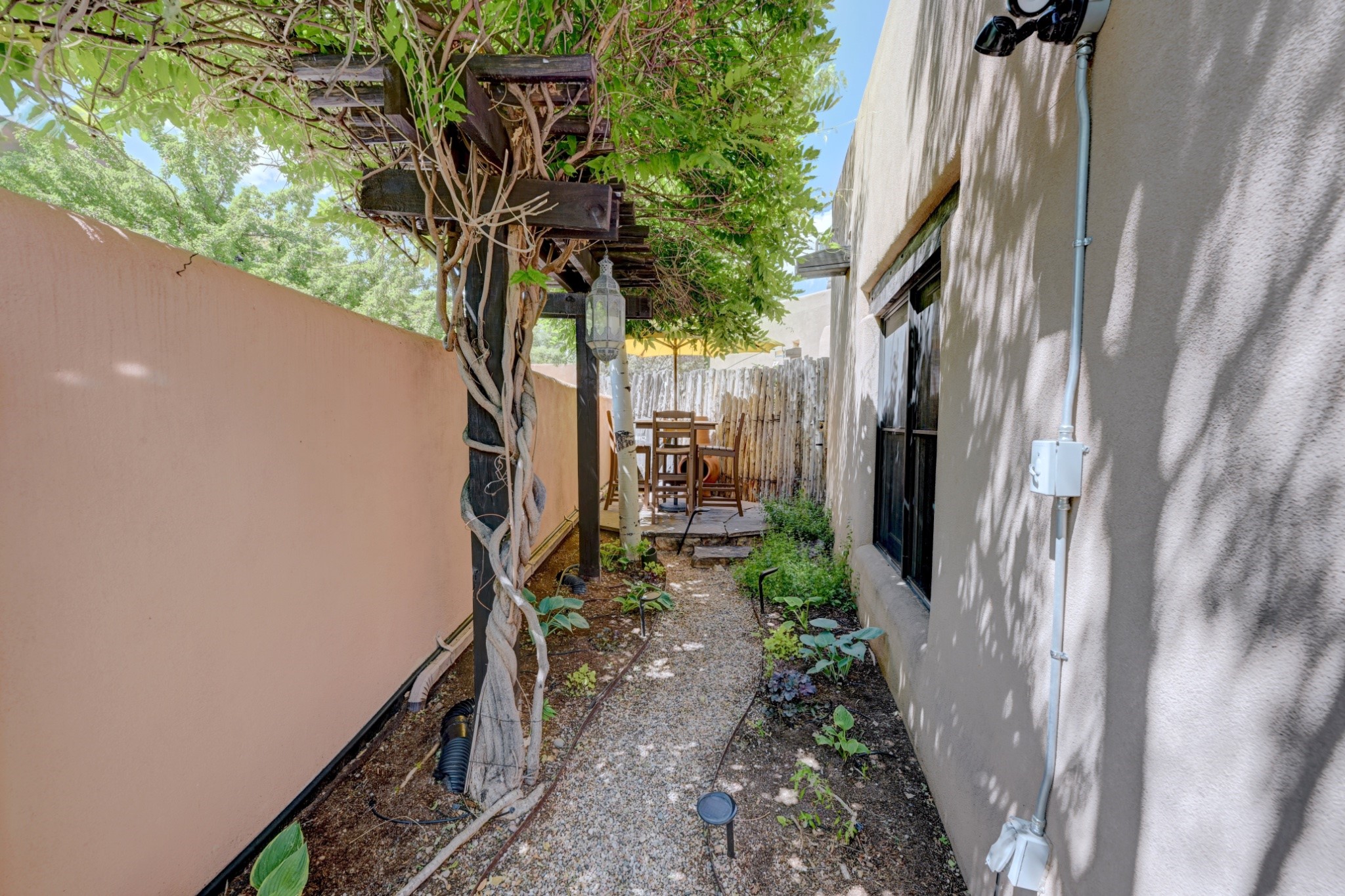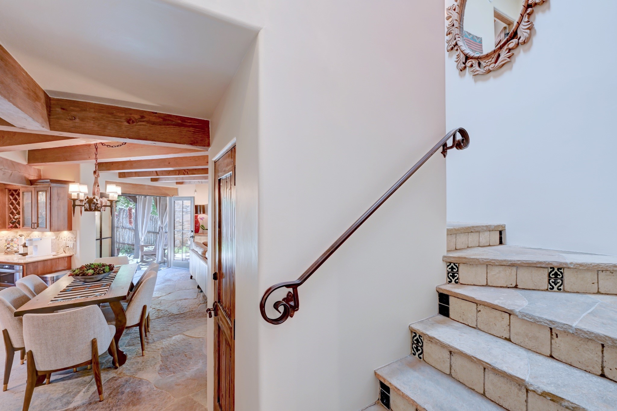 Nestled in the heart of Santa Fe's coveted historic Eastside and located off of Gonzales Rd, this elegant condo captures the essence of Southwestern living. Just a short walk from the famed Canyon Road art district, you'll find yourself perfectly positioned to enjoy the city's rich culture. Step inside to discover authentic Santa Fe style throughout this 1,352 +/- square foot retreat within a two-condo development. Admire beautiful beam and wood-plank ceilings, while gorgeous hand-hewn flagstone floors ground the space in traditional craftsmanship. The well-appointed cook's kitchen flows seamlessly into the living and dining areas, featuring thoughtful touches like a two-drawer dishwasher, convenient pot-filler, and a microwave drawer. Unwind by the kiva fireplace in the living room or step outside to your enchanting garden. This outdoor oasis boasts a hand-stacked rock wall, carved Buddha wooden gate, large, mature Wisteria vine and a soothing fountain surrounded by two distinct seating areas--all beautifully landscaped for easy care. Upstairs, the primary bedroom suite offers a private deck with lovely views, plus an ensuite bathroom featuring a double sink vanity, large soaking tub, and luxurious steam shower. Artistic details abound throughout, from wrought iron stair rails and light fixtures to hand painting on a nicho and fireplace. A charming wooden door with hand-painted Santos leads to the second bedroom, which doubles perfectly as a home office. Every room showcases custom cabinetry, doors, and true divided-light windows. Modern comforts include radiant in-floor heating, ductless mini-splits for cooling comfort, and a new tankless hot water heater. One dedicated parking space completes this package. Located minutes from Canyon Road's galleries, world renown restaurants and the Santa Fe Plaza's downtown attractions, this condo offers both convenience and tranquility. Whether as your Santa Fe pied--terre or full-time residence, this lock-and-leave lifestyle puts the best of The City Different at your doorstep. Please see the Matterport 3-D walkthrough in the listing. An extensive furniture package is available for purchase separately.