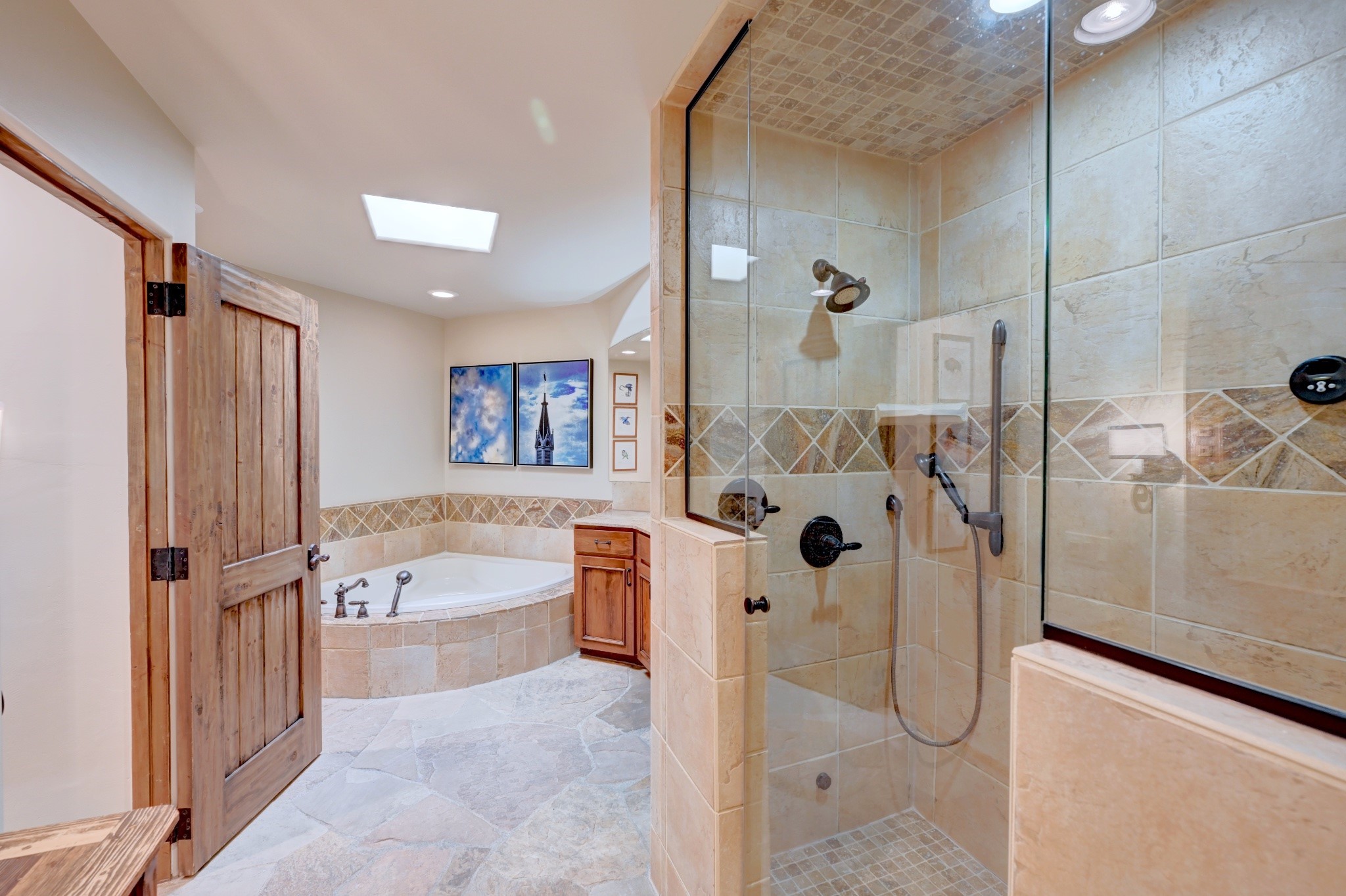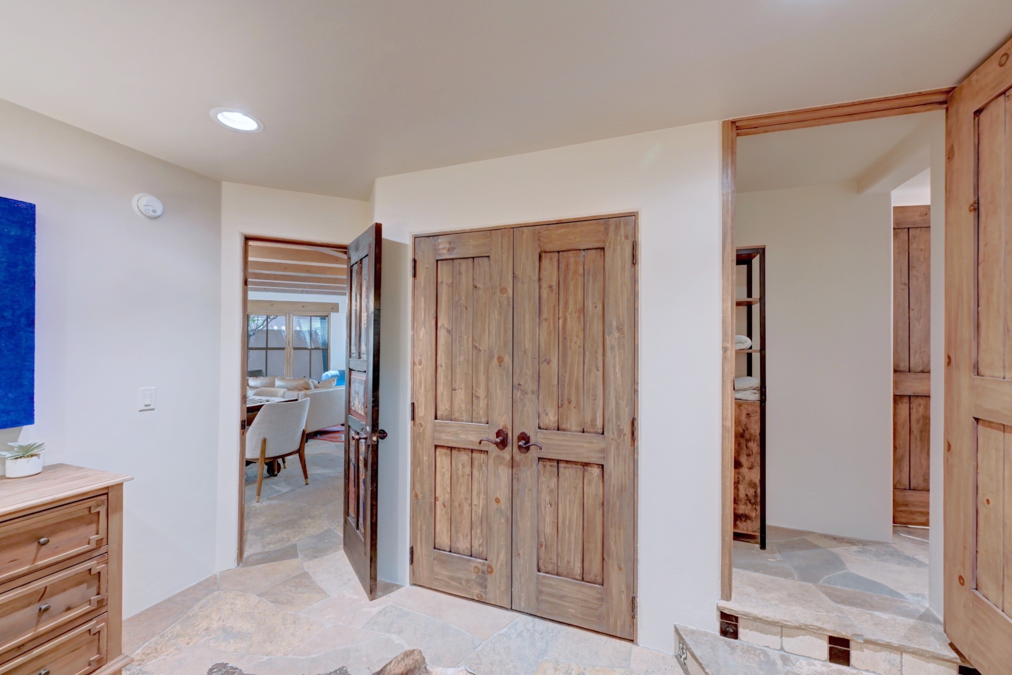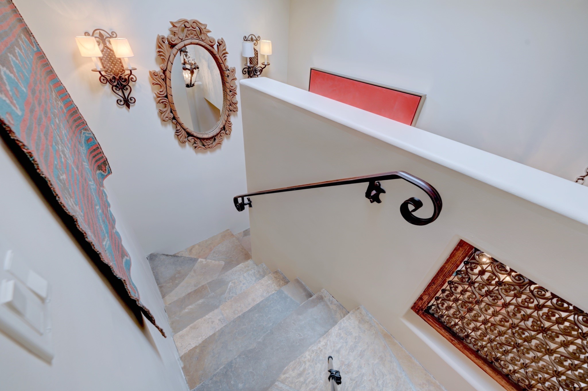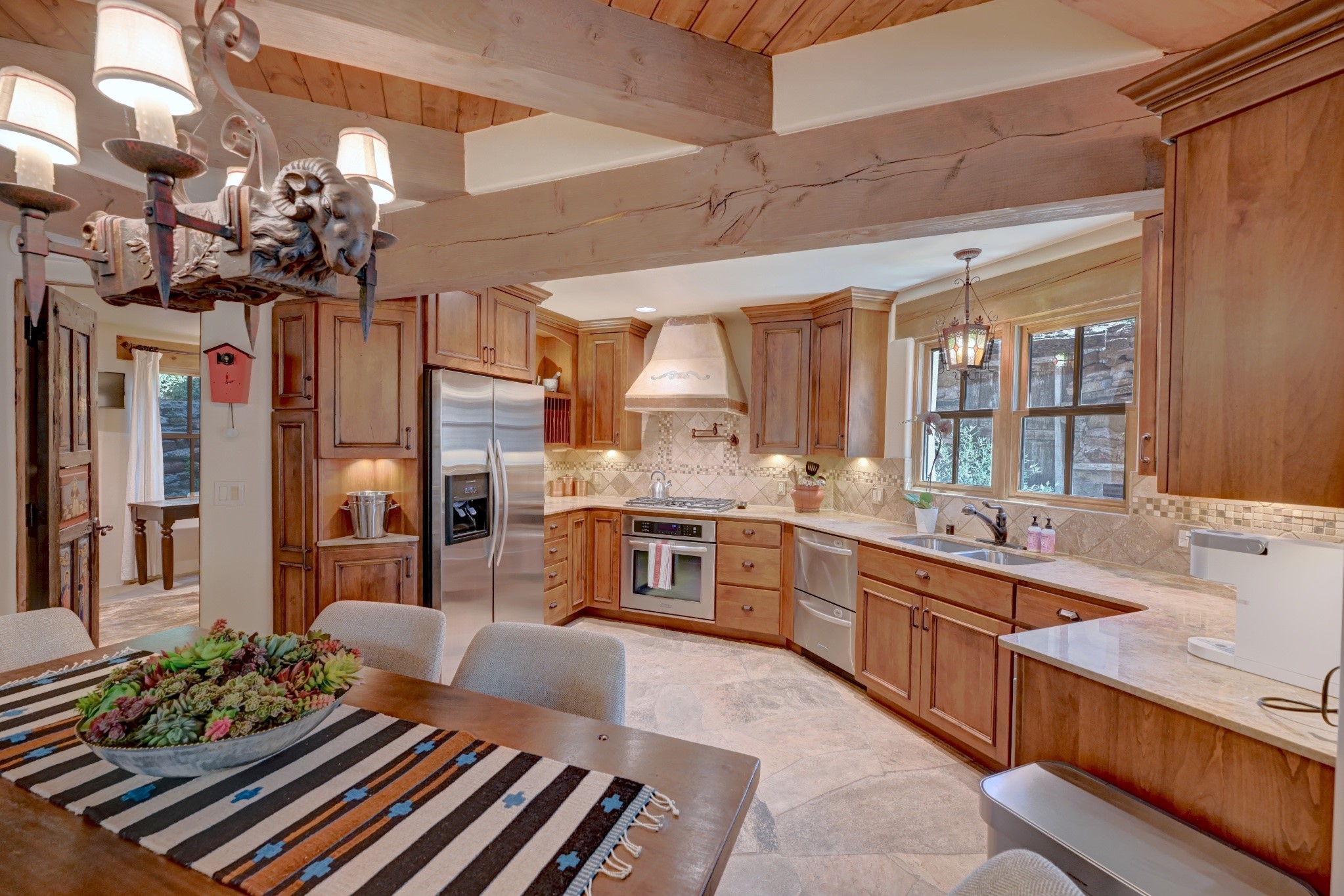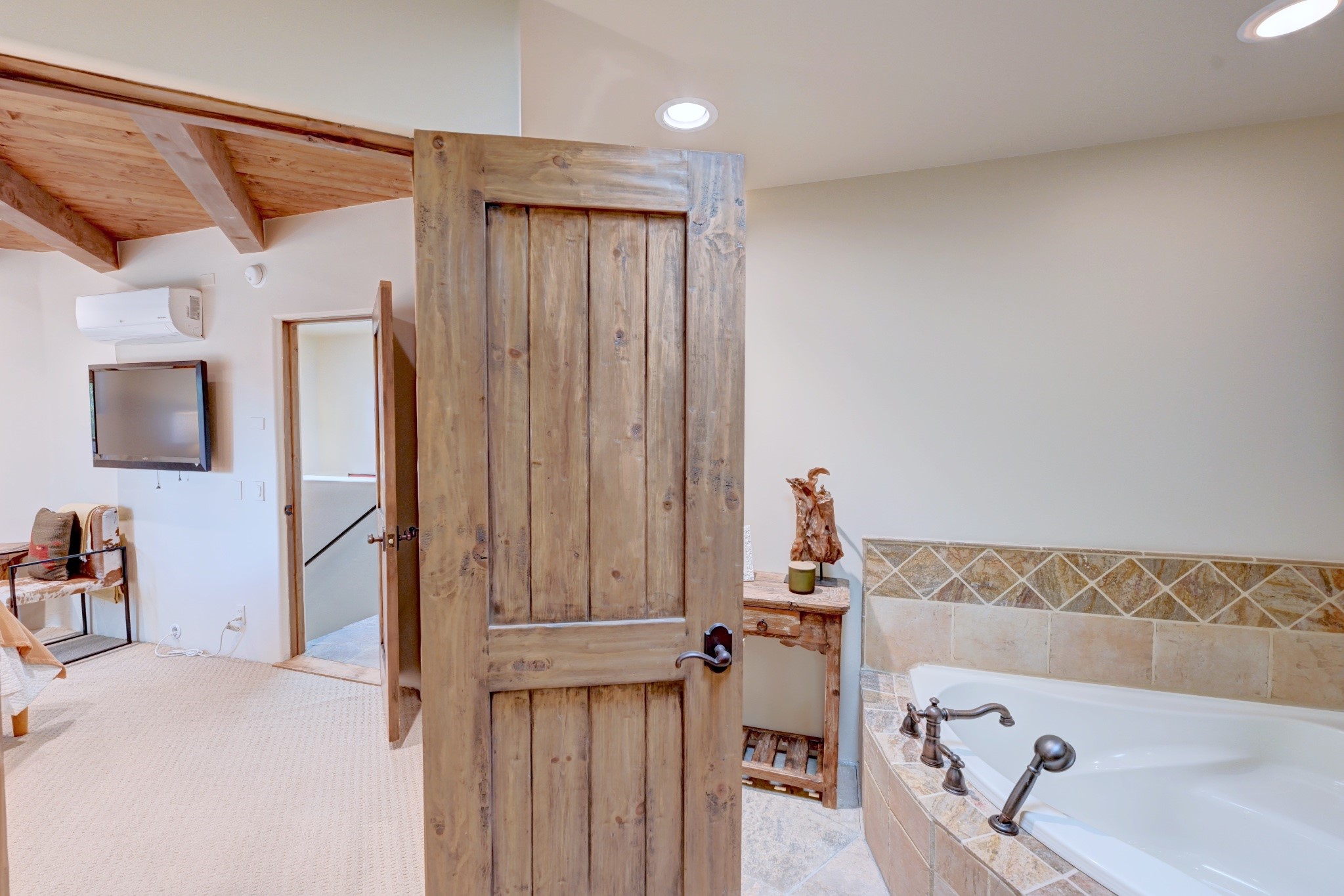 Nestled in the heart of Santa Fe's coveted historic Eastside and located off of Gonzales Rd, this elegant condo captures the essence of Southwestern living. Just a short walk from the famed Canyon Road art district, you'll find yourself perfectly positioned to enjoy the city's rich culture. Step inside to discover authentic Santa Fe style throughout this 1,352 +/- square foot retreat within a two-condo development. Admire beautiful beam and wood-plank ceilings, while gorgeous hand-hewn flagstone floors ground the space in traditional craftsmanship. The well-appointed cook's kitchen flows seamlessly into the living and dining areas, featuring thoughtful touches like a two-drawer dishwasher, convenient pot-filler, and a microwave drawer. Unwind by the kiva fireplace in the living room or step outside to your enchanting garden. This outdoor oasis boasts a hand-stacked rock wall, carved Buddha wooden gate, large, mature Wisteria vine and a soothing fountain surrounded by two distinct seating areas--all beautifully landscaped for easy care. Upstairs, the primary bedroom suite offers a private deck with lovely views, plus an ensuite bathroom featuring a double sink vanity, large soaking tub, and luxurious steam shower. Artistic details abound throughout, from wrought iron stair rails and light fixtures to hand painting on a nicho and fireplace. A charming wooden door with hand-painted Santos leads to the second bedroom, which doubles perfectly as a home office. Every room showcases custom cabinetry, doors, and true divided-light windows. Modern comforts include radiant in-floor heating, ductless mini-splits for cooling comfort, and a new tankless hot water heater. One dedicated parking space completes this package. Located minutes from Canyon Road's galleries, world renown restaurants and the Santa Fe Plaza's downtown attractions, this condo offers both convenience and tranquility. Whether as your Santa Fe pied--terre or full-time residence, this lock-and-leave lifestyle puts the best of The City Different at your doorstep. Please see the Matterport 3-D walkthrough in the listing. An extensive furniture package is available for purchase separately.