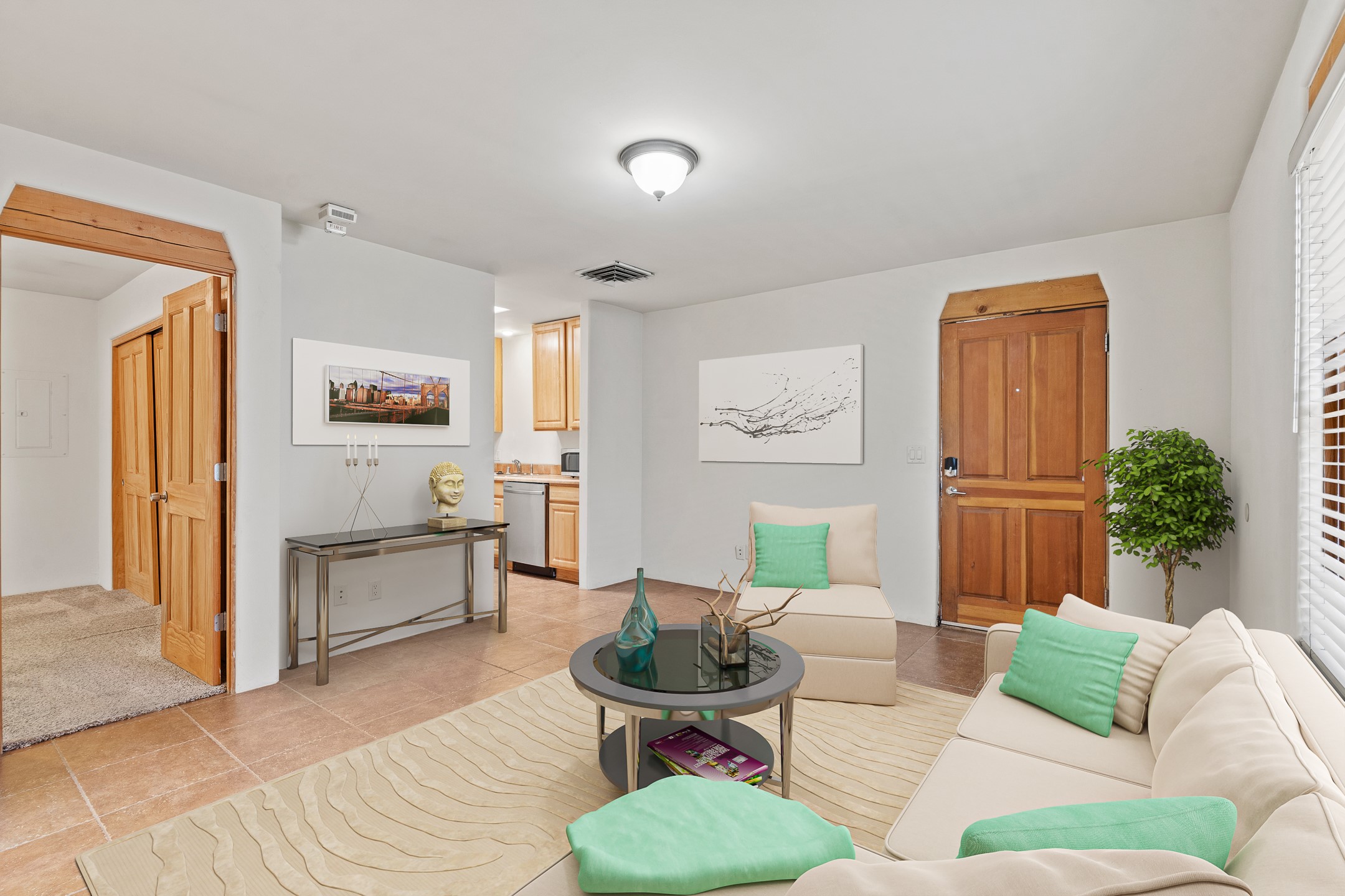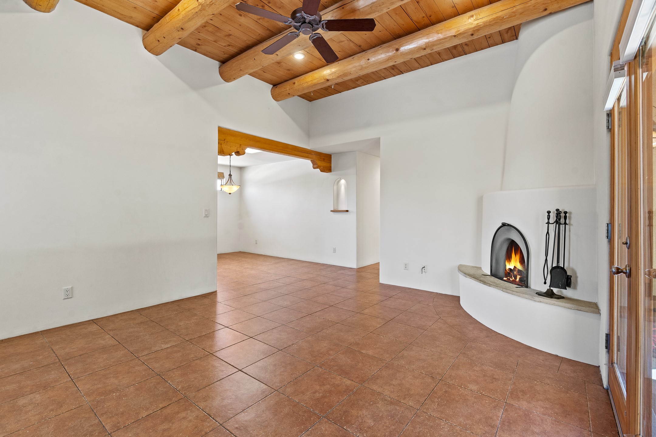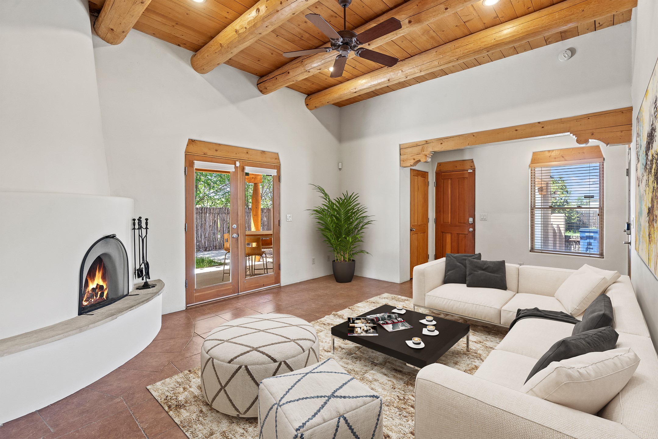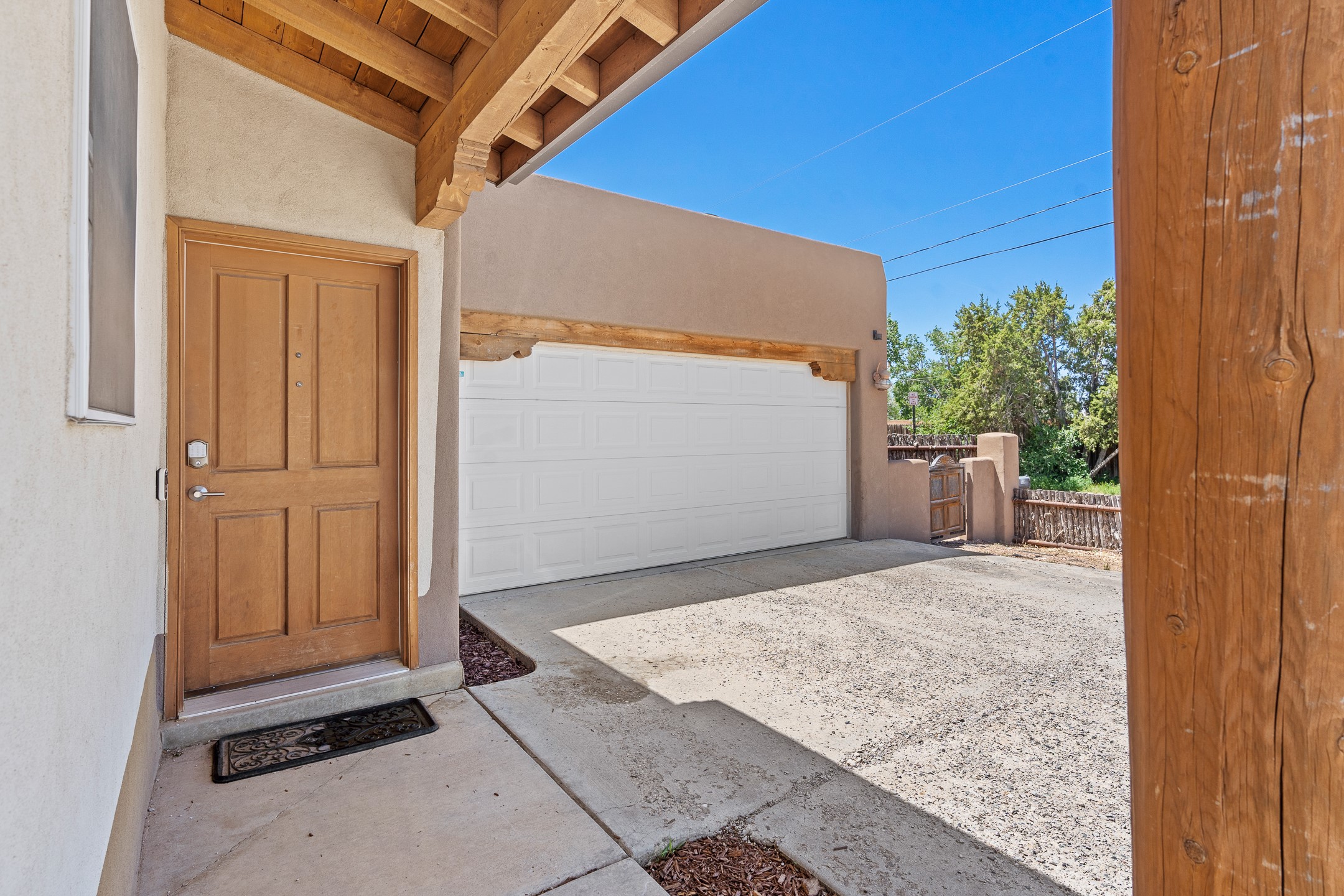 A versatile and charming property featuring a 3-bedroom, 2-bath main house plus a separate 1-bedroom, 1-bath guest house; ideal for rental income, extended family, or a home studio. The main house offers a spacious living area with tile floors, wood-beamed ceilings, and a traditional kiva fireplace, opening into the dining and kitchen area and a lovely covered patio area in a fully fenced yard. The primary suite includes a private bath and walk-in closet. A two-car garage adds to the flexible usage of the property. The guest house has its own entrance and includes a living area, kitchenette, bedroom, and full bath. There is also a washer / dryer hook-up, and it is separately metered. Centrally located, less than a 10-minute walk to restaurants such as Escondido and Tumbleroot Brewery, and a 10-minute drive to the Plaza.